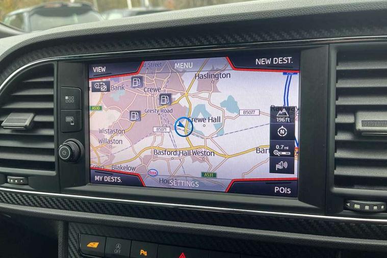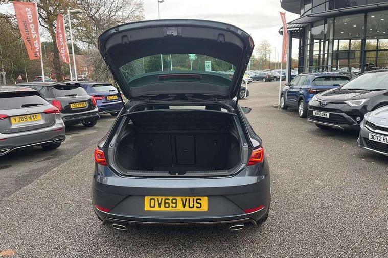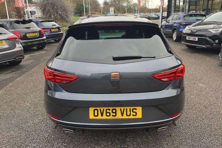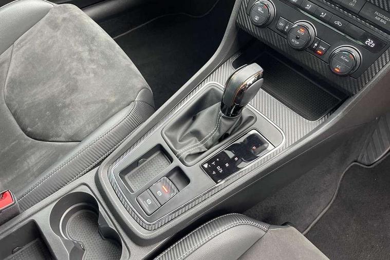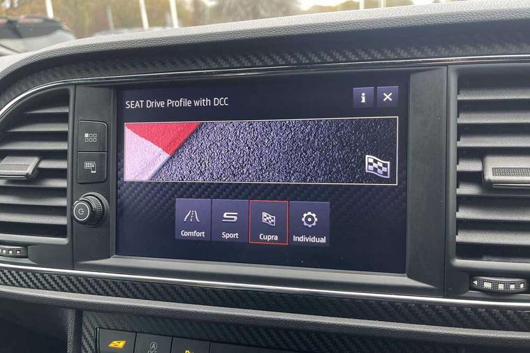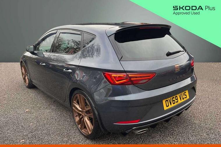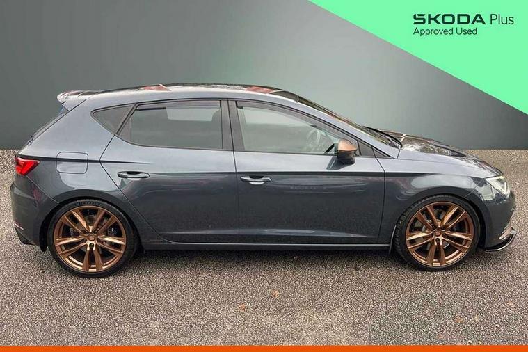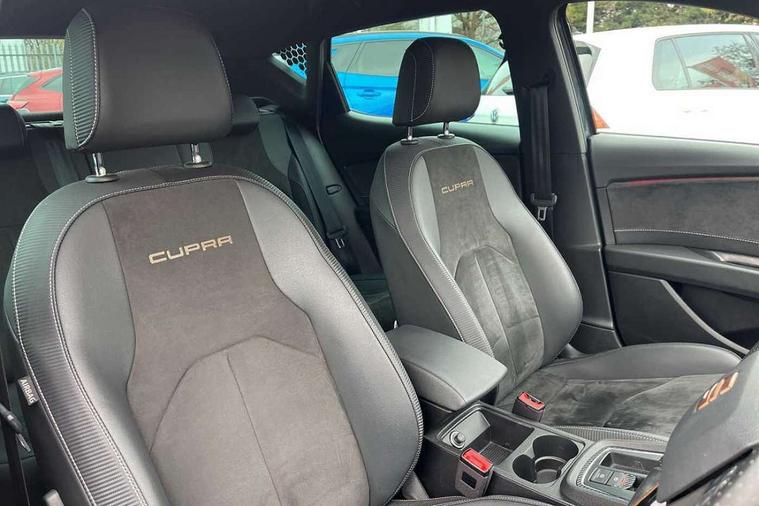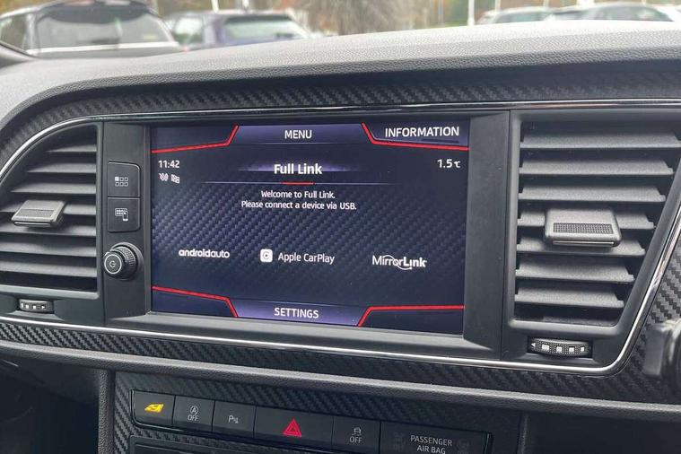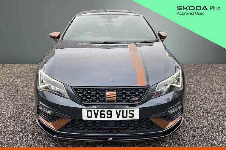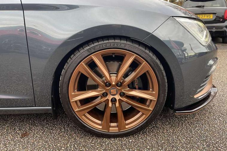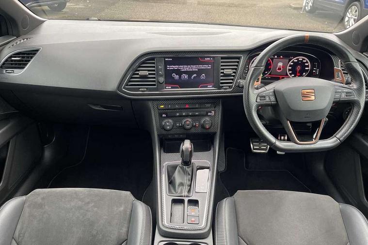 CUPRA performance interface, Digital cockpit, Electro-mechanical progressive power assisted steering, Front and rear parking sensors, Front assist with pedestrian protection, Full Link Smartphone Integration with Mirror Link, Apple Car Play, Google Android Auto with USB Type C cable for Apple and Android compatibility, Media system plus with 8" display, 4 USB, 8 speakers, CD, voice control, DAB, bluetooth and handsfree, steering wheel mounted audio and phone control, Navigation system 3D map display, high resolution colour driver display, two SD card slots, RPM, trip computer, outside temp gauge, instrument light brightness, low fuel warning light, lights on reminder, gearshift indicator, SEAT drive profile CUPRA with 4 mode (Cupra/Normal/Sport/Individual), throttle response, sound actuator and gearshift, SEAT logo boot release, Service interval indicator, Dynamic chassis control, Lowered sports suspension, Auxiliary input socket, SEAT USB media cable, Black front grille, Body colour door handles, Body coloured bumpers, Dark tinted rear windows, Electric folding door mirrors, Electric front/rear windows, Electrically adjustable and heated door mirrors, Exclusive Cupra front and rear bumpers, Full LED headlights with LED day time running lights + LED rear tail lights + LED licence plate lights and LED front and rear fog lights, Gloss black exterior mirrors with integrated LED indicators, Gloss black front grille frame, High gloss black finish B and C pillars, Illuminated aluminium front door sill with CUPRA logo, Rear wash/wipe, Visible dual exhaust pipes, 12v power point in centre console, 60/40 split folding rear seat with armrest, Additional heating and ventilation outlet in rear of centre console, Aluminium pedals, Black interior roof, Boot storage net, Cargo rings in boot, Driver and passenger seat height adjust, Driver and passenger sun visor, covered and illuminated mirror, driver sun visor with card holder, Driver seat lumbar adjustment, Dual zone climate control, Dust/pollen filter, Flat bottomed perforated leather steering wheel with white stitching and CUPRA logo and leather gear knob, Front and rear head restraints, Front centre armrest with storage compartment, Front cupholders x 2, Front passenger seat lumbar adjustment, Front seatback storage pockets, Front sport seats in microsuede, Front/rear floor mats, Height adjustable front and rear headrests and third rear headrest, Height/reach adjust steering wheel, High centre console with integrated box & cup holder, rear air outlet, with armrest in front seats, Interior copper and black detailing, ISOFIX points in outer rear seats with top tether anchorage points, Luggage tie-down hooks, Multi-colour ambient interior lighting, Steering wheel gearshift paddles, Storage box under drivers and passenger seat, Convenience pack+ - Leon, 3 point seatbelts on all rear seats, ABS, traction control system and front differential lock system, Child proof door locks, Driver and front passenger airbags with front passenger airbag de-activation, front side, curtain, driver knee airbags, EBA, Electric handbrake, Electronic parking brake with auto hold, ESC with switch off key, Front and rear black brake calipers with cupra logo, Front seatbelt pretensioners, Front seatbelt reminder, Hill hold control, Multi-Collision braking, Tyre pressure monitoring system, 2 folding remote keys with window open/close function and boot opening/door mirror folding function, Central locking fuel filler cap, Engine immobiliser, Locking wheel bolts, Remote central locking + deadlocks, Volumetric alarm with back up horn, Gloss black interior detailing, 19" Cupra Machined alloy wheels 30/2, Space saver spare wheel,