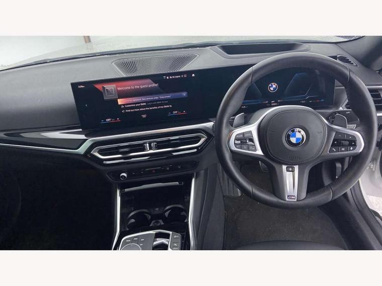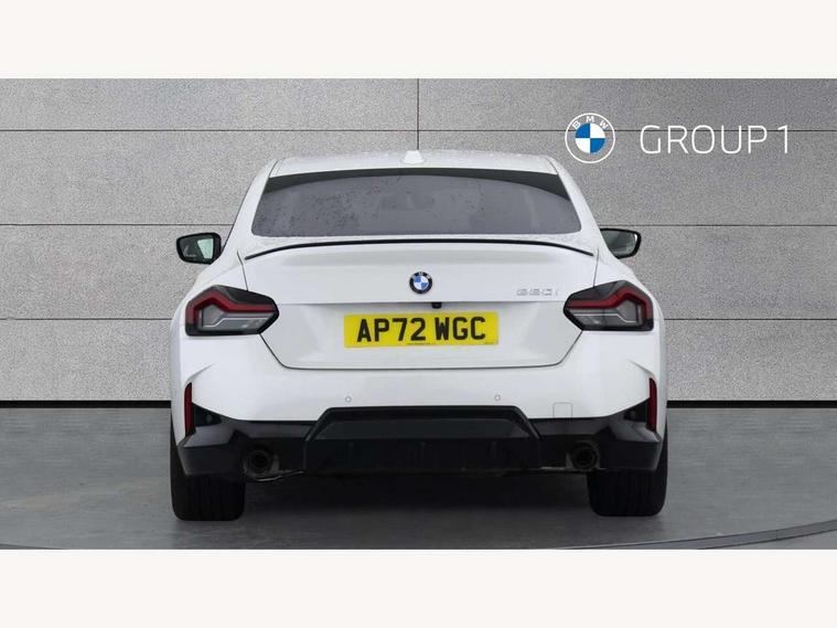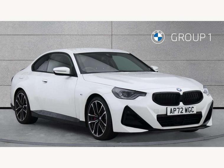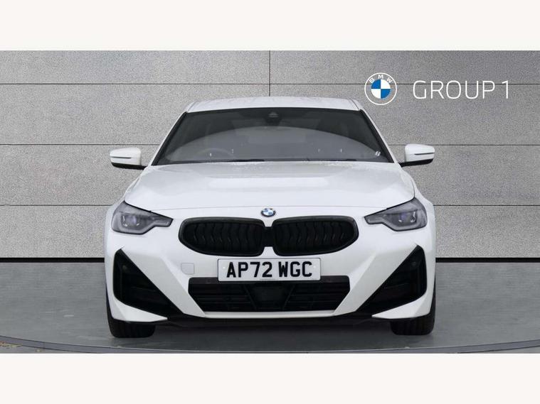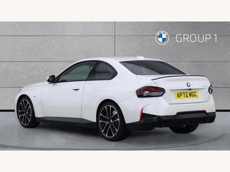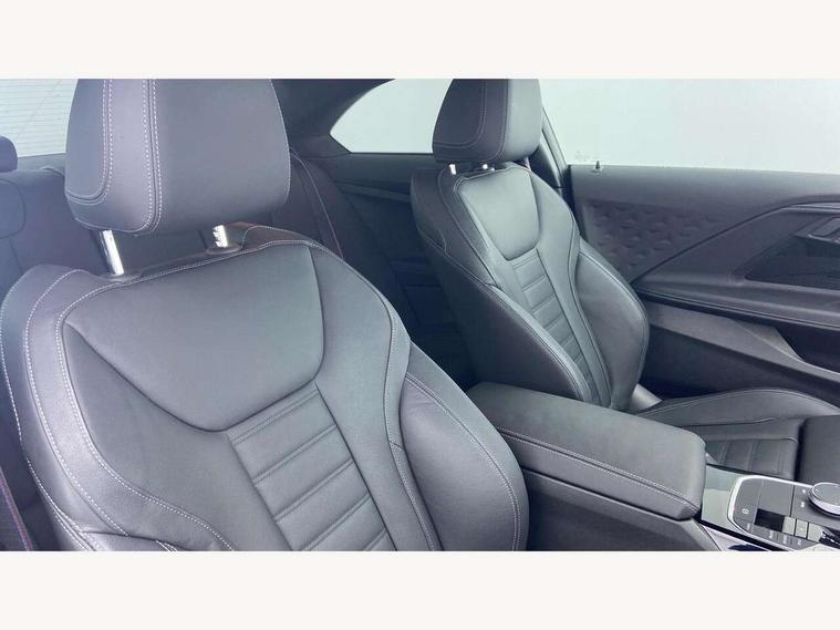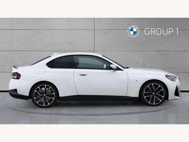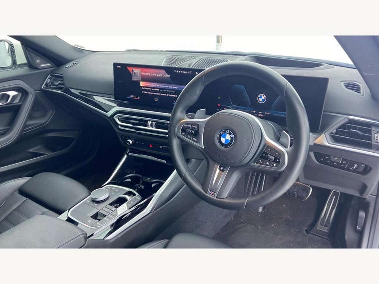 Attentiveness assist, Auto start-stop, Bluetooth, BMW ConnectedDrive online services, BMW Teleservices, Check Control warning system for monitoring of lights and door/luggage compartment open warning, Direct selection buttons, Drive off assistant, Eco pro mode, Electric power steering, Front and rear parking sensors, Front/rear Parking distance control, iDrive controller with turn and press function, Integrated owners handbook, Intelligent functions, Live cockpit plus with nav function 12.3" instrument cluster and 14.9" centre display, Oil sensor for level and grade, Optimum shift indicator, Personal Profile, Touch operation on control display, Variable sport steering, Widescreen multi-media display, Aluminium lightweight construction, Balancer shaft, BMW TwinPower Turbo four-cylinder petrol engine, Double VANOS, Drive performance control with ECO PRO comfort + sport mode, Electronic differential lock, High precision injection, M sport suspension, Petrol Particulate Filter, Sport automatic steptronic transmission with gearshift paddles, manual gearshift time display, launch control, coasting idle ECO PRO/COMFORT modes, Twin scroll turbocharger with Valvetronic, DAB tuner, Acoustic windscreen wipers for reduced driving noise, Adaptive LED Headlights, Automatic windscreen wipers and automatic headlight, Automatically dimming rear view mirror, Body colour door handles flush with door surface, Body colour door mirrors, Body colour front and rear bumpers, Daytime running lights, Electric windows - front and rear, with open/close fingertip control and trap release, Exhaust tailpipes x2 - 90mm in left and right, Fading support, Front and rear bumper system with replaceable deformation elements, Front door sill finishers in black plastic with BMW designation, Front windscreen wipers with integrated washer jets, Green tinted heat protection glazing, High beam assistant, High gloss shadowline exterior trim in mirror triangle cover, mirror cover panel, mirror bezel and window border, High level third brake light, Indicators integrated int mirror housing, LED registration plate light, LED technology rear tail lights, brake lights and turn indicators, Lightweight engineering, Model designation on right side of tailgate, One piece kidney grille with hight gloss chrome surround, Rear boot, Rear fog lights, Reversing light in rear light cluster, Shark fin antenna, Single part LED rear lights with smoked glass components, Trailer stabilisation logic, Visible VIN plate, 12V power socket in front centre console with blanking plug, 2 cupholders in front centre console, 3 zone automatic air conditioning, Ambient lighting, Compartment in front of cupholder, Conditioned based service, Driver seat backrest width adjustment, Front and rear side armrests integrated into door trim, Front armrest, Front door pockets, Front head restraints, Front sport seats, Heated front seats, Illuminated glove compartment with separate small compartment, M headliner Anthracite, M sport leather steering wheel, Manually adjustment steering wheel column, Rear seat backrest with manual 40:20:40 split folding, Rear seat centre foldable armrest with integrated cup holder, Single front passenger seat, Storage compartment between rear seats, Storage tray and compartment with cover in centre console, Sun visors with vanity mirrors and insert tab, Through loading system with 40/20/40 split folding 2 rear seat in 2nd row, Two folding rear seat headrests, Velour floor mats, Additional storage compartment pack without USB - 2 Series Coupe, Connected pack professional - 2 Series Coupe, Interior and exterior mirror pack - 2 Series Coupe, M Sport exterior styling aerodynamics pack - 2 Series Coupe, 2 tone horn, Anti lock braking system (ABS) with cornering brake control, Automatic Stability Control (ASC), BMW emergency call, Brake drying, Child seat ISOFIX attachment for the two outer rear seats, Crash sensor activating of airbags, Unlocking doors, hazard warning lights, interior light, safety battery terminal, Deactivation of fuel pump in the event of a crash, Driver and front passenger airbags, Driver and front passenger side airbags, integrated in the door side seat backrest bolsters for all seat variants, Dynamic brake control, Dynamic stability control + (DSC+), Dynamic Traction Control - DTC, Electrically operated hand brake including automatic hold function and automatic release when driving off, Front and rear disc brakes, Front passenger airbag deactivation, Head airbags for all 4 outer seats, Manual deactivation of front passenger airbag, Seat belt security check for driver and front passenger, Seatbelt warning, Side impact protection, Three point seat belts on 4 seats including front belt stopper, pyrotechnic belt tensioners and belt force limiters, Tyre pressure sensor, Warning triangle and first aid kit, Alarm system (Thatcham 1) with remote control and electronic engine immobiliser, Central locking switch for all doors, fuel filler cap and luggage compartment, Deadlocking function system to all doors, Drive away locking system on all doors and luggage compartment, Locking wheel bolts, Start/Stop button (illuminated) in centre console with keyless engine start and Auto Start-Stop deactivation button, Two remote control key with integrated key - one button for open and close doors/fuel flap/tailgate and separate button for unlock luggage compartment, BMW mobility tyre sealing system, Electrically powered 12V compressor, Reduced rolling resistance tyres,