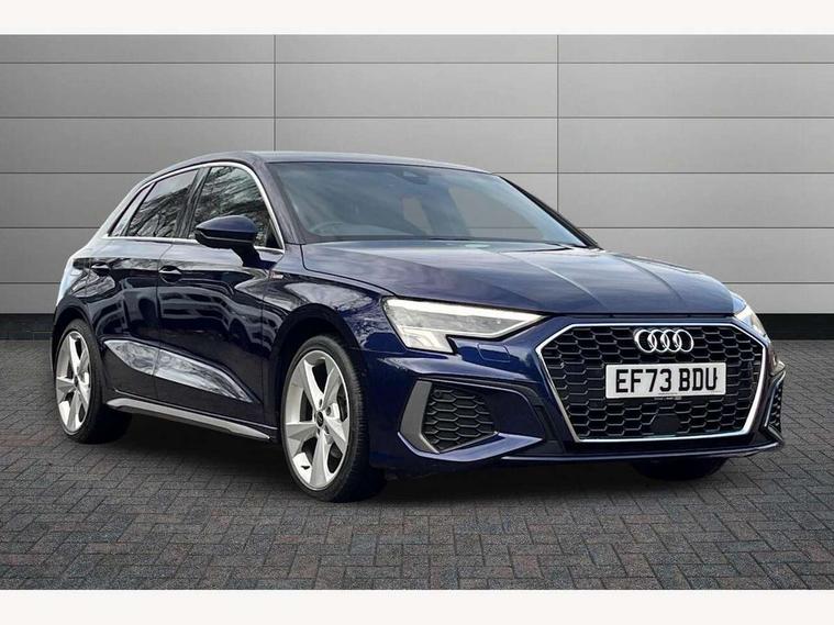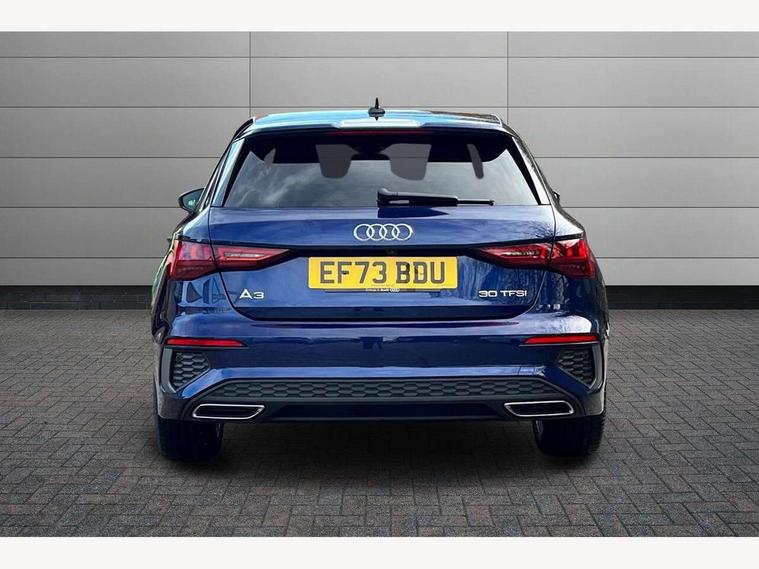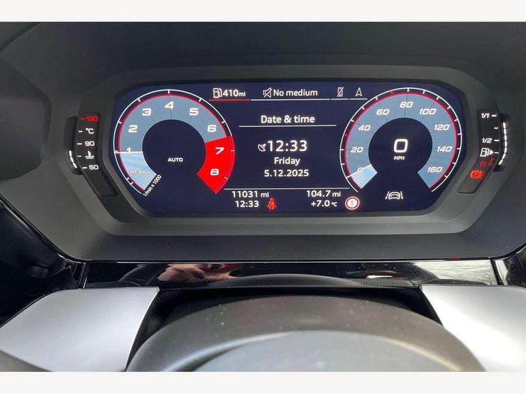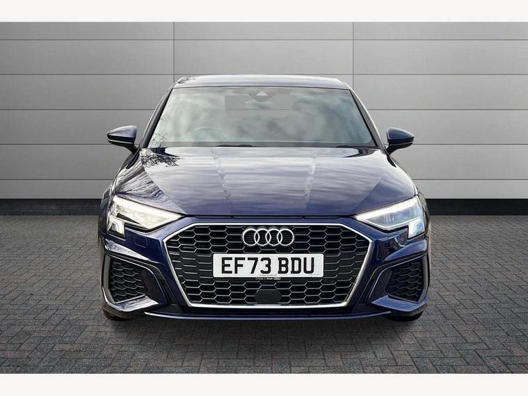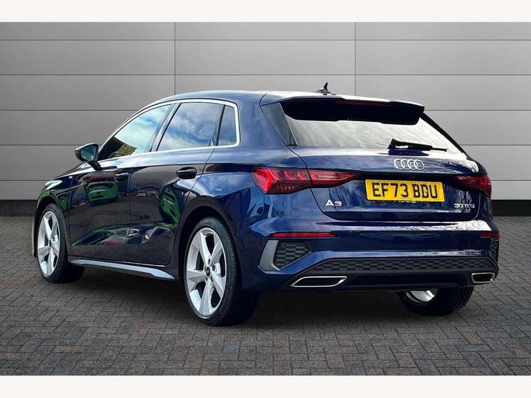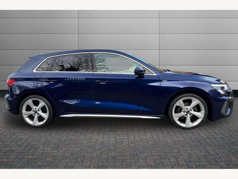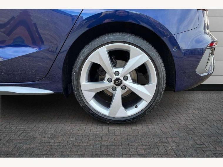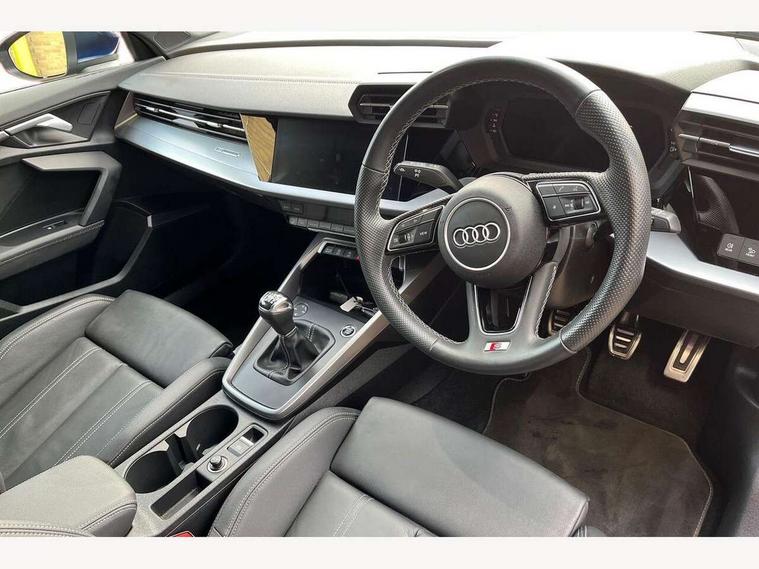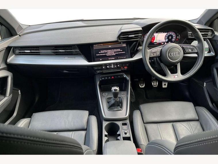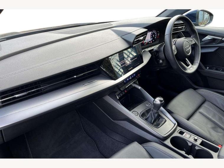 Audi drive select (Auto, Comfort, Dynamic and Individual), Audi smartphone interface, Audi Virtual Cockpit - 10.25" digital and colour instrument cluster, Automatic start/stop system with recuperation, Bluetooth interface, Camera based traffic sign recognition, Collision avoidance assistant, Cruise control, e-Call (emergency call), Electromechanical power speed sensitive steering, Lane departure warning system, MMI Navigation Plus with high resolution 10.1" colour touch screen display, Rear parking sensors, Service indicator, Trip computer, Voice control system with natural language interaction, Sports suspension, 2xUSB-C connection with data and charging functions, 6 passive loudspeakers, DAB Digital radio, 3rd brake light, Acoustic glass windscreen, Aluminium window trim, Auto dimming frameless rear view mirror, Body colour exterior mirrors, Electrically adjustable/heated/folding/auto dimming door mirrors with integrated LED indications + kerb view function for passenger side, Front electric windows, Illuminated door sills with aluminium inserts at the front with S logo, LED daytime running lights, LED headlights with LED rear lights and dynamic rear indicators, Light and rain sensors, Privacy glass - dark tinted rear window, rear door and side windows, Rear electric windows, Rear side air outlets in grained matt black, Rear side wing doors, Rear wiper, S line bumpers, S roof spoiler, 12V socket and storage compartment in front centre console, 3 seat bench in 2nd row, 3 spoke leather multifunction steering wheel, 4 way electrically adjustable lumbar support for driver and front passenger, 60/40 split folding rear seat bench, Black cloth headlining, Dual zone electronic climate control, Front and rear centre armrest in artificial leather, Front and rear headrests, Front/rear floor mats, Height and reach adjustable steering wheel, Interior lighting - glove compartment light and right hand side, Luggage compartment floor covering, Manual boot compartment lid, Manually adjustable front seats, Seat side bolsters, Single front passenger seat, Stainless steel pedals and front footrest in black, Twin leather upholstery with front sports seats S embossed logo, Aluminium interior elements pack - A3 Sportback, LED interior lighting pack - A3 Sportback, S line styling pack - A3 Sportback, 3x3 point rear seat belts, Driver and front passenger airbag with passenger airbag deactivation, Electronic Stabilisation Control (ESC) including ABS, ASR and EDL, First aid kit with warning triangle and 2 safety vests, Front side airbags with head airbags and interaction airbag, Pre-sense front with pedestrian and cyclist detection, Seatbelt monitoring, Tyre pressure loss indicator, Anti theft alarm, Anti-theft wheel bolts, Electronically operated child locks, Immobiliser, Remote control central locking, Dark spectrum aluminium inlays, accent surfaces in the dashboard and centre console in platinum grey silk effect paint finish,