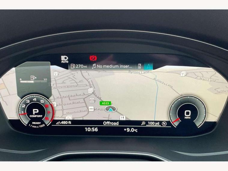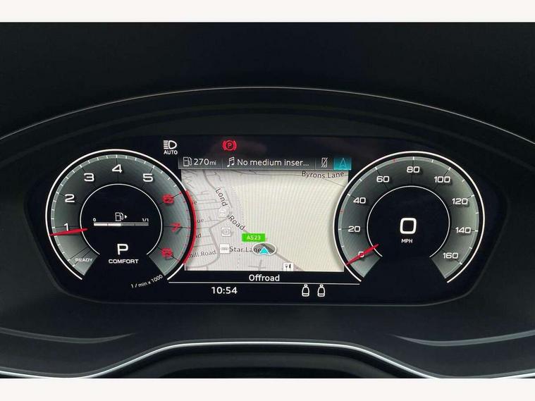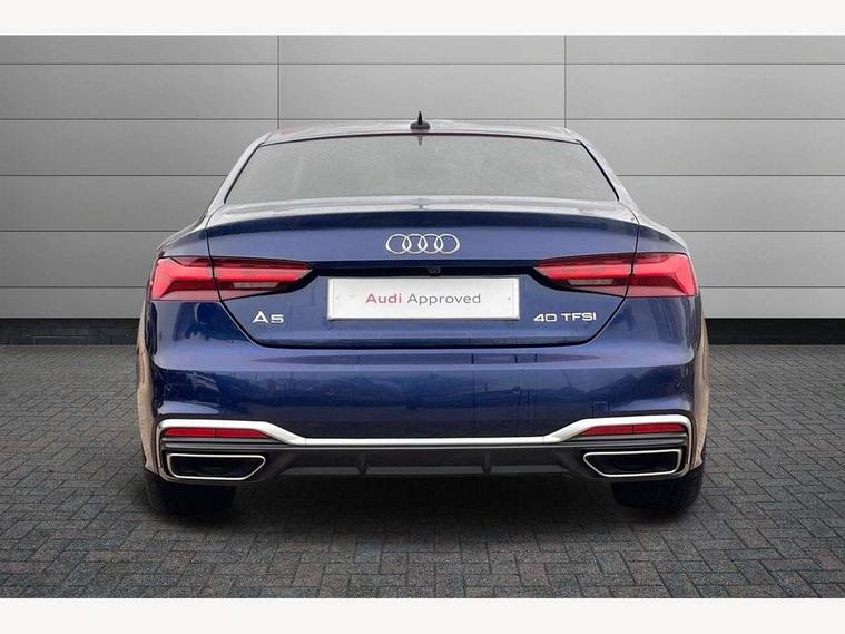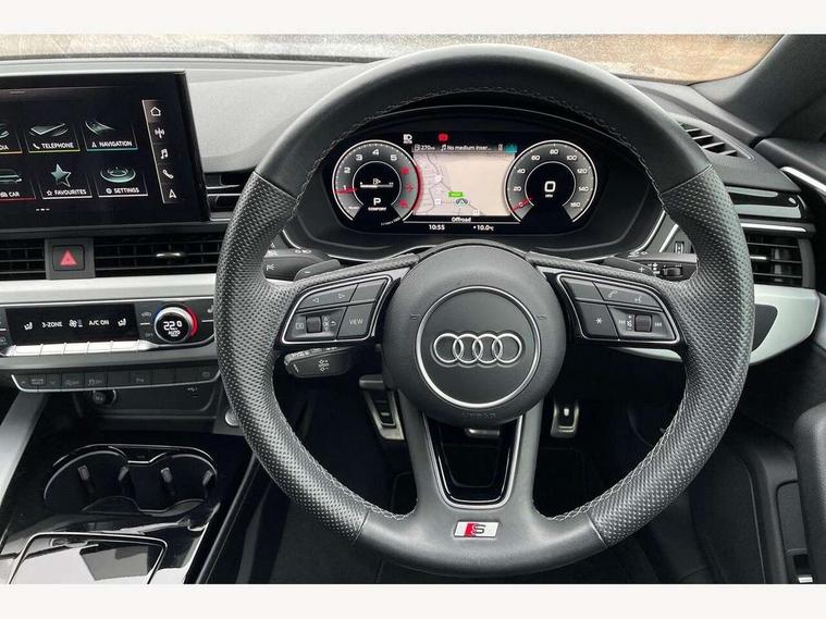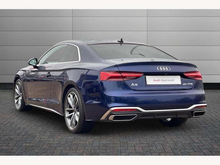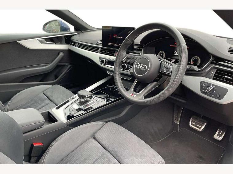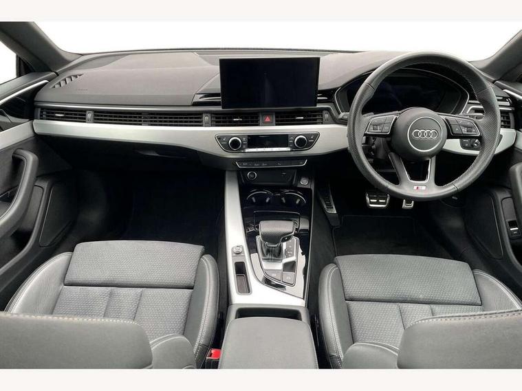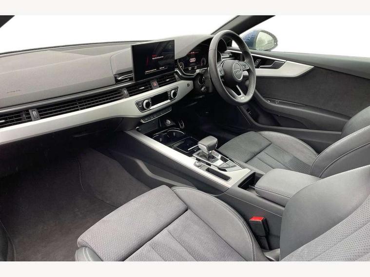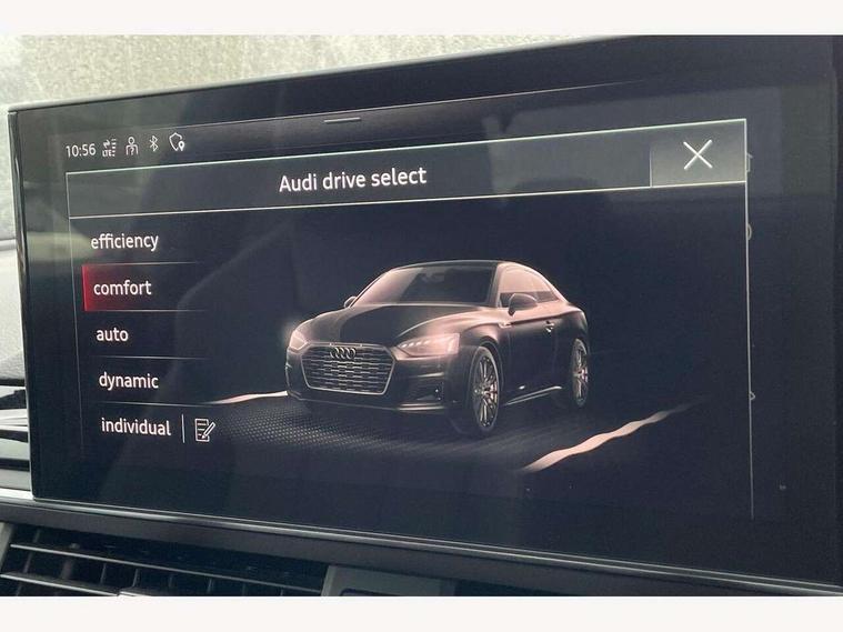 Audi connect safety and service (e-call), Audi connect with Amazon Alexa Integration, Audi drive select (Auto, Comfort, Dynamic, Efficiency and Individual), Audi parking system plus with front and rear sensors, Audi smartphone interface, Audi virtual cockpit - 12.3" full colour digital instrument cluster, vehicle/engine speed, Radio/media information+Driver assistance systems, Automatic start-stop system with coasting functionality and efficiency programme, Bluetooth interface, Electric boot lid release, Electro-mechanical power steering, Email, calendar and text messages displayed via MMI, MMI nav+ with MMI touch - 10.1" high resolution MMI display, touch sensitive, 3D map, route/country info, dynamic route guide, personal route assist, Rear view camera, Service interval indicator, Voice control system, Sports suspension lowered by 23mm, 8 passive loudspeakers, CD player, DAB digital radio reception, Two additional USB ports for rear passenger in rear centre console, Two SDXC card slots, Audi matrix LED headlights with LED rear lights + dynamic front and rear indicators, Auto dimming rear view mirror, Body colour bumpers, Body colour door handles, Body colour front spoiler lip, Body colour side sill trim, Body coloured door mirrors, Electric adjustable heated door mirrors, Electric folding door mirrors, Electric front windows, Front fog lights, Honeycomb structure radiator grille in grained matt black, LED daytime running lights, Matt aluminium silver tailpipe trim, Privacy glass, Rain and light sensors, S line badges on front wings, S line front and rear bumpers with side skirts, S Line rear diffuser in matt titanium black with trim strip in matt aluminium silver, Side air inlets in grained matt black with matt aluminium silver inlay, Windscreen with acoustic glazing, 4 way electric lumbar support for driver and front passenger, 40/20/40 split folding 2 seater rear seat bench with rear centre armrest, Adjustable steering column, Black cloth headlining, Black perforated leather gearknob, Contrast stitching on seats, steering wheel and gear lever gaiter, Deluxe 3 zone electronic climate control, Front centre armrest, Front head restraints, Front/rear floor mats, Heated front seats, Illuminated door sill trim with S logo, ISOFIX child seat mounting and top tether, Luggage compartment mat, Manual seat adjustment, Rear headrests, Stainless steel pedals, Sunvisors with vanity mirrors, Tool kit, LED interior light pack - A5/RS5, 2 x 3-point rear seat belts, 6 airbags - Driver, front passenger, curtain and side airbags, Electromechanical parking brake, Electronic Stabilisation Control (ESC) including ABS, ASR and EDL, Front passenger airbag deactivation, Height adjustable front seatbelts, Hill hold assist, Multi collision brake assist, Pop-up bonnet for pedestrian protection, Pre sense city, Seatbelt monitoring, Tyre pressure warning, Variable restraint system, Warning triangle and first aid kit, Anti theft alarm system, Anti theft wheel bolts, Immobiliser, Keyless Go, Remote central locking, Matt brushed aluminium inlays, Tyre repair kit,