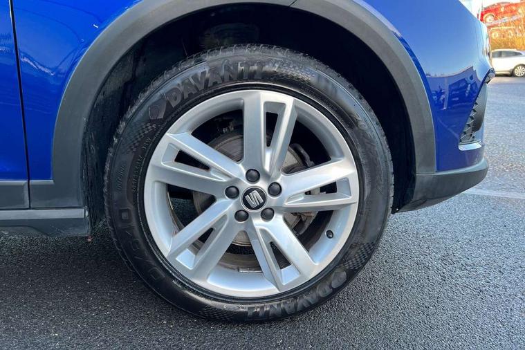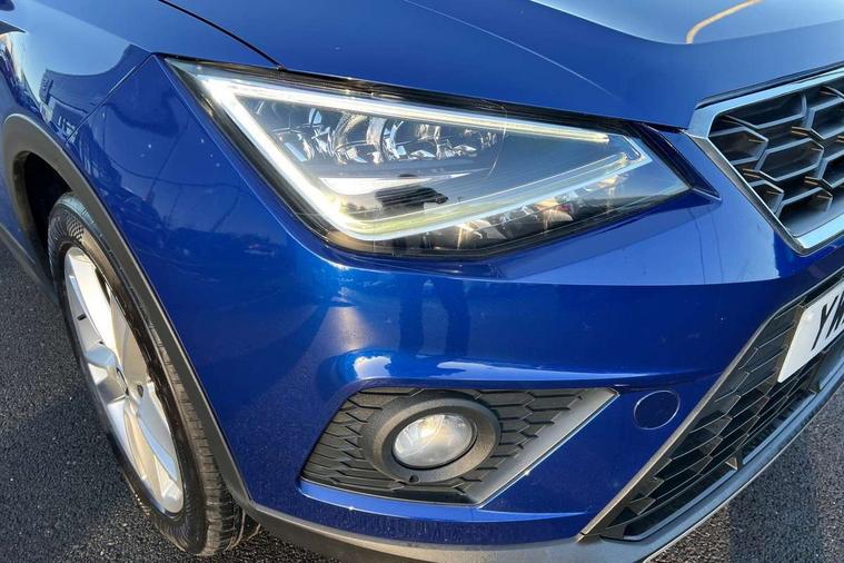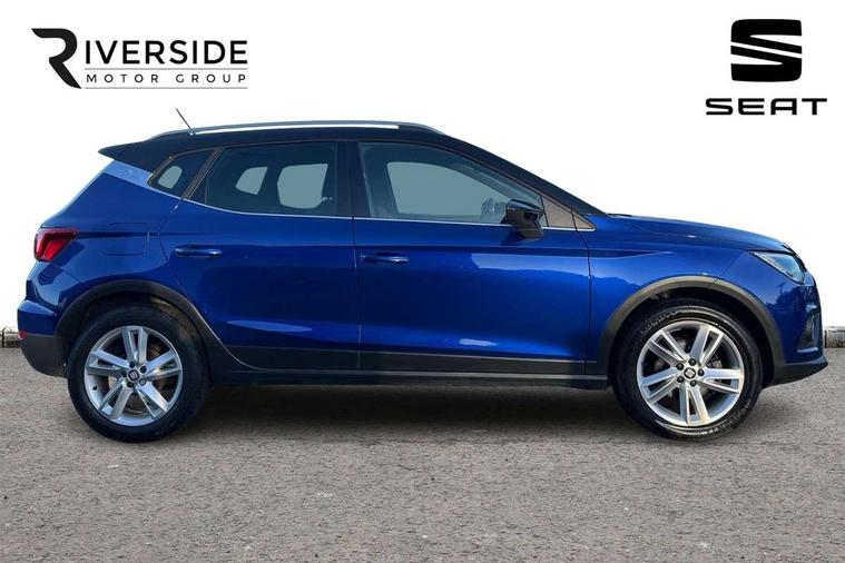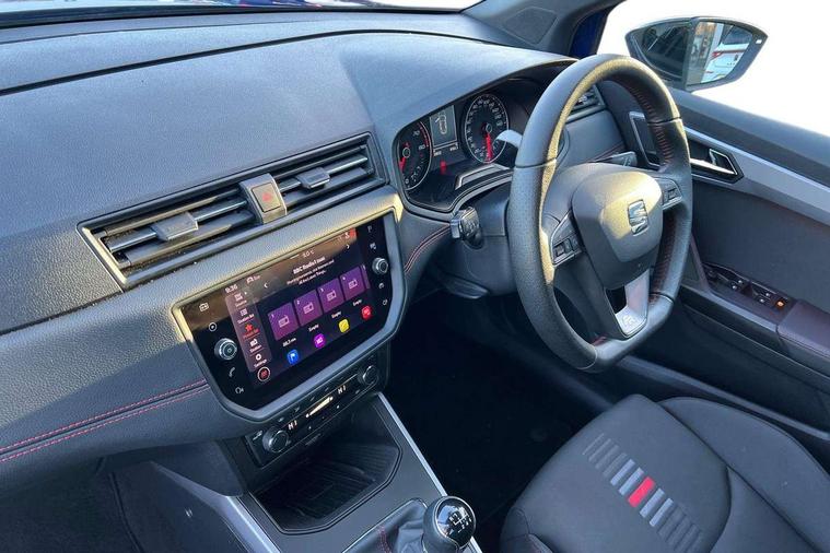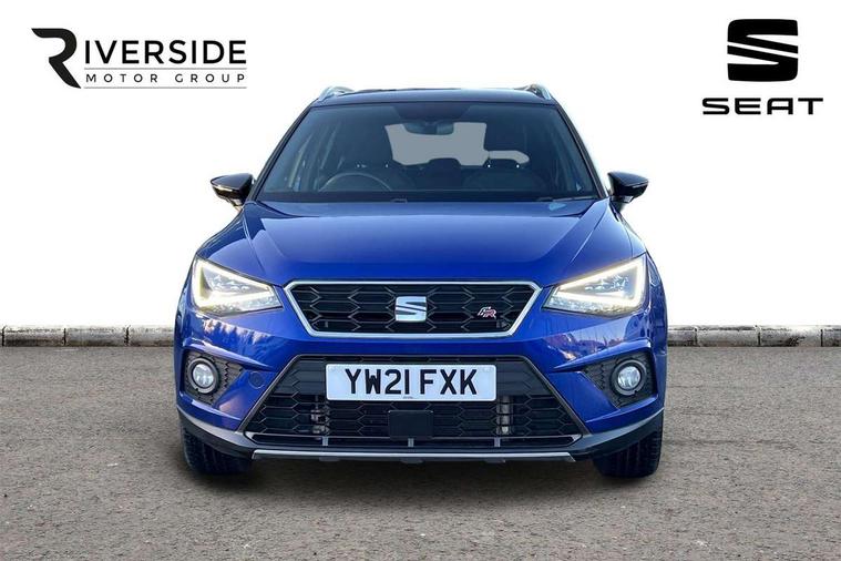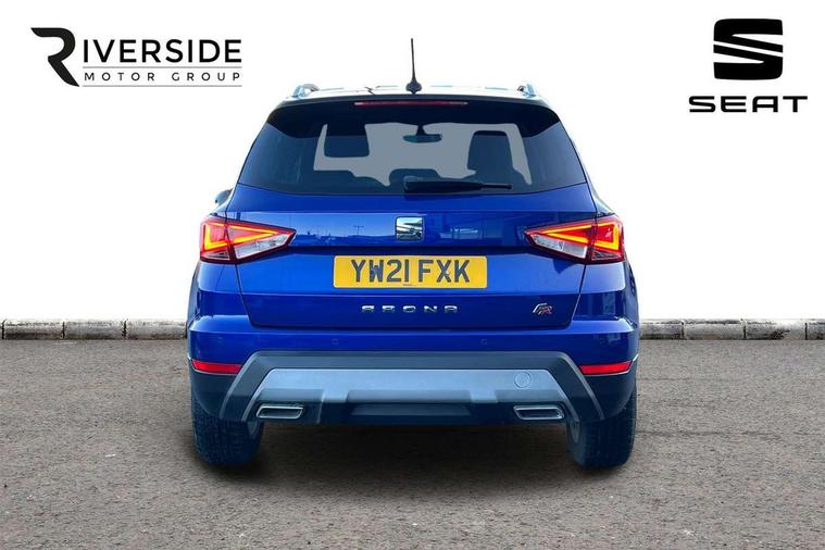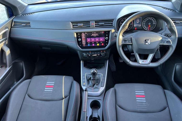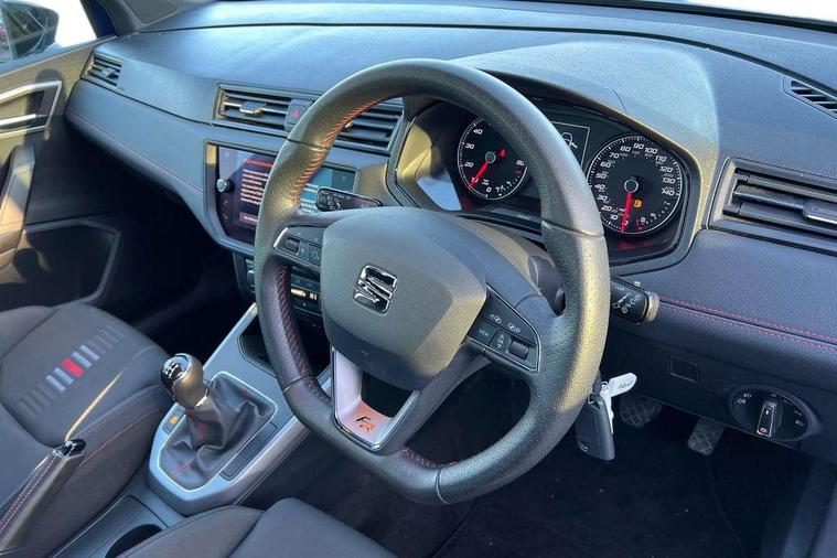 'Lights On' Reminder warning buzzer, Cruise control and speed limiter, Digital clock, Electric speed sensitive power steering, Full Link Smartphone Integration with Mirror Link, Apple Car Play, Google Android Auto with USB Type C cable for Apple and Android compatibility, Low fuel warning light, Outside temperature display, Rear parking sensor, RPM counter, Seat connect with safety, service, remote and online, SEAT Drive profile - Four different models normal-sport-eco-individual, steering response, throttle response, Trip computer, Sports suspension, Bluetooth interface for hands free and audio streaming, DAB digital radio and AM/FM radio, Steering wheel mounted audio controls, Anti theft roof antenna, Auto dimming interior rear view mirror, Automatic activation of hazard warning lights, Automatic headlights, Body coloured bumpers, Body coloured door handle inserts, Chrome front grille frame, Chrome roof rails, Chrome window trim, Coming/leaving home lighting function, Dark tinted rear windows, Electric front/rear windows with one touch/auto up/down, Electrically adjustable, heated and folding door mirrors, Full LED headlights dipped and mainbeam + front and rear fog lights, LED daytime running lights, LED rear tail lights and licence plate lights, Protective side mouldings, Rain sensing wipers, Rear window wash/wipe, Roof colour door mirrors, Twin exhaust pipe styling hidden exhaust pipe, Visible VIN plate, Windshield wiper with intermittent control and potentiometer, 2 cupholders, 60/40 split folding rear seat, Aircare filter, Black interior roof, Double boot floor, Driver sunvisor with covered mirror + card holder, Dual zone climate control, Front courtesy light with front reading lights, Front sport seats, Gear shift indicator, Height adjustable front seats, Height/reach adjustable steering column, Illuminated boot, Instrument lighting with brightness control, Interior light in footwell, central console and door panel, ISOFIX points in outer rear seats with top tether anchorage points, Multi-colour ambient interior lighting, Nora cloth upholstery, Passenger sunvisor with vanity mirror, Perforated flat bottomed leather steering wheel/gear knob/handbrake with red stitching and FR logo, Two front and three rear height adjustable headrests, Connectivity pack plus - Arona, Interior chrome pack - Arona, 3 point seatbelts on all rear seats, ABS, Active front headrests, Child locks on rear doors, Driver and front passenger airbags with front passenger airbag de activation, front side and curtain airbags, Electronic stability control, Emergency Brake Assist (EBA) and front assist, Front and rear seatbelt reminder, Hill hold control, Multi-Collision braking, Tiredness recognition system, Traction control, Tyre pressure monitoring system, 2 folding remote keys with window open/close function, Alarm with back-up horn, Electronic engine immobiliser, Locking wheel bolts, Remote central locking + deadlocks, Tow away protection, Interior chrome line trim, Leatherette dashboard, 17" Dynamic alloy wheels,