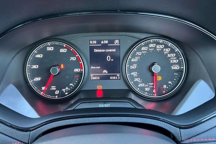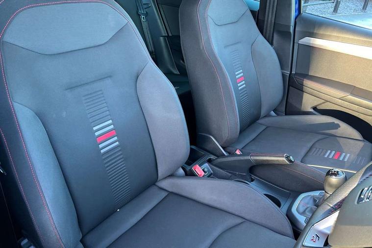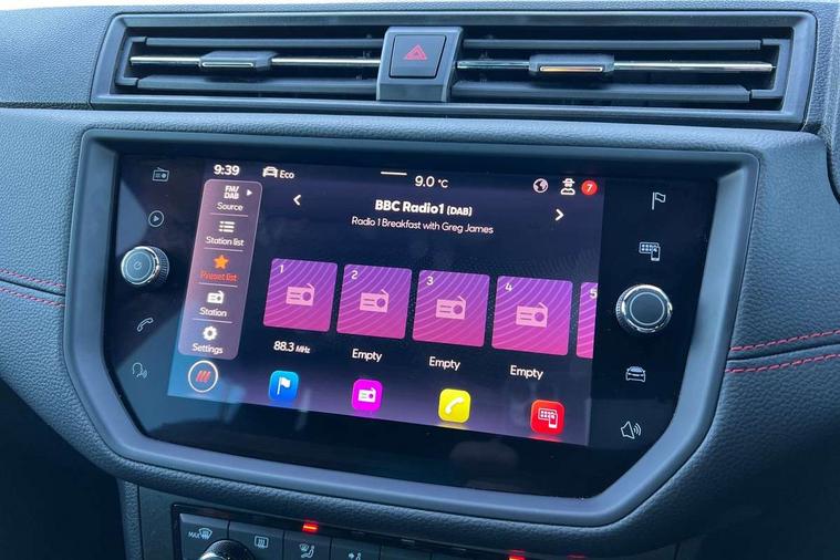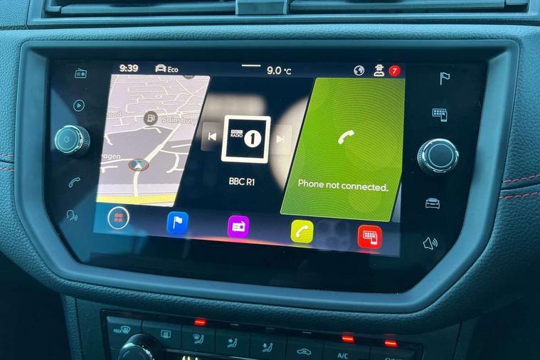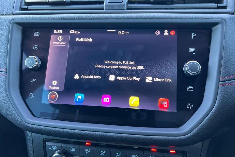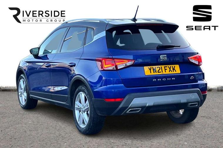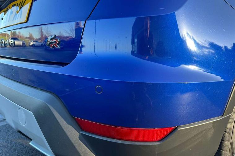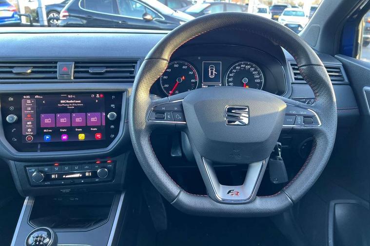 'Lights On' Reminder warning buzzer, Cruise control and speed limiter, Digital clock, Electric speed sensitive power steering, Full Link Smartphone Integration with Mirror Link, Apple Car Play, Google Android Auto with USB Type C cable for Apple and Android compatibility, Low fuel warning light, Outside temperature display, Rear parking sensor, RPM counter, Seat connect with safety, service, remote and online, SEAT Drive profile - Four different models normal-sport-eco-individual, steering response, throttle response, Trip computer, Sports suspension, Bluetooth interface for hands free and audio streaming, DAB digital radio and AM/FM radio, Steering wheel mounted audio controls, Anti theft roof antenna, Auto dimming interior rear view mirror, Automatic activation of hazard warning lights, Automatic headlights, Body coloured bumpers, Body coloured door handle inserts, Chrome front grille frame, Chrome roof rails, Chrome window trim, Coming/leaving home lighting function, Dark tinted rear windows, Electric front/rear windows with one touch/auto up/down, Electrically adjustable, heated and folding door mirrors, Full LED headlights dipped and mainbeam + front and rear fog lights, LED daytime running lights, LED rear tail lights and licence plate lights, Protective side mouldings, Rain sensing wipers, Rear window wash/wipe, Roof colour door mirrors, Twin exhaust pipe styling hidden exhaust pipe, Visible VIN plate, Windshield wiper with intermittent control and potentiometer, 2 cupholders, 60/40 split folding rear seat, Aircare filter, Black interior roof, Double boot floor, Driver sunvisor with covered mirror + card holder, Dual zone climate control, Front courtesy light with front reading lights, Front sport seats, Gear shift indicator, Height adjustable front seats, Height/reach adjustable steering column, Illuminated boot, Instrument lighting with brightness control, Interior light in footwell, central console and door panel, ISOFIX points in outer rear seats with top tether anchorage points, Multi-colour ambient interior lighting, Nora cloth upholstery, Passenger sunvisor with vanity mirror, Perforated flat bottomed leather steering wheel/gear knob/handbrake with red stitching and FR logo, Two front and three rear height adjustable headrests, Connectivity pack plus - Arona, Interior chrome pack - Arona, 3 point seatbelts on all rear seats, ABS, Active front headrests, Child locks on rear doors, Driver and front passenger airbags with front passenger airbag de activation, front side and curtain airbags, Electronic stability control, Emergency Brake Assist (EBA) and front assist, Front and rear seatbelt reminder, Hill hold control, Multi-Collision braking, Tiredness recognition system, Traction control, Tyre pressure monitoring system, 2 folding remote keys with window open/close function, Alarm with back-up horn, Electronic engine immobiliser, Locking wheel bolts, Remote central locking + deadlocks, Tow away protection, Interior chrome line trim, Leatherette dashboard, 17" Dynamic alloy wheels,