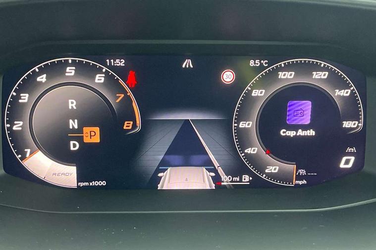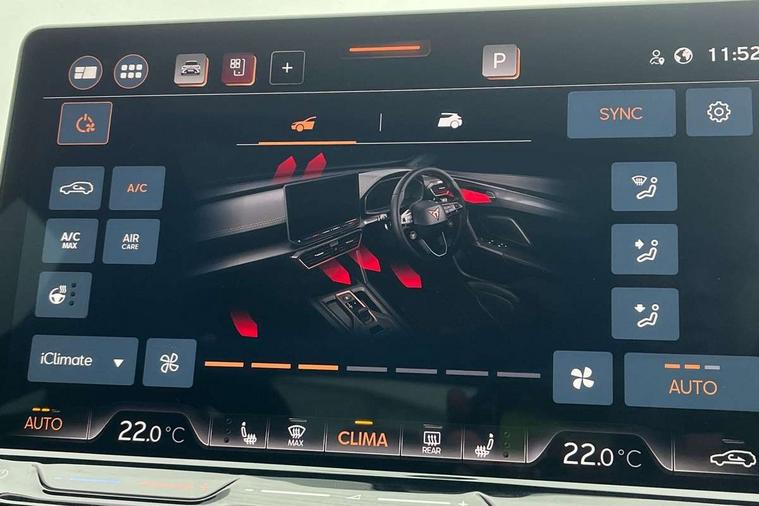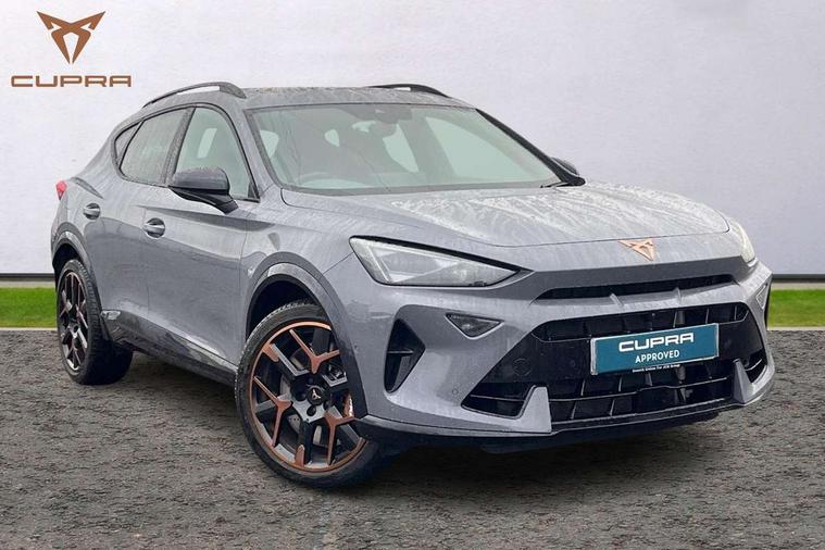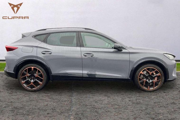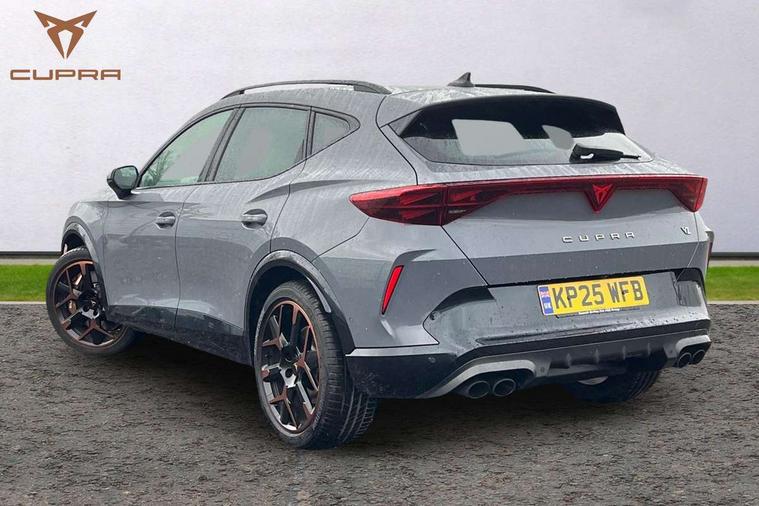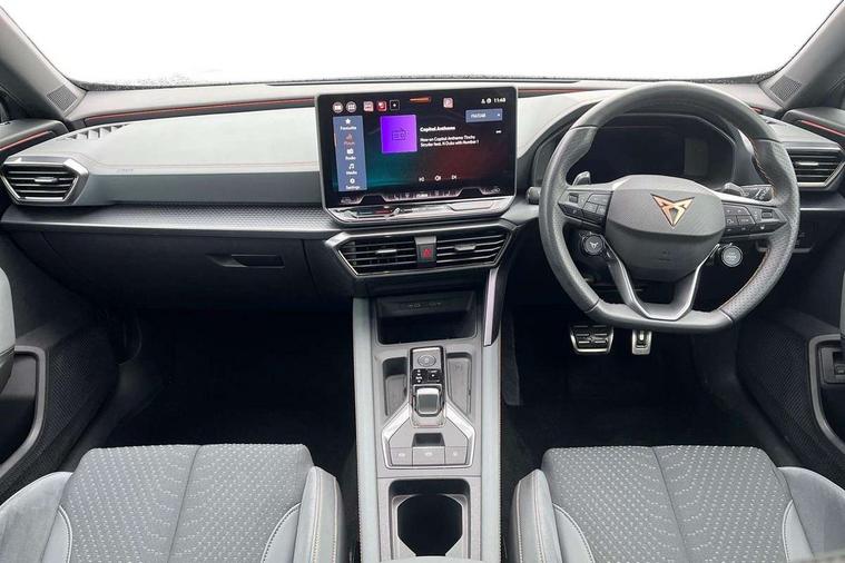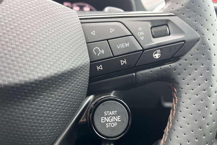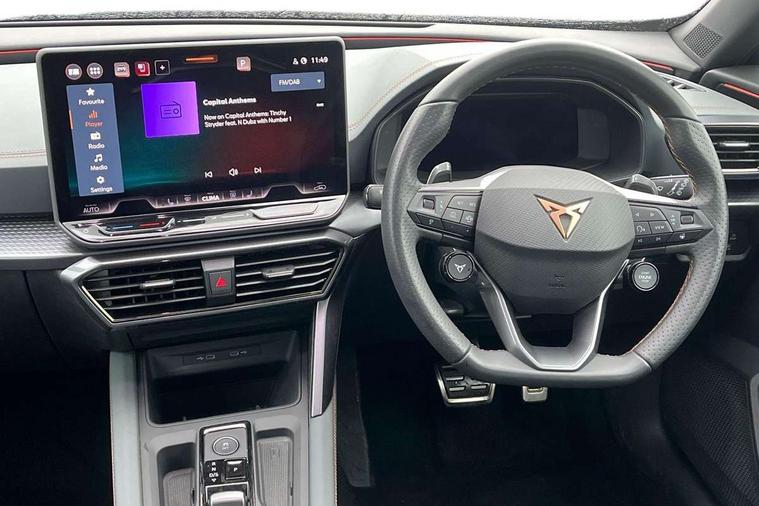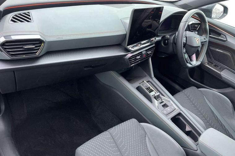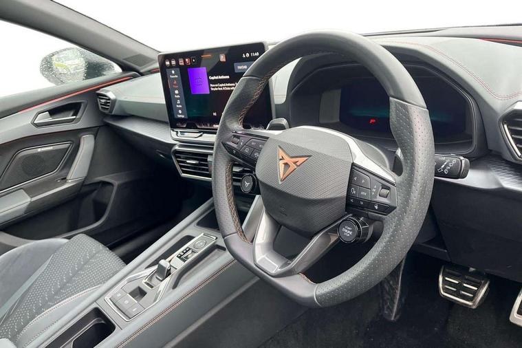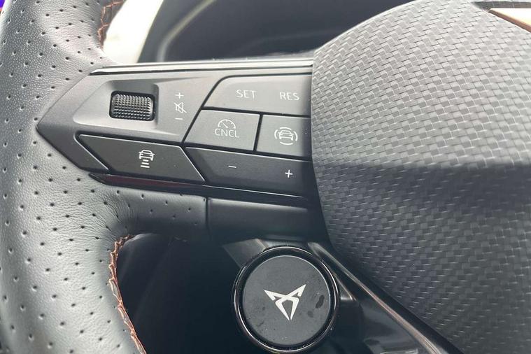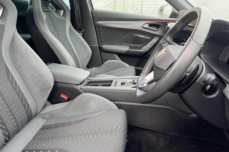 10.25" digital cockpit and configurable dashboard, Adaptive cruise control with follow-to-stop and speed limiter, Advanced driver alert system, Advanced lane assist with semi-automatic vehicle control in a medical emergency and traffic jam assist, Dynamic chassis control with driving profile selection (Comfort, Sport, CUPRA, Individual), Dynamic road sign display, Emergency steering support with turn assist, Forward collision warning with automatic braking, Full link phone integration, Intelligent park assist, RPM, trip computer, outside temp gauge, instrument light brightness, low fuel warning light, lights on reminder, gearshift indicator, Service interval indicator, Side and exit assist, Speed sensitive power steering, Start/stop system with regenerative braking, Top view camera, Virtual pedal and electric tailgate, Voice control system, Wired Android Auto, Wireless apple carplay, Wireless phone charger, Adaptive chassis control with continuous operation, CUPRA sport suspension, Electronic locking differential and dynamic traction support, 2 front and 2 rear USB type C sockets, Immersive by Sennheiser TM - 10 speakers, 1 central speaker, 1 subwoofer, Media system with navigation, 12.9" touchscreen display, voice control, DAB, steering wheel mounted controls, Auto dimming rear view mirror, Black roof spoiler, Body colour door handles, Body coloured bumpers, Dark grey wing mirror, Daytime running light with automatic headlight control and coming home feature, Door panel ambient lighting, Dynamic headlight range control, Electric front/rear windows, Electrically adjustable heated and folding door mirrors with memory function, Gloss black roof rails and window surrounds, High beam assist, LED 3rd brake light, LED front fog lamps with cornering function, LED Taillights with dynamic indicator, Matrix LED headlights with multifunction camera, Rain sensing wipers, Rear diffuser with twin exhaust pipe on each side, Rear fog lights, Rear side wing doors, Rear wash/wipe, Side skirts, Tinted rear windows, Welcome lights (within exterior mirror housing), 12V socket, 2 front and 2 rear reading lights, 3 seat bench in 2nd row, 60/40 split rear bench seat with armrest and mechanical seat release, Black headlining, Black interior roof lining, Cupra sports pedals, Dust/pollen filter, Electrically adjustable front seats with lumbar support and memory function, Front and rear head restraints, Front centre armrest, Heated front seats, Heated supersports multifunction leather steering wheel with satellite buttons and gear shift paddles, Height/reach adjust steering wheel, Illuminated aluminium doorsteps, Illuminated interior front door sills, Illuminated sunvisor with mirror, Isofix, Leather dashboard, door insert and side trim panel, LED smart wraparound lighting, PVC/Textile upholstery + cup bucket seats, Satellite steering wheel, Single front passenger seat, Three zone climate control with control panel in rear, Variable luggage/load compartment floor, 3 point seatbelts on all rear seats, ABS, Akebono brakes, Brake control system - ESC and brake booster, Child proof door locks, Driver and front passenger airbags with front passenger airbag de-activation, Driver and front passenger knee airbag, Electronic parking brake, Hill hold control, Performance brakes with front brembo calipers, Pre-crash front and rear seat belt tensioner, window closure and hazard lights, Public e-call, Seat belt reminder for front and rear seats, Side airbag for front and rear with curtain airbags, Tyre pressure monitoring system, Anti theft alarm system, KESSY Advanced - Keyless start, keyless entry with SAFELOCK, Locking wheel bolts, Copper and aluminium interior detailing, 19" Hailstorm forged machined R black and copper alloy wheels, Breakdown and tool kit,