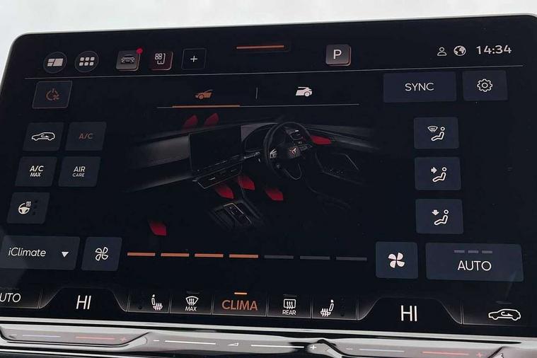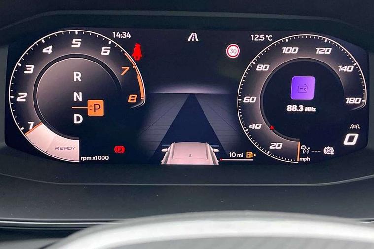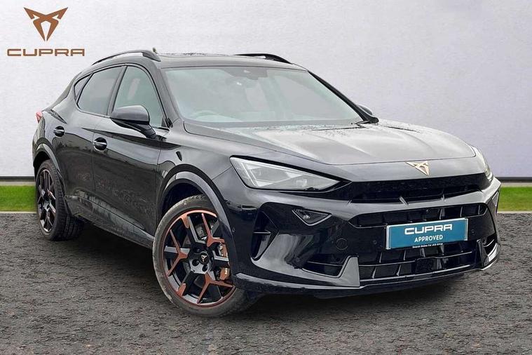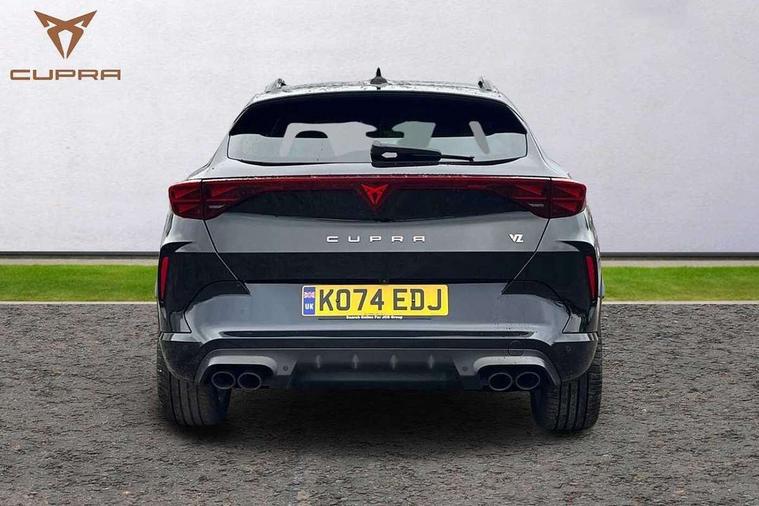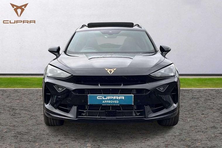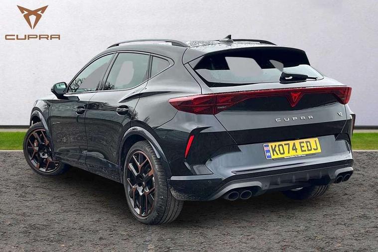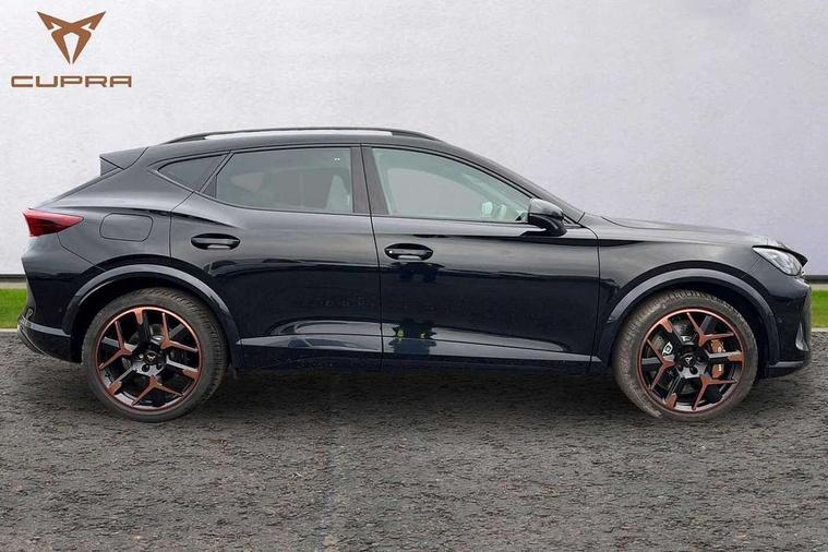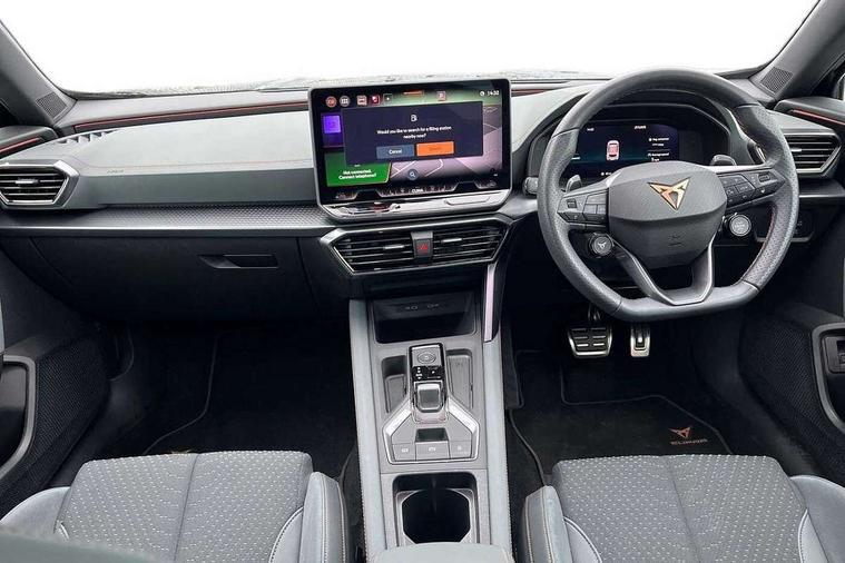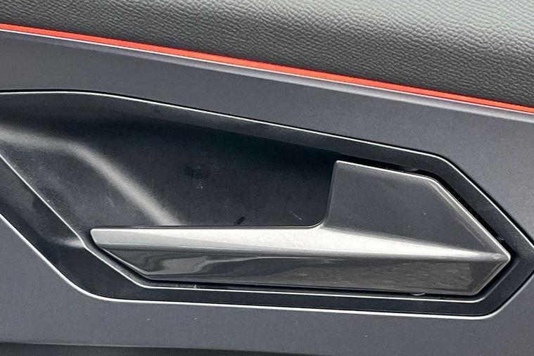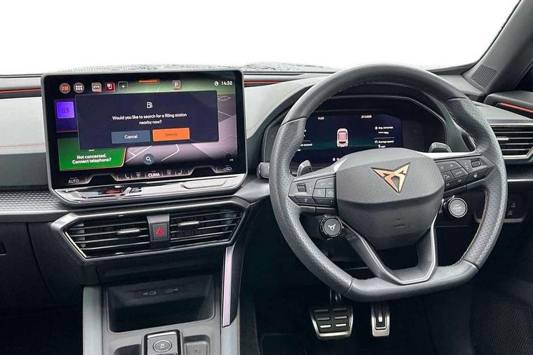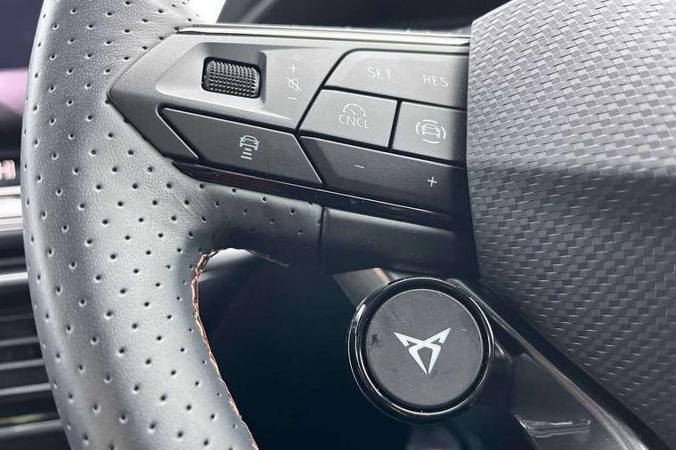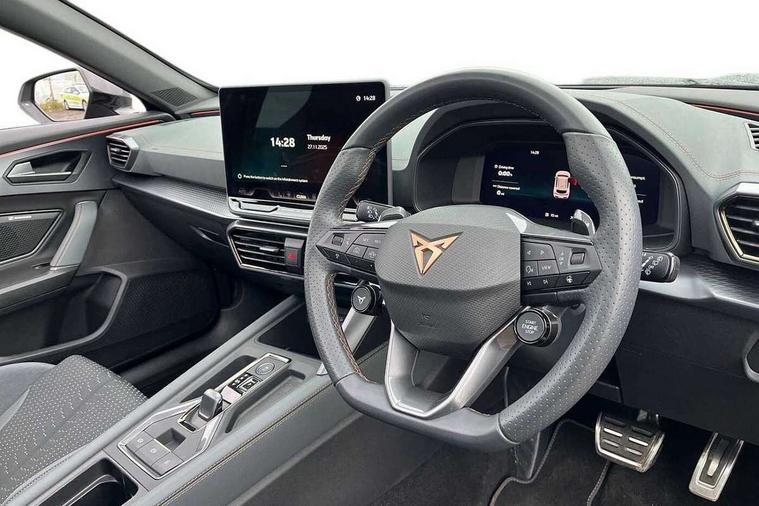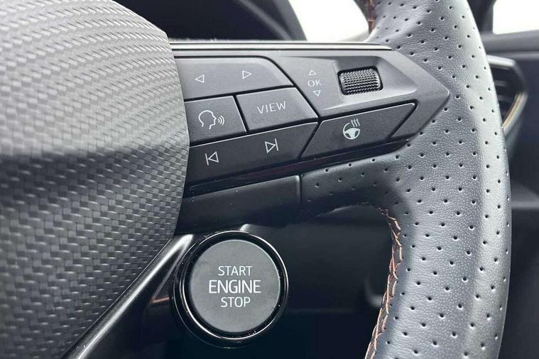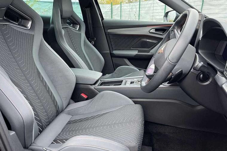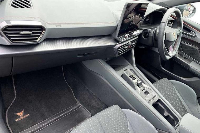 10.25" digital cockpit and configurable dashboard, Adaptive cruise control with follow-to-stop and speed limiter, Advanced driver alert system, Advanced lane assist with semi-automatic vehicle control in a medical emergency and traffic jam assist, Dynamic chassis control with driving profile selection (Comfort, Sport, CUPRA, Individual), Dynamic road sign display, Emergency steering support with turn assist, Forward collision warning with automatic braking, Full link phone integration, Intelligent park assist, RPM, trip computer, outside temp gauge, instrument light brightness, low fuel warning light, lights on reminder, gearshift indicator, Service interval indicator, Side and exit assist, Speed sensitive power steering, Start/stop system with regenerative braking, Top view camera, Virtual pedal and electric tailgate, Voice control system, Wired Android Auto, Wireless apple carplay, Wireless phone charger, Adaptive chassis control with continuous operation, CUPRA sport suspension, Electronic locking differential and dynamic traction support, 2 front and 2 rear USB type C sockets, Immersive by Sennheiser TM - 10 speakers, 1 central speaker, 1 subwoofer, Media system with navigation, 12.9" touchscreen display, voice control, DAB, steering wheel mounted controls, Auto dimming rear view mirror, Black roof spoiler, Body colour door handles, Body coloured bumpers, Dark grey wing mirror, Daytime running light with automatic headlight control and coming home feature, Door panel ambient lighting, Dynamic headlight range control, Electric front/rear windows, Electrically adjustable heated and folding door mirrors with memory function, Gloss black roof rails and window surrounds, High beam assist, LED 3rd brake light, LED front fog lamps with cornering function, LED Taillights with dynamic indicator, Matrix LED headlights with multifunction camera, Rain sensing wipers, Rear diffuser with twin exhaust pipe on each side, Rear fog lights, Rear side wing doors, Rear wash/wipe, Side skirts, Tinted rear windows, Welcome lights (within exterior mirror housing), 12V socket, 2 front and 2 rear reading lights, 3 seat bench in 2nd row, 60/40 split rear bench seat with armrest and mechanical seat release, Black headlining, Black interior roof lining, Cupra sports pedals, Dust/pollen filter, Electrically adjustable front seats with lumbar support and memory function, Front and rear head restraints, Front centre armrest, Heated front seats, Heated supersports multifunction leather steering wheel with satellite buttons and gear shift paddles, Height/reach adjust steering wheel, Illuminated aluminium doorsteps, Illuminated interior front door sills, Illuminated sunvisor with mirror, Isofix, Leather dashboard, door insert and side trim panel, LED smart wraparound lighting, PVC/Textile upholstery + cup bucket seats, Satellite steering wheel, Single front passenger seat, Three zone climate control with control panel in rear, Variable luggage/load compartment floor, 3 point seatbelts on all rear seats, ABS, Akebono brakes, Brake control system - ESC and brake booster, Child proof door locks, Driver and front passenger airbags with front passenger airbag de-activation, Driver and front passenger knee airbag, Electronic parking brake, Hill hold control, Performance brakes with front brembo calipers, Pre-crash front and rear seat belt tensioner, window closure and hazard lights, Public e-call, Seat belt reminder for front and rear seats, Side airbag for front and rear with curtain airbags, Tyre pressure monitoring system, Anti theft alarm system, KESSY Advanced - Keyless start, keyless entry with SAFELOCK, Locking wheel bolts, Copper and aluminium interior detailing, 19" Hailstorm forged machined R black and copper alloy wheels, Breakdown and tool kit,