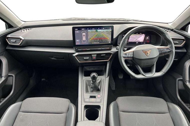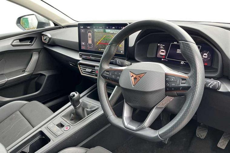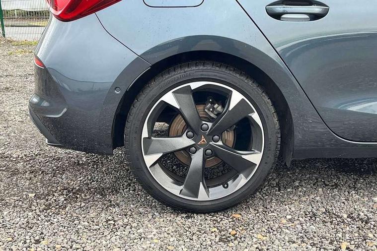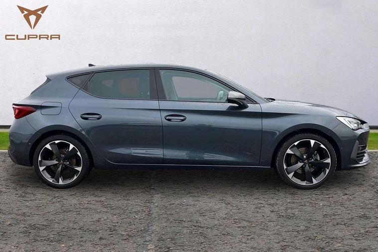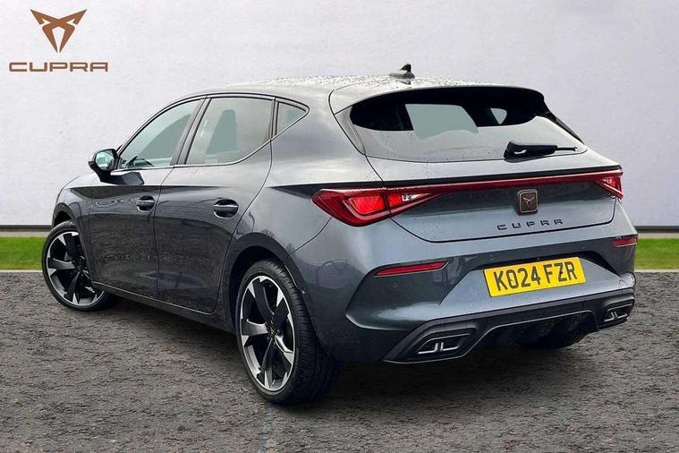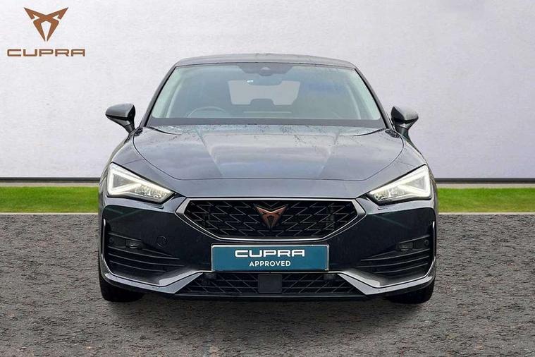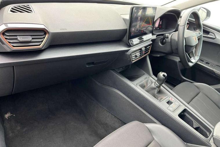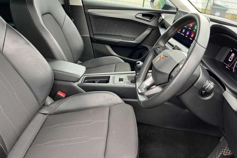 CUPRA drive profile selection with (Comfort/Sport/Individual), throttle response and gearshift mode, Digital cockpit, E-call, Electro mechanical speed sensitive power steering, Four x USB Type C ports (2 in front and 2 in rear), Front assist with forward collision warning braking reaction to vehicles, pedestrians and cyclists, Full link smartphone integration with Mirror Link, wireless Apple CarPlay and wired Google Android Auto, Lane assist, Lockable tailgate, Park assist (inc front/rear parking sensors), Rear view camera, RPM, trip computer, outside temp gauge, instrument light brightness, low fuel warning light, lights on reminder, gearshift indicator, Service interval indicator, Start/stop system with regenerative braking, Wireless phone charger, Sports suspension, Auxiliary input socket, Auto dimming rear view mirror, Body colour door handles, Body coloured bumpers, Cupra sports bumpers, Dark tinted rear windows, Electric front/rear windows, Electrically adjustable, heated and folding door mirrors, LED front fog lamps with cornering function, LED headlights with dynamic turn signals, tail lights, rear fog lights with rear coast to coast lighting, Rain sensing wipers, Rear diffuser with twin exhaust pipe on each side, Rear side wing doors, Rear wash/wipe, Separate daytime running light with automatic headlight control and coming home feature, Third brake light, 12v power supply in centre console, 3 seat bench in 2nd row, 5 headrests, 60/40 split rear bench seat with armrest, Ambient lighting with glovebox, footwell and single monocolour, Cupra Leather flat bottomed, perforated steering wheel, Driver/passenger manual seat height adjustment, Folding boot cover, Front and rear reading lights X 4, Front centre armrest, Front seats manual lumbar adjustment, Grey headlining, Height/reach adjust steering wheel, Illuminated interior front door sills, ISOFIX points in outer rear seats with top tether anchorage points, Jack and tool kit, PVC/Cloth upholstery with copper stitching, Single front passenger seat, Sports seats, Sunvisors with illuminated mirror, Three zone climate control, Media system plus with navigation pack - Leon Cupra, Safety and driving pack (M) - Cupra leon, 3 point seatbelts on all rear seats, ABS, Brake control system - ESC and brake booster, Child proof door locks, Cupra black brake calipers, Driver and front passenger airbags with front passenger airbag de-activation, front side and curtain airbags, Electronic parking brake, Extended safety system - seat belt tensioner, window closure and hazard lights, Hill hold control, Rear disc brakes, Seat belt reminder for front and rear seats, Tiredness recognition system, Tyre pressure monitoring system, Anti theft alarm system with interior monitoring in cab, backup horn and towing protection, KESSY Advanced - Keyless start, keyless entry, Locking wheel bolts, Chrome and copper interior detailing, 18" Machined sport black and silver alloy wheels with 92Y tyres,