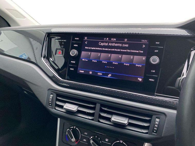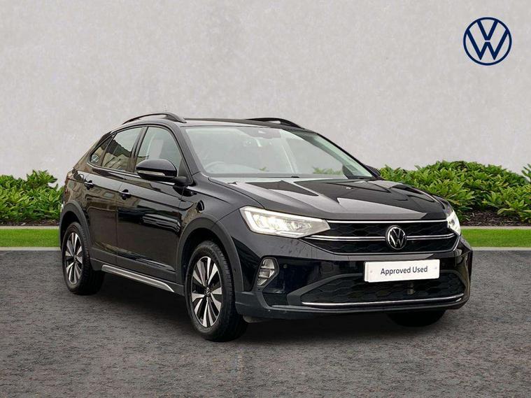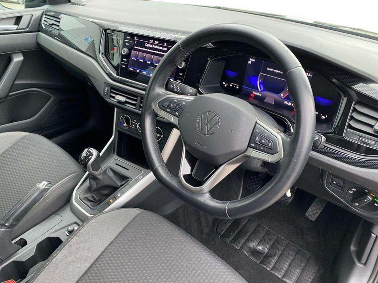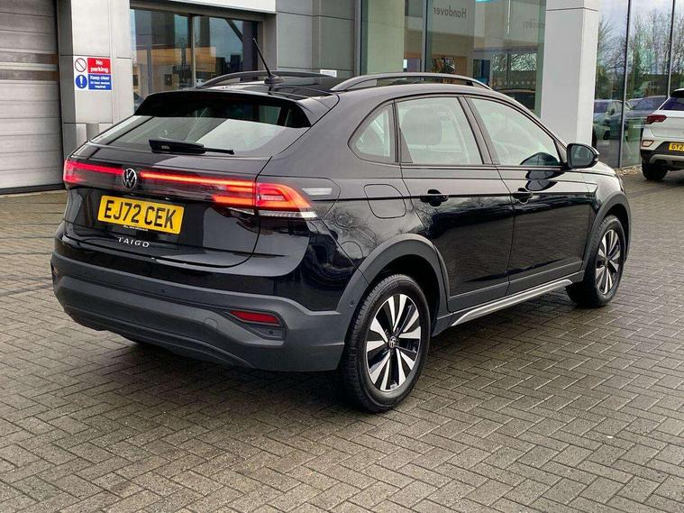 Driver alert system, e-Call (emergency call), Power Steering, Travel assist including emergency assist, Washer fluid level indicator, Wireless Charging including Bluetooth, Start-stop system with battery regeneration (recuperation - energy recovery during braking), WeConnect plus, Ambient lighting with logo projection, Aspherical driver's exterior mirror, Auto headlights, Body coloured bumpers, Body coloured exterior mirror housings and door handles, Electric windows, External USB type C socket and charging sockets, Front fog lamps with cornering function, Headlight range control, Heat insulating glass windscreen, LED headlamps, LED rear combination lamp, LED third brake light, Left convex exterior mirror, Power folding adjustable/heated exterior mirrors and front passenger exterior mirror lowering function, Rear fog light on one side, reversing light on both sides, Rear side wing doors, Rear wash/wipe with intermittent wipe setting, 'Slash/ Austin' Cloth upholstery, 12V socket in centre console, 2 front reading lights, 3 rear head restraints, 3 seat bench in 2nd row, Black carpets, Child seat anchor for child seat system i-Size, 2x top tether and child seat anchor in front on front passenger side, Door and side trim panels in titan black, Driver and front passenger seat height adjustment, Front centre armrest, Handbrake lever handle in leather, Height and reach adjustable steering wheel, Leather trimmed gear knob, Leather wrapped multifunction steering wheel, Luggage compartment floor, Luggage compartment light, Lumbar support for driver's and front passengers seat, Seat covers in titanium black, Single front passenger seat, Split folding backrest with centre armrest and unsplit rear seat bench, Storage compartment under front seats, Sun visors with illuminated vanity mirrors, Chrome Package - Taigo, Drivers assistance pack - Taigo, Light and Sight pack including High beam assist - Taigo, 2 x 3-point seatbelts/outer rear seats with ECE label, 3-point seat belts in front with pretensioner and height adjustment, 3-point seatbelt for centre rear seat, Driver and front passenger airbags with front passenger airbag de-activation, front side and curtain airbags, Driver and front passenger safety-optimised head restraints, Electronic stability control, Extended and predictive pedestrian/ cyclist protection, Front and rear disc brakes, Front curtain and side airbags with center airbag, Hill start assist, Manual rear child locks, Single tone horn, Tyre pressure loss indicator, Anti-theft alarm system with interior monitoring, backup horn, and towing protection, Anti-theft wheel bolts, Lava stone black gloss/matt decorative inserts in dash and front door panels, Low rolling resistance tyres,