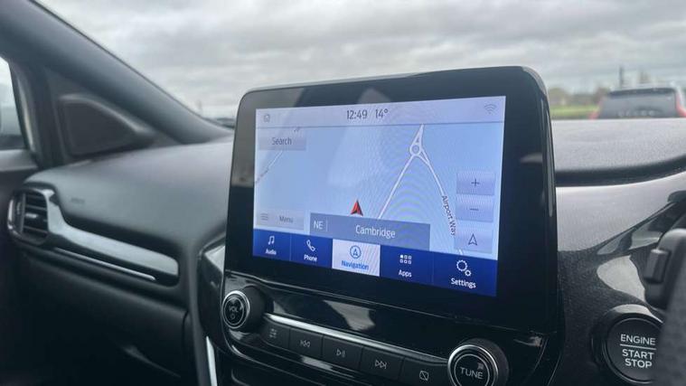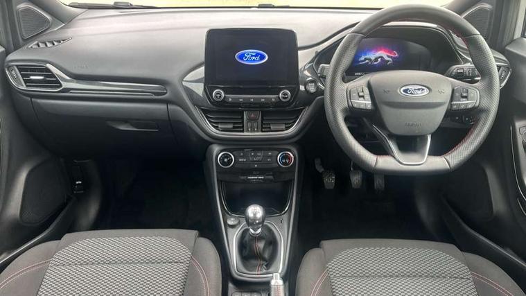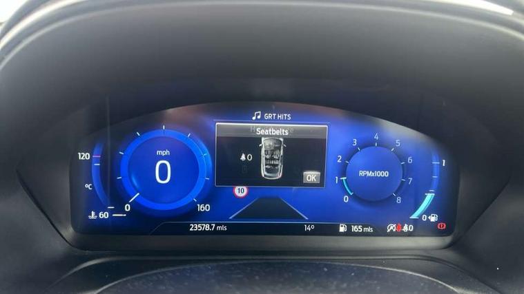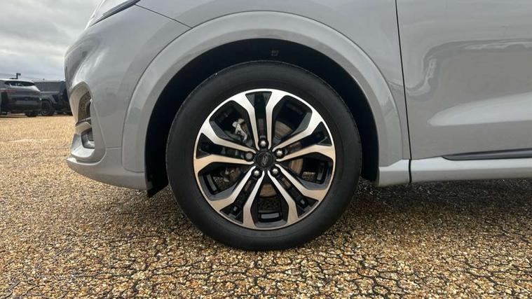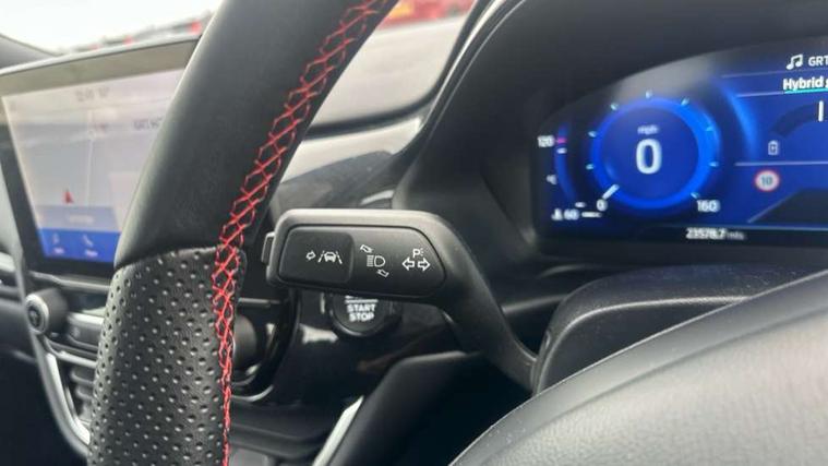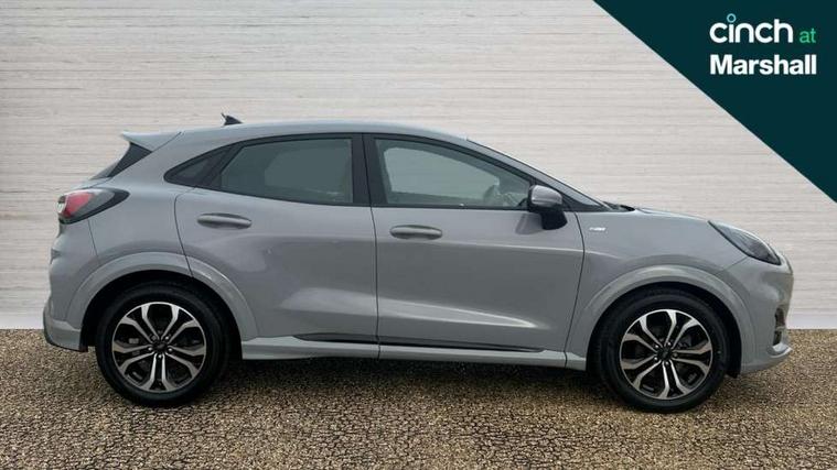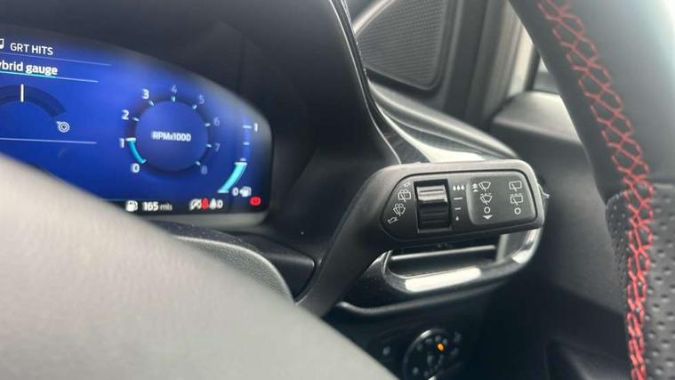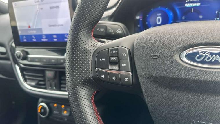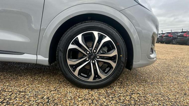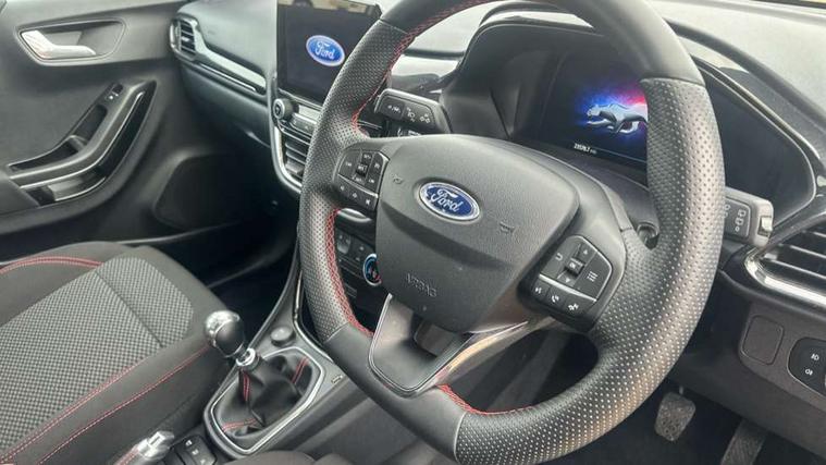 Driver impairment monitor, Emergency call service, Ford easy fuel, Full digital 12.3" instrument cluster, Lane keeping aid with lane departure warning, Power assist steering, Power start button, Rear parking sensor, Selectable drive modes(Normal, Eco, Sport, Slippery and Trail), Speed sign recognition, Sport suspension, Automatic headlights with auto high beam, Automatic rain sensing wipers, LED rear lamps, Power foldable heated door mirrors with puddle lamps, Projector headlamps with LED day time running lights and front fog lamps, Quickclear heated windscreen, Rear side wing doors, Rear wiper, ST-Line body styling kit with unique grille and large body colour rear spoiler, Third brake light, 3 seat bench in 2nd row, Centre console with armrest and stowage, Ford megabox extended bootspace, Front and rear head restraints, Front floor mats, Manual 2 way passenger seat adjustment, Manual 4 way driver seat adjust with lumbar adjustment, Single front passenger seat, ST- Line cloth trim with red stitching, ST-Line flat bottomed sensico leather steering wheel with leather handbrake and aluminium gear knob, Ford SYNC 3 navigation pack - Puma, 3 rear seatbelts, Child safety lock, Electronic stability control (ESC) and hill start assist, Pedestrian/cyclist detection & post-collision braking, Pre collision assist system, Tyre pressure monitoring system (TPMS), Thatcham alarm,