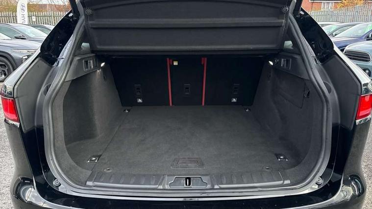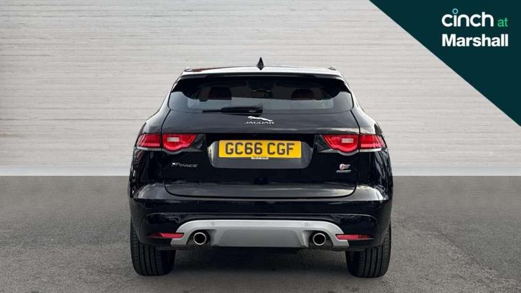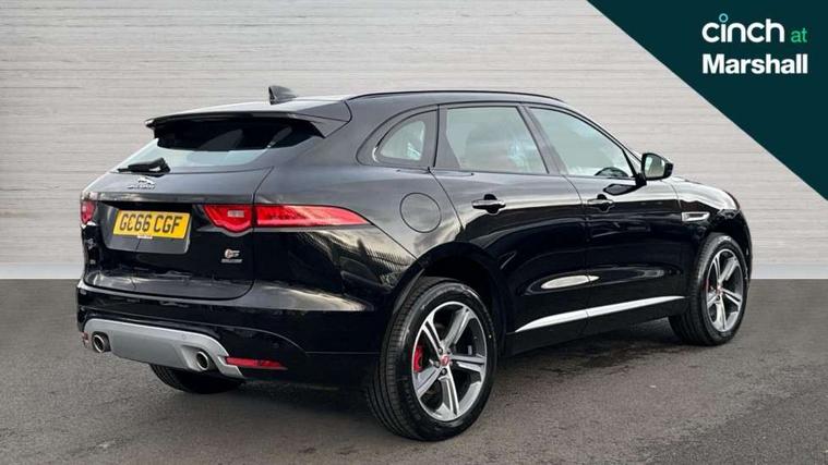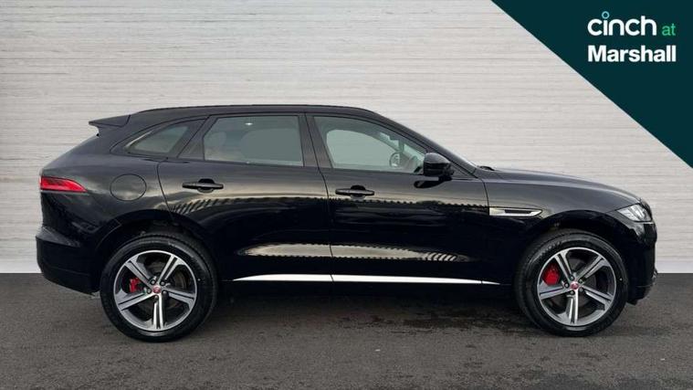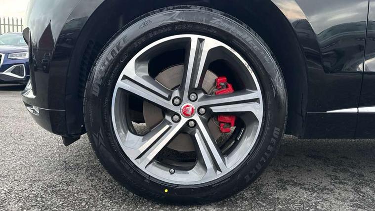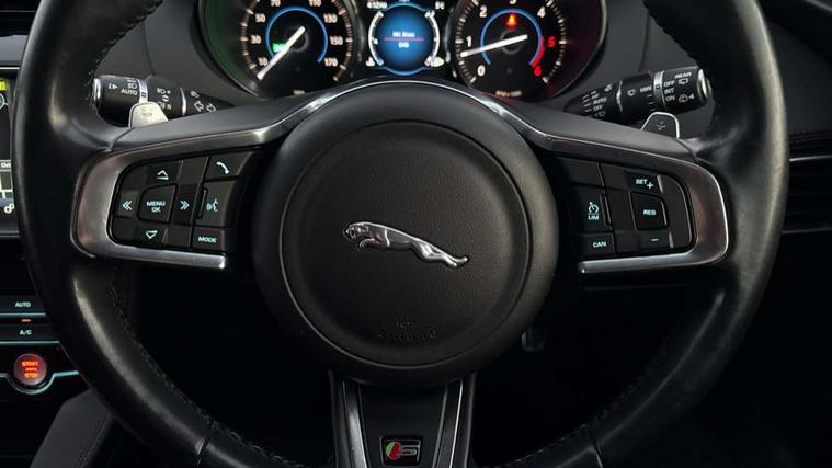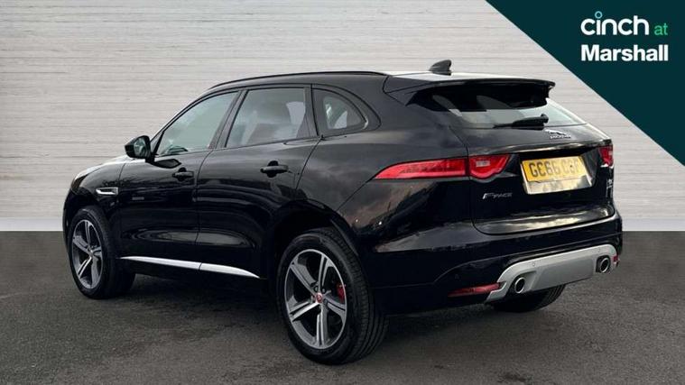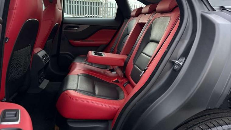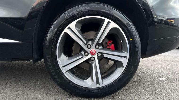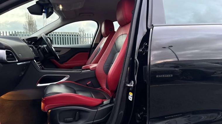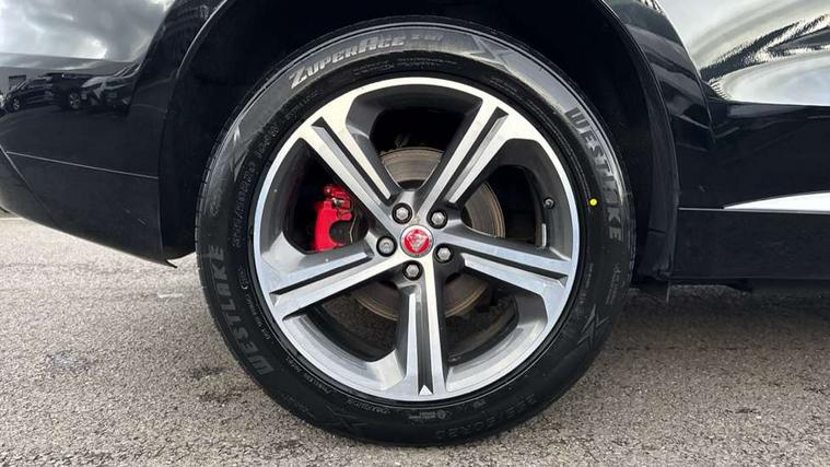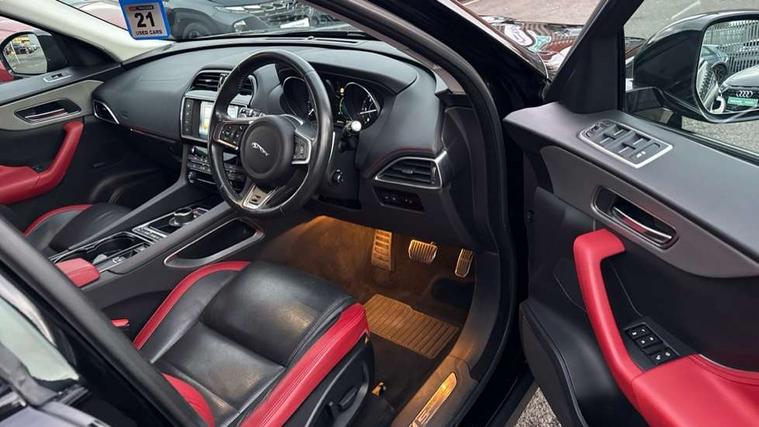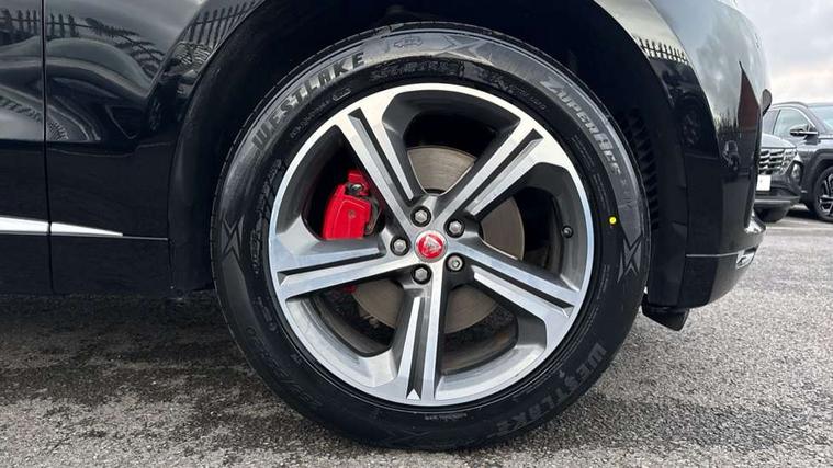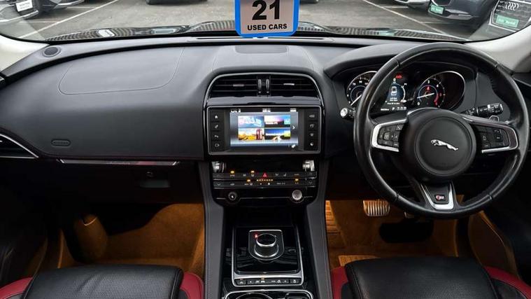 Auto speed limiter, Front parking aid, Lane departure warning system, Outside temperature gauge, Power tailgate, Rear parking aid, Service interval indicator, Touch screen display, Traffic sign recognition, Trip computer, Variable PAS, Adaptive dynamics, All terrain progress control, Bluetooth connectivity including audio streaming, DAB Digital radio, Dynamic volume control, 'S' Body kit, Approach Illumination, Auto dimming rear view mirror, Automatic headlights, Body colour bumpers, Body colour door mirrors, Electric front/rear windows with one touch/auto up/down, Front fog lights, Green tinted heat insulating glass, Headlight washers, Heated rear window with timer, LED tail lights, Rain sensor windscreen wipers, Rear wiper, Satin chrome side power vents, Trailer stability assist, Variable front intermittent wipers, 12V power point front/rear, 12V power point in luggage area, 2nd row air vents, 3 rear headrests, 40:20:40 split folding rear bench seat, Fold flat front seats, Front centre armrest with storage compartment, ISOFIX on outer rear seats, Jaguar sense, JaguarDrive selector, Leather multi function steering wheel, Overhead console with sunglasses holder, Perforated taurus sports leather upholstery, Premium carpet mats, Rear armrest with cupholder, Shopping hook in boot, Sports pedals, Steering wheel gearshift paddles, Tie down hooks in luggage area, 350mm front brakes, 3x3 point rear seatbelts, ABS, Anti-whiplash front headrests, Autonomous emergency braking (AEB) with forward facing camera, Brake pad warning light, Driver/Front Passenger airbags, DSC - Dynamic Stability Control, Electronic parking brake, Emergency brake assist, Front and rear curtain airbags, Front and rear seatbelt reminder, Front passenger seat occupancy sensor, Front side airbags, Hill start assist, Power child locks, Red painted brake calipers, Torque vectoring brake, Traction control, Tyre pressure monitoring system, Immobiliser, Keyless Start, Perimeter alarm, Remote central locking, Valet mode,