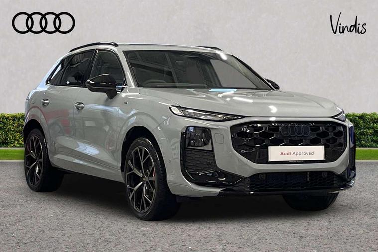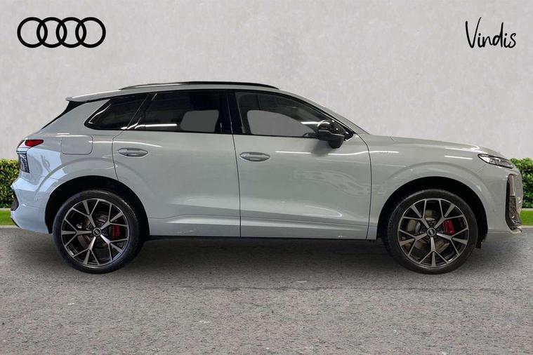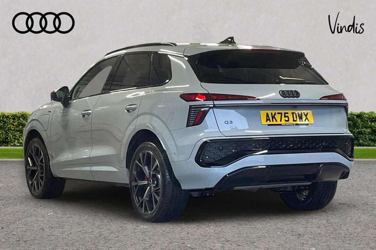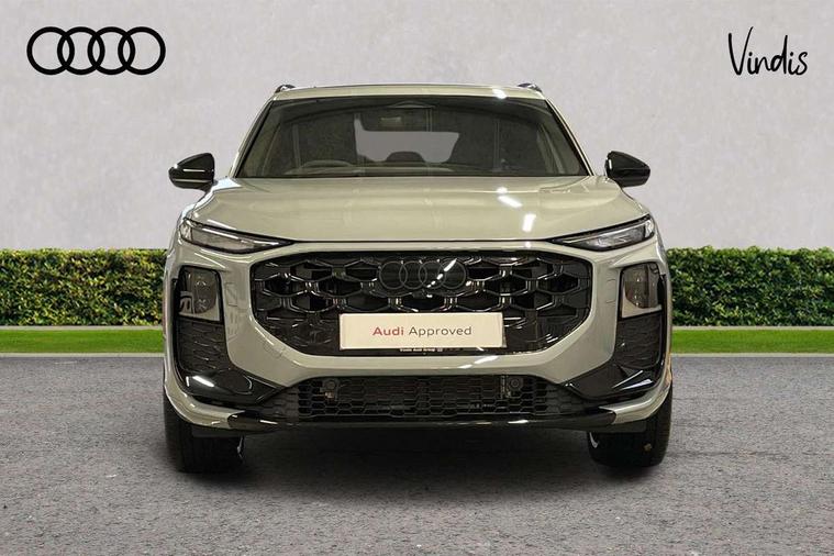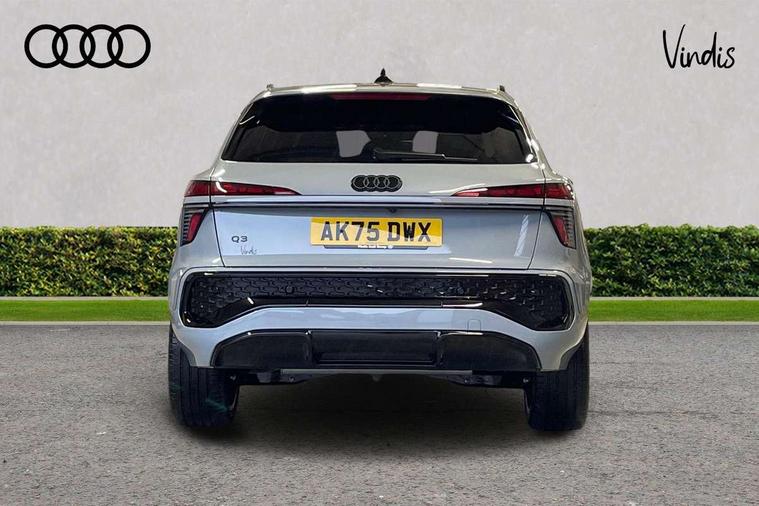 Adaptive cruise assist plus, Audi connect emergency call and service, Audi connect remote and controls, Audi drive select for suspension with damper control, Audi side assist with exit warning and rear cross traffic assist, Audi virtual cockpit plus - 11.9" display, Bluetooth interface, Camera based traffic sign recognition, Driver attention and fatigue detection with driver monitoring camera, Emergency assist, Front cross traffic assist, Garage door opener, Head up Display, In-car-office assist, Panoramic curved display with 12.8" MMI navigation plus and MMI touch, Phonebox light with wireless charging, Progressive steering, Projection of a black ice warning, Smartphone interface includes wireless Apple carplay/Android Auto, Start/stop system, Surround view cameras, Swerve assist and turn assist, Traffic sign based speed limiter, Trained parking, Voice control system with natural language interaction, 3 pin 10 amp domestic charging cable, Charging socket CCS type 2, Compact charging system, Industrial connector CEE 32A, 230V, Mode 3 charging cable for public charging, 22 KW (AC), Petrol Particulate Filter, Sound actuator for interior drive sound, Suspension with damping control, 2 USB-C ports with charge and data functions, DAB digital radio module, SONOS premium sound system, USB interfaces with higher charging capacity, Acoustic glass for front door windows, Acoustic windscreen, Advanced dynamic light scenario of the coming home/leaving home function, Aluminium window trim, Audi Q3 lettering on the B-pillars, Auto dimming rear view mirror, Automatic dynamic headlight range control, Automatically dimming exterior mirrors with memory function, Contrasting finish in volcano grey, Cornering light, Digital matrix LED headlights, Digital OLED rear lights, Dipped beam, Dynamic indicators, Electrically folding, adjustable and heated door mirrors with integrated LED side indicators and kerb view function for passenger side, Full paint finish, Headlight cleaning system, High resolution main beam, Illuminated door sills with aluminium inserts at the front with S logo, Intersection light, Lane light with side assist and direction indicator, LED daytime running lights, LED third brake light, Loading sill protector in stainless steel, Manoeuvring light, Motorway light, Opening panoramic sunroof, Orientation light with lane departure warning, Position light, Preparation for trailer hitch, Privacy glass - dark tinted rear window, rear door and side windows, Projection light in the exterior mirrors - Projects a graphic element onto the ground, Q3 badging on the rear, Rain and light sensors, Rear side wing doors, Rear window, rear door windows and rear side windows in clear glass, Rear wiper, Solid paint, Sports bumpers, Turning light, 3 seat bench in 2nd row, 3 spoke flat top and bottomed leather free multi function Sport steering wheel with gear shift paddles and "S" badging, 3-zone deluxe automatic air conditioning, 4 way lumbar support for the front seats - electric with horizontal and vertical adjustment in four directions, Black cloth headlining, Convenience auxiliary air conditioning, Electrically adjustable front seats with memory function for driver's side, Front and rear floor mats, Front and rear headrests, Front centre armrest, Heated front seats, Height and reach adjustable steering wheel, Interior storage compartment, Luggage compartment lid, electrically opening and closing, Microfibre upholstery with rhombus pattern and S emblem + front sports seats, Single front passenger seat, Stainless steel pedals, Steering wheel operating unit, gloss black, Storage compartment in front centre console, Ambient lighting package pro - Q3, Black styling pack with black door mirrors - Q3, Function pack - Q3, 3 point seat belts in front, with pretensioner and electric height adjustment, 3x3 point rear seatbelts, Acoustic vehicle alerting system, Convenience key with safelock, Driver and front passenger airbag with passenger airbag deactivation, Electromechanical parking brake, Electronic stabilisation control including ABS, ASR and EDL, First aid kit with warning triangle and high visibility vests, Front and rear side airbags with head airbags and front interaction airbag, Front emergency brake assist, i - Size child seat mounting on the front passenger side and i - Size and top tether on the outer rear seats, Power operated child locks, Proactive occupant protection, front, side and rear, Rear side airbags, Red brake callipers, front and rear, Seatbelt monitoring, Tyre pressure loss indicator, Anti theft wheel bolts, Remote central locking, Thatcham approved category 1 anti theft alarm, Dark aluminium divergence inlay, Interior elements in dinamica microfibre, Interior trims in aluminium look, 20" 5 spoke tripod design alloy wheels with gloss turned finish in darkened metallic black, Tool kit and Jack, Tyre repair kit,