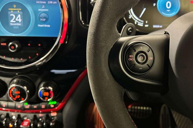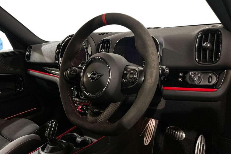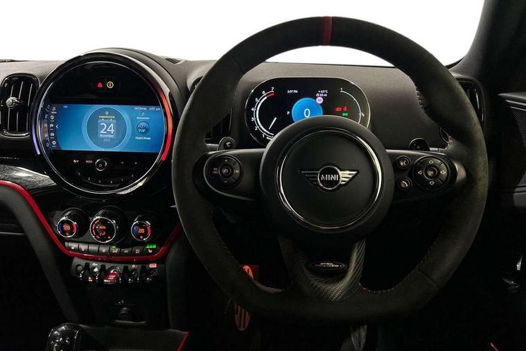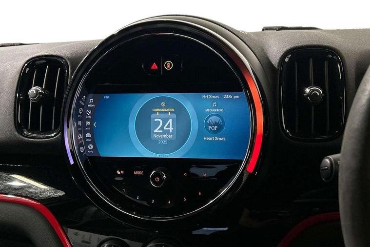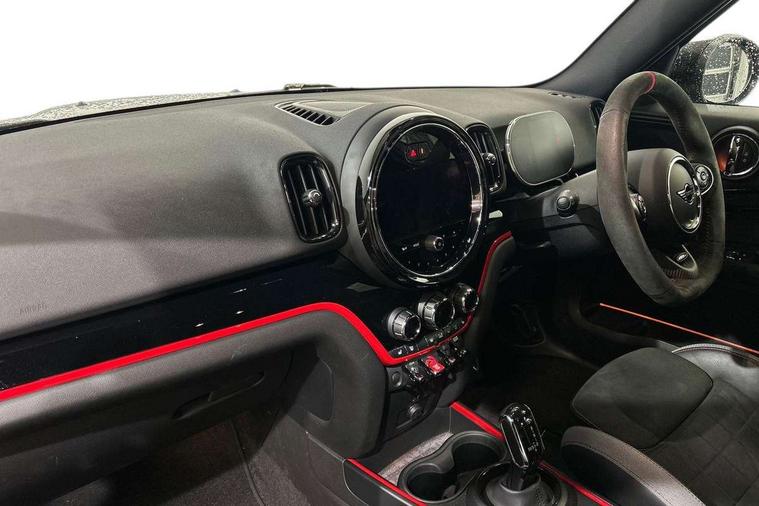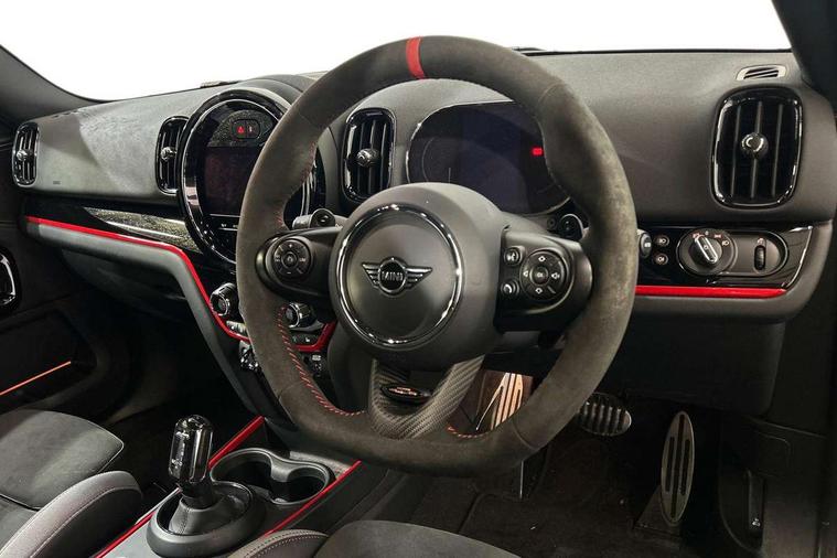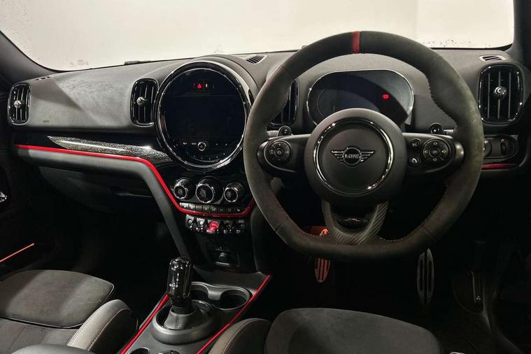 Active Guard incl speed limiting and lane departure functions with auto steering, and front collision warning with brake intervention, Automatic start/stop function with brake energy recuperation, Compatible mobile phone bluetooth with audio streaming, Cruise control with brake assist, Electro-mechanical speed dependant steering assistance, Instrument cluster, MINI Driving Modes - centre toggle switch to control driving setting (sport, mid and green), Mini E-call, On board computer, Rear parking distance control, 51 Litre fuel tank, Double Vanos system, Fully variable valve control, High precision injection, Performance Control, Sport automatic transmission with steering wheel paddles, FM tuner and DAB digital radio, 3rd brake light, Bonnet scoop, Chrome fuel filler cap, Day time driving lights, Dynamic brake lights, Electric windows, Heated rear window, Heated windscreen washer jets, John Cooper Works - aerodynamic kit (front and rear apron, spoiler), front and rear sport bumpers and part-painted side sills with door sill finishers, John Cooper Works Logo, LED fog lights, LED Headlights, Metal door sill strips with Cooper S imprint, Model logo, Model logo on Tailgate, Rain sensor with auto headlights, Rear fog lights, Rear side wing doors, Rear window wiper, Side scuttle panel with integrated indicator, Split rear doors, Sun/heat protection glass, White indicator lenses, 12V socket in centre console, 3 seat bench in 2nd row, 360L luggage compartment capacity, 4 lashing eyes in luggage compartment, 40:20:40 split folding rear seats, Anthracite headlining with grab handles and clothes hooks, Chrome interior highlights, Colour line - Carbon black, Cupholders, English handbook, Floor mats, Front headrests, Glove compartment, Height and length steering column adjustment, Interior lighting with 12 basic colours selectable via toggle switch in roof, Isofix rear child seat preparation, LED reading lights, vanity mirror lights, front foot well light and spotlight on front seats, Manual air conditioning, Mini John Cooper Works leather gearshift lever and handbrake gaiters, Multifunction steering wheel, Nappa leather steering wheel with MINI Yours logo, Rear headrests, Single front passenger seat, Stainless steel pedals and foot rest, Storage compartments in doors, Sunvisors with vanity mirrors, Excitement pack - Countryman, Navigation pack - Countryman, Piano black exterior pack - Countryman Cooper S/SD/SE/Boardwalk, 2 tone horn, 3 point seatbelts on all seats, 6 Airbags - front, side, head and seat belt tensioners, Anti-lock braking system (ABS), DSC - Dynamic Stability Control, Electronic handbrake, Front and rear disc brakes, Hill start assist, Manual rear child locks, Tyre pressure monitoring system, Alarm system with tilt sensor, monitoring doors, bonnet interior and tailgate, Auto drive away locking, Deadlocking function, Electronic vehicle immobiliser, Locking wheel bolts, Start/stop toggle with keyless go, Piano black JCW interior trim, Tool kit,