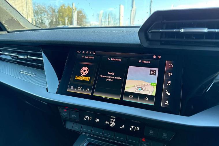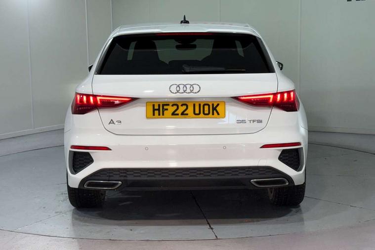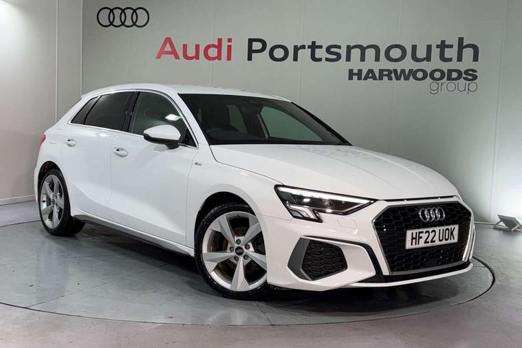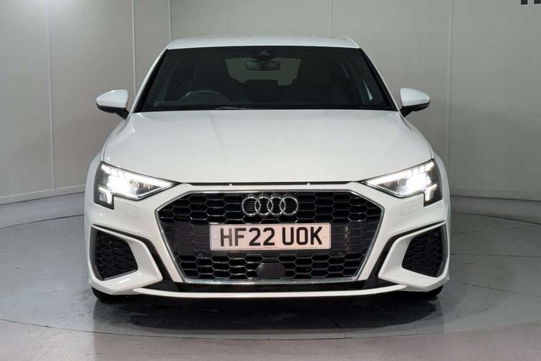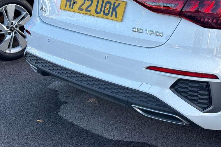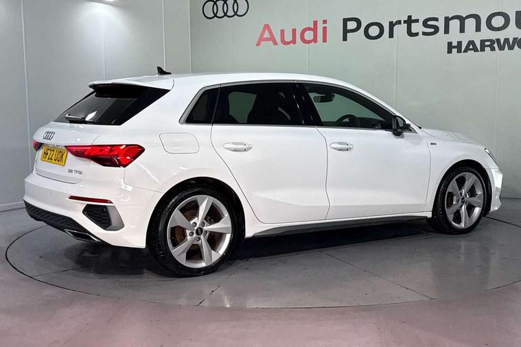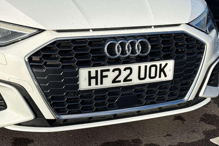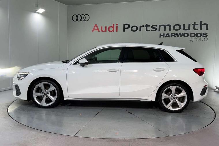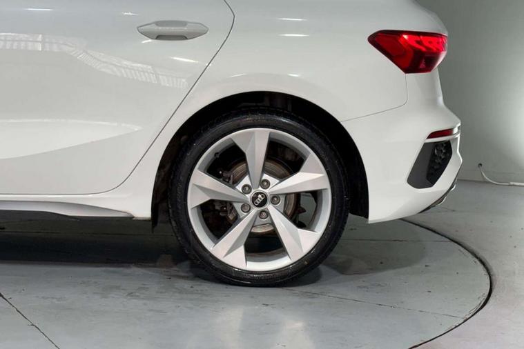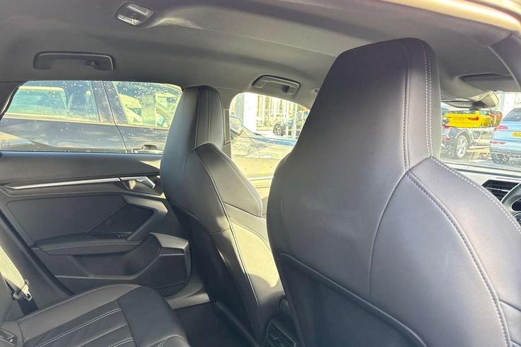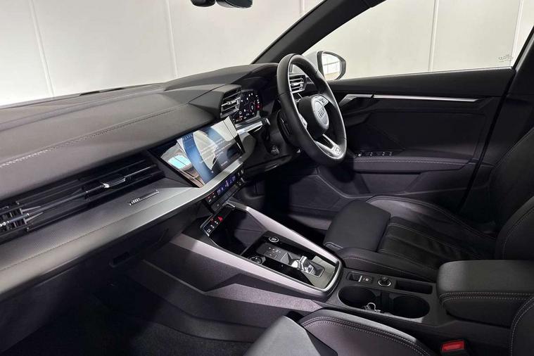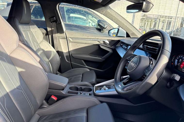 Audi connect emergency call and service, Audi drive select (Auto, Comfort, Dynamic, Efficiency and Individual), Audi smartphone interface, Audi Virtual Cockpit - 10.25" digital and colour instrument cluster, Automatic start/stop system with recuperation, Bluetooth interface, Collision avoidance assistant, Electromechanical power speed sensitive steering, Lane departure warning system, MMI Navigation Plus with high resolution 10.1" colour touch screen display, Service indicator, Trip computer, Voice control system with natural language interaction, 2xUSB-C connection with data and charging functions, 6 passive loudspeakers, DAB Digital radio, 3rd brake light, Acoustic glass windscreen, Aluminium window trim, Auto dimming frameless rear view mirror, Electrically adjustable/heated/folding/auto dimming door mirrors with integrated LED indications + kerb view function for passenger side, Front electric windows, Illuminated aluminium inserts front door sills with S logo, LED daytime running lights, LED headlights with LED rear lights and dynamic rear indicators, Light and rain sensors, Privacy glass - dark tinted rear window, rear door and side windows, Rear electric windows, Rear side air outlets in grained matt black, Rear side wing doors, Rear wiper, S line bumpers, S roof spoiler, 12V socket and storage compartment in front centre console, 3 seat bench in 2nd row, 40/20/40 split folding rear seat bench with cupholder, Black cloth headlining, Dual zone electronic climate control, Front and rear centre armrest in leather, Front and rear headrests, Front/rear floor mats, Height and reach adjustable steering wheel, Illuminated vanity mirror, Interior lighting - glove compartment light and right hand side, Luggage compartment floor covering, Manual boot compartment lid, Manually adjustable front seats, Seat side bolsters, Single front passenger seat, Stainless steel pedals and front footrest in black, Twin leather upholstery with front sports seats S embossed logo, Aluminium interior elements pack - A3 Sportback, S line styling pack - A3 Sportback, 3x3 point rear seat belts, Driver and front passenger airbag with passenger airbag deactivation, Electronic Stabilisation Control (ESC) including ABS, ASR and EDL, First aid kit with warning triangle and 2 safety vests, Front side airbags with head airbags and interaction airbag, Pre-sense front with pedestrian and cyclist detection, Seatbelt monitoring, Tyre pressure loss indicator, Anti theft alarm, Anti-theft wheel bolts, Immobiliser, Manual child locks, Remote control central locking, Accent surfaces in the dashboard and centre console in platinum grey silk effect paint finish, Dark spectrum aluminium inlays,