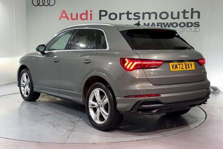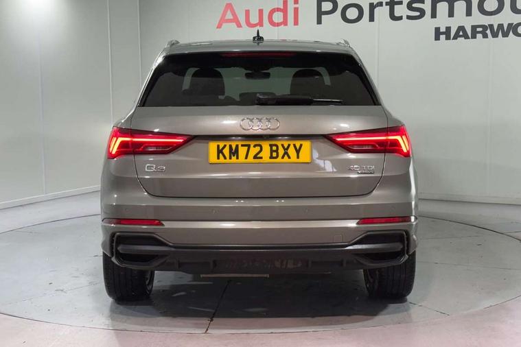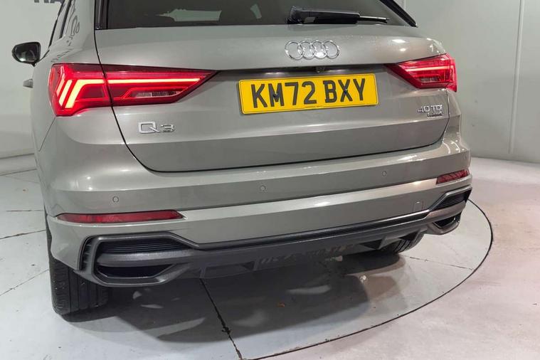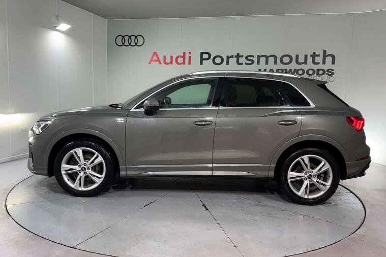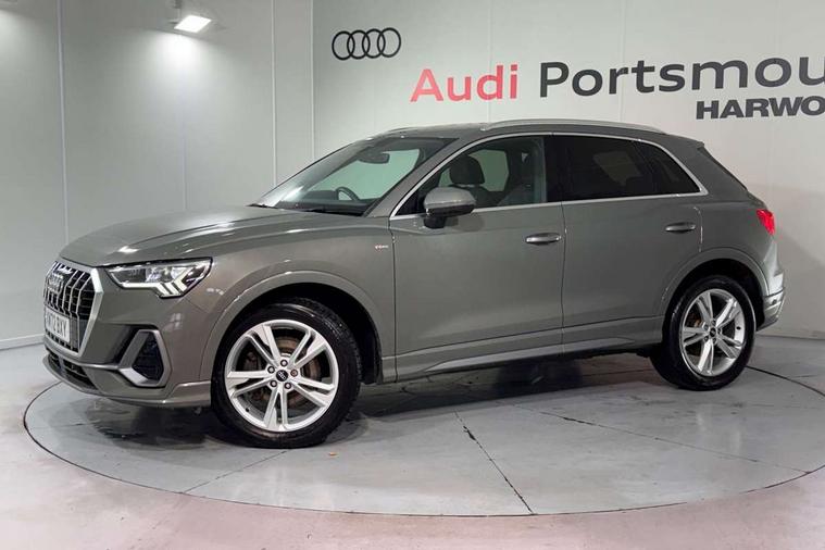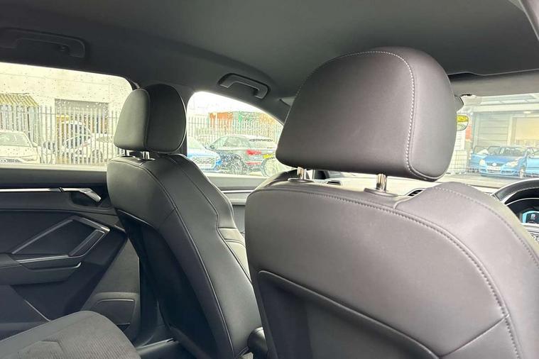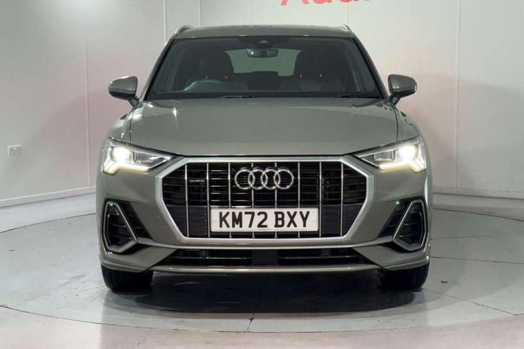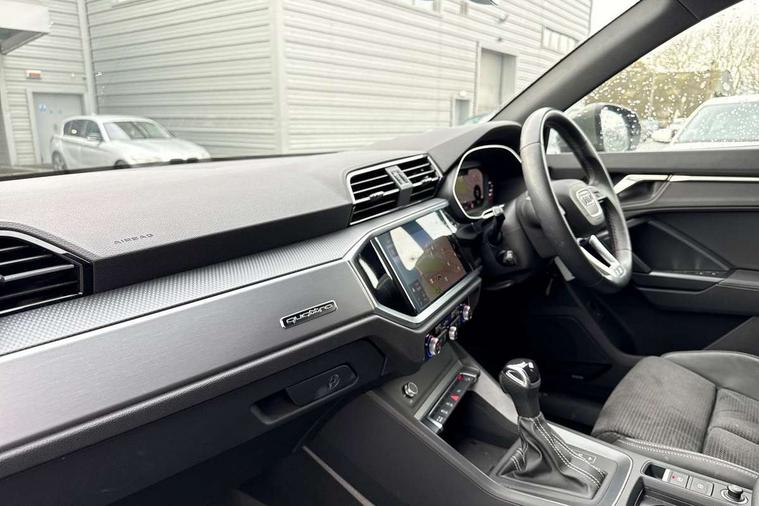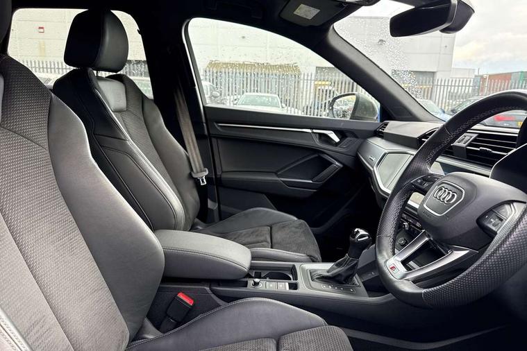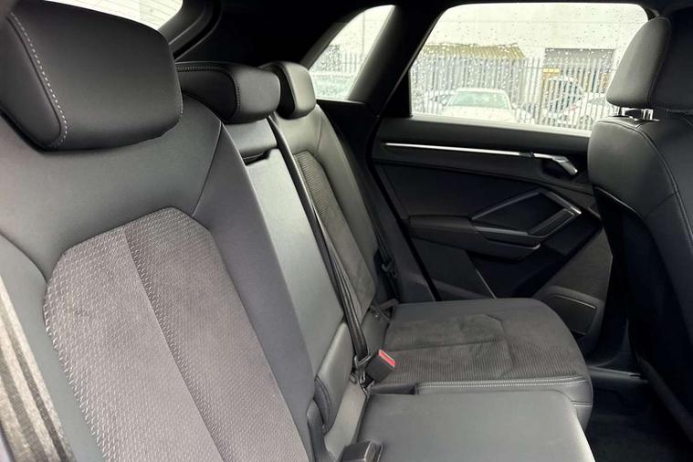 Amazon alexa Integration, Audi drive select, Audi lane departure warning, Audi smartphone interface includes wireless Apple carplay/Android Auto, Audi Virtual Cockpit - 10.25" display, Bluetooth interface, Camera based traffic sign recognition, Legal emergency call, MMI Navigation Plus with high resolution 10.1 inch touchscreen colour display, Power operated tailgate, Progressive steering, Service interval indicator, Start stop system with recuperation, Voice control system with natural language interaction, Diesel particulate filter, Sports suspension, 2 USB-C ports with charge and data functions, 6 passive loudspeakers, DAB digital radio module, Acoustic windscreen, Aluminium roof rails, Aluminium window trim, Auto dimming frameless rear view mirror, Body colour front spoiler blade, Body coloured bumpers, Electrically folding, adjustable and heated door mirrors with integrated LED side indicators and kerb view function for passenger side, Front and rear electric windows, Front fog lights, Front side air inlets in matt platinum grey, Grille vertical bars in aluminium silver/Matt, High gloss black finish B and C pillars, LED Dynamic rear indicators, LED headlights with LED daytime running lights, LED rear lights, LED third brake light, Privacy glass dark tinted rear and rear-side windows (from B-pillar backwards), Rain and light sensors, Rear diffuser grille in grained matt black, Rear diffuser strip in matt titanium black, Rear side wing doors, Rear wiper, S line badges on front wings, S Line front and rear bumpers, Side skirt insert in matt Platinium grey, Titanium black radiator grille, Variable front intermittent wipers, 12V socket in rear centre console, 3 seat bench in 2nd row, 40:20:40 folding with manual adjustment for 60:40 forwards/backwards position and backrest angle, Adjustable rear seat bench/backrest with centre armrest and cupholder, Black cloth headlining, Dual zone electronic climate control, Front and rear black floor mats with contrast stitching in rock grey, Front and rear headrests, Front and rear roof module including reading lights, Front centre armrest, Glove compartment lighting, Height and reach adjustable steering wheel, Illuminated door sill trims with S logo, ISOFIX child seat mounting for front passenger with airbag deactivation and outer rear seat including top tether attachment point for outer rear seats, Luggage compartment light, Manual front seats with height adjustment, Perforated leather gearknob, Single front passenger seat, Stainless steel luggage compartment sill finisher, Stainless steel pedals, Ambient lighting pack - Q3, Non smoking pack - Q3, 3x3 point rear seatbelts, 6 airbags - Driver, front passenger, curtain and side windows, Audi pre-sense front with pedestrain and cyclist recognition, Electrically operated child locks on rear doors, Electromechanical parking brake, Electronic stabilisation control including ABS, ASR and EDL, Front seatbelt reminder, Hill descent control, Hill hold assist, Pre sense basic, Seatbelt monitoring, Tyre pressure warning, Warning triangle and first aid kit, Anti theft alarm, Anti theft wheel bolts, Immobiliser, Remote central locking, Dark matt brushed aluminium inlay, Detail dashboard around MMI touch colour display in glass look, black with surround in aluminium look, Leatherette door armrest,