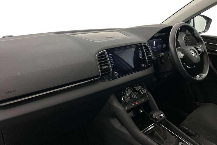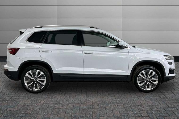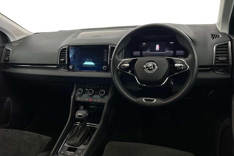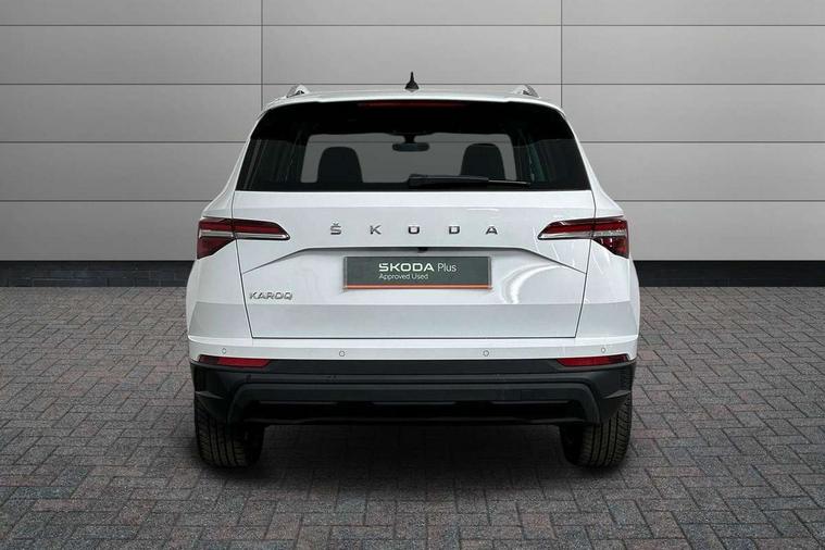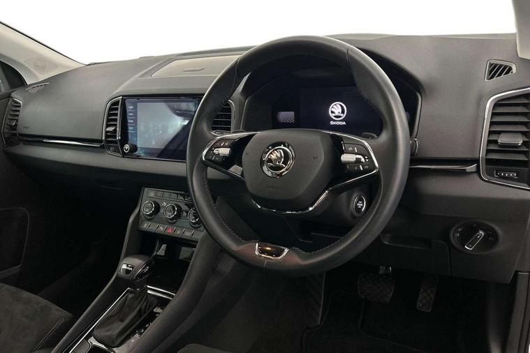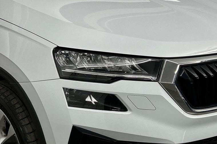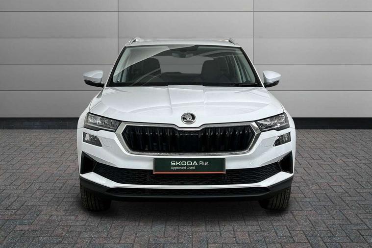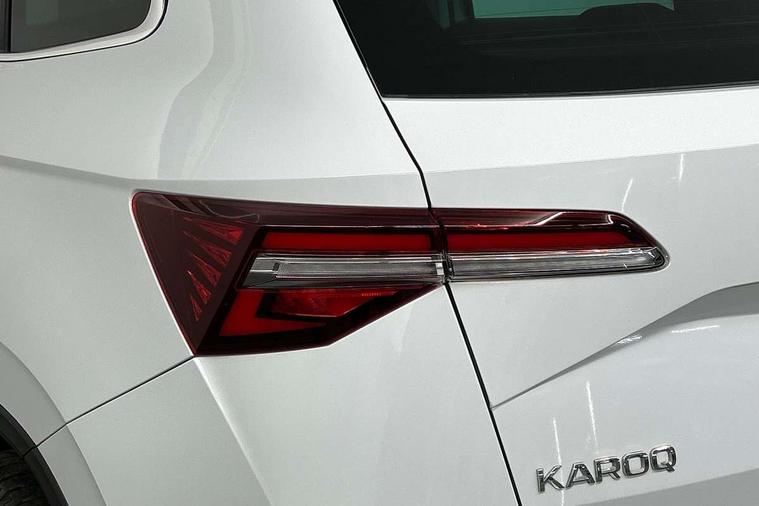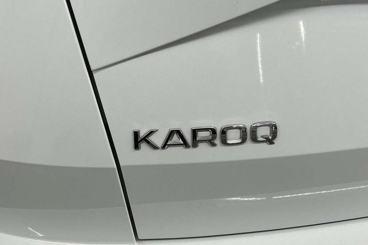 8" Digital display, Care connect, Driver fatigue sensor, Emergency services call system, Outside temperature gauge, Service interval indicator, SmartLink wireless for Apple and wired for Android, Start/stop system with regenerative braking, USB C Port x 2 in front centre console, 8 Speakers, DAB radio with Bluetooth, USB connection, Acoustic glass, Aero front windscreen wipers with intermittent function, Auto dimming rear view mirror with light and rain sensors, Black electric window control buttons, Body colour door mirrors and handles, Dynamic headlight range control with cornering light function, Electric front and rear windows with child proof lock, Heated rear windscreen, LED daytime running lights, LED rear lights with high functionality welcome effect and dynamic indicators, Light assistant (coming/leaving home/tunnel light), Plastic scuff plates, Privacy glass, Rear side wing doors, Rear spoiler, Rear window wiper with washer system and intermittent control, Safety reflectors on front doors, 1.5 litre bottle holders in driver and front passenger door panels, 12V socket in boot, 12v socket in front centre armrest with storage compartment and rear air vents, 2 spoke leather heated multifunction steering wheel with DSG paddles, 2 x Tablet holder, 3 rear height adjustable headrests, 3 seat bench in 2nd row, 4 foldable roof handles with rear coat hooks, Black floor carpet, Chrome inner door handles, Decorative door sills with KAROQ badging, Double sided boot floor, Foldable hooks in the boot, Front head restraints, Height adjustable front three point seats belts with tensioners, Height/reach adjust steering wheel, Ice scraper, Illuminated glovebox, Illuminated luggage compartment, Isofix child seat preparation for front passenger seat, Isofix child seat preparation outer rear, Manual lumbar support for front seats, Pen holder, Pollen filter, Rear boot cover, Rear reading lights, Rubbish bin door, Safety vest holder, Single front passenger seat, Storage box in upper central dashboard closed, Sunvisors with illuminated vanity mirrors, Textile floor mats, Ticket holder, VarioFlex seats with standard rear seat release, Boot pack - Karoq, Chrome roof rails + chrome pack - Karoq, Parking pack - Karoq, Automatic door unlocking in case of crash, Automatic fuel cut off in case of crash, Child locks on rear doors, Driver airbag, Electronic parking brake with auto hold function, Emergency rear braking signal, ESC including ABS, MSR, ASR, EDS, HBA, DSR, RBS, MKB and traction control, Front side airbags, Hill hold control, Knee airbags, Passenger airbag with switch-off function, Pedestrian monitor, Seatbelt reminder signalisation and pretensioner for all seats, Three point seatbelts rear, Two tone horn, Tyre pressure display, Tyre pressure monitor, Alarm with interior monitoring, back up horn and tilt sensor with safe function, Electronic engine immobiliser, Keyless entry and start/stop, Remote central locking with 2 remote folding keys, Chrome framed air vents, 18" Miran alloy wheels in black, Anti-theft wheel bolts protection, Storage on wheel cover, Tool kit,