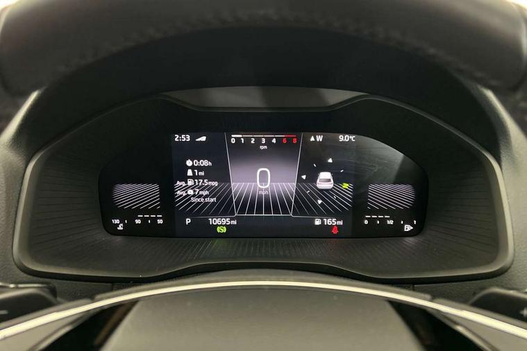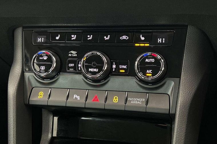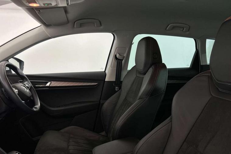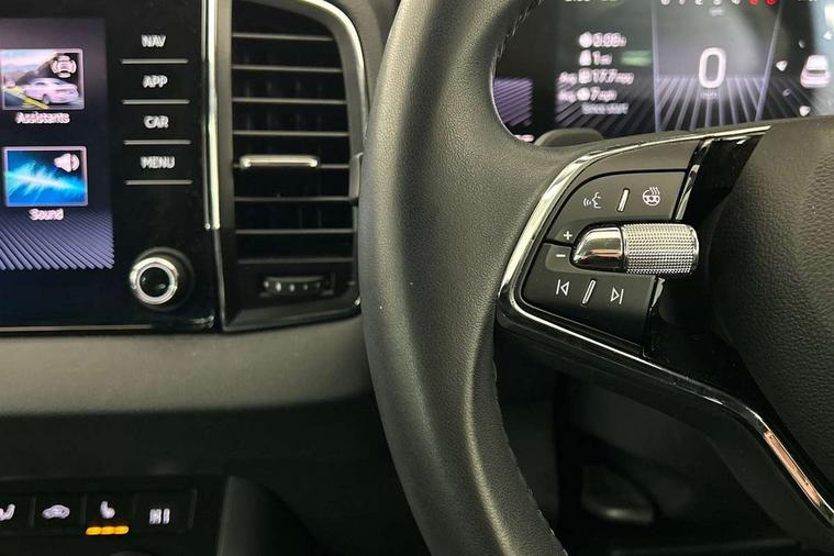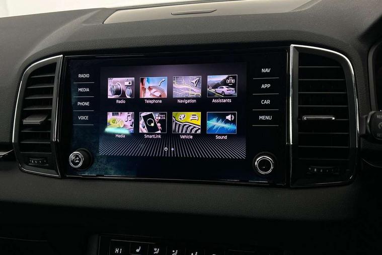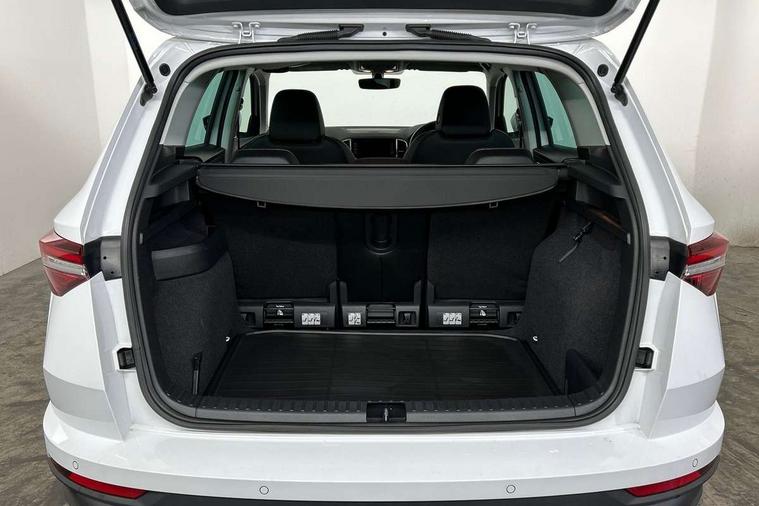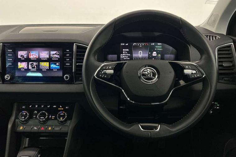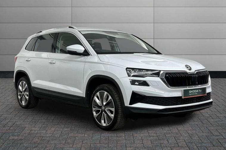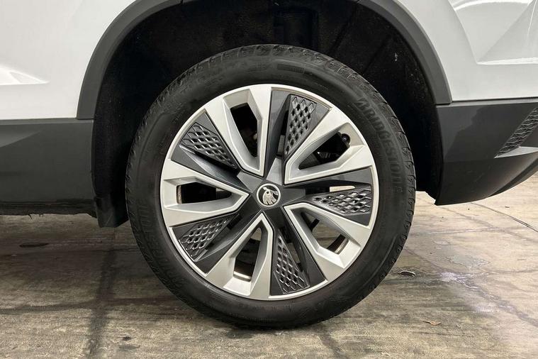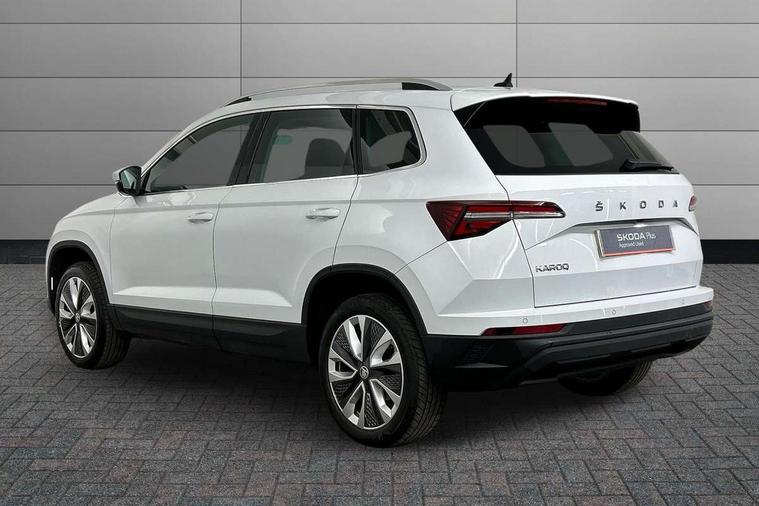 8" Digital display, Care connect, Driver fatigue sensor, Emergency services call system, Outside temperature gauge, Service interval indicator, SmartLink wireless for Apple and wired for Android, Start/stop system with regenerative braking, USB C Port x 2 in front centre console, 8 Speakers, DAB radio with Bluetooth, USB connection, Acoustic glass, Aero front windscreen wipers with intermittent function, Auto dimming rear view mirror with light and rain sensors, Black electric window control buttons, Body colour door mirrors and handles, Dynamic headlight range control with cornering light function, Electric front and rear windows with child proof lock, Heated rear windscreen, LED daytime running lights, LED rear lights with high functionality welcome effect and dynamic indicators, Light assistant (coming/leaving home/tunnel light), Plastic scuff plates, Privacy glass, Rear side wing doors, Rear spoiler, Rear window wiper with washer system and intermittent control, Safety reflectors on front doors, 1.5 litre bottle holders in driver and front passenger door panels, 12V socket in boot, 12v socket in front centre armrest with storage compartment and rear air vents, 2 spoke leather heated multifunction steering wheel with DSG paddles, 2 x Tablet holder, 3 rear height adjustable headrests, 3 seat bench in 2nd row, 4 foldable roof handles with rear coat hooks, Black floor carpet, Chrome inner door handles, Decorative door sills with KAROQ badging, Double sided boot floor, Foldable hooks in the boot, Front head restraints, Height adjustable front three point seats belts with tensioners, Height/reach adjust steering wheel, Ice scraper, Illuminated glovebox, Illuminated luggage compartment, Isofix child seat preparation for front passenger seat, Isofix child seat preparation outer rear, Manual lumbar support for front seats, Pen holder, Pollen filter, Rear boot cover, Rear reading lights, Rubbish bin door, Safety vest holder, Single front passenger seat, Storage box in upper central dashboard closed, Sunvisors with illuminated vanity mirrors, Textile floor mats, Ticket holder, VarioFlex seats with standard rear seat release, Boot pack - Karoq, Chrome roof rails + chrome pack - Karoq, Parking pack - Karoq, Automatic door unlocking in case of crash, Automatic fuel cut off in case of crash, Child locks on rear doors, Driver airbag, Electronic parking brake with auto hold function, Emergency rear braking signal, ESC including ABS, MSR, ASR, EDS, HBA, DSR, RBS, MKB and traction control, Front side airbags, Hill hold control, Knee airbags, Passenger airbag with switch-off function, Pedestrian monitor, Seatbelt reminder signalisation and pretensioner for all seats, Three point seatbelts rear, Two tone horn, Tyre pressure display, Tyre pressure monitor, Alarm with interior monitoring, back up horn and tilt sensor with safe function, Electronic engine immobiliser, Keyless entry and start/stop, Remote central locking with 2 remote folding keys, Chrome framed air vents, 18" Miran alloy wheels in black, Anti-theft wheel bolts protection, Storage on wheel cover, Tool kit,