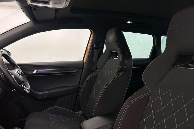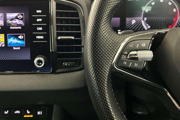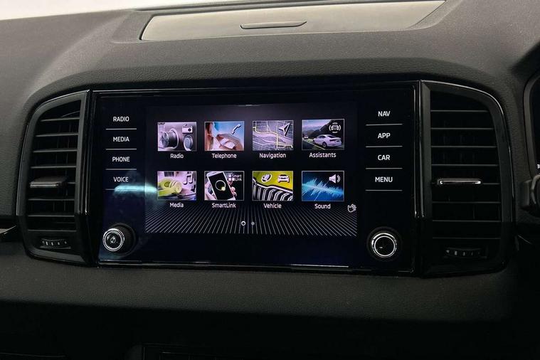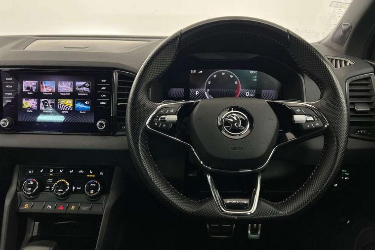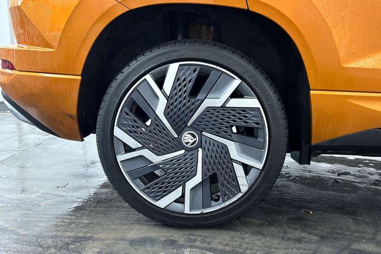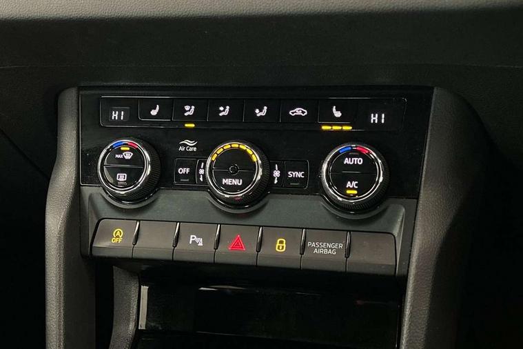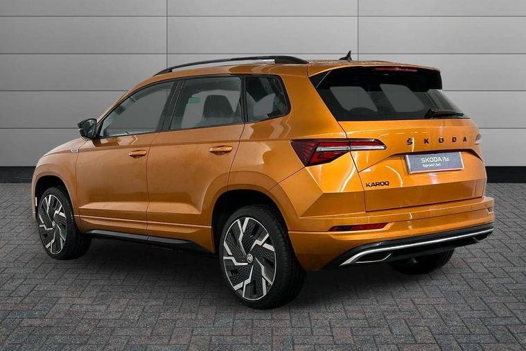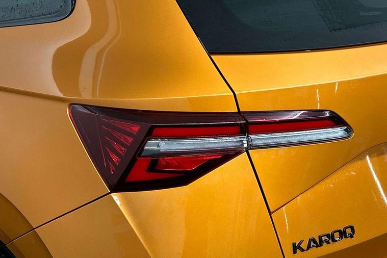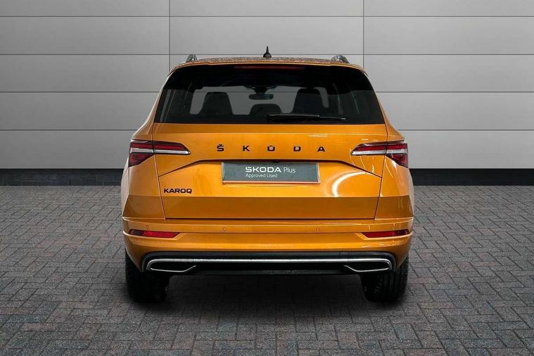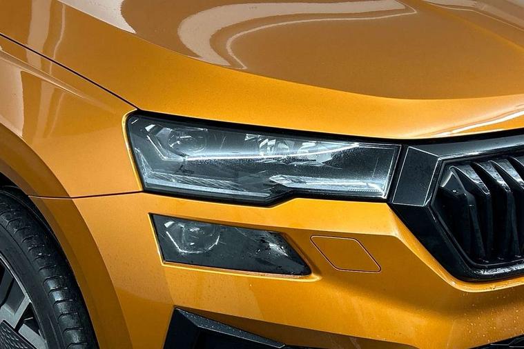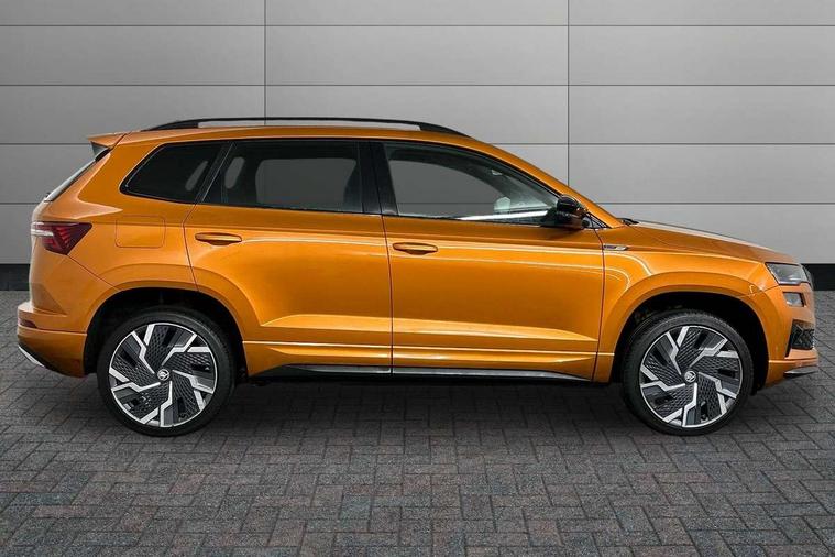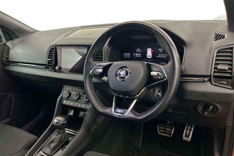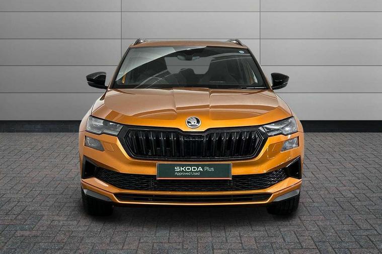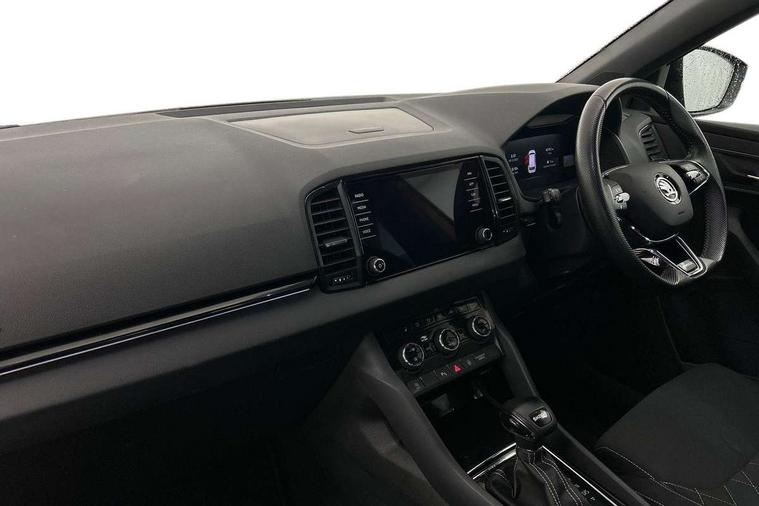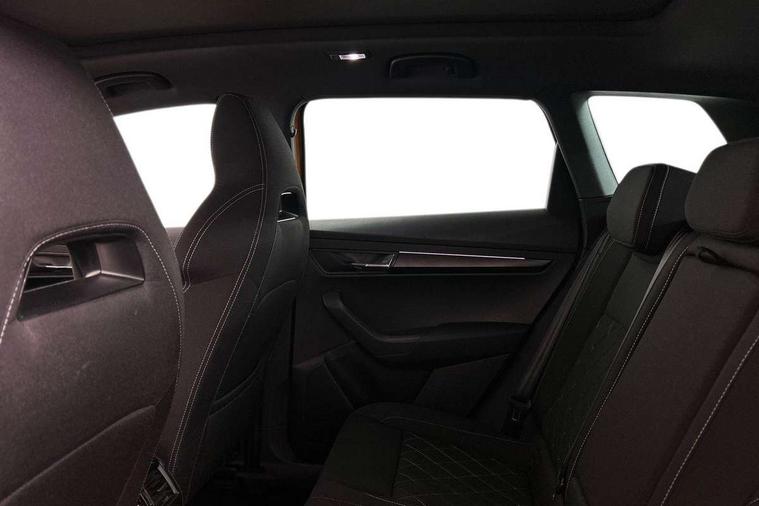 8" Digital display, Care connect, Driver fatigue sensor, Emergency services call system, Outside temperature gauge, Service interval indicator, SmartLink wireless for Apple and wired for Android, Start/stop system with regenerative braking, USB C Port x 2 in front centre console, Virtual cockpit, Virtual pedal with electrically operated boot door, 8 Speakers, DAB radio with Bluetooth, USB connection, Acoustic glass, Aero front windscreen wipers with intermittent function, Auto dimming rear view mirror with light and rain sensors, Black door mirrors, Black electric window control buttons, Black radiator grille, Black roof rails, Body colour door handles, Dynamic headlight range control with cornering light function, Electric front and rear windows with child proof lock, Front door steps with SportLine logo, Heated rear windscreen, LED daytime running lights, LED rear lights with high functionality welcome effect and dynamic indicators, Light assistant (coming/leaving home/tunnel light), Panoramic sliding sunroof, Plastic scuff plates, Privacy glass, Protective door side sills in body colour, Rear diffuser, Rear side wing doors, Rear spoiler, Rear window wiper with washer system and intermittent control, Safety reflectors on front doors, Skoda lettering on tailgate in black, Sportline badge on front fender, Sportline decorative inserts with badging, Sports front and rear bumpers, 1.5 litre bottle holders in driver and front passenger door panels, 12V socket in boot, 12v socket in front centre armrest with storage compartment and rear air vents, 2 Folding hooks and nets in boot, 3 rear height adjustable headrests, 3 seat bench in 2nd row, 3 spoke leather sports multifunction steering wheel and silver stitching with gear shift paddles, 4 foldable roof handles with rear coat hooks, Black floor carpet, Black roof headlining, Chrome inner door handles, Double sided boot floor, Foldable hooks in the boot, Front head restraints, Height adjustable front three point seats belts with tensioners, Height/reach adjust steering wheel, Ice scraper, Illuminated glovebox, Illuminated luggage compartment, Isofix child seat preparation outer rear, Manual lumbar support for front seats, Pen holder, Pollen filter, Rear boot cover, Rear reading lights, Rear seats fixed folding and divided 60:40, Rubbish bin door, Safety vest holder, Single front passenger seat, Storage box in upper central dashboard closed, Sunvisors with illuminated vanity mirrors, Textile floor mats, Ticket holder, Titan black interior ceiling, Welcome animation with sportline logo, Light Pack - Karoq, Parking pack - Karoq, Automatic door unlocking in case of crash, Automatic fuel cut off in case of crash, Child locks on rear doors, Driver airbag, Electronic parking brake with auto hold function, Emergency rear braking signal, ESC including ABS, MSR, ASR, EDS, HBA, DSR, RBS, MKB and traction control, Front side airbags, Hill hold control, Knee airbags, Passenger airbag with switch-off function, Pedestrian monitor, Seatbelt reminder signalisation and pretensioner for all seats, Three point seatbelts rear, Two tone horn, Tyre pressure display, Tyre pressure monitor, Alarm with interior monitoring, back up horn and tilt sensor with safe function, Electronic engine immobiliser, Keyless entry and start/stop, Remote central locking with 2 remote folding keys, Black air vent surround, Black centre console, Satin black dashboard, Satin black door trim, 19" Vega black polished alloy wheels, Anti-theft wheel bolts protection, Matt black aero hub caps, Storage on wheel cover, Tool kit,