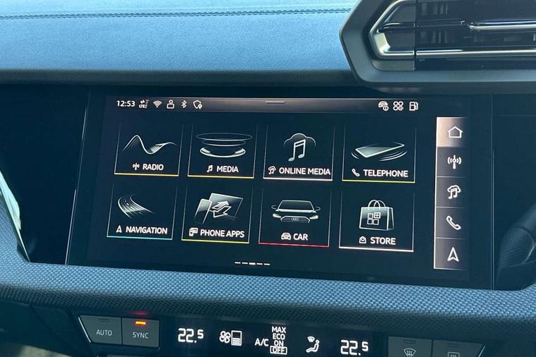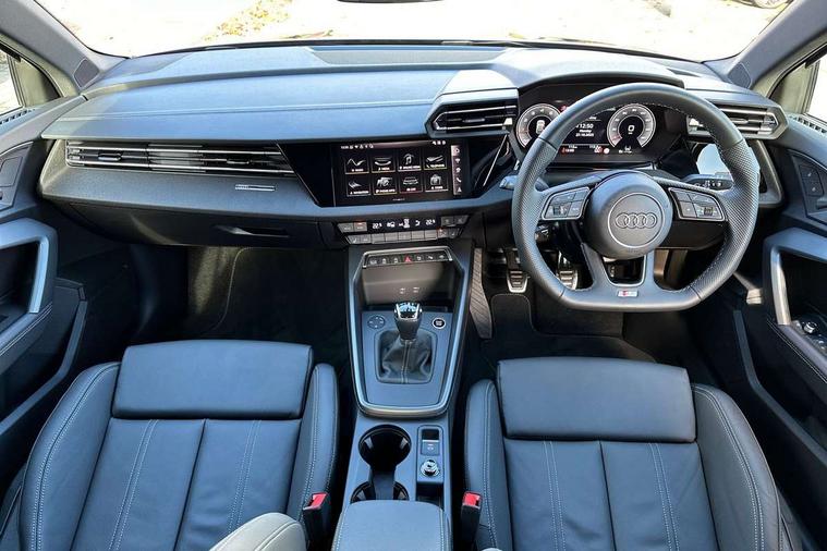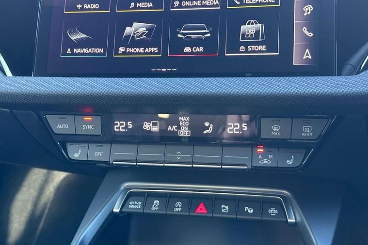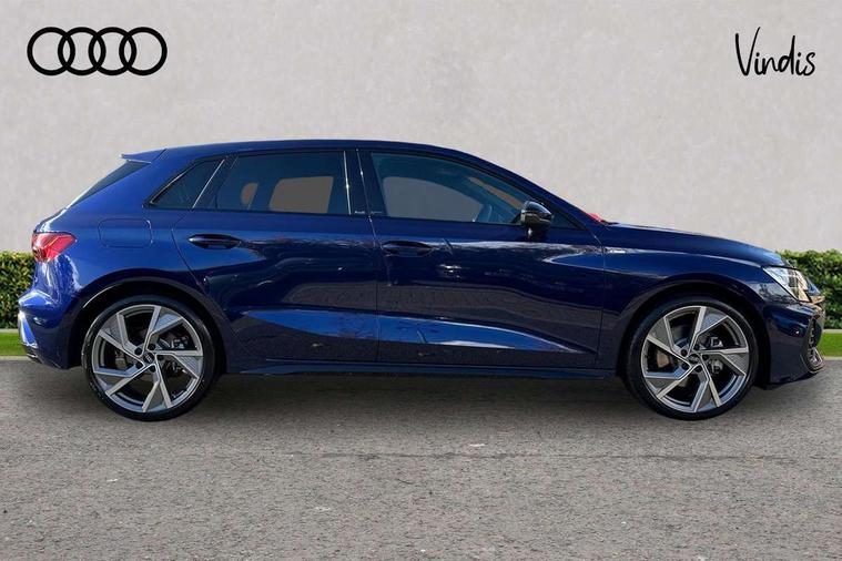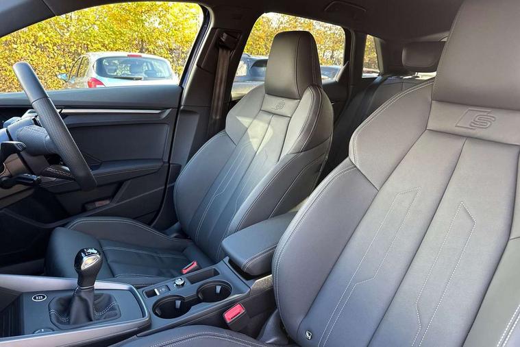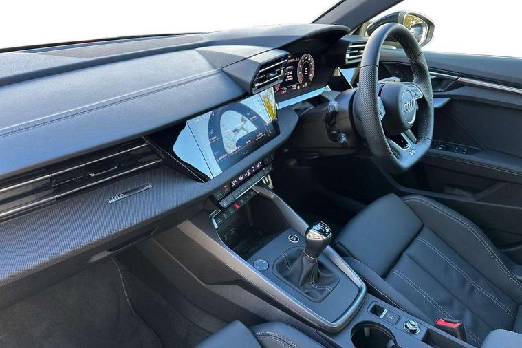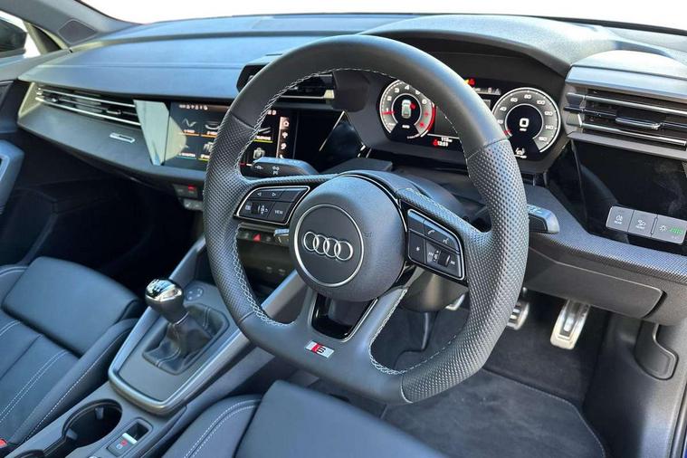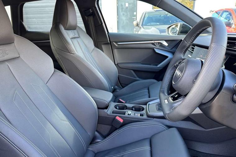 Adaptive cruise control (ACC), Adjustable speed limiter, Audi drive select (Auto, Comfort, Dynamic, Efficiency and Individual), Audi virtual cockpit plus - 12.3" full HD resolution dynamic digital instrument cluster, Automatic start/stop system with recuperation, Bluetooth interface, Camera based traffic sign recognition, Collision avoidance assistant, Driver attention and fatigue detection, e-Call (emergency call), Electromechanical power speed sensitive steering, Intersection assist, Lane departure warning system, MMI Navigation Plus with high resolution 10.1" colour touch screen display, Park Assist with parking system Plus, Reversing camera, Service indicator, Smartphone interface with app store includes wireless Apple carplay, Android auto and Amazon alexa integration, Trip computer, Voice control system with natural language interaction, Sports suspension, Audi Phonebox light with wireless charging, Audi sound system - 10 loudspeakers including centre loudspeaker and subwoofer, DAB Digital radio, USB ports with charging function in the rear, Acoustic glass windscreen, All weather light, Anthracite grey Audi rings (front and rear), Audi beam uses LEDs to project the Audi logo onto the ground as you exit your A3, Auto dimming frameless rear view mirror, Automatic dynamic range control, Black accents front and rear bumpers, Black accents in the area of the Audi single frame grille, Black accents window trims strips, Dipped beam, main beam, position light and turning light, Electrically adjustable/heated/folding/auto dimming door mirrors with integrated LED indications + kerb view function for passenger side, Exterior model badging, Front and rear side air inlets in grained matt black with dark liquid chrome frame, Front electric windows, Front radiator grill in high gloss dark chrome, Heat insulating glass windscreen, Illuminated door sills with aluminium inserts at the front with S logo, Intersection light, Invisible tailpipe, LED 3rd brake light, LED brake lights, LED daytime running x3, LED headlights with LED rear lights and dynamic rear indicators, LED rear number plate lights, LED reverse light, LED tail lights, Light and rain sensors, Manoeuvring light, Motorway light, Privacy glass - dark tinted rear window, rear door and side windows, Rear diffuser and grill in grained matt black with inlay in dark liquid chrome, Rear electric windows, Rear side wing doors, Rear wiper, S roof spoiler, Side sill trim in dark liquid chrome, Static cornering light, 12V socket and storage compartment in front centre console, 3 seat bench in 2nd row, 3 spoke flat bottomed multi-function leather sport steering wheel, 3-zone deluxe automatic air conditioning, 4 way electrically adjustable lumbar support for driver and front passenger, 40/20/40 split folding rear seat bench, Black cloth headlining, Black front and rear floor mats, Front and rear centre armrest in artificial leather with contrasting stitching on armrests and instrument panel, Front and rear headrests, Heated front seats, Height and reach adjustable steering wheel, i-Size child seat mounting on the front passenger side and outer rear seats, i-Size and top tether on the outer rear seats, Manual boot compartment lid, Manually adjustable front seats, Rear centre armrest with cupholder, S badging on the steering wheel, Seat side bolsters, Single front passenger seat, Stainless steel pedals and front footrest in black, Twin leather upholstery with front sports seats S embossed logo, Aluminium interior elements pack - A3, 3x3 point rear seat belts, Driver and front passenger airbag with passenger airbag deactivation, Electronic Stabilisation Control (ESC) including ABS, ASR and EDL, First aid kit with warning triangle and 2 safety vests, Front side airbags with head airbags and interaction airbag, Hill hold assist, Pre-sense front with pedestrian and cyclist detection, Seatbelt monitoring, Tyre pressure loss indicator, Anti theft alarm, Anti-theft wheel bolts, Electronically operated child locks, Immobiliser, Black dashboard,