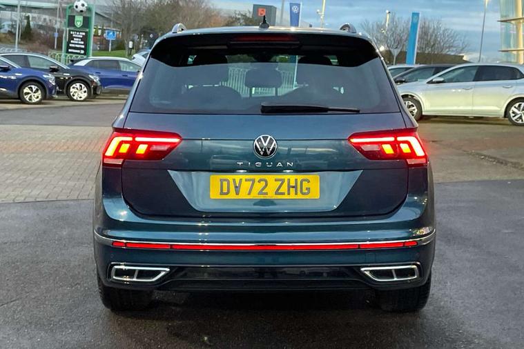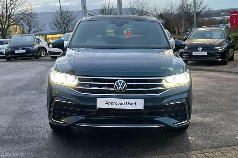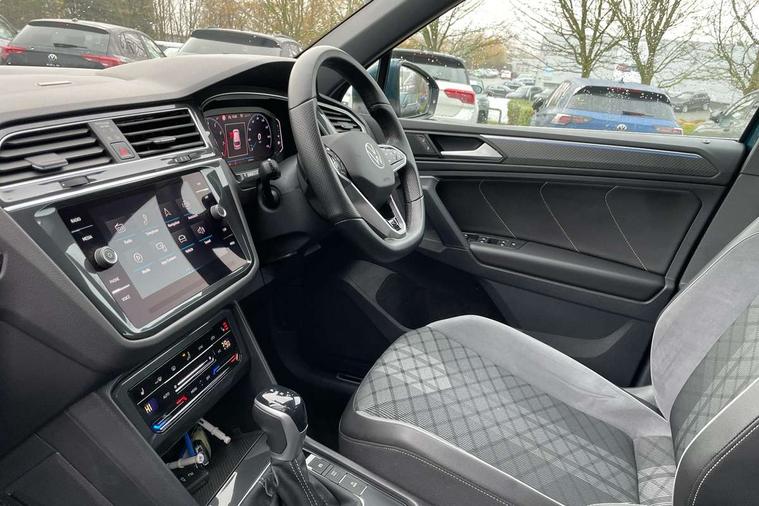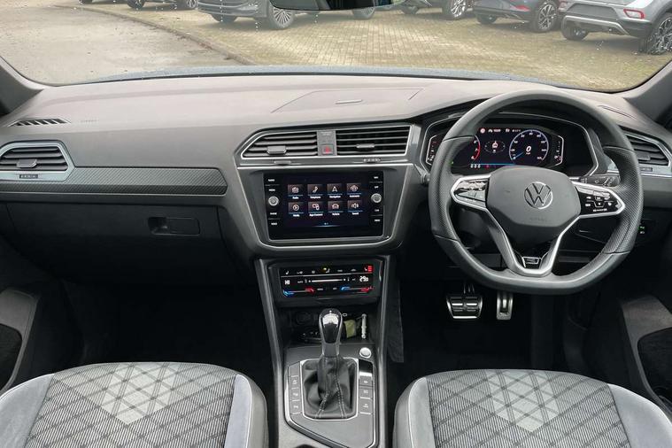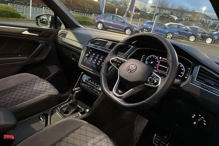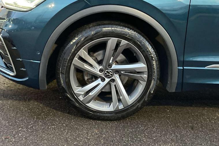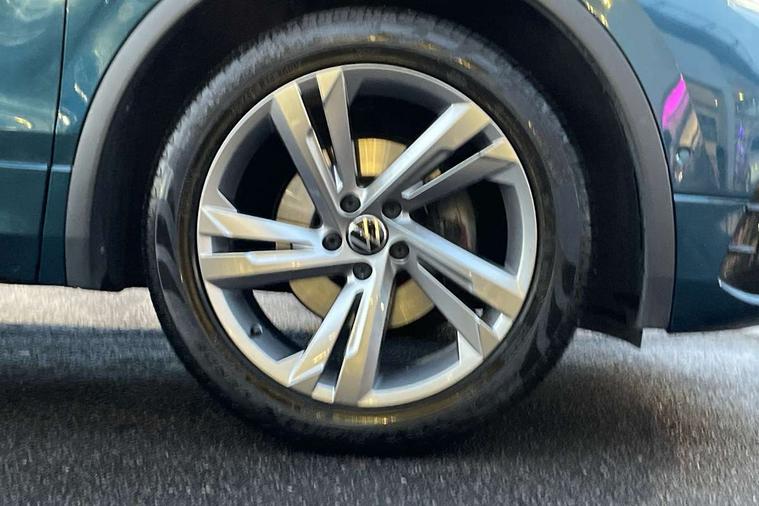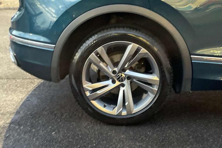Adaptive cruise control ACC stop and go including speed limiter, App-Connect incl. App-Connect Wireless for Apple CarPlay and Android Auto, Bluetooth phone integration system, Comfort drive travel assist, Digital cockpit pro, Driver alert system, Driver profile selection, Dynamic road sign display, eCall emergency call system, Electromechanical speed sensitive power steering, Emergency assist, Front and rear parking distance sensors, Instrument cluster mph speedometer Great Britain, Lane keeping system Lane Assist, Lights on warning, Multifunction front facing camera, Outside temperature display, Premium multifunction display with multi colour display, Preparation for subsequent activation Navigation feature Discover Media includes Streaming and Internet, Remote control boot opening, Rev counter, Service interval indicator, Speed limit display, Start/stop system with regenerative braking, Tailgate/trunk lid unlocking from outside, Trip computer, Warning sound and light for doors and tailgate open, Battery regeneration during braking, Sports suspension, 8 Speakers, Digital radio reception DAB+, Diversity antenna for FM reception, Radio, Auto dimming interior rear view mirror, Automatic headlight control system, Body colored bumpers in R-Line style, Body colored exterior mirror housings, Body colour door handles, Chrome moldings on the side windows, Coming/leaving home lighting function, Dynamic headlight range control, Front and rear electric windows, Heated rear window, High level 3rd brake light, Laminated safety glass windshield, heat and sound insulating, LED headlamps with LED separate daytime running light and dynamic cornering light, LED rear combination lamps, LED rear number plate lights, License plate carrier in front and rear, Poor weather light and cornering light, Power adjustable, folding and heated door mirrors with surround lighting, front passenger exterior mirror lowering function, Privacy glass for rear side windows and rear window, R Line body kit, R Line side sills, Rain sensor, Rear exhaust tailpipe, Rear fog lamp, Rear side wing doors, Rear spoiler in R style, Rear windscreen washer and wiper with interval delay, Side and rear windows in heat insulating glass, Trailer Stability Programme, Unique R Line badging, Windscreen wipers/ intermittent wipe + 4 position delay, 12V outlet in center console rear and in luggage compartment, 12V outlet in front and tray, 2 LED front reading lights, 2 LED rear reading lights, 3 bench rear seats in 2nd row, 3 rear headrests, Air Care Climatronic 3 zone automatic climate control with enhanced air filter and controls in the rear, Art Velours greyson sports cloth upholstery, Backrest release for left front seat, Black headlining, Brushed stainless steel pedals and footrest, Carpet mats in front and rear with decorative stitching in Gray, Climate control unit rear with touch function, Door and side trim panel in foam film, insert in leatherette, Driver + front passenger lumbar support, Front footwell illumination, Front scuff plates in aluminum with R-Line logo, Front seats head restraints (x-adjustment), Height adjustable front seats, Height/reach adjust steering wheel, Isofix Preparation 2 Rear child seats, Leather gear knob, Rear bench seat asymetrically split folding, longitudinally movable and folding with load-through hatch and center armrest, Remote unlocking for rear seat backrest, Single front passenger seat, Sun visors with illuminated vanity mirrors, Top front comfort seats, Winter pack - Tiguan, 3 point seat belt for centre rear seats, 3 point seat belts with seat belt pretensioners for the outer rear seats, Curtain airbags for front and rear passengers, Driver/Front Passenger airbags, Drivers knee airbag, Electronic parking brake with auto hold, Electronic Stability Control with driver steering recommendation, ABS, ASR, EDL, EDTC and trailer stabilization, Front assist with autonomous emergency braking (for Adaptive Cruise Control ACC up to 130 mph), Front disc brakes, Front passenger airbag deactivation, Front side airbags, Height adjustable front 3 point seatbelts + pretensioners, Manual child proof rear door locks, Pedestrian monitoring system, Proactive passenger protection system in combination with front assist, Rear disc brakes, Two tone horn, Tyre pressure loss indicator, Warning sound and light for front seat belts if unfastened, Warning triangle, Anti theft alarm system with interior monitoring, backup horn and towing protection, Anti theft wheel bolts, Electronic engine immobiliser, Keyless locking and starting system keyless access with safelock, Chrome elements on the mirror switch power window switches and door pulls, Decorative inserts Carbon Gray for dashboard and front door trim panels, Interior door handle in matte chrome, 19" Valencia alloy wheels with AirStop tyres, Tool kit, Tyre mobility kit Includes 12V compressor and tyre sealant,