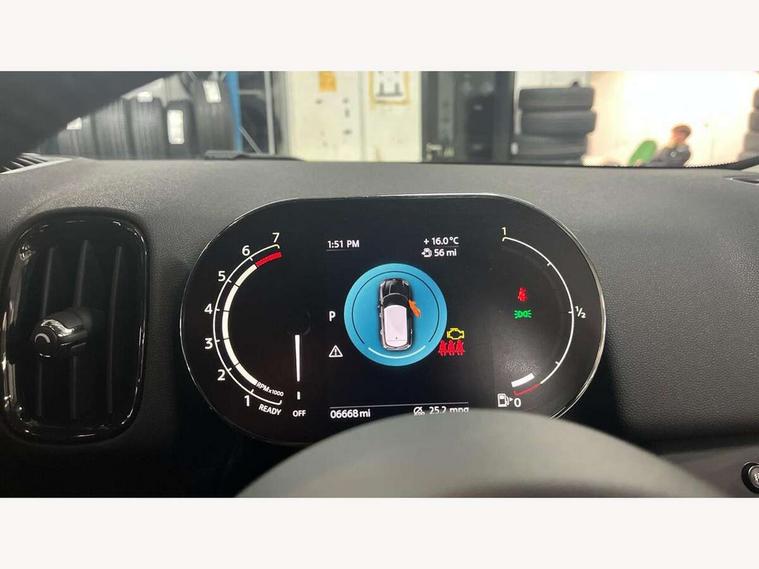 Active Guard incl speed limiting and lane departure functions with auto steering, and front collision warning with brake intervention, Automatic start/stop function with brake energy recuperation, Compatible mobile phone bluetooth with audio streaming, Cruise control with brake assist, Electro-mechanical speed dependant steering assistance, Instrument cluster, Mini E-call, On board computer, Rear parking distance control, 51 Litre fuel tank, Double Vanos system, Fully variable valve control, High precision injection, Performance Control, Steptronic transmission with double clutch, FM tuner and DAB digital radio, 3rd brake light, Body colour fuel filler cap, Day time driving lights, Door sill strips, Dynamic brake lights, Electric windows, Heated rear window, Heated windscreen washer jets, LED fog lights, LED Headlights, Left exhaust tailpipe with chrome finisher, Model logo, Model logo on Tailgate, Radiator grille, Rain sensor with auto headlights, Rear fog lights, Rear side wing doors, Rear window wiper, Side scuttle panel with integrated indicator, Split rear doors, Sun/heat protection glass, White indicator lenses, 12V socket in centre console, 3 seat bench in 2nd row, 3 spoke sport leather steering wheel + limiter function and audio controls, 360L luggage compartment capacity, 4 lashing eyes in luggage compartment, 40:20:40 split folding rear seats, Chrome interior highlights, Colour line - Carbon black, Cupholders, English handbook, Floor mats, Front headrests, Glove compartment, Headliner with grab handles and clothes hooks, Height and length steering column adjustment, Interior lighting with 12 basic colours selectable via toggle switch in roof, Isofix rear child seat preparation, Leather gearshift lever and handbrake gaiters, LED reading lights, vanity mirror lights, front foot well light and spotlight on front seats, Manual air conditioning, Mechanical seat adjustment, driver seat height adjust, forward/back and front seats backrest, Multifunction steering wheel, Passenger seat height adjuster, Rear headrests, Single front passenger seat, Storage compartments in doors, Sunvisors with vanity mirrors, Excitement pack - Countryman, Navigation pack - Countryman, 2 tone horn, 3 point seatbelts on all seats, 6 Airbags - front, side, head and seat belt tensioners, Anti-lock braking system (ABS), DSC - Dynamic Stability Control, Electronic handbrake, Front and rear disc brakes, Hill start assist, Manual rear child locks, Tyre pressure monitoring system, Alarm system with tilt sensor, monitoring doors, bonnet interior and tailgate, Auto drive away locking, Deadlocking function, Electronic vehicle immobiliser, Locking wheel bolts, Start/stop toggle with keyless go, Tool kit,