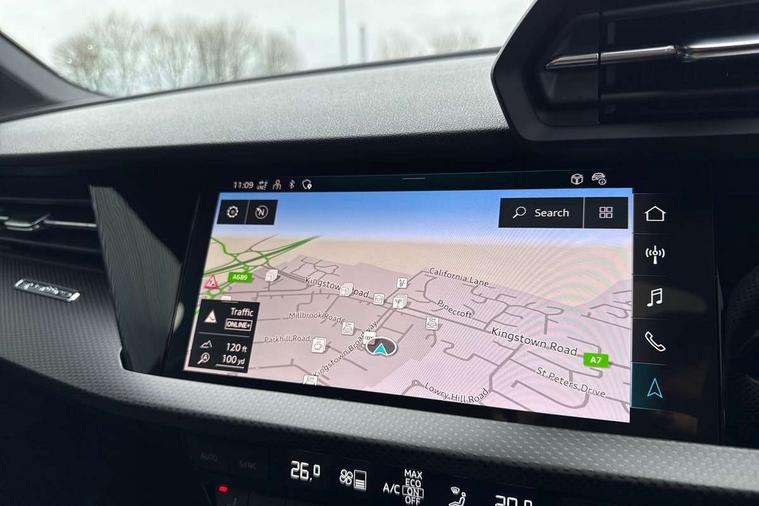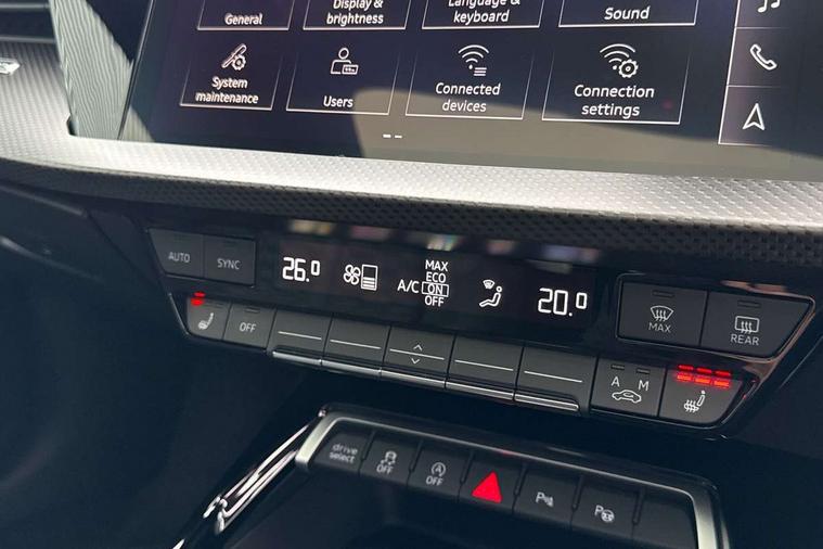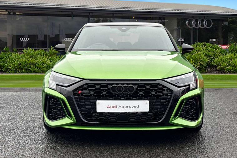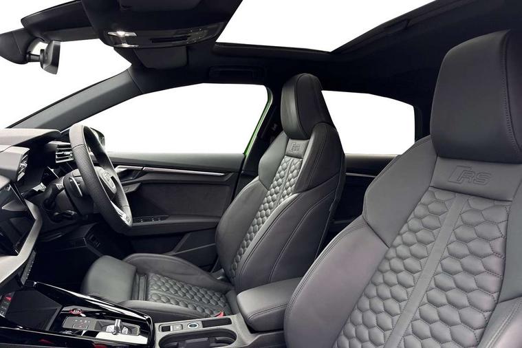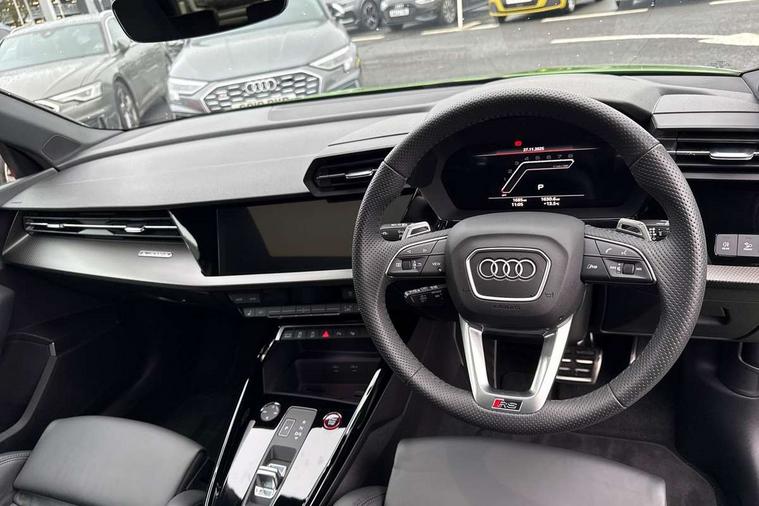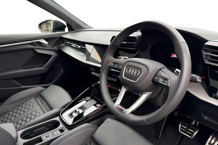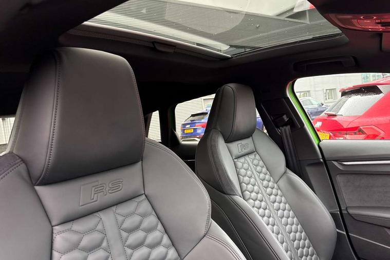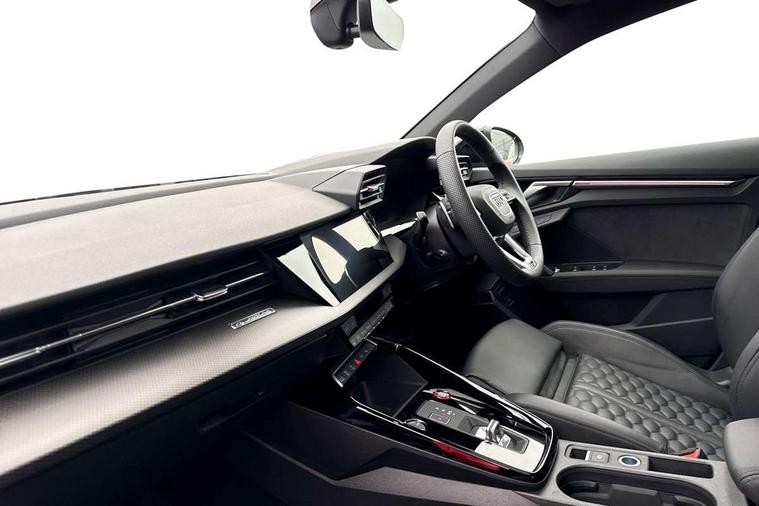 Adaptive cruise assist, Adaptive cruise control, Audi smartphone interface, Audi virtual cockpit with RS specific display 12.3" full colour digital instrument cluster, Automatic start/stop system with recuperation, Bluetooth interface, Camera based traffic sign recognition, Collision avoidance assistant, Emergency e-call, Head up Display, Lane departure warning system, Legal emergency call, Parking assist with parking system plus, Power operated tailgate - Luggage compartment lid opens electrically, Progressive power assisted steering, Reversing camera, Quattro permanent four wheel drive, Rear suspension, DAB Digital radio, 3rd brake light, Acoustic glass windscreen, Audi beam uses LEDs to project the Audi sport logo onto the ground as you exit your RS 3, Audi matrix LED headlights, LED rear lights, dynamic front and rear indicators and headlight cleaning system, Auto dimming rear view mirror, Black side skirts, Body colour roof, Carbon exterior door mirror, Carbon fibre engine cover, Daytime running lights, Electric adj heated/folding + auto dimming exterior mirrors with memory + LED indicator + auto kerb side function for passenger side exterior mirror, Front spoiler in high gloss black, Heat insulating glass windscreen, Light and rain sensors, Panoramic glass sunroof, Privacy glass - dark tinted rear and rear side windows from B-pillar backwards, Rear side wing doors, Rear window wiper and washer system, RS exterior features in gloss black, RS sports exhaust system, 3 seat bench in 2nd row, 3 spoke leather multifunction steering wheel with gear shift paddles, 4 way lumbar support for front seats, 40/20/40 split folding rear seat bench, Black cloth headlining, Dual zone electronic climate control, Electrically adjustable front seats with memory function for driver's side, Front and rear headrests, Front centre armrest, Front sports seats RS embossed logo, Front/rear floor mats, Heated front seats, Honeycomb stitching and RS embossing, Illuminated door sill trims inlays in aluminium with RS 3 logo, Illuminated vanity mirror, RS emblems, Single front passenger seat, Stainless steel pedals and front footrest in black, Aluminium interior elements pack - RS3, Ambient lighting pack - RS3, Comfort and sound pack - RS3, Driver assistance pack with 3 spoke leather multi function steering wheel - RS3, MMI navigation plus with MMI touch - RS3, RS bodystyling - RS3, Storage Pack - RS3, 3x3 point rear seat belts, ABS/EBD, ASR, Audi pre sense front, Driver/Front Passenger airbags, EDL, ESC - Electronic Stability Control + traction control, Front passenger airbag deactivation, Front side airbags with head airbags and interaction airbag, Hill hold assist, Seat belt reminder with passenger presence detection in rear, Tyre pressure loss indicator, Warning triangle and first aid kit, Anti theft alarm, Anti-theft wheel bolts, Electronically operated child lock, Remote control central locking, Full decorative carbon trim, 19" 5 Y spoke black with graphic print alloy wheels, Tool kit, Tyre repair kit,