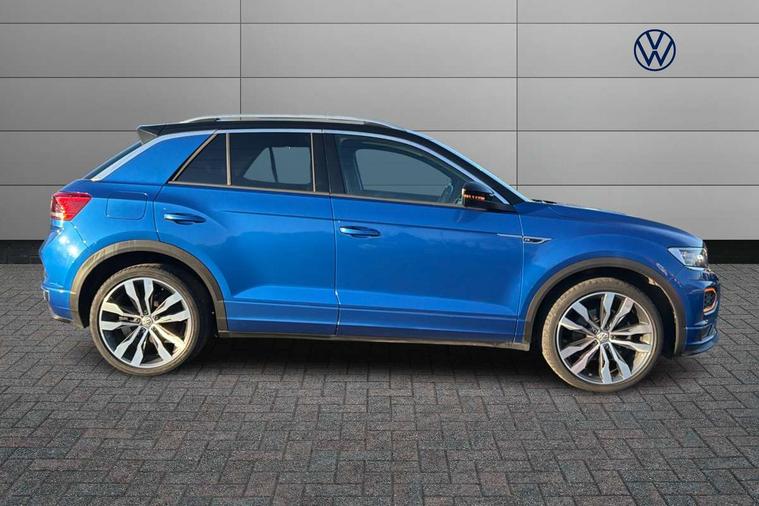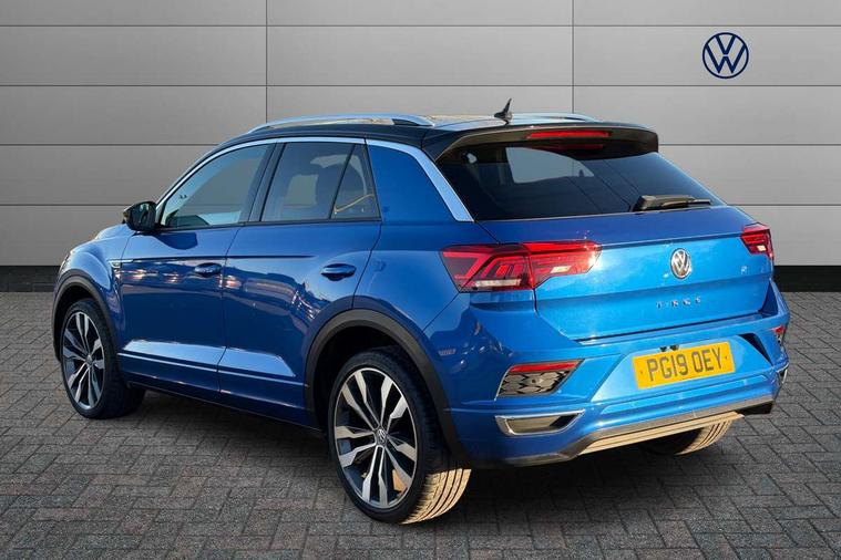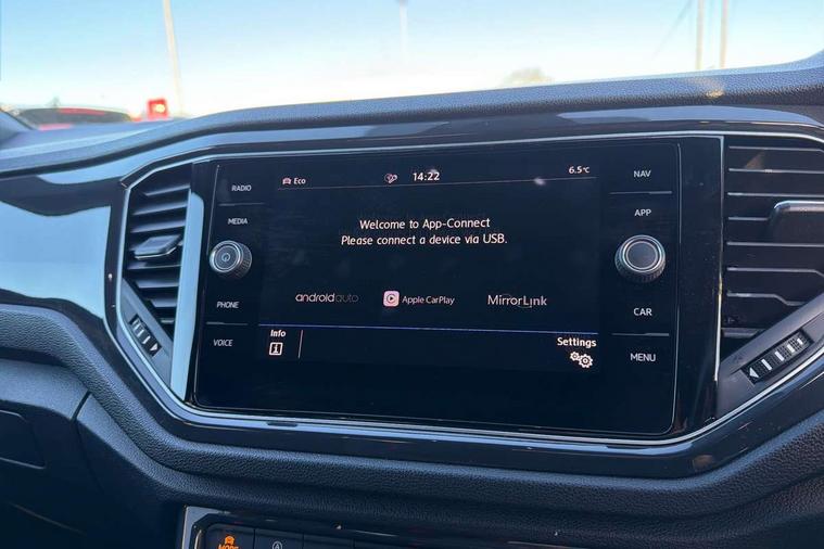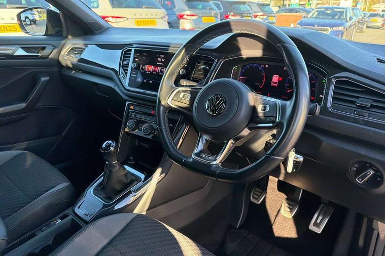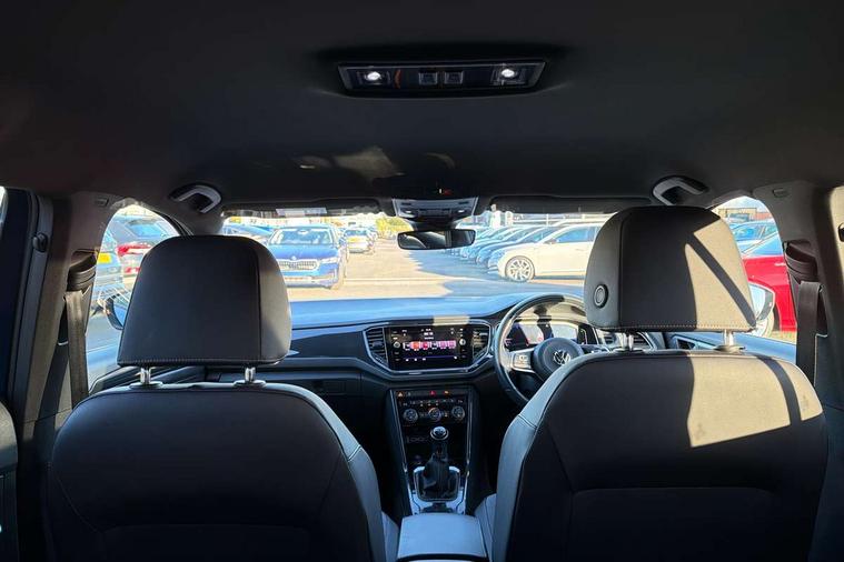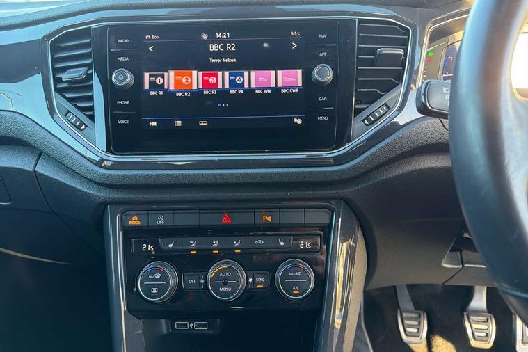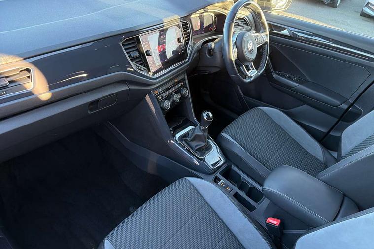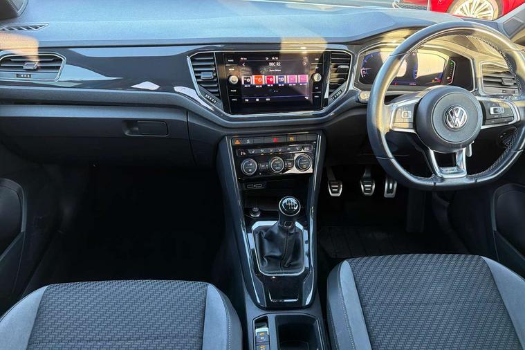 App-Connect, 2 USB connection charging sockets, Active Info Display, 10.3" high resolution TFT dash display screen with customised information, Adaptive cruise control, Automatic start/stop system, Bluetooth telephone and audio connection for compatible devices, Car information display, Car-Net Security and Service, Discover navigation, 8" touch screen navigation/infotainment system with Car-Net, European map, CD/radio, 2D/3D map and speed limiter, Driver alert system with audible and visual fatigue detection system, Driver profile selection, Dusk sensor, Front assist, radar sensor controlled distance monitor, city emergency braking + predictive pedestrian protection, Lane assist, Multifunction computer with visual gear change recommendation for fuel consumption, Progressive power assisted steering, Service interval indicator, Think blue trainer driver tips and journey analysis, Voice activation, Warning sound and light for doors and tailgate open, Warning sound and light for front seatbelts unfastened, Battery regeneration during braking, Bluetooth - Simultaneous pairing of 2 compatible mobile devices, DAB Digital radio, Dynamic navigation based on TMC+, Multi device interface (MDI) with USB connection, Music playback - MP3, WMA and AAC files, Premium USB cable in choice of either Apple or Android smartphone compatibility, SD card slot, SMS functionality - read, compose and send SMS messages using touch-screen display, Three route options - Fast, Short, Eco, Title and cover art display, Auto dimming interior rear view mirror, Automatic hazard lights activation under emergency braking, Black grained lower door protectors, Black grained wheel arches, Body colour door handles, Body colour rear roof spoiler, Chrome effect left and right trapezoid exhaust tailpipe fascia surround, Chrome trim on upper and lower radiator grille, Door mirror integrated indicators, Electrically foldable, adjustable and heated door mirrors with puddle lights and reverse activated kerb-view adjustment on passenger's door mirror, Front and rear electric windows, Front fog lights with static cornering function, Front windscreen wiper with intermittent wipe and 4 position delay, Fully galvanised body, Heated rear window, High level 3rd brake light, LED darkened rear light clusters, LED dipped and main beam headlights with automatic range adjustment including signature LED daytime running lights, LED rear number plate lights, Manual coming/automatic leaving home lighting function, Rain sensor, Rear tinted glass from B-pillar backwards approx 65% tinted, Rear windscreen washer and wiper with interval delay, 12V socket in centre console storage area, 2 LED front and rear reading lights, 3 rear head restraints, 4 load lashing points in luggage compartment, Aluminium pedals, Ambient lighting in front footwell and light strips below trim in front doors, Black roof lining and sun visors, Carbon flag cloth upholstery, Climate control - 2 zone electronic air conditioning with automatic air recirculation and allergy filter, Drawer under drivers seat, Front + rear carpet mats, Front centre armrest with storage compartment, longitudinal and height adjustable and two rear air vents, Front cupholders x 2, Front footwell illumination, Front seat back storage pockets, Front sport seats, Glovebox, Height adjustable front seats, Height/reach adjust steering wheel, Illuminated vanity mirrors, Instrument lighting, white adjustable panel illumination, Interior light delay, Isofix easy fit child seat preparation for 2 outer rear seats, Load through provision with single cup holder when folded down, Luggage compartment cover, removable, Luggage compartment lighting, R Line badge, Split folding rear seat backrests with centre armrest, Storage compartment in left and right luggage area, Storage compartment in rear doors, Storage compartments in driver and front passenger doors, Three spoke multi-function leather trimmed steering wheel and gearknob, Unique R Line door sill protectors, R line styling pack - T-Roc, Winter pack - T-Roc, 3 rear three point seatbelts, ABS, Driver and front passenger safety-optimised head restraints, Electronic parking brake with auto hold, ESC with EDL, ASR, EDTC and trailer stabilisation function, Front and rear curtain airbags, driver and front passenger airbags with passenger deactivation switch and front side impact airbags, Rigid safety cell with front and rear crumple zones, Three point height adjust front seatbelts + pretensioners, Tyre pressure loss indicator, Ventilated front and rear disc brakes, Volkswagen roadside assistance, Alarm with remote central locking and interior protection, Electronic engine immobiliser, Remote central locking with 2 remote folding keys, Caribou grey decorative inserts in dash and door panel, 19" Suzuka alloy wheels with low rolling resistance tyres and anti wheel bolts, Steel space saver spare wheel,