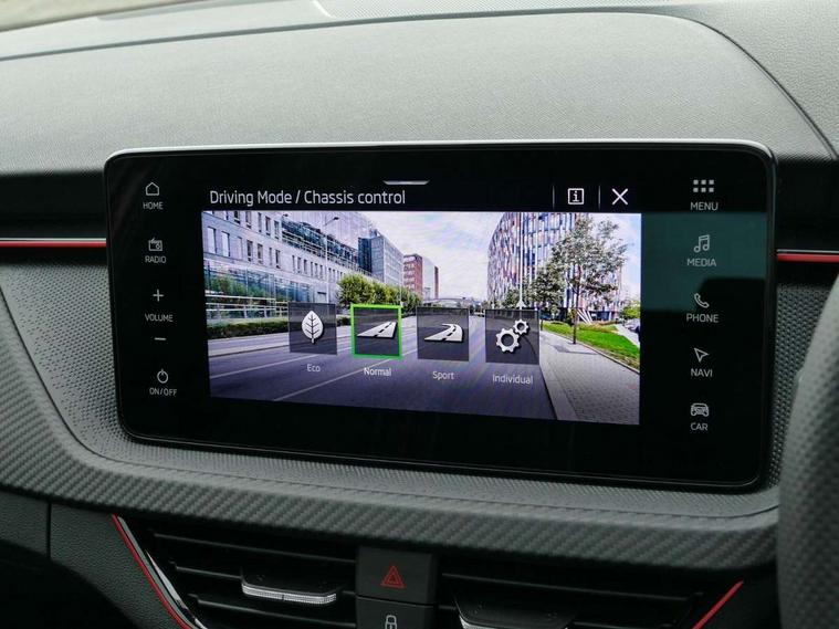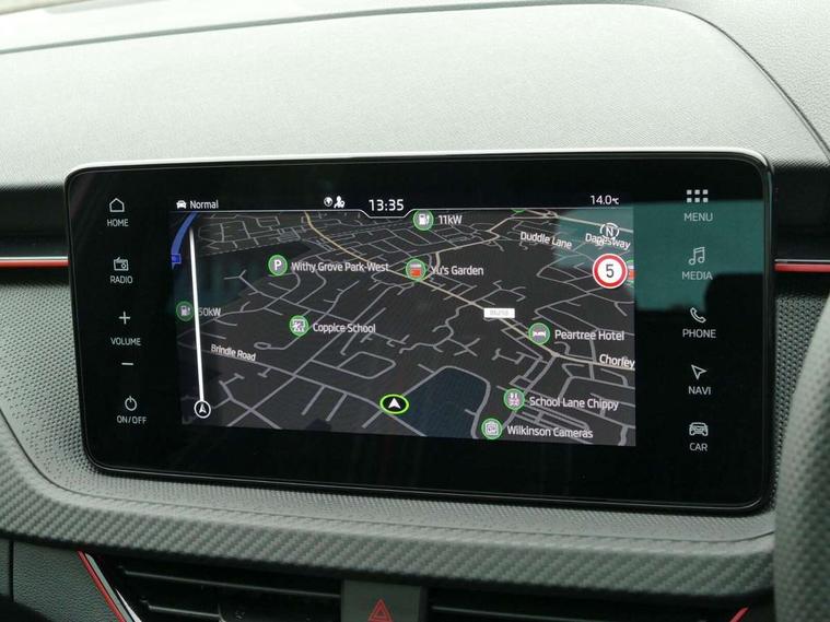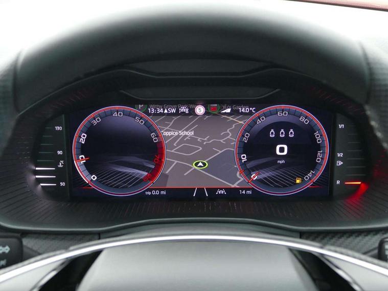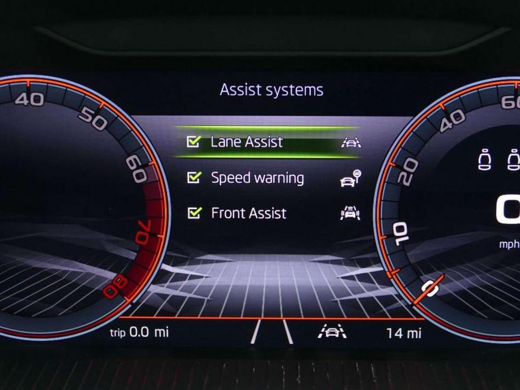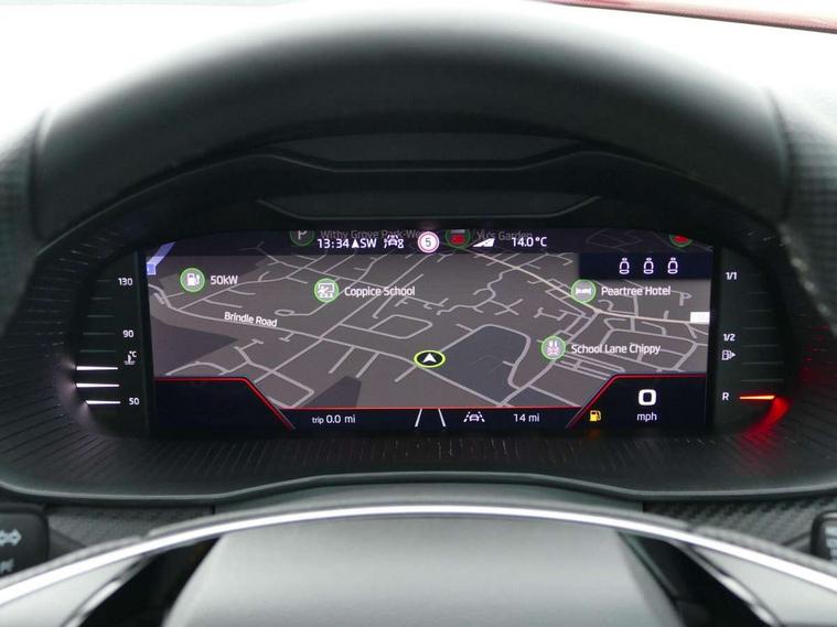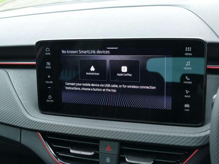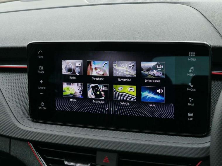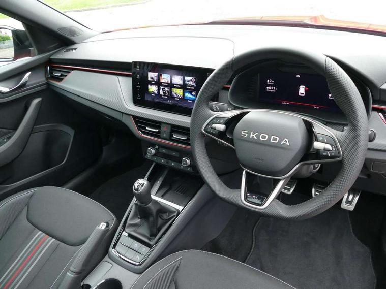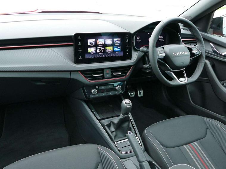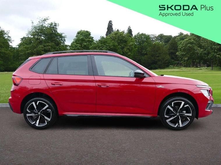 Advanced driver attention and drowsiness monitor, Bluetooth system, E-call, Front assist system, PAS, Rear parking sensors, Rear view camera, Service indicator, Speed limiter, Traffic sign recognition, Virtual cockpit with 10.25" display, Voice control system, Wireless smartlink, 4 USB C ports, 8 Speakers, 9.2" Skoda navigation display, DAB Digital radio, Auto dimming rear view mirror, Automatic headlight control with coming home and leaving home feature, Black door mirrors, Black radiator grille, Black rear diffuser, Black roof spoiler, Body colour bumpers, Body colour door handles, Boot lettering in black, Extended tailgate glass, Fixed panoramic sunroof with black roof rails, Front and rear electric windows, Heated rear window, LED daytime running lights, LED high beam, LED low beam, LED third brake light, Light sensors, Monte carlo plaque, Privacy glass, Rear side wing doors, Rear wiper, Ticket holder inside windscreen, 12V socket in luggage compartment, 3 seat bench in 2nd row, Aluminium pedals, Ambient lighting in white/red, Art leather carbon decor inserts, Art leather carbon door inserts, Black roof lining, Cargo elements, Chrome inner door handles, Driver and passenger sun visors with vanity mirror, Dual zone climate control, Front and rear roof lights, Front centre armrest, Front head restraints, Glove compartment with illumination, Height adjustable driver seat, Height adjustable front passenger seat, Ice scraper, Inner circulation control with pollen filter, ISOFIX on front passenger seat, Isofix preparation for back seats, Leather gearknob and handbrake lever, Manual lumbar support for front seats, Monte Carlo cloth upholstery, Net package and top tether hooks in boot space, Net under rear shelf, Pocket on the back of both front seats include mobile phone pockets, Rake/reach adjustable steering wheel, Reading lights, Rear centre armrests, Red hotstamping, Single front passenger seat, Sports seats, Textile floor mats, Third rear headrest, Top tether for front passenger seat, Umbrella in driver's door, Light and view plus package - Kamiq, 3x3 point rear seatbelts, Airbags - driver and front passenger, Disc brakes, ESP, Extended and predictive pedestrian/cyclist protection, Front passenger airbag deactivation switch, Front side airbags with curtain airbags, Hill hold control, Manual leather parking brake, Manual rear child locks, One tone horn, Seatbelt reminder for driver an co-driver, Traction control, Tyre pressure monitor, Anti-theft alarm system with interior monitoring, backup horn, towing protection and remote central locking with SAFE system, Anti-theft wheel bolts, Electronic engine immobilizer, 18" Ursa black diamond cut alloy wheels,