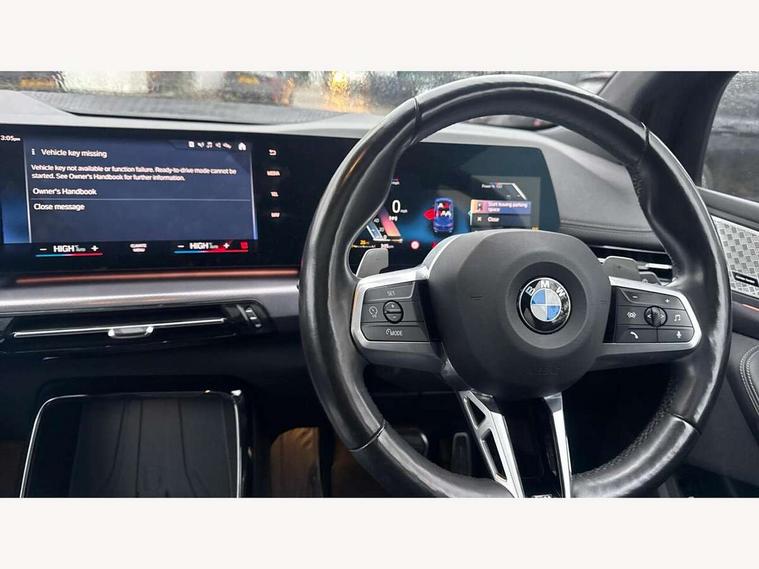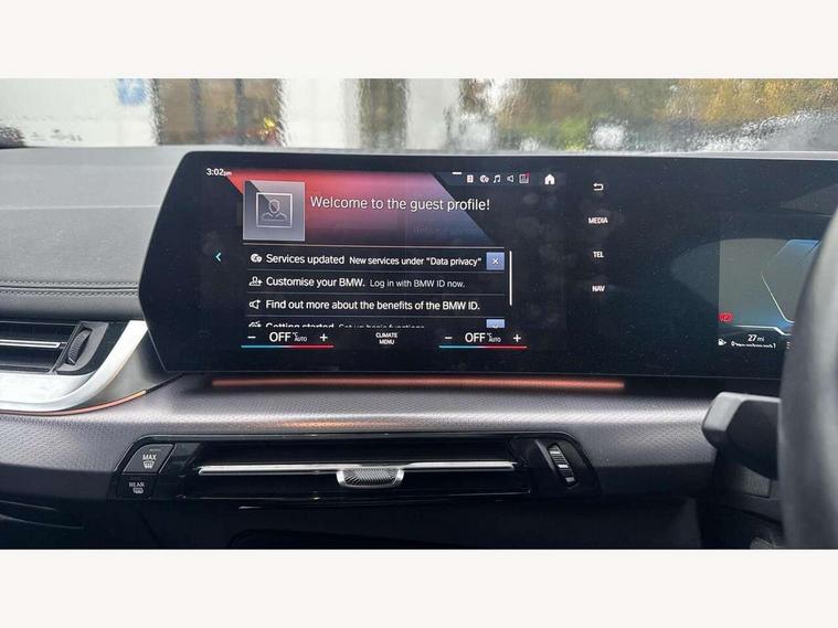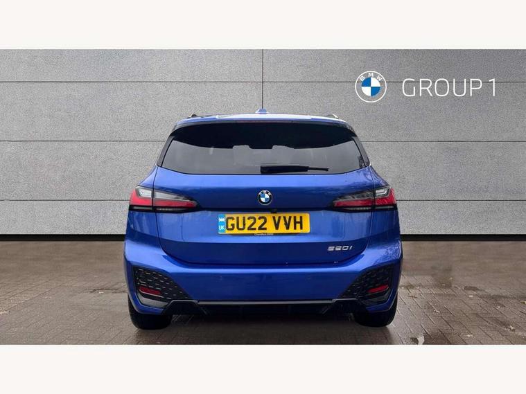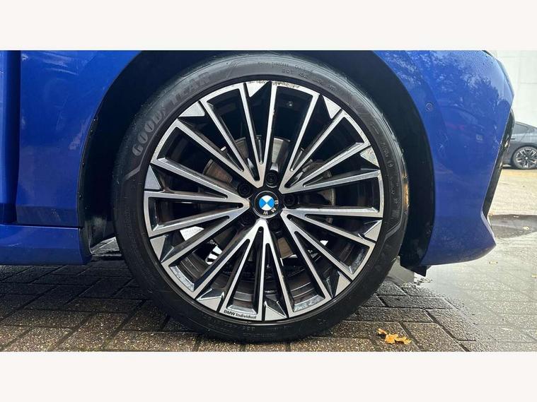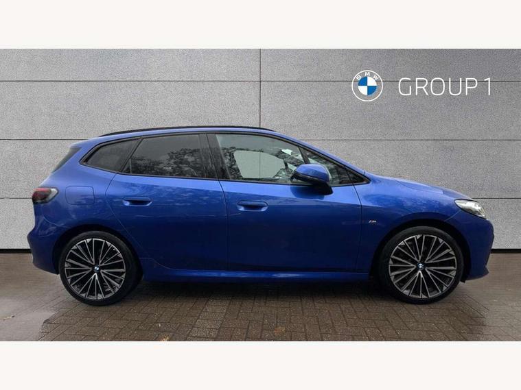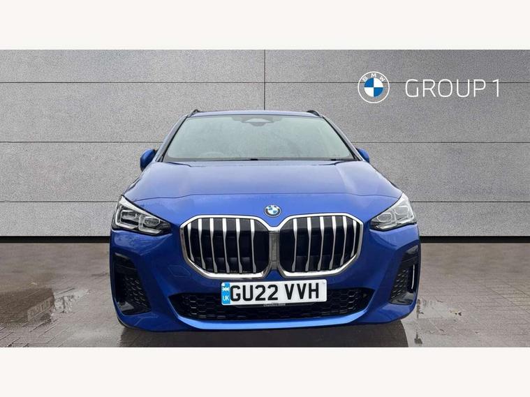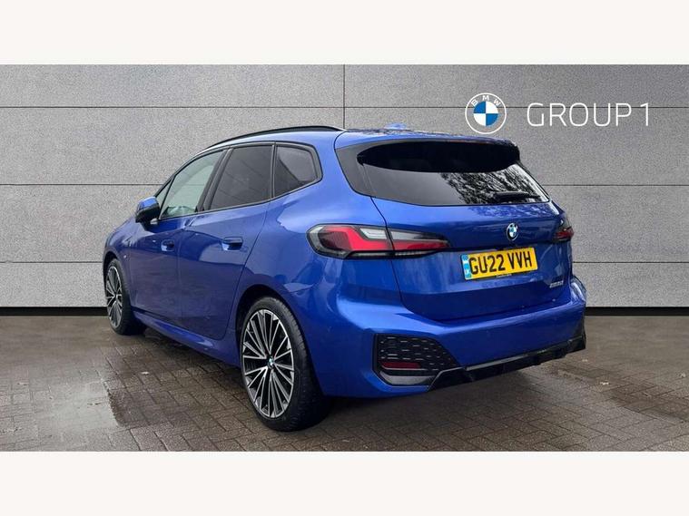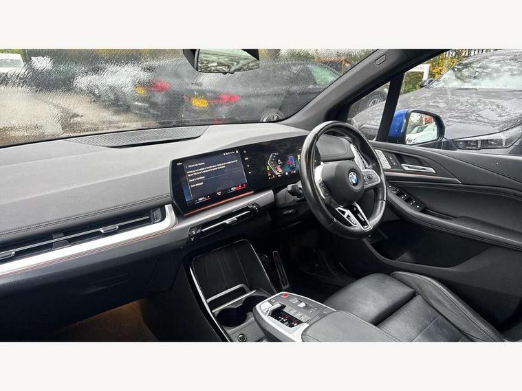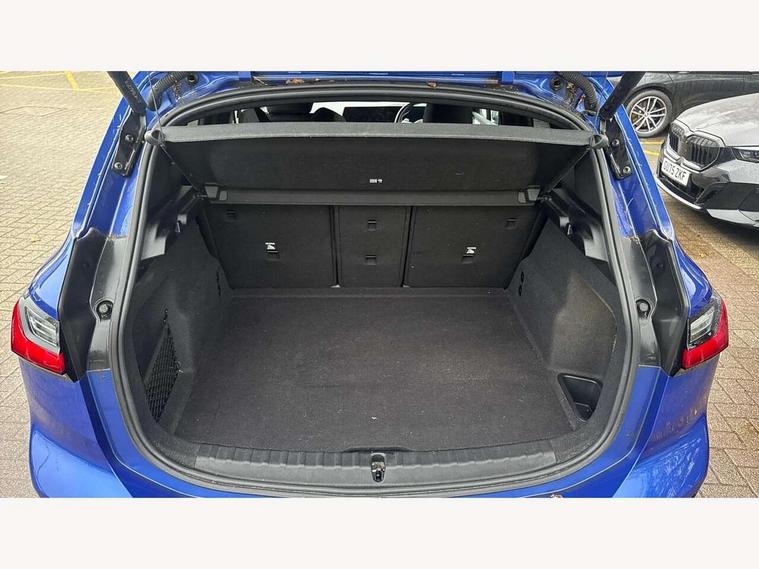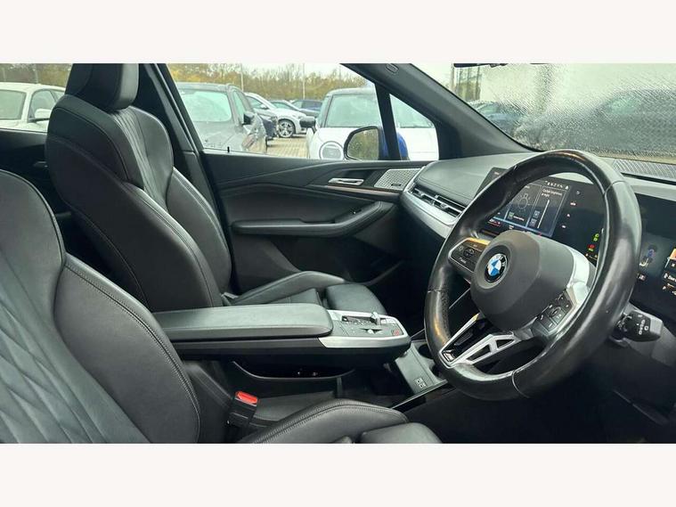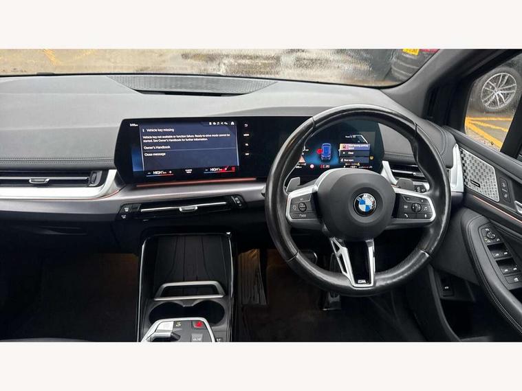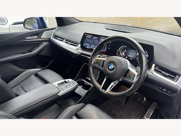 Active Guard incl speed limiting and lane departure functions with auto steering, and front collision warning with brake intervention, Automatic powered tailgate, Automatic start/stop function, BMW Live cockpit plus with Navigation function, BMW Teleservices, Brake pad wear indicator in front and rear, Drive off assistant, Flat air vents on instrument panel in high gloss black, adjustable slats with elements in pearl chrome, iDrive controller, Instrument cluster with speedometer with miles per hour read out, tachometer and fuel gauge, Language version English, On board computer - average speed+fuel consumption, service interval, clock/date, odometer/trip meter, outside temperature display and ice warning, Parking assistant with active park distance control, reversing assistant, lateral parking aid and rear view camera, Servotronic variable electric power steering (EPS), Smartphone integration, Widescreen display, Drive performance control with ECO PRO comfort + sport mode, Gear selector switch with toggle operation, M Adaptive suspension, Petrol Particulate Filter, Steptronic transmission with double clutch and gear shift paddles, 2x USB Type C ports in front centre console for charging and data transfer, 2x USB Type C ports in rear centre console for charging, DAB Digital radio, Air inlet middle part on front apron in lines specific design with trim strip in satinised aluminium, Automatic headlights, BMW emblem, engine compartment lid and tailgate, Body colour roof mouldings, Body coloured door mirror caps, Contoured rear roof spoiler in vehicle colour with side aeroblades in black high-gloss, Driver side exterior mirror lighting with BMW logo projection, Dynamic brake lights, Electric adjustable heated door mirrors, Electric windows - front and rear, with open/close fingertip control, anti-trap facility and comfort closing, Folding door handles integrated flush with surface, Front and rear windscreen wipers with heated front washer nozzles, Front bumper cover with independent design in body colour with inserts in black high gloss, Front bumper design elements in satinised aluminium, Front door exit lights, Front door sill finishers aluminium inserts with M inscription, Front entry sills with aluminium inserts + BMW inscription, Front oramental grille with radiator grille bars in satinised aluminium, Heated rear window, Hidden exhaust pipe, High gloss shadow line, High gloss shadowline roof rails, Key with M identification, LED Daytime running lights and parking lights with turn indicators, LED number plate light, LED third brake light in rear spoiler, M identification on sides, Manual headlight range control, Model inscription on right tailgate, Rain sensor, Rear bumper cover with independent design in body colour with inserts in black high gloss, Rear bumper trim strip in satinised aluminium, Rear side wing doors, Shark fin antenna, Side sill covers with independent design in Body colour, Trailer stabilisation logic, Trims on front and rear bumper covers colour-coordinated with side window graphic, Visible VIN plate, Welcome lighting, Windscreen washer nozzle for rear view camera, 12V power socket in luggage compartment and front centre console, 12V socket in right side trim panel, 2 bag hooks in luggage compartment, 2 front reading lights, 2 open cup holders in front centre console, 3 seat bench in 2nd row, 40:20:40 split folding rear seat backrests, Ambient lighting front and rear, Automatic two zone climate control air conditioning, Bottle trays in all doors, Child seat ISOFIX attachment for two outer rear seats and front passenger seat with anchorage points, Driver and front passenger sports seats, Four grab handles integrated in roof lining, Front and rear door pockets, Front and rear footwell lighting, Front and rear side armrest integrated into door trim, Front centre console storage compartment, Front head restraints, Glovebox with light, Heated front seats, Height adjustable 3 rear head restraints, Interior door handle recess light on all doors, Luggage compartment lighting, M Anthracite headlining, M specific floor mats, M sport leather steering wheel, Map pockets, Mechanical rear seats with fore/aft adjustment, Multi-function controls for steering wheel, One piece parcel shelf opens together with tailgate and removable, Rear cloth hooks, Single front passenger seat, Sliding rear seat bench, Stainless steel pedals, Steering wheel column manual adjustment, Storage compartment lighting in centre console and storage tray in centre stack, Storage compartment net in left side trim panel, Storage compartment with folding cover under centre console armrest cushion, Storage tray in right side trim panel, Sunvisors with illuminated vanity mirrors, Three spoke sport leather steering wheel, Connected pack professional - 2 Series Active Tourer, Technology pack - 2 Series Active Tourer - MY22, 3 point seatbelts on all seats, front pyrotechnic belt tensioners, stopper and belt force limiters, rear coded belt buckles, Airbag - Front driver and passenger, front and rear head, front side, curtain head protection, manual deactivation of front passenger airbag possible, Anti lock braking system (ABS) with brake assist, Automatic hold function, BMW emergency call, Brake drying, Braking readiness, Child proof locking system in rear door, Cornering brake control, Crash Sensor - activates hazard/interior lighting + unlocks doors, DSC - Dynamic Stability Control, Dynamic brake control, Dynamic Traction Control - DTC, Electromechanical parking brake, Energy recovery system, Front disc brakes, Integrated braking system, PC iBrake PostCrash approach control warning with light braking function, Rear disc brakes, Tyre pressure monitoring system, Warning triangle and first aid kit, Anti theft alarm system, Closing system with central locking, Engine immobiliser, Locking wheel bolts, Front centre console trim in high gloss black, BMW mobility tyre sealing system, Reduced rolling resistance tyres,