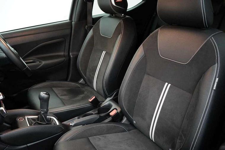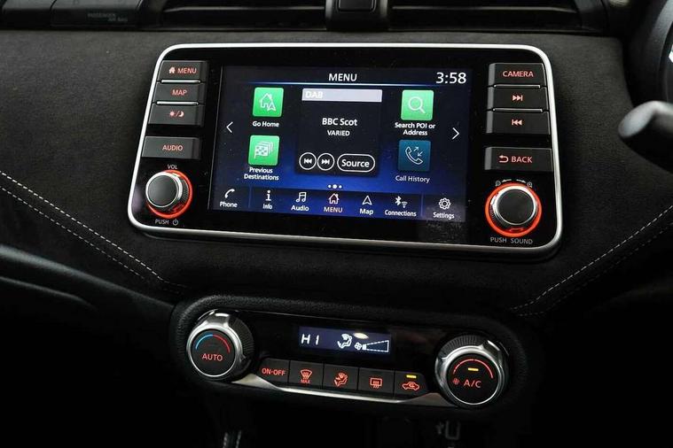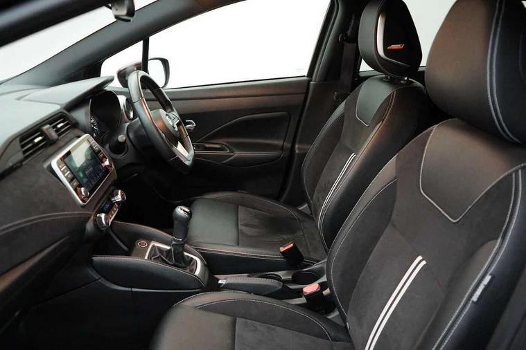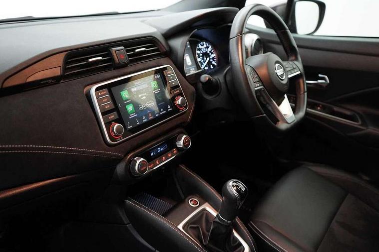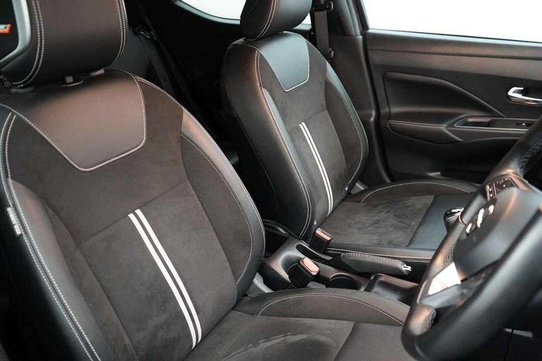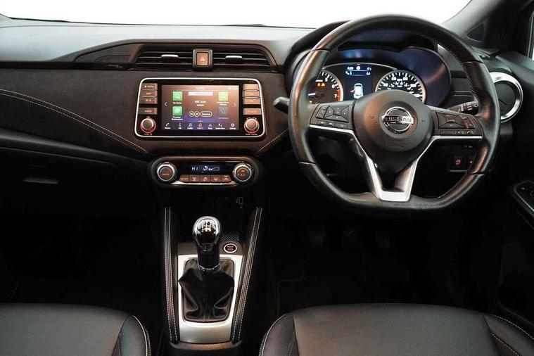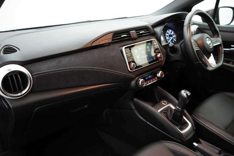 Adjustable speed limiter, Advanced drive assist display 5'' TFT coloured screen, Bluetooth system, Cruise control, Lane departure prevention, Lane departure warning system, Nissan connect sat nav system, Nissan Connect touchscreen navigation and Entertainment system, Outside temperature gauge, Power assist steering, Rear parking sensors and rear view camera, Smartphone integration with Apple CarPlay and Android auto, Stop/start system, Traffic sign recognition, Trip computer, Audio system with MP3, Aux-in socket, BOSE sound system with 6 speakers, DAB Digital radio, Steering wheel mounted audio controls, USB/iPod connection, Antenna, Auto dimming rear view mirror, Automatic activation of hazard warning lights, Automatic headlights, Body colour front door handles, Concealed rear door handles, Electric folding door mirrors, Electrically adjustable door mirrors, Front and rear electric windows, Front fog lights, Heated door mirrors, High beam assist, High mounted stop lamp, LED daytime running lights, LED indicators in door mirrors, Rain sensor windscreen wipers, Rear privacy glass, Rear roof spoiler, Rear wiper with reverse link, 12V power point front, 2 height adjustable rear headrests, 3 cupholders, 60/40 split folding rear seat, Automatic air conditioning, Boot compartment cover, Boot light, Chrome interior door handles, Driver's seat manual height adjust, Driver/passenger sunvisors and vanity mirrors, Front and rear door pockets with bottle holders, Front console storage box, Gear shift indicator, Height adjustable front headrests with satin sliver decoration, Height adjustable steering wheel, Illuminated electric window switch, Isofix front passenger and rear seat preparation, Leather wrapped gear shift knob, Leather wrapped parking break, Leather wrapped steering wheel, LED ambient lighting, Luggage compartment lighting, Map reading lamp, Parcel shelf, Passenger seat back pocket, Reclining front seats, Satin silver air vents, Synthetic leather front door pads, Synthetic leather instrumental panel inserts, Tilt/telescopic adjustable steering wheel, ABS+EBD+Brake assist, Crash sensor, Driver/Front Passenger airbags, ESP + ASR traction control + CSV understeer control, Forward emergency braking, Front and rear curtain airbags, Front side airbags, Height adjustable front seatbelts with pre-tensioners and load limiters, Hill start assist, Intelligent emergency braking with pedestrian recognition, Passenger airbag deactivation system, Rear seatbelts with pre-tensioners and load limiters, Seatbelt warning, Three 3 point rear seatbelts, Tyre pressure monitoring system, Warning triangle and first aid kit, Anti-theft immobiliser, Intelligent key with push button ignition, Remote central locking, Tyre repair kit,