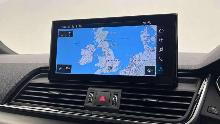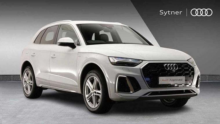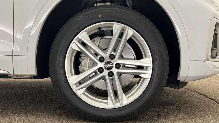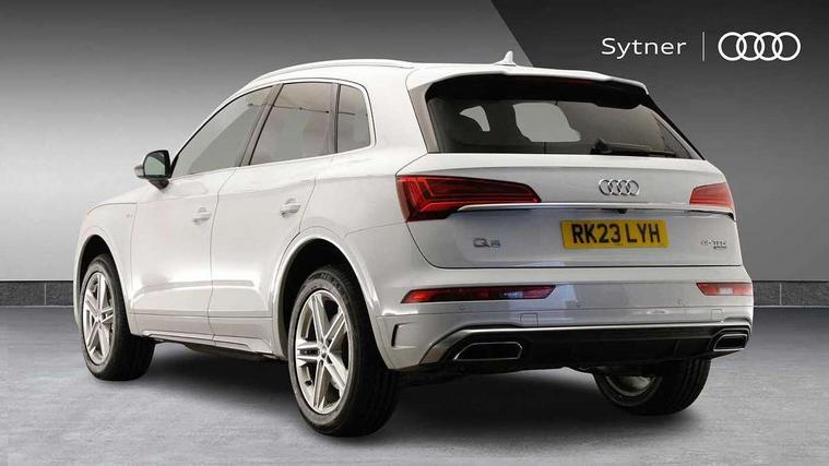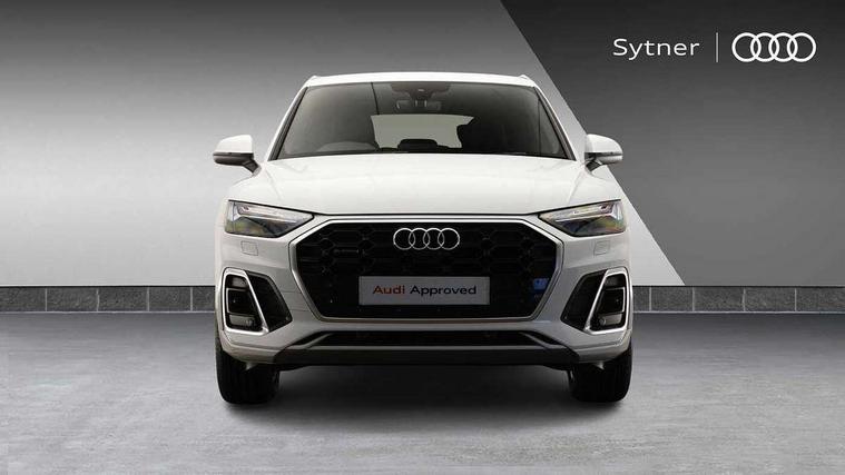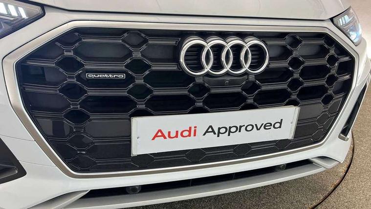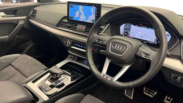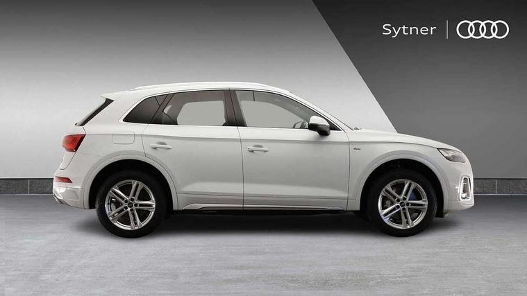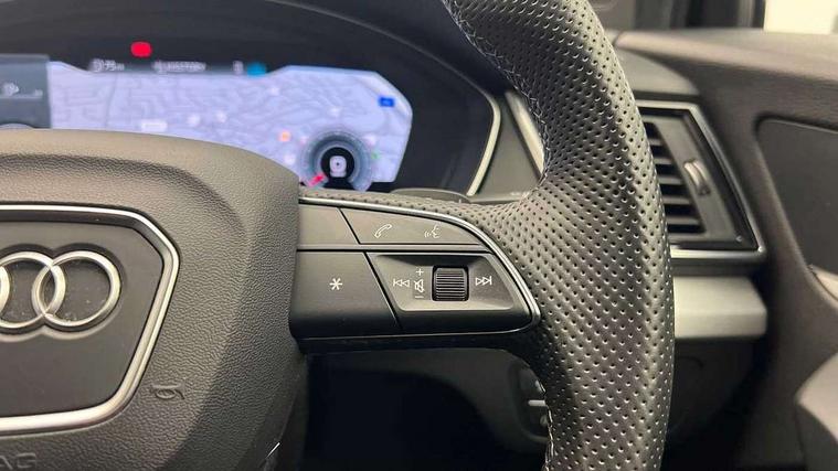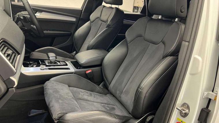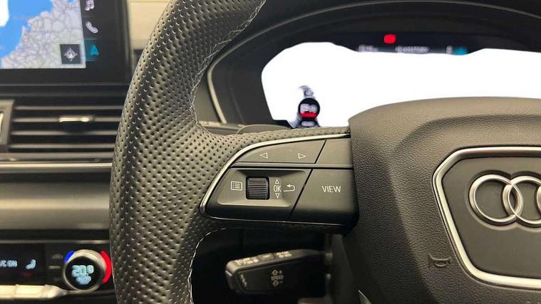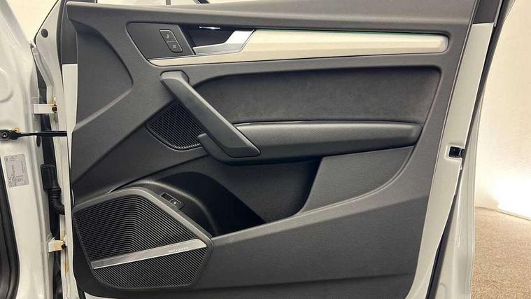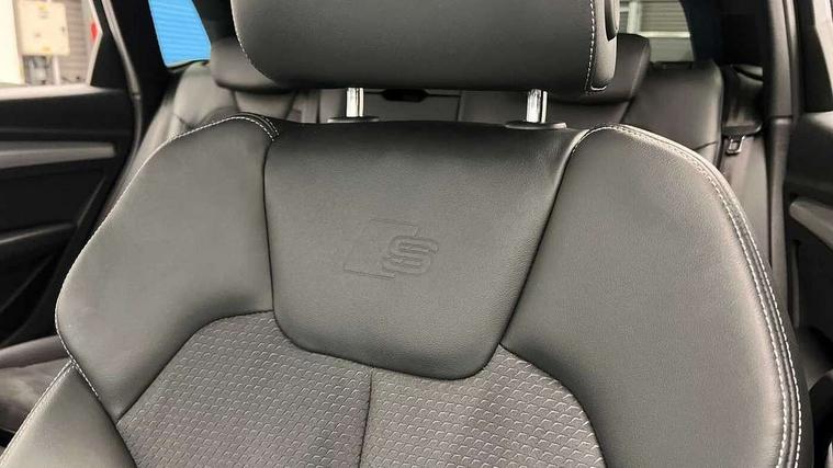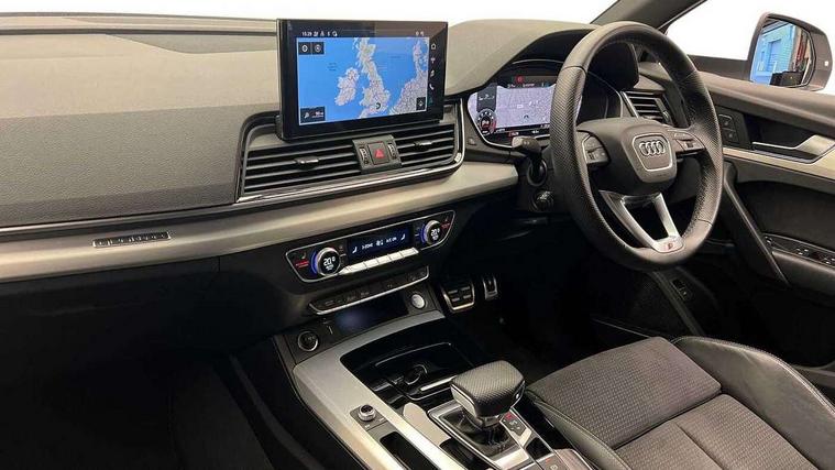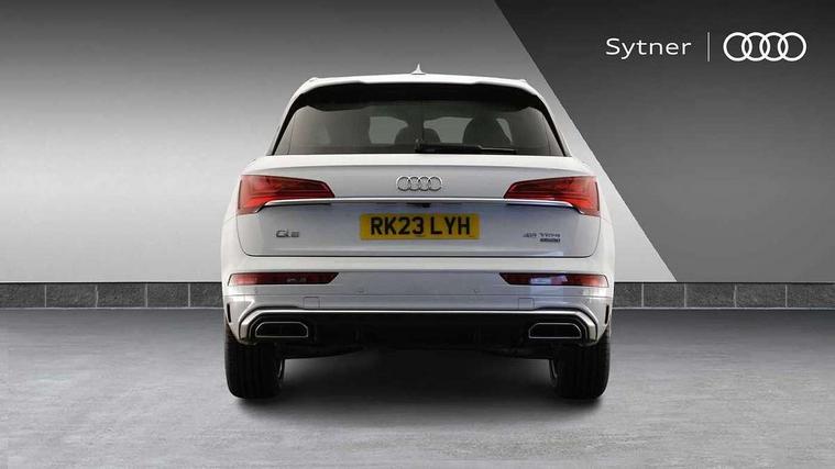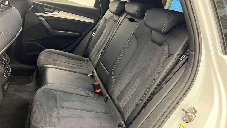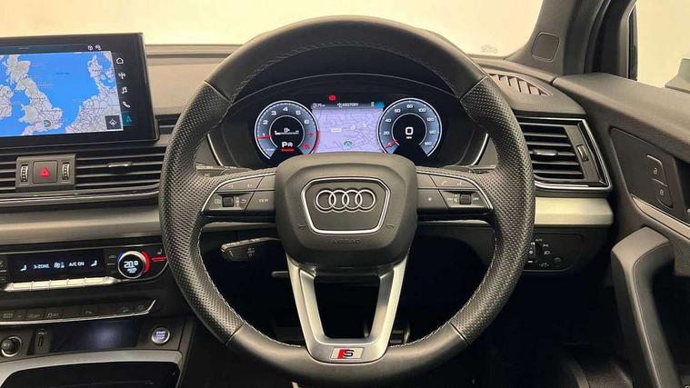 Acoustic front and rear parking sensor, Audi connect safety and service (e-call), Audi connect with Amazon Alexa Integration, Audi drive select, Audi virtual cockpit plus with 12.3" screen and three different layout designs, Audi wireless smartphone interface, Automatic start-stop system with coasting functionality and efficiency programme, Bluetooth interface, Electro - mechanical power assisted steering, MMI navigation plus with 10.1" touch screen, Power tailgate, Reversing camera, Service interval indicator, Voice control system with Audi hotword activation "Hey Audi", Quattro on demand, S line sports suspension, 8 loudspeakers, DAB Digital radio, 3rd brake light, Acoustic windscreen, Aluminium roof rails, Audi matrix LED headlights with dynamic front and rear indicators, Auto dimming door mirrors, Auto dimming frameless rear view mirror, Automatic headlight adjustment, Automatic headlights and windscreen wipers, Body colour bumpers, Body colour door mirrors, Body colour rear diffuser with matt aluminium silver surrounds, Body colour underbody protection, Chrome plated exhaust trims, Daytime running lights, Door sills in Selenite silver, Electric adjustable/heated/folding door mirrors, Front air inlet surrounds in aluminium, Front and rear electric windows, Front radiator grille in honeycomb design, Headlight washers, Lower bumpers painted in contrast Manhattan grey, Rear chrome trim strip below lights, Rear privacy glass and rear side windows, Rear side wing doors, Rear wiper, Roof bars, S Line badges on the front wings, S Line front and rear bumpers, S Line rear spoiler, S Line side skirts, 2 x USB charging port with aux input socket, 3 rear headrests, 3 spoke leather multifunction steering wheel with S badging perforated leather grips, 40:20:40 split folding 3 rear bench seat in 2nd row with rear centre armrest, Black cloth headlining, Comfort front centre armrest, Contrast stitching on seats, steering wheel and gear lever gaiter, Deluxe 3 zone electronic climate control, Front/rear floor mats, Gear lever in black leather, Heated front seats, Height adjustable front head restraints, Height/reach adjustable steering column, Illuminated door sill trims with S logo, Luggage compartment cover, Manual seat adjustment with 4-way electric lumbar support, Removable luggage compartment floor, Single front passenger seat, Stainless steel pedals, Sunvisors with vanity mirrors, High gloss pack - Q5, LED interior light pack - Q5, 3 point seatbelts on all seats, 6 airbags - Driver, front passenger, curtain and side airbags, Electrically operated child locks on rear doors, Electromechanical parking brake, Electronic stabilisation control including ABS, ASR and EDL, First aid kit with warning triangle and vests, Front passenger airbag deactivation, Hill descent control, Hill hold assist, ISOFIX child seat mounting for front passenger seat and ISOFIX child seat mounting with Top Tether for outer rear seats, Multi collision brake assist, Pop-up bonnet for pedestrian protection, Pre sense city, Seat belt force limiter, Seatbelt monitoring, Tyre pressure warning, Anti theft alarm, Anti-theft wheel bolts, Keyless Go access/ignition system, Remote central locking, Air vents inserts and centre console in gloss black, Matt brushed aluminium inlays,
