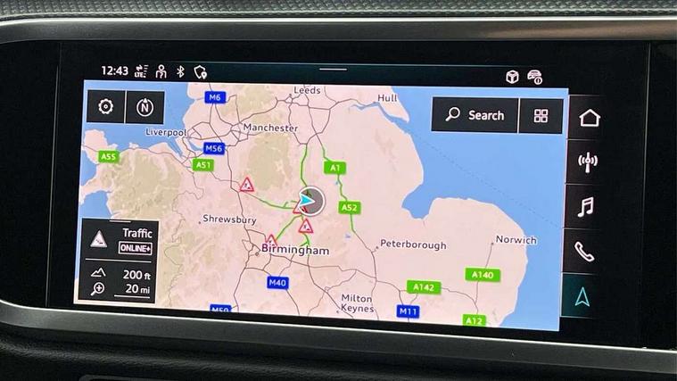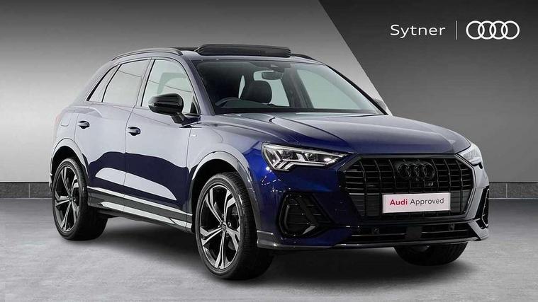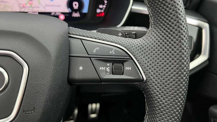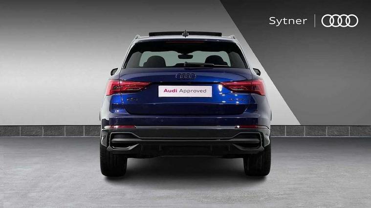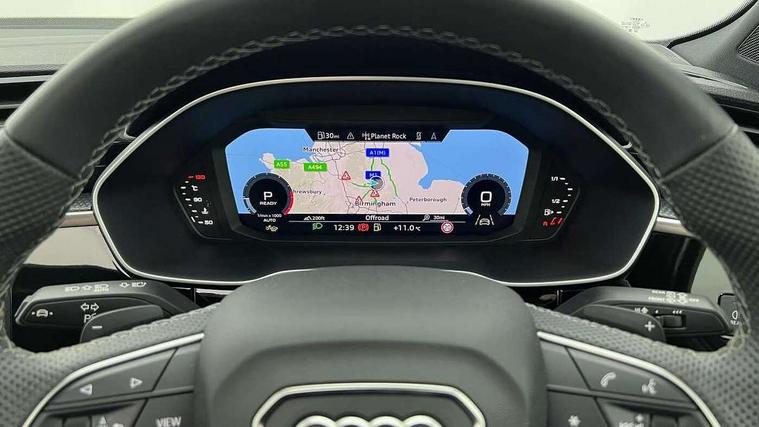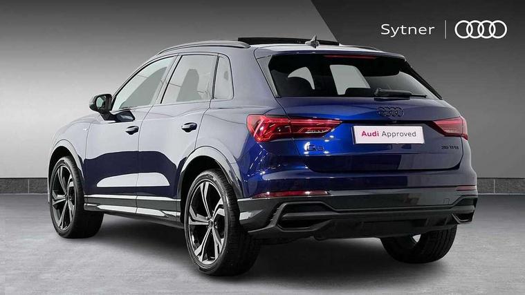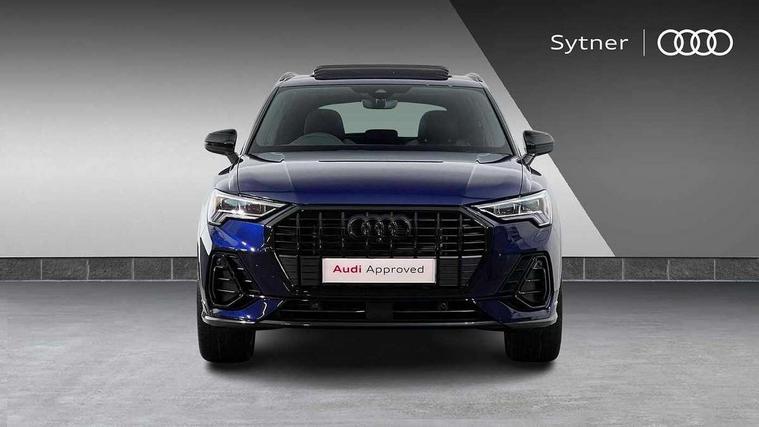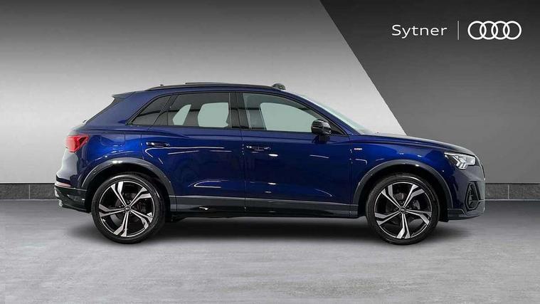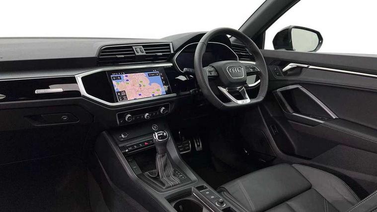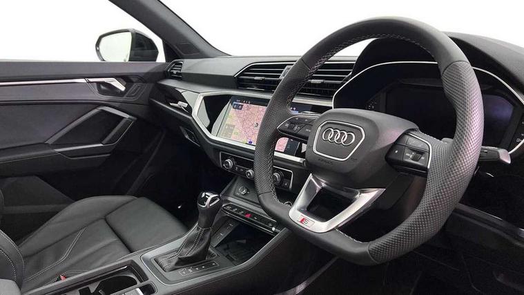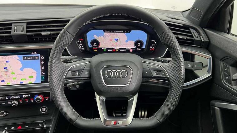 Amazon alexa Integration, Audi connect safety and service, Audi drive select, Audi lane departure warning, Audi smartphone interface includes wireless Apple carplay/Android Auto, Audi Virtual Cockpit - 10.25" display, Bluetooth interface, Camera based traffic sign recognition, Distraction and Fatigue warning, Legal emergency call, MMI Navigation Plus with high resolution 10.1 inch touchscreen colour display, Power operated tailgate, Progressive steering, Service interval indicator, Start stop system with recuperation, Voice control system with natural language interaction, Sports suspension, 2 USB-C ports with charge and data functions, 6 passive loudspeakers, DAB digital radio module, Acoustic windscreen, Audi Beam uses LEDs to project the Audi logo onto the ground as you exit your Q3, Auto dimming door mirrors, Auto dimming frameless rear view mirror, Black roof rails, Electrically folding, adjustable and heated door mirrors with integrated LED side indicators and kerb view function for passenger side, Front and rear electric windows, Front fog lights, Grille vertical bars in aluminium silver/Matt, High gloss black finish B and C pillars, LED Dynamic rear indicators, LED headlights with LED daytime running lights, LED rear lights, LED third brake light, Privacy glass dark tinted rear and rear-side windows (from B-pillar backwards), Rain and light sensors, Rear diffuser grille in grained matt black, Rear diffuser strip in matt anthracite black, Rear side wing doors, Rear wiper, S line bumpers in contrasting Manhattan grey, Variable front intermittent wipers, 12V socket in rear centre console, 3 seat bench in 2nd row, 40:20:40 folding with manual adjustment for 60:40 forwards/backwards position and backrest angle, Adjustable rear seat bench/backrest with centre armrest and cupholder, Black cloth headlining, Dual zone electronic climate control, Electric lumbar support, Front and rear black floor mats with contrast stitching in rock grey, Front and rear headrests, Front centre armrest, Height and reach adjustable steering wheel, Illuminated door sill trims with S logo, ISOFIX child seat mounting for front passenger with airbag deactivation and outer rear seat including top tether attachment point for outer rear seats, Manual front seats with height adjustment, Perforated leather gearknob, Single front passenger seat, Stainless steel luggage compartment sill finisher, Stainless steel pedals, Twin leather upholstery with front sport seats + S embossing, Black styling pack - Q3, Non smoking pack - Q3, 3x3 point rear seatbelts, 6 airbags - Driver, front passenger, curtain and side windows, Audi pre-sense front with pedestrain and cyclist recognition, Electrically operated child locks on rear doors, Electromechanical parking brake, Electronic stabilisation control including ABS, ASR and EDL, Front seatbelt reminder, Hill descent control, Hill hold assist, Pre sense basic, Seatbelt monitoring, Tyre pressure warning, Warning triangle and first aid kit, Anti theft alarm, Anti theft wheel bolts, Immobiliser, Remote central locking, Aluminium look interior elements, Detail dashboard around MMI touch colour display in glass look, black with surround in aluminium look, Leatherette door armrest, Piano black inlay,