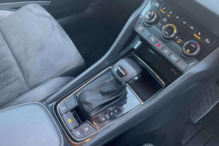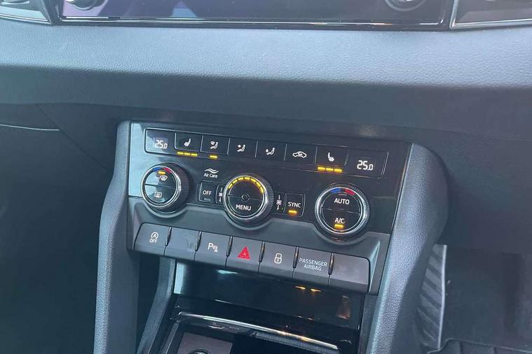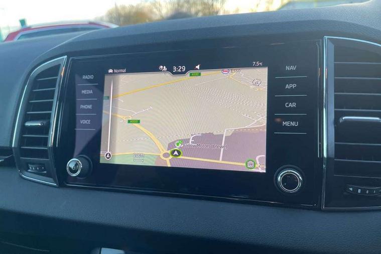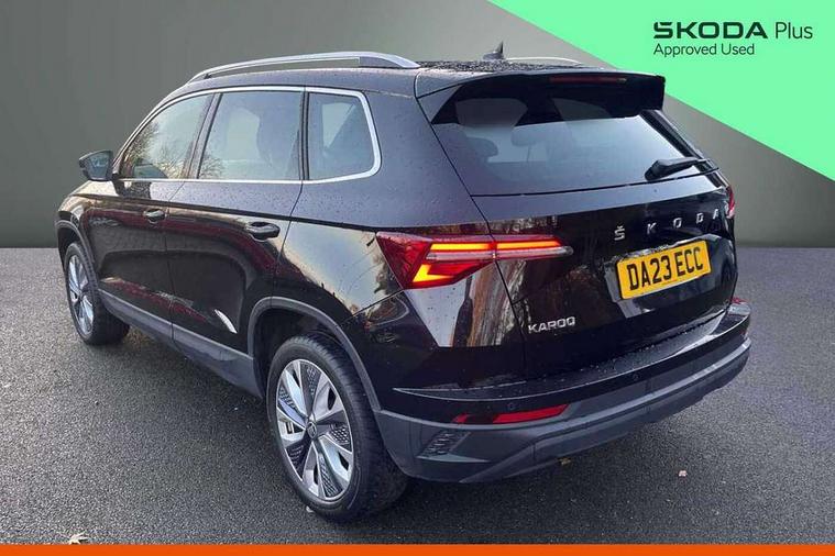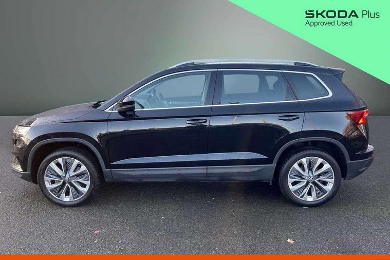8" Digital display, Care connect, Driver fatigue sensor, Emergency services call system, Outside temperature gauge, Service interval indicator, SmartLink wireless for Apple and wired for Android, Start/stop system with regenerative braking, USB C Port x 2 in front centre console, 8 Speakers, DAB radio with Bluetooth, USB connection, Acoustic glass, Aero front windscreen wipers with intermittent function, Auto dimming rear view mirror with light and rain sensors, Black electric window control buttons, Body colour door mirrors and handles, Dynamic headlight range control with cornering light function, Electric front and rear windows with child proof lock, Heated rear windscreen, LED daytime running lights, LED rear lights with high functionality welcome effect and dynamic indicators, Light assistant (coming/leaving home/tunnel light), Plastic scuff plates, Privacy glass, Rear side wing doors, Rear spoiler, Rear window wiper with washer system and intermittent control, Safety reflectors on front doors, 1.5 litre bottle holders in driver and front passenger door panels, 12V socket in boot, 12v socket in front centre armrest with storage compartment and rear air vents, 2 Folding hooks and nets in boot, 2 spoke leather heated multifunction steering wheel with DSG paddles, 2 x Tablet holder, 3 rear height adjustable headrests, 3 seat bench in 2nd row, 4 foldable roof handles with rear coat hooks, Black floor carpet, Chrome inner door handles, Decorative door sills with KAROQ badging, Double sided boot floor, Foldable hooks in the boot, Front head restraints, Height adjustable front three point seats belts with tensioners, Height/reach adjust steering wheel, Ice scraper, Illuminated glovebox, Illuminated luggage compartment, Isofix child seat preparation for front passenger seat, Isofix child seat preparation outer rear, Manual lumbar support for front seats, Pen holder, Pollen filter, Rear boot cover, Rear reading lights, Rubbish bin door, Safety vest holder, Single front passenger seat, Storage box in upper central dashboard closed, Sunvisors with illuminated vanity mirrors, Textile floor mats, Ticket holder, VarioFlex seats with standard rear seat release, Chrome roof rails + chrome pack - Karoq, Parking pack - Karoq, Automatic door unlocking in case of crash, Automatic fuel cut off in case of crash, Child locks on rear doors, Driver airbag, Electronic parking brake with auto hold function, Emergency rear braking signal, ESC including ABS, MSR, ASR, EDS, HBA, DSR, RBS, MKB and traction control, Front side airbags, Hill hold control, Knee airbags, Passenger airbag with switch-off function, Pedestrian monitor, Seatbelt reminder signalisation and pretensioner for all seats, Three point seatbelts rear, Two tone horn, Tyre pressure display, Tyre pressure monitor, Alarm with interior monitoring, back up horn and tilt sensor with safe function, Electronic engine immobiliser, Keyless entry and start/stop, Remote central locking with 2 remote folding keys, Chrome framed air vents, 18" Procyon silver alloy wheels with anthracite aero inserts, Anti-theft wheel bolts protection, Storage on wheel cover, Tool kit,