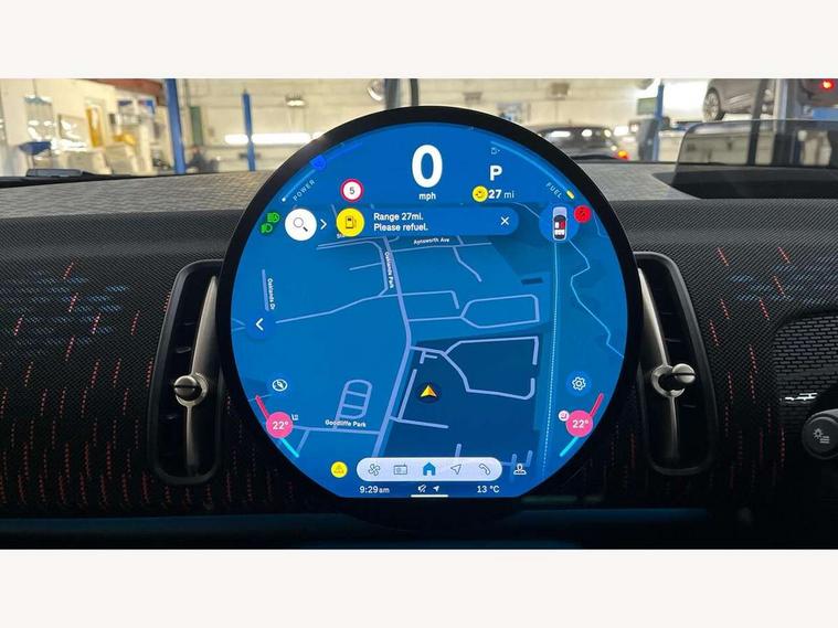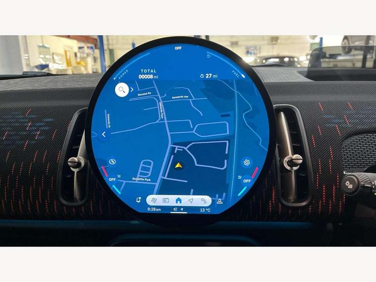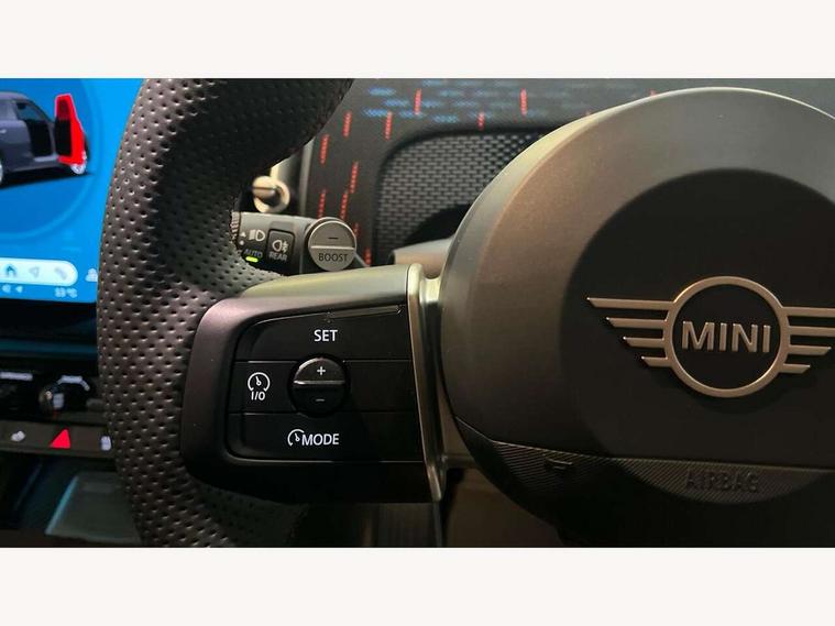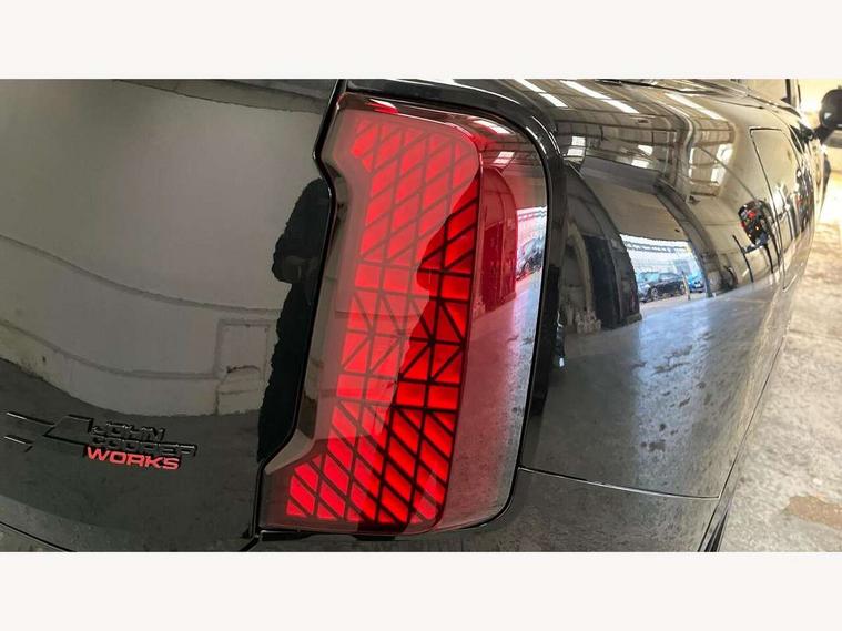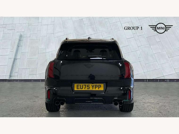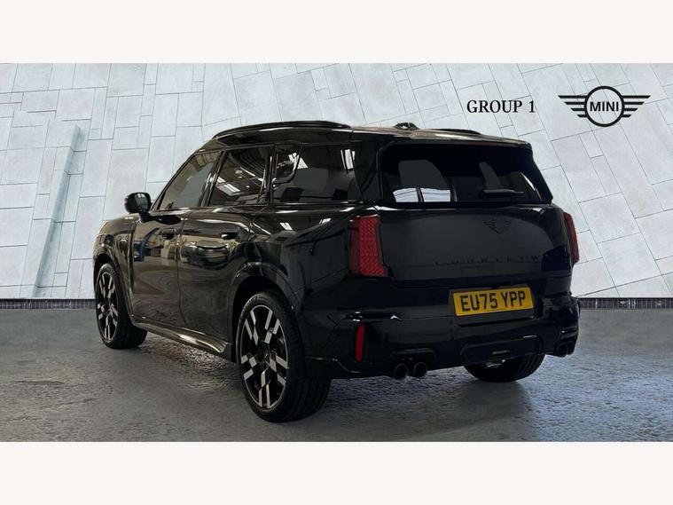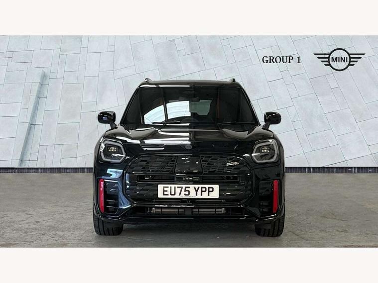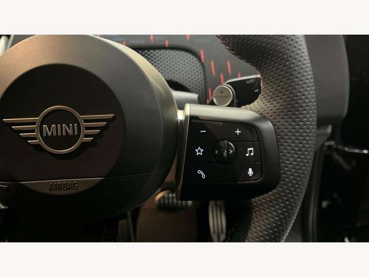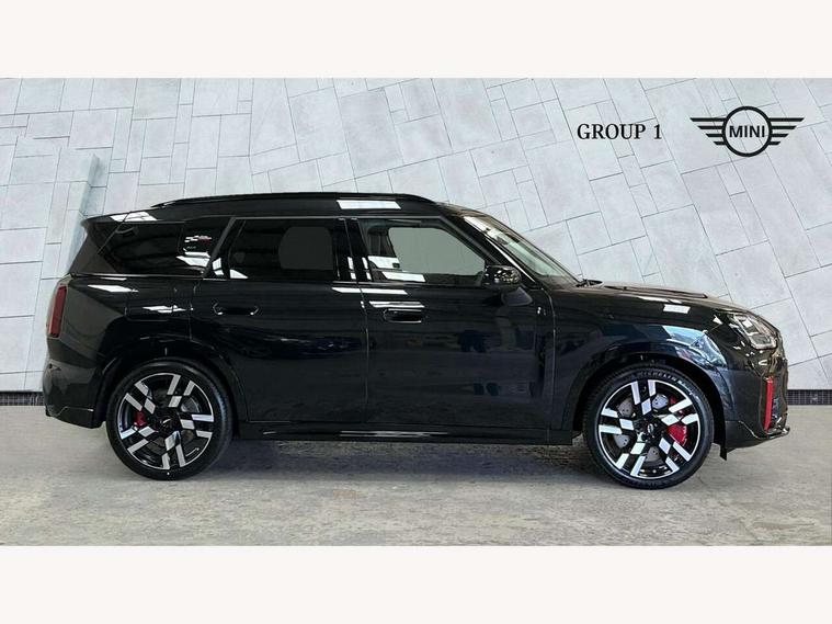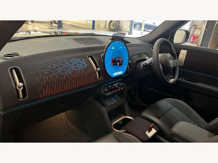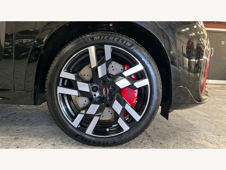 Bluetooth connection, Circular OLED Screen, Compatible mobile phone bluetooth with audio streaming, Cruise Control (DCC), Digital dashboard display, Driving assistant, Driving Assistant Plus Preparation, E-call, Electro-mechanical speed dependant steering assistance, MINI Experience Modes, MINI Head up display, Mini navigation system, MINI TeleServices, Parking assistant in camera and ultrasound based assistance system, rear view camera, parking aid and distance control, Adaptive suspension, Double clutch sports transmission, Larger capacity fuel tank, Quad exhaust system, DAB Digital radio, Harman Kardon surround sound system, Personal eSim, Auto tailgate, Electric adjustable heated door mirrors, Front and rear apron, Front and rear electric windows, Heated rear window, High beam assistant, High gloss hexagonal patterned grille surround, Interior rear-view mirror with automatic anti-dazzle function, LED daytime running lights, LED headlights with extended contents including Adaptable light signatures, LED rear lights, LED third brake light, Rain sensor with auto headlights, Rear roof spoiler with airblades, Rear side wing doors, Rear window wiper, Roof rails, 3 seat bench in 2nd row, 60/40 split rear bench seat, Anthracite headliner, Auto air conditioning, Driver and front passenger seat heating, Floor mats, Front armrest, Front headrests, Heated steering wheel, Height and length steering column adjustment, JCW Front sports seats, Lidded storage box in Black/Red knit, Luggage compartment separating net, Perforated Vescin steering wheel, Rear headrests, Seat adjustment for rear seats, Single front passenger seat, Sunvisors with vanity mirrors, Wireless charging tray, Interior and exterior mirror package - Mini Countryman, 3x3 point rear seat belts, 6 Airbags - front, side, head and seat belt tensioners, ABS, DSC - Dynamic Stability Control, Electronic handbrake, Electronic Stability Programme (ESP), Front ISOFIX (iSize), Hill descent control, Hill hold assist, Hill start assist, JCW logo in brake calipers, JCW Sport brakes with Chilli Red calipers, Manual rear child locks, Traction control, Tyre pressure monitoring system, Warning triangle, Alarm system with tilt sensor, monitoring doors, bonnet interior and tailgate, Auto drive away locking, Comfort access system, Deadlocking function, Electronic vehicle immobiliser, Locking wheel bolts, Remote control locking, Start/stop toggle with keyless go, 19" JCW Runway Spoke Black alloy wheels, Tyre repair kit plus,