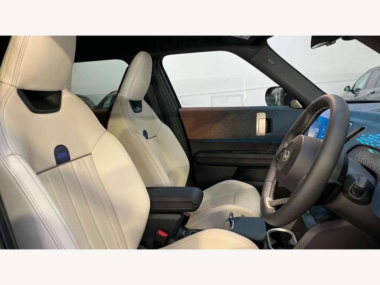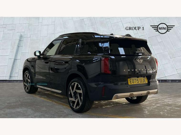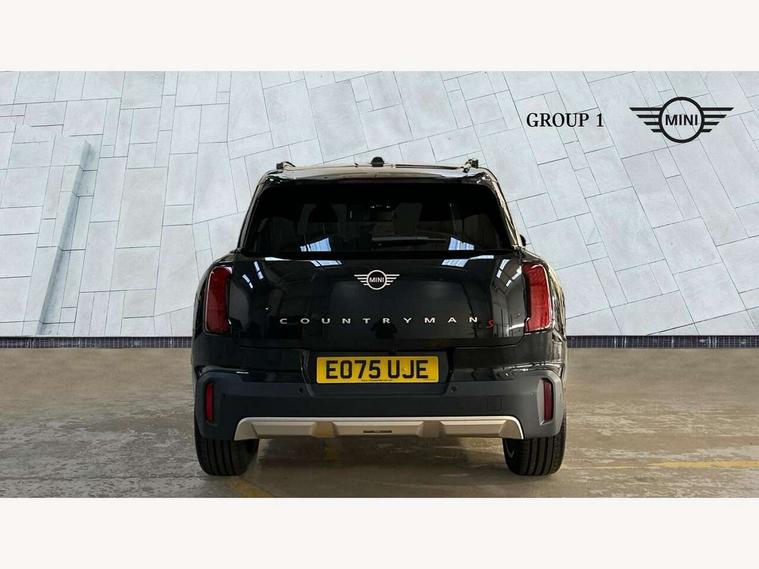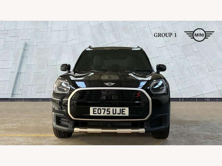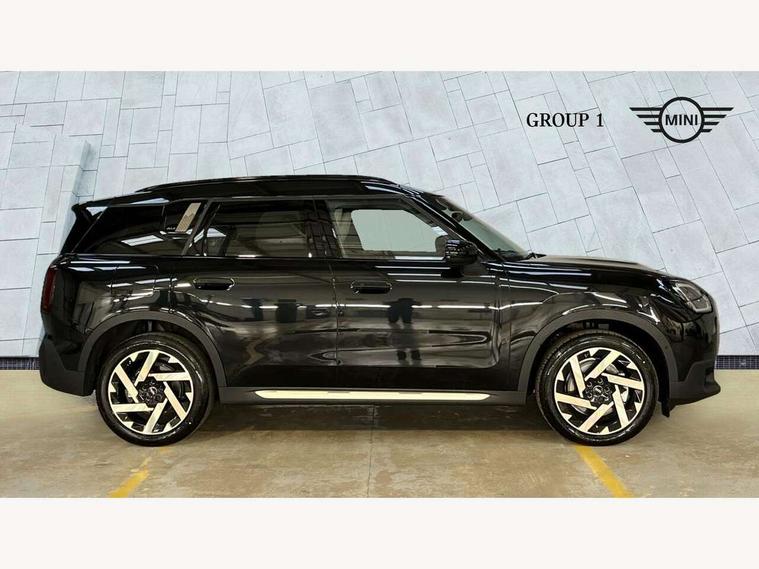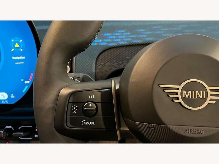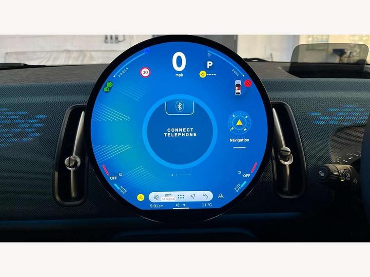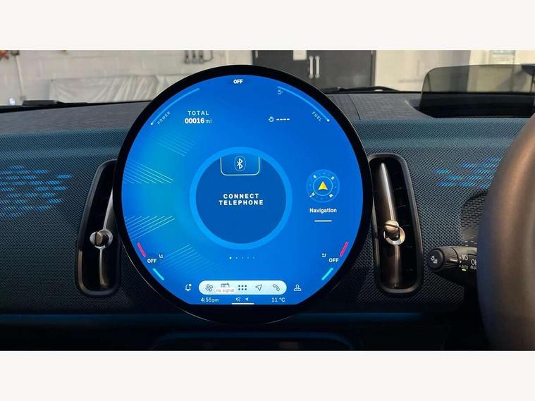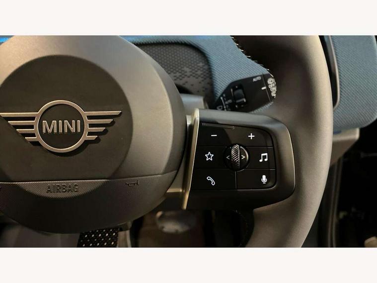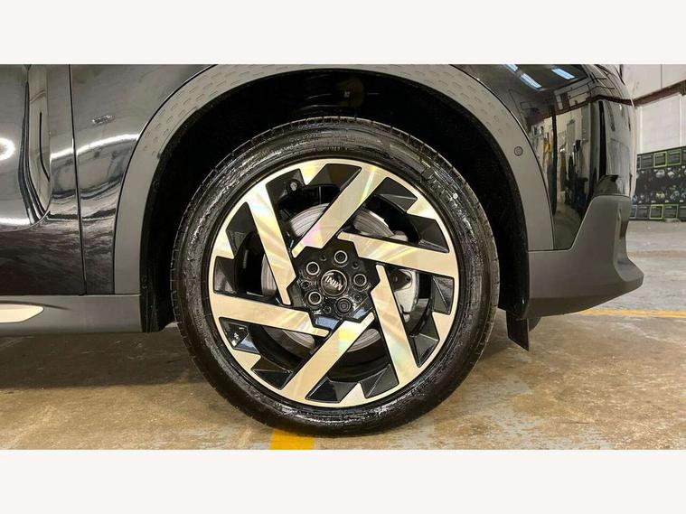 Bluetooth connection, Circular OLED Screen, Compatible mobile phone bluetooth with audio streaming, Cruise Control (DCC), Digital dashboard display, Driving assistant, Driving Assistant Plus Preparation, E-call, Electro-mechanical speed dependant steering assistance, MINI Experience Modes, MINI Head up display, Mini navigation system, MINI TeleServices, Parking assistant in camera and ultrasound based assistance system, rear view camera, parking aid and distance control, Auto transmission with Paddles, Larger capacity fuel tank, 6 speakers, DAB Digital radio, Personal eSim, Auto tailgate, Electric adjustable heated door mirrors, Front and rear electric windows, Heated rear window, High beam assistant, Interior rear-view mirror with automatic anti-dazzle function, LED daytime running lights, LED headlights with extended contents including Adaptable light signatures, LED rear lights, LED third brake light, Logos in Vibrant Silver, Rain sensor with auto headlights, Rear side wing doors, Rear window wiper, Roof rails, Vibrant silver grille surround, 3 Seat sliding rear bench in 2nd row, Anthracite headliner, Auto air conditioning, Driver and front passenger seat heating, Floor mats, Front armrest, Front headrests, Front sport seats, Heated steering wheel, Height and length steering column adjustment, Lidded storage box in Petrol knit, Luggage compartment separating net, Rear headrests, Seat adjustment for rear seats, Single front passenger seat, Sport Vescin Steering Wheel, Sunvisors with vanity mirrors, Vescin synthetic leather upholstery, Vibrant Silver sill inlay, Wireless charging tray, Interior and exterior mirror package - Mini Countryman, 3x3 point rear seat belts, 6 Airbags - front, side, head and seat belt tensioners, ABS, DSC - Dynamic Stability Control, Electronic handbrake, Electronic Stability Programme (ESP), Front ISOFIX (iSize), Hill descent control, Hill hold assist, Hill start assist, Manual rear child locks, Traction control, Tyre pressure monitoring system, Warning triangle, Alarm system with tilt sensor, monitoring doors, bonnet interior and tailgate, Auto drive away locking, Comfort access system, Deadlocking function, Electronic vehicle immobiliser, Locking wheel bolts, Remote control locking, Start/stop toggle with keyless go, Tyre repair kit plus,