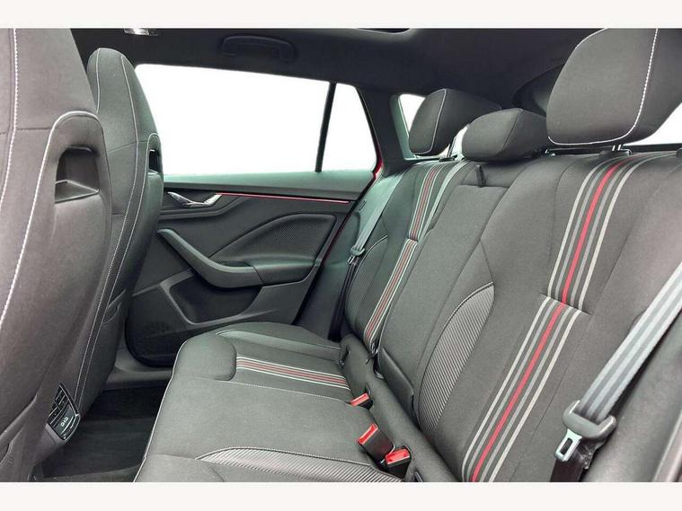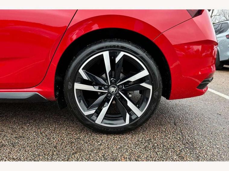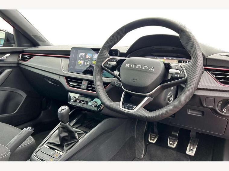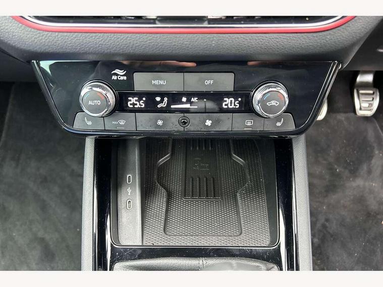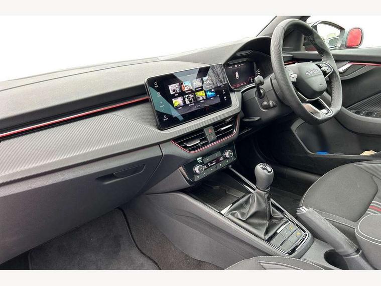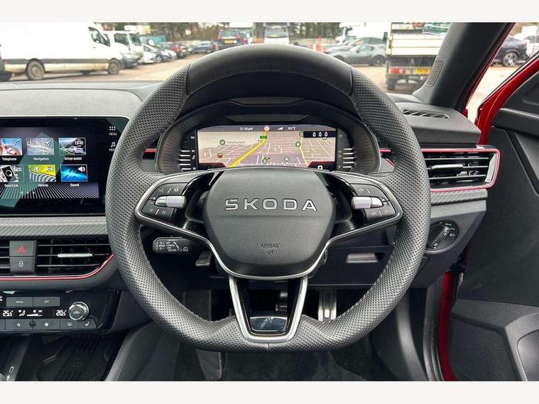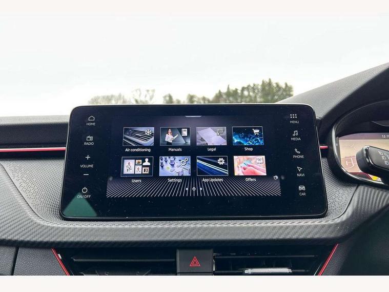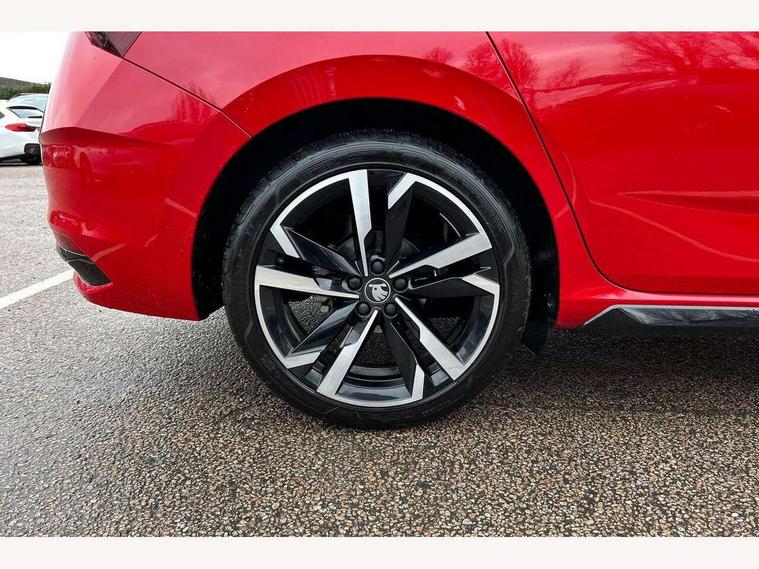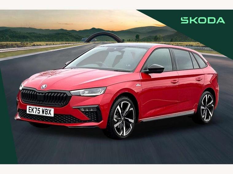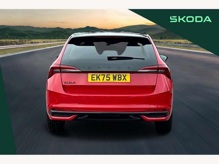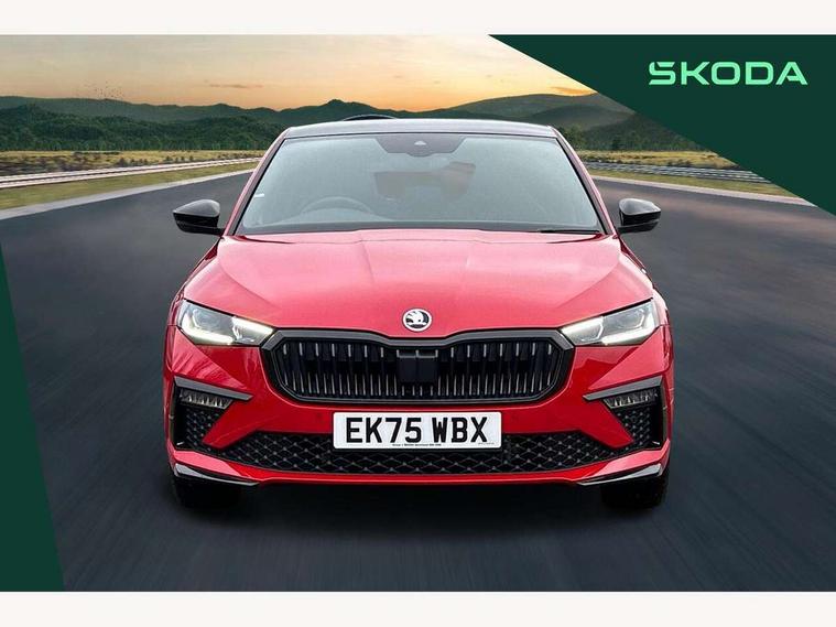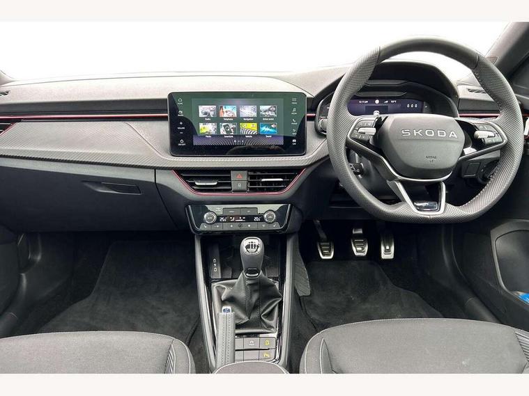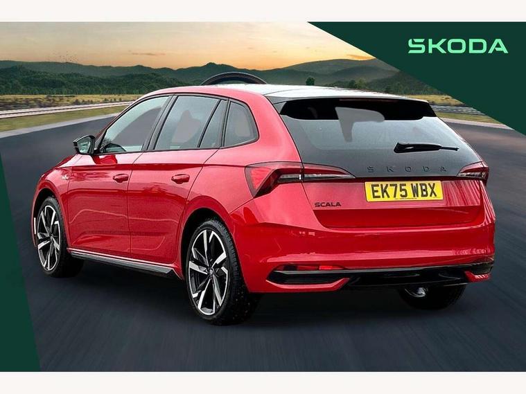 Advanced driver attention and drowsiness monitor, Bluetooth, e-Call (emergency call), Front assist system, PAS, Rear parking sensors, Rear view camera, Speed limiter, Tailgate, Traffic sign recognition, Virtual Cockpit - 10.25" digital display, Voice control system, Wireless smartlink, Drive mode select with Sport Chassis Control and ECO mode, 4 USB C ports, 8 Speakers, 9.2" Skoda navigation display, DAB radio, Auto dimming rear view mirror, Automatic headlight control with manual coming and leaving home feature, Automatic intermittent wipers, Black door mirrors, Black lettering on boot lid, Black radiator grille, Black rear diffuser, Black roof spoiler, Black window frames, Body colour bumpers, Body colour door handles, Extended tailgate glass, Front and rear electric windows, Heated rear window, LED 3rd brake light, LED daytime running lights, LED high beam, LED low beam, Light sensors, Monte carlo plaque, Panoramic glass roof, Privacy glass, Rear LED fog light, Rear side wing doors, Rear wiper, Tinted windows, Unique dark chrome design logo on alloy wheels, 12V socket in luggage compartment, 3 seat bench in 2nd row, Aluminium pedals, Ambient lighting in white/red, Black / White armrest stitching, Black roof headlining, Cargo elements, Chrome inner door handles, Door inserts in art.leather carbon, Driver and passenger sun visors with vanity mirror, Dual zone climate control, Front and rear roof lights, Front centre armrest, Front head restraints, Height adjustable driver seat, Height adjustable passenger seat, Ice scraper, Illuminated glove compartment, Inner circulation control with pollen filter, ISOFIX for front passenger seat, Isofix preparation for back seats, Leather gearknob and handbrake lever, Luggage net under rear parcel shelf, Manual lumbar support for front seats, Monte Carlo cloth upholstery, Net package and top tether hooks in boot space, Pocket on the back of both front seats, incl. mobile phone pockets, Rear centre armrest, Red hotstamping, Single front passenger seat, Skoda lettering on steering wheel, Sport seats, Textile floor mats, Third rear headrest, Ticket holder, Top tether for front passenger seat, Umbrella in driver's door, Light and view plus pack - Scala, 3x3 point rear seatbelts, ABS, Child locks, Curtain airbags and front side airbags, Disc brakes, Driver and front passenger airbags, ESP, Hill hold control, Manual leather parking brake, One tone horn, Passenger airbag switch off function, Seatbelt reminder for driver and front passenger, Tyre pressure monitoring system, Anti theft alarm system with interior monitoring, backup horn and towing protection, Anti-theft wheel bolts, Remote central locking with 2 remote folding keys, SAFE function for remote central locking, Carbon effect decorative inserts, 18" Ursa black diamond cut alloy wheels,