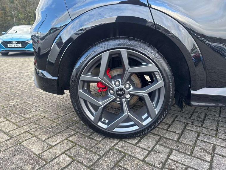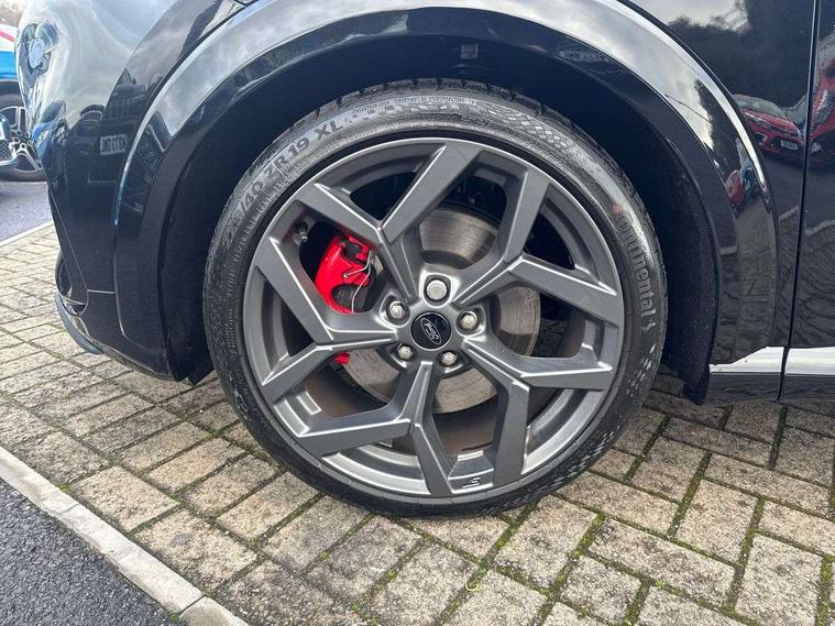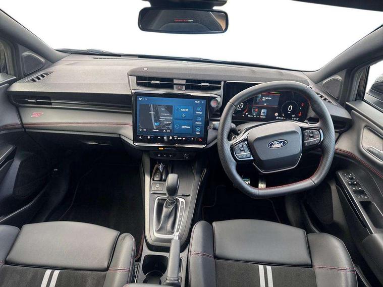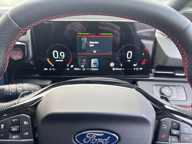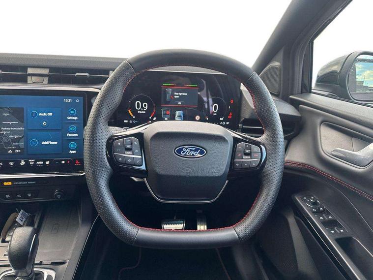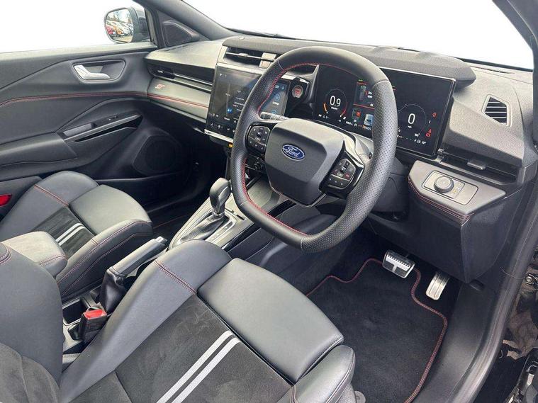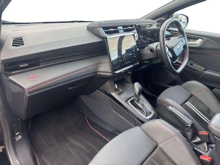 Driver impairment monitor, Emergency call service, Ford easy fuel, Full digital 12.8" instrument cluster, Lane keeping aid with lane departure warning, Power assist steering, Power lift tailgate, Selectable drive modes (normal, sport, eco, track), Speed sign recognition, ST suspension, 12" landscape touchscreen display with wireless apple car play and android auto premium B&O audio system with 10 speakers, Ford pass connect and emergency assistance, Ford SYNC4 with connected navigation, Automatic headlights with rain sensing wipers and auto high beam, Front fog lamps, Glare-free matrix LED headlamps, LED daytime running lights, LED rear lamps, LED third brake light, Power foldable heated door mirrors with puddle lamps and puma logo protection, Quickclear heated windscreen, Rear privacy glass, Rear side wing doors, Rear wiper, Unique ST body styling kit including wing mirrors and Ford Performance embossed splitter, 3 seat bench in 2nd row, Centre console with armrest and stowage, Electronic automatic temperature control (EATC), Ford megabox extended bootspace, Ford Performance seats premium synthetic leather upholstery, Front and rear head restraints, Front floor mats, Manual 6 way driver seat adjust with lumbar adjustment, Manual 6 way passenger seat with lumbar seat adjustment, Single front passenger seat, ST flat bottomed steering wheel with metal grey stitching, Driver assistance pack with blind spot information system - Puma for automatic transmission, Winter pack - Puma, 3 rear seatbelts, Child safety lock, Electronic stability control (ESC) and hill start assist, Pre-collision assist with autonomous emergency braking, pedestrian/cyclist detection & post-collision braking, Red brake calipers, Tyre pressure monitoring system (TPMS), Keyless entry and power start button, Keyless start and wireless charger, Thatcham alarm, 19" alloy wheels with magnetite dark finish, Tyre inflation kit,