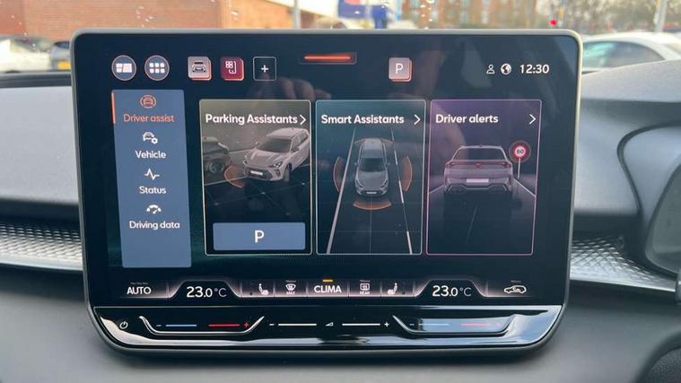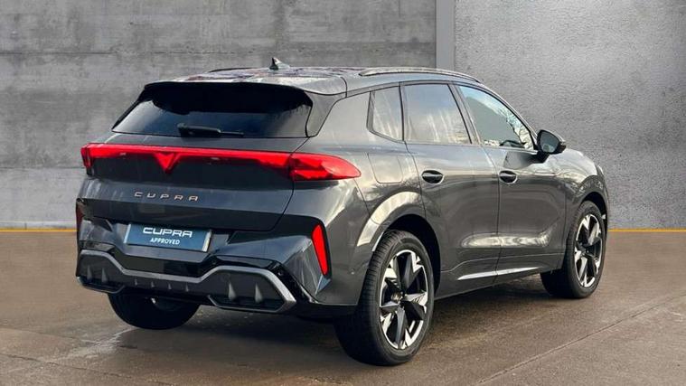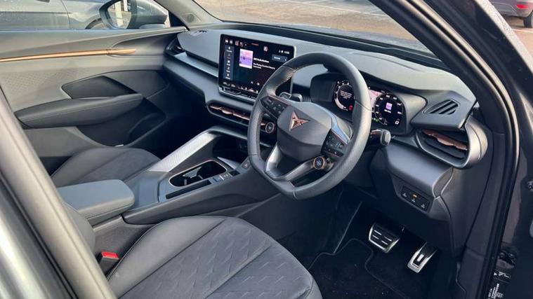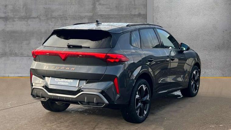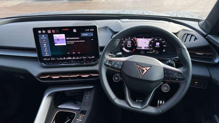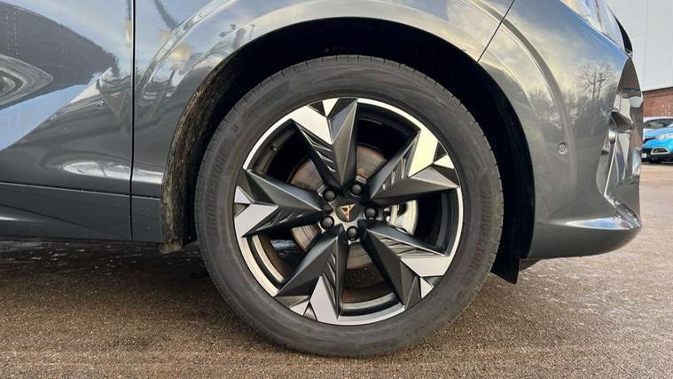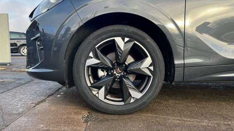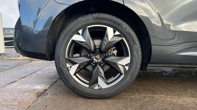 10.25" digital cockpit, Adaptive cruise control with follow-to-stop and speed limiter, Advanced driver alert system, Driving profile selection and conventional shock absorber, Dynamic road sign display, E-call, Electric tailgate with virtual pedal, Emergency steering support with turn assist, Four x USB Type C ports (2 in front and 2 in rear), Front and rear parking sensors, Front assist (Forward collision warning with automatic braking) with multifunction camera and front cross traffic assist, Lane assist, Media system with Nav - 12.9" touch display, voice control, full link phone (wired/wireless), DAB and Steering wheel mounted controls, Rear view camera, Speed sensitive power steering, Start/stop system with regenerative braking, Wireless phone charger, 10 amp mode 2 charging cable, 16 amp mode 3 charging cable, 8+1 Speakers, Auto dimming rear view mirror, Black roof rails, CUPRA 3D rear lights with ceremony & swiping indicator and illuminated logo, Dark tinted rear windows, Daytime running lights with automatic headlight control and Coming and Leaving home function, Dynamic headlight range control, Electric front/rear windows, Electrically adjustable, heated and folding door mirrors, Front fog lamps with cornering function, Heat reflecting windscreen, LED headlamps with signature "CUPRA LED", Rain sensing wipers, Rear fog light on one side, back up light on both sides, Rear side wing doors, Rear wash/wipe, Third brake light, Welcome lights (within exterior mirror housing), 3 seat bench in 2nd row, Black roof lining, Cloth upholstery, Cupra sports pedals, Driver and passenger seat with manual height and lumbar adjustment, Front and rear head restraints, Front and rear reading lights X 4, Front centre armrest, Heated leather wrapped multi function sports steering wheel with tiptronic, Illuminated interior front door sills, Interior ambient lighting, Isofix, Operating voltage 12V, Single front passenger seat, Sunvisors with illuminated mirror, Three zone climate control with control panel in rear, Unsplit rear seat bench, split folding backrest, with centre armrest, Variable luggage/load compartment floor, 3 point seatbelts on all rear seats, Brake control system - ESC and brake booster, Child proof door locks, Driver and front passenger airbags, Electronic parking brake, Front and rear disc brakes, Front interaction airbag, Front passenger airbag deactivation switch, Front side airbags with curtain airbags, Tyre pressure monitoring system, Visual and acoustic seat belt reminder, electric contact in front and rear, Anti theft alarm, Keyless locking and starting system with keyless access, Locking wheel bolts, Black decorative trims, Chrome interior detailing, 18" Atomic alloy wheels, Breakdown kit, Tool kit,