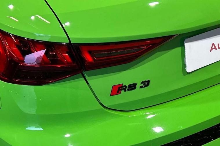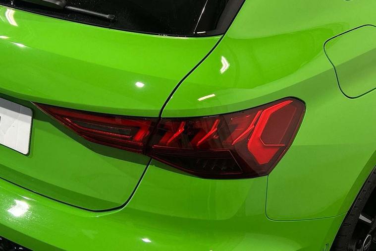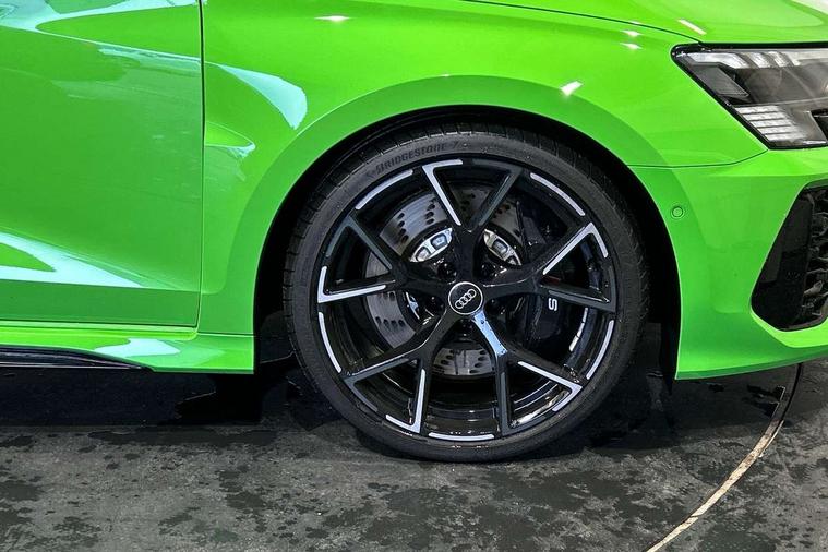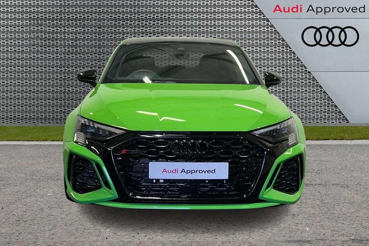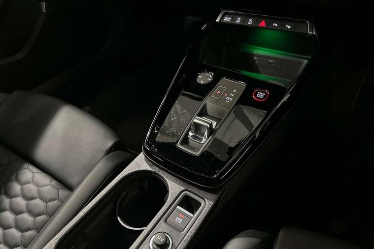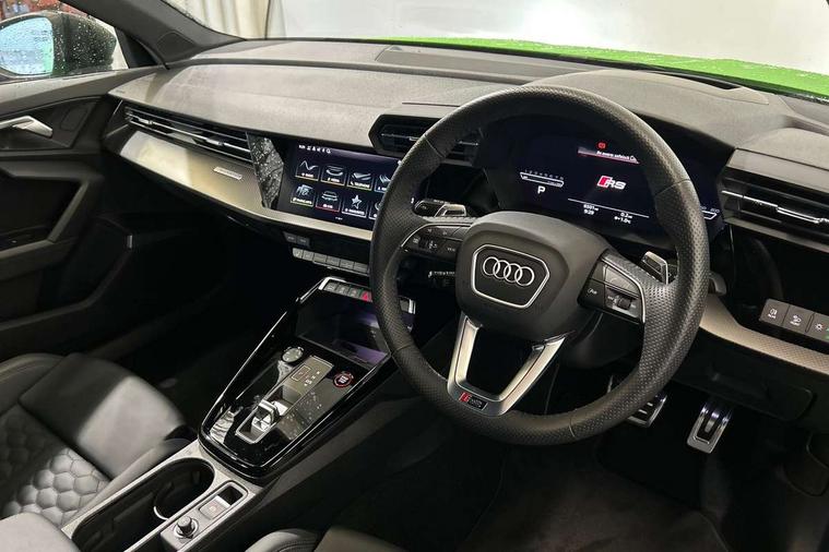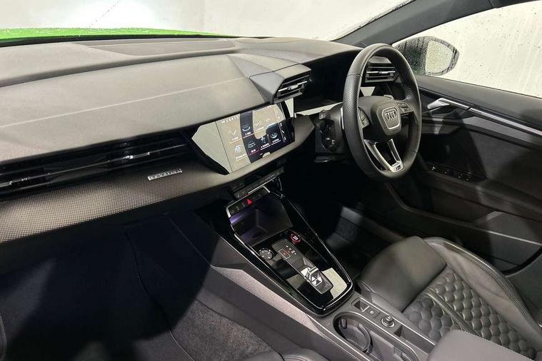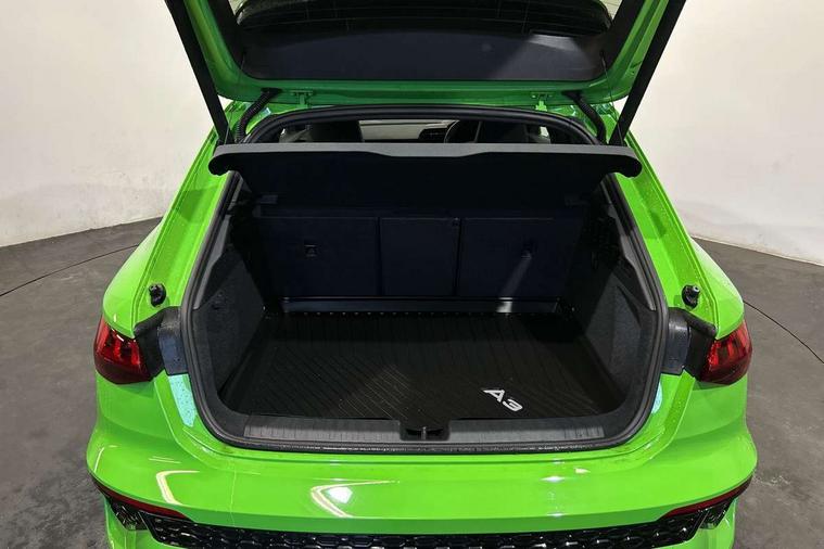 Adaptive cruise assist, Adaptive cruise control, Audi smartphone interface, Audi virtual cockpit with RS specific display 12.3" full colour digital instrument cluster, Automatic start/stop system with recuperation, Bluetooth interface, Camera based traffic sign recognition, Collision avoidance assistant, Emergency e-call, Head up Display, Lane departure warning system, Legal emergency call, Parking assist with parking system plus, Power operated tailgate - Luggage compartment lid opens electrically, Progressive power assisted steering, Reversing camera, Quattro permanent four wheel drive, Rear suspension, DAB Digital radio, 3rd brake light, Acoustic glass windscreen, Audi beam uses LEDs to project the Audi sport logo onto the ground as you exit your RS 3, Audi matrix LED headlights, LED rear lights, dynamic front and rear indicators and headlight cleaning system, Auto dimming rear view mirror, Black side skirts, Body colour roof, Carbon exterior door mirror, Carbon fibre engine cover, Daytime running lights, Electric adj heated/folding + auto dimming exterior mirrors with memory + LED indicator + auto kerb side function for passenger side exterior mirror, Front spoiler in high gloss black, Heat insulating glass windscreen, Light and rain sensors, Panoramic glass sunroof, Privacy glass - dark tinted rear and rear side windows from B-pillar backwards, Rear side wing doors, Rear window wiper and washer system, RS exterior features in gloss black, RS sports exhaust system, 3 seat bench in 2nd row, 3 spoke leather multifunction steering wheel with gear shift paddles, 4 way lumbar support for front seats, 40/20/40 split folding rear seat bench, Black cloth headlining, Dual zone electronic climate control, Electrically adjustable front seats with memory function for driver's side, Front and rear headrests, Front centre armrest, Front sports seats RS embossed logo, Front/rear floor mats, Heated front seats, Honeycomb stitching and RS embossing, Illuminated door sill trims inlays in aluminium with RS 3 logo, Illuminated vanity mirror, RS emblems, Single front passenger seat, Stainless steel pedals and front footrest in black, Aluminium interior elements pack - RS3, Ambient lighting pack - RS3, Comfort and sound pack - RS3, Driver assistance pack with 3 spoke leather multi function steering wheel - RS3, MMI navigation plus with MMI touch - RS3, RS bodystyling - RS3, Storage Pack - RS3, 3x3 point rear seat belts, ABS/EBD, ASR, Audi pre sense front, Driver/Front Passenger airbags, EDL, ESC - Electronic Stability Control + traction control, Front passenger airbag deactivation, Front side airbags with head airbags and interaction airbag, Hill hold assist, Seat belt reminder with passenger presence detection in rear, Tyre pressure loss indicator, Warning triangle and first aid kit, Anti theft alarm, Anti-theft wheel bolts, Electronically operated child lock, Remote control central locking, Full decorative carbon trim, 19" 5 Y spoke black with graphic print alloy wheels, Tool kit, Tyre repair kit,