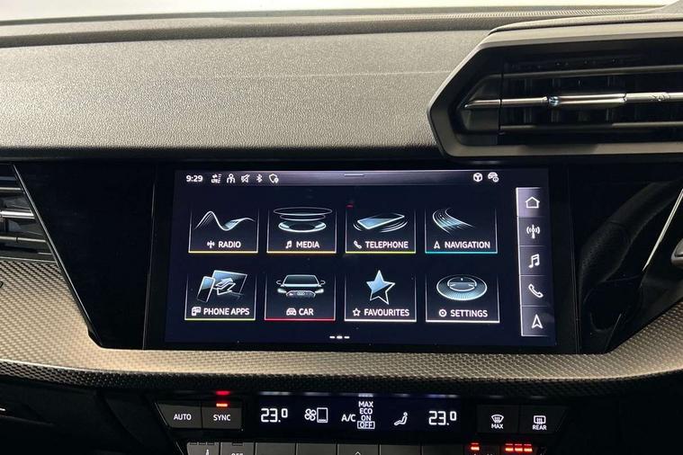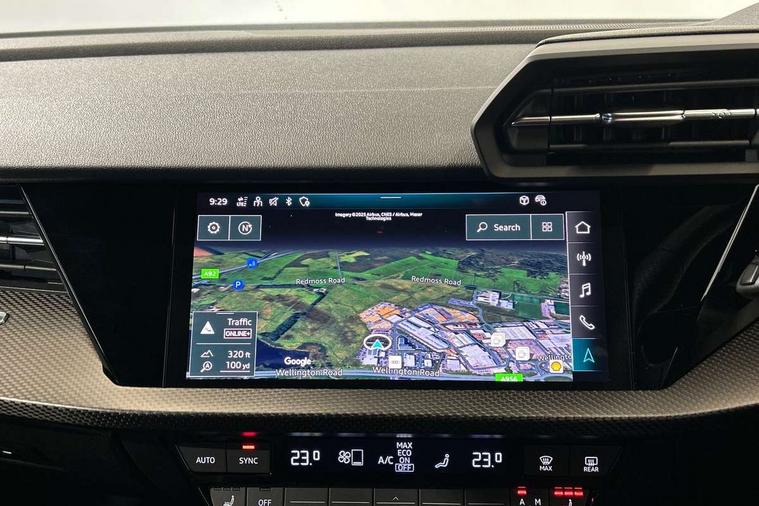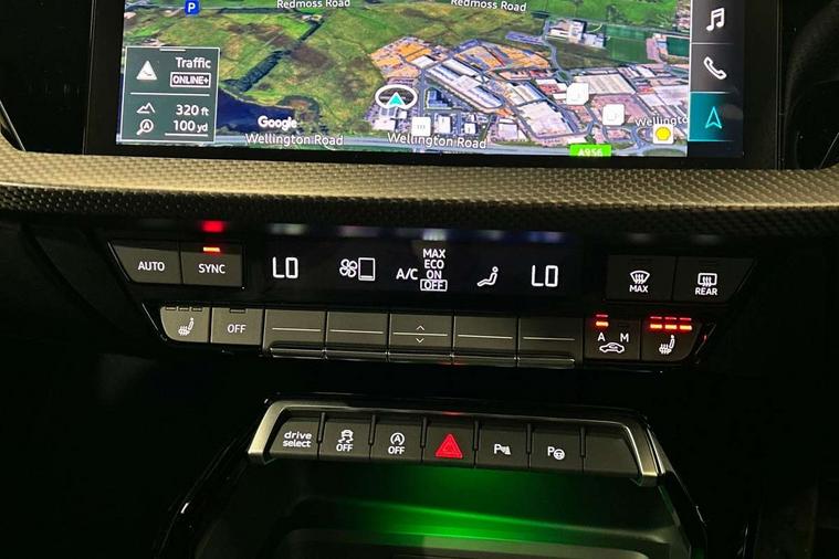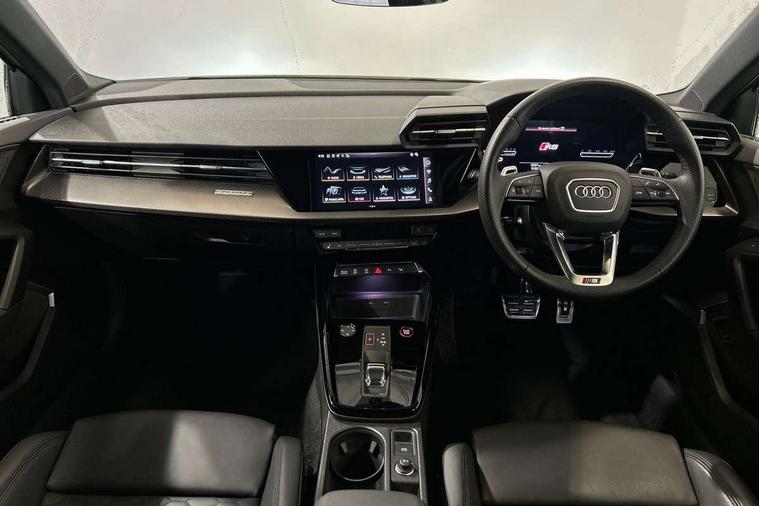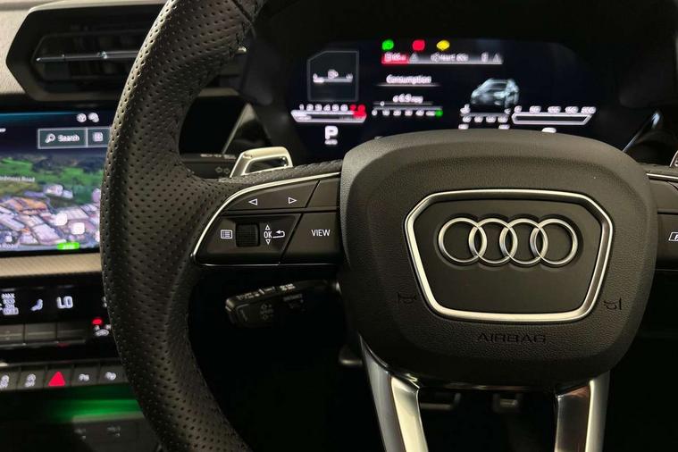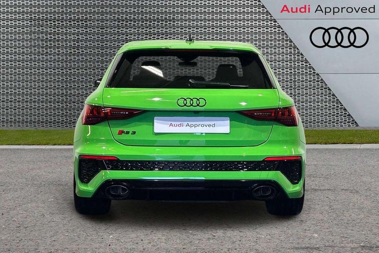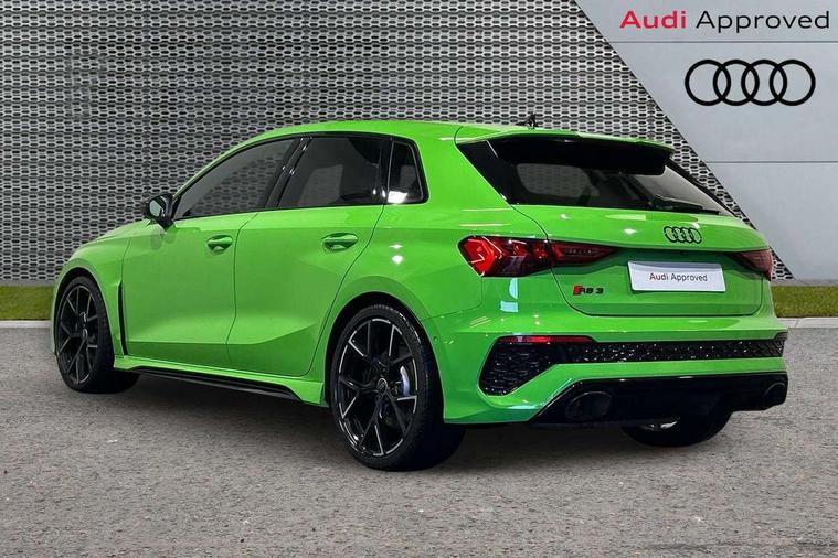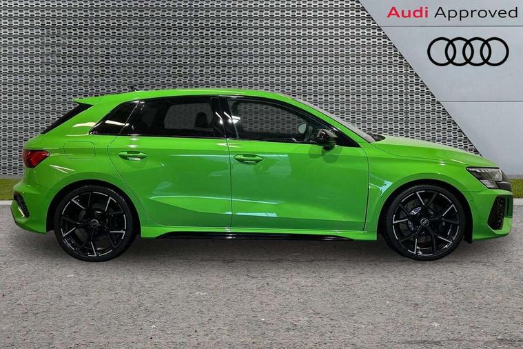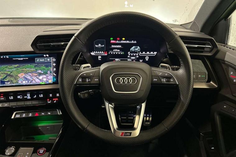 Adaptive cruise assist, Adaptive cruise control, Audi smartphone interface, Audi virtual cockpit with RS specific display 12.3" full colour digital instrument cluster, Automatic start/stop system with recuperation, Bluetooth interface, Camera based traffic sign recognition, Collision avoidance assistant, Emergency e-call, Head up Display, Lane departure warning system, Legal emergency call, Parking assist with parking system plus, Power operated tailgate - Luggage compartment lid opens electrically, Progressive power assisted steering, Reversing camera, Quattro permanent four wheel drive, Rear suspension, DAB Digital radio, 3rd brake light, Acoustic glass windscreen, Audi beam uses LEDs to project the Audi sport logo onto the ground as you exit your RS 3, Audi matrix LED headlights, LED rear lights, dynamic front and rear indicators and headlight cleaning system, Auto dimming rear view mirror, Black side skirts, Body colour roof, Carbon exterior door mirror, Carbon fibre engine cover, Daytime running lights, Electric adj heated/folding + auto dimming exterior mirrors with memory + LED indicator + auto kerb side function for passenger side exterior mirror, Front spoiler in high gloss black, Heat insulating glass windscreen, Light and rain sensors, Panoramic glass sunroof, Privacy glass - dark tinted rear and rear side windows from B-pillar backwards, Rear side wing doors, Rear window wiper and washer system, RS exterior features in gloss black, RS sports exhaust system, 3 seat bench in 2nd row, 3 spoke leather multifunction steering wheel with gear shift paddles, 4 way lumbar support for front seats, 40/20/40 split folding rear seat bench, Black cloth headlining, Dual zone electronic climate control, Electrically adjustable front seats with memory function for driver's side, Front and rear headrests, Front centre armrest, Front sports seats RS embossed logo, Front/rear floor mats, Heated front seats, Honeycomb stitching and RS embossing, Illuminated door sill trims inlays in aluminium with RS 3 logo, Illuminated vanity mirror, RS emblems, Single front passenger seat, Stainless steel pedals and front footrest in black, Aluminium interior elements pack - RS3, Ambient lighting pack - RS3, Comfort and sound pack - RS3, Driver assistance pack with 3 spoke leather multi function steering wheel - RS3, MMI navigation plus with MMI touch - RS3, RS bodystyling - RS3, Storage Pack - RS3, 3x3 point rear seat belts, ABS/EBD, ASR, Audi pre sense front, Driver/Front Passenger airbags, EDL, ESC - Electronic Stability Control + traction control, Front passenger airbag deactivation, Front side airbags with head airbags and interaction airbag, Hill hold assist, Seat belt reminder with passenger presence detection in rear, Tyre pressure loss indicator, Warning triangle and first aid kit, Anti theft alarm, Anti-theft wheel bolts, Electronically operated child lock, Remote control central locking, Full decorative carbon trim, 19" 5 Y spoke black with graphic print alloy wheels, Tool kit, Tyre repair kit,