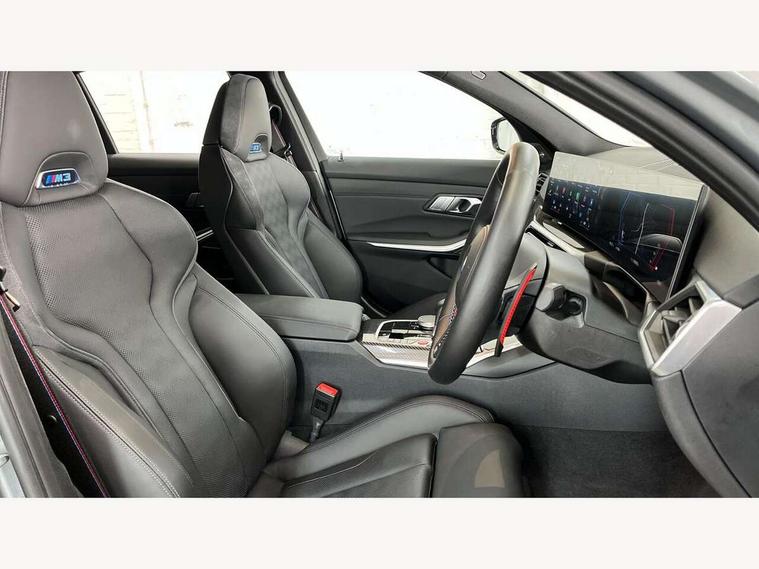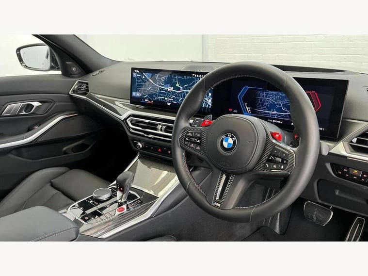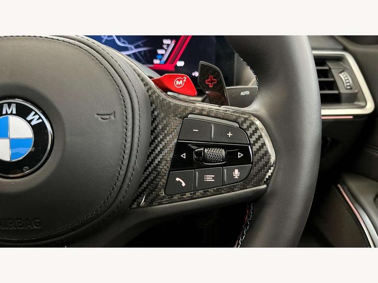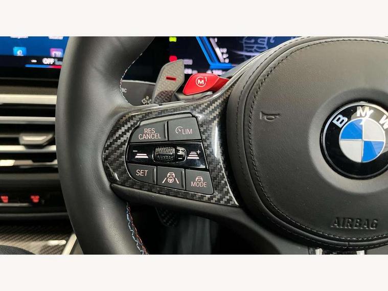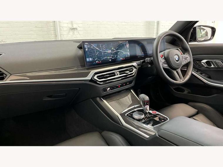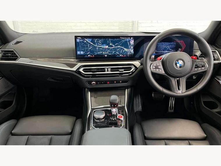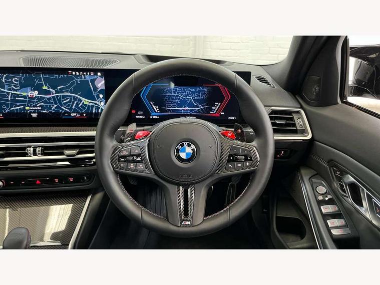 Active guard plus, Automatic start/stop system, Bluetooth functionality with Apple CarPlay/Android Auto, BMW iDrive controller on centre console, BMW legal emergency call, BMW Live Cockpit Professional sat nav system with 12.3" instrument display and high resolution control display, BMW Online services, BMW Teleservices, Brake pad wear indicator warning light, Condition based service, Connected drive services, Door/boot open warning light, Driving experience switch, Illuminated control elements, Instrument cluster with extended contents, Lights on warning, M drive buttons, Oil sensor for level and grade, warning by check control system, Oil temperature gauge, On board computer, On board diagnostics, Optimum shift indicator, Outside temperature display, Pull away assistant, Run flat indicator, Service interval indicator, Shifting point display, Speed limiter, Variable sport steering, Widescreen display, Adaptive M Sport suspension, Double joint spring strut front axle, M Drive Professional including track mode, laptimer, traction control & Drift analyser, M Sport differential, M steptronic sport transmission with drivelogic, Safety battery terminal clamp, 8 programmable favourite buttons, Auxiliary point for auxiliary devices, BMW professional radio/CD/MP3, DAB Digital radio, Harman/Kardon loudspeaker system, 3rd brake light, Acoustic glazing, Auto dimming driver's door mirror, Auto dimming rear view mirror, Automatic headlights + automatic windscreen wipers, Automatic parking function on front passenger's exterior mirror, Black chrome exhaust tailpipes, Black model designation badges, BMW emblem on engine compartment lid and tailgate, BMW high gloss shadow line with extended contents, BMW Individual shadowline lights, Body colour bumpers, Carbon fibre reinforced plastic (CFRP) roof with high gloss black roof aerial bulge and roof mouldings, Day time running light, Door mirror integrated indicators, Door sill finishers with aluminium inserts, Dynamic brake lights, Electric adjustable heated door mirrors, Electric folding door mirrors, Electric front and rear windows with one touch/convenient open/close function, Follow me home headlights, Front and rear apron plastic in body colour, Front and rear bumper system, Headlight beam throw control, Heat protection, sun protection glazing, Heated rear window with automatic switch off, Heated washer jets, High beam assistant, High gloss black frameless kidney grille with M badge, High gloss black lower bumper edges, side sills and diffuser edge binding, Illuminated bow type door handles in body colour drivers side with door lock, LED number plate light, LED tail lights with 3D L-shaped LED light design, M designation, M Sport entry door sill strips, Mirror glass aspheric on driver's side, convex on passenger side, Rear boot, Rear fog lights, Rear reflectors, Rear right M3 competition inscription, Rear side wing doors, Reversing light, Shark fin roof aerial, Strakes in front side panel, black matt/black high-gloss, with model badge, Visible VIN plate, Welcome lighting, 2 front cupholder in centre console with clamping elements and matt black inlay, 2 x 12 V Power sockets (luggage compartment and front centre console), 2 x USB Type C ports for charging and data transmission in front centre console, 3 folding rear headrests, 3 seat bench in 2nd row, Ambient inside door handle light, Ambient lighting for instrument panel, Ambient lighting for storage compartment, Ambient lighting front and rear, Ambient lighting in door panels, Anthracite headlining, Battery in luggage compartment, Carbon fibre centre console incl. cover for cupholders and storage compartment, Carbon fibre decorative steering wheel finishers, Carbon fibre shift paddles, Carbon fibre strip in instrument panel on front passenger side, Centre console armrest with storage compartment, Compartment in front of cupholder, Driver/passenger sunvisors with illuminated vanity mirrors + covers, Dynamic ambient interior lighting, Electric front seats + driver memory, English handbook, Floor mats in velour, Folding rear centre armrest with 2 cupholders, Footwell lighting, Front and rear door exit lights, Front door storage bins with bottle holder, Front interior light, Front isofix attachment + airbag deactivation, Front seat backrest width adjustment, Front seats lumbar support, Front/rear door armrests, Gearshift lever with embossed M badge, Heated front seats, Height adjustable front headrests, Interior mirror lighting, Isofix on 2nd row outer seats, Lockable/illuminated glovebox, Luggage compartment lighting, Manual 40:20:40 split folding rear seat with two tilt positions for backrest, Multifunction steering wheel, Rake/reach adjustable steering wheel, Single front passenger seat, Storage compartment in rear doors, Three zone automatic air conditioning, Through loading system, Toolkit located in luggage compartment, Wireless charging tray, Additional storage compartment pack - M3, Connected package professional - M3, High gloss shadowline exterior trim pack - M3, 3 point seatbelts on all seats, ABS/EBD, Automatic Stability Control (ASC), Brake energy regeneration, Brake fade compensation, Compound structure brake discs, Cornering brake control (CBC), Crash sensor, Driver/Front Passenger airbags, Dry braking, Dynamic brake control, Dynamic Stability Control with M Dynamic mode, Dynamic Traction Control - DTC, Electromechanical parking brake, Electronic differential lock control (EDLC), Front and rear head airbags, Front seat side impact airbags, Front seatbelt pretensioners + load limiters, Hill start assist, M Sport seat belts, Rear child proof door locks, Seat occupancy detection for driver and passenger side, Seatbelt warning, Side impact protection, Two tone horn, Tyre pressure sensor, Warning triangle and first aid kit, Centre lock switch, Closing system with central locking, Digital key, Electronic immobiliser, Thatcham cat 1 remote alarm, Vehicle Key with 4 buttons including the integrate