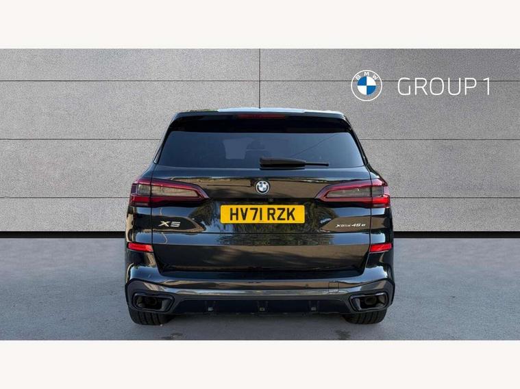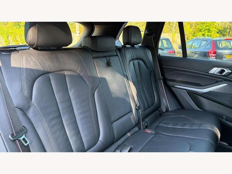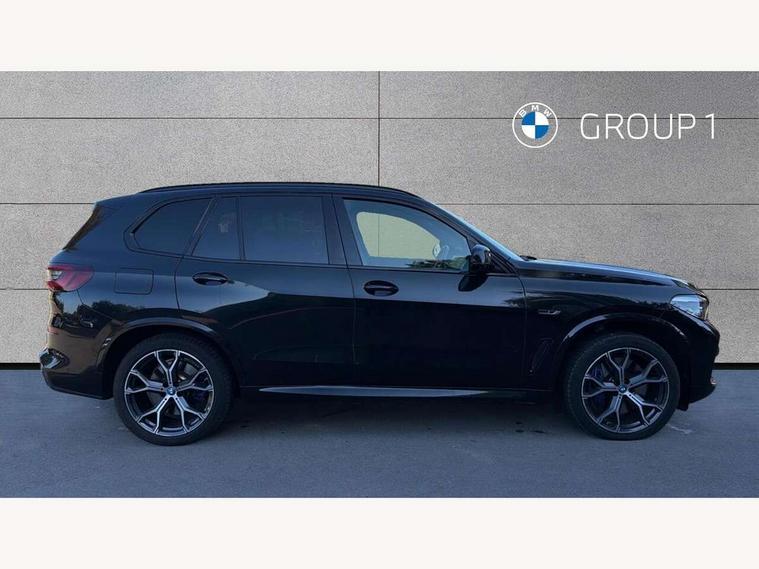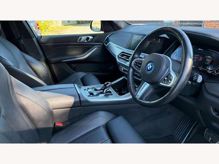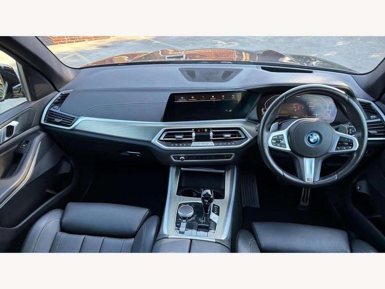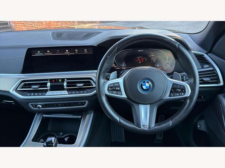 20GB hard disc drive (HDD) memory, Active guard plus, Attentiveness assist, Automatic tailgate with top hinged section open and manual bottom hinged section, BMW ConnectedDrive online services, BMW digital live cockpit professional - 12.3" digital instrument panel and 12.3" CID, with touch/voice command, BMW legal emergency call, BMW Teleservices, Brake force display, Brake pad wear indicator warning light, Cruise control with brake assist, eDrive button to select between AUTO eDrive, MAX eDrive and SAVE Battery settings, Front/rear park distance control, Lights on warning, Oil sensor for level and grade, On board computer inc. average speed, fuel consumption, liquid crystal Info display, journey computer, outside temperature display, personal profile, Service interval indicator, Speed limit info display, Speed limiting function, 5 metre AC Fast charge cable, Adaptive 2-axle air suspension, Double VANOS, Double wishbone front axle, Drive performance control with ECO PRO comfort + sport mode, eDrive exterior sound, Eight speed steptronic sport automatic transmission and gearshift paddles on the steering wheel, High precision injection, Petrol Particulate Filter, Safety battery terminal clamp, Standard Charging cable (Mode 2) for home socket, Twin scroll turbocharger with Valvetronic, DAB Tuner enables digital radio reception, Favourite buttons, USB connection, USB type A 1.5A in cupholder, USB Type C 3A in centre armrest, Active Air Stream kidney grille with high-gloss chrome, Adaptive air flap control bar in high-gloss black, Automatically dimming rear view mirror, BMW Individual high gloss black shadow line roof rails, Body colour bumpers, Body colour door handles, Dynamic brake lights with LED technology, Exhaust tailpipes - single, left and right with Chrome finisher, Follow me home headlight function, Front and rear electric windows with open and close fingertip control, anti trap facility and comfort closing, Heated windscreen washer jets, High beam assistant, High gloss black outer and central air intakes on front bumper with pearlescent chrome finish, High gloss black Side elements, LED daytime running lights, LED rear lights, Left charging flap on the front side, M aerodynamic body styling, M designation on left and right front side panels, Pearlescent chrome front grille bars, Rain sensor with automatic headlight activation and windscreen wiper control, Rear side wing doors, Satin aluminium side window graphic, Third brake light in rear spoiler, Variable intermittent rear wash/wipe, Welcome light carpet, X5 on left tailgate, xDrive designation on right tailgate, 12V - Power sockets with 2x centre console and 1x luggage compartment, 3 seat bench in 2nd row, 40:20:40 split folding rear seats, Ambient interior lighting with 6 pre-designed selectable lights including dynamic function, Centre and rear interior light, Child seat ISOFIX attachment with rear outer seats includes top tether, Compartment in front of cupholder, Electric front seat adjustment with driver and front passenger memory function, Electrical steering column with adjustable height and length with activation and control on the steering column, Foldable rear centre armrest with 2 cupholders and storage compartment, Front and rear cupholders x 2, Front and rear door pockets, Front and rear door sill inlays with illuminated BMW M designation, Front and rear side armrest integrated into door trim, Front footwell lights, Front reading lights, Light inside glove compartment, Lockable glove compartment, Luggage compartment floor panel with integral storage tray, Luggage compartment lighting, M leather steering wheel, M specific key, M specific pedals, M specific steering wheel, M specific velour floor mats, Make-up mirror lights, Multifunction controls for leather steering wheel, Multifunctional hooks, Rear head restraints, Seat back with flap pocket, Securing rings in luggage compartment, Storage bins on all doors, Storage tray and compartment with cover in centre console, Sunvisors with illuminated vanity mirrors, Toolkit located in luggage compartment, Connected Package Professional - X5 xDrive45e, Expanded exterior mirror pack - X5/X5 M, Non-smokers pack - X5, Airbags - driver/front passenger, rear and side, first and second row seats head airbags, front passenger seat airbag deactivation + knee airbag, Anti-lock braking system (ABS), Automatic Stability Control (ASC), Brake drying, Brake energy regeneration, Brake fade compensation, Braking pre-tensioning, Child proof locking system in rear door, Cornering brake control (CBC), Crash sensor activating central locking release, hazard warning lights, fuel cut off, interior lighting + activation of safety battery terminal clamp, Deformation zones - front and rear with door reinforcements and bumpers up to 2.5 mph, DSC - Dynamic Stability Control, Dynamic brake control, Dynamic Traction Control - DTC, Electromechanical parking brake with automatic drive away release and auto hold function, Electronic brake force distribution, Front and rear seatbelts with seatbelt stopper, seatbelt tensioner for front and outer rear seats and belt force limiter, Front head restraints with anti-whiplash, Height adjustable front seatbelts, Hill start assistant, Integrated brake system, M Sport braking system in blue high gloss + blue painted brake calipers with M designation, Mechanical child proof lock on rear doors, Passive protection for pedestrians, Seat occupancy detection for driver and passenger side, Side impact protection, Three 3 point inertia reel seatbelts, Two tone horn, Tyre pressure monitoring system, Ventilated front and rear disc brakes, Warning triangle and first aid kit, Closing system with central locking, Driver and front passenger door centre lock switch, Locking wheel bolts, Thatcham 1 alarm system with remote control and engine immobiliser, Start/stop toggle diamond shaped trim finisher in pearl chrome,