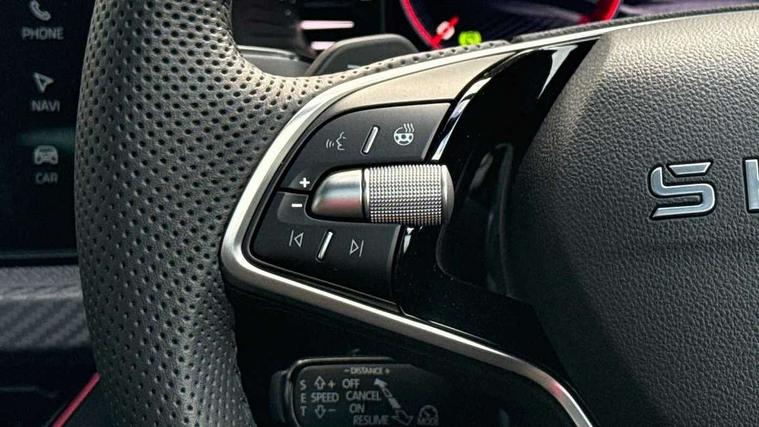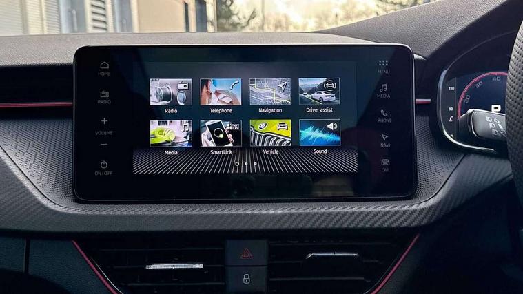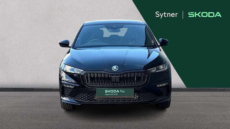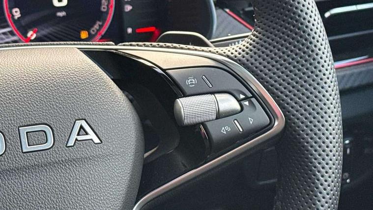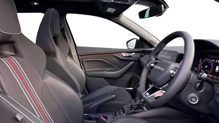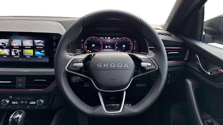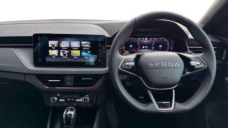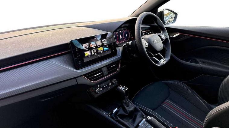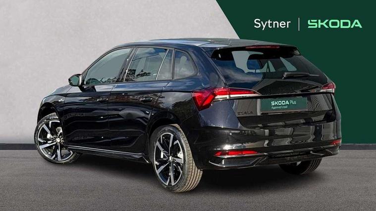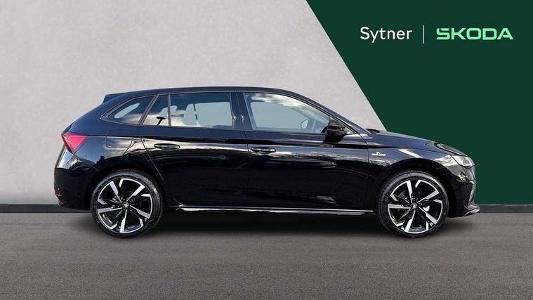 Advanced driver attention and drowsiness monitor, Bluetooth, e-Call (emergency call), Front assist system, PAS, Rear parking sensors, Rear view camera, Speed limiter, Tailgate, Traffic sign recognition, Virtual Cockpit - 10.25" digital display, Voice control system, Wireless smartlink, Drive mode select with Sport Chassis Control and ECO mode, 4 USB C ports, 8 Speakers, 9.2" Skoda navigation display, DAB radio, Auto dimming rear view mirror, Automatic headlight control with manual coming and leaving home feature, Automatic intermittent wipers, Black door mirrors, Black lettering on boot lid, Black radiator grille, Black rear diffuser, Black roof spoiler, Black window frames, Body colour bumpers, Body colour door handles, Extended tailgate glass, Front and rear electric windows, Heated rear window, LED 3rd brake light, LED daytime running lights, LED high beam, LED low beam, Light sensors, Monte carlo plaque, Panoramic glass roof, Privacy glass, Rear LED fog light, Rear side wing doors, Rear wiper, Tinted windows, Unique dark chrome design logo on alloy wheels, 12V socket in luggage compartment, 3 seat bench in 2nd row, Aluminium pedals, Ambient lighting in white/red, Black / White armrest stitching, Black roof headlining, Cargo elements, Chrome inner door handles, Door inserts in art.leather carbon, Driver and passenger sun visors with vanity mirror, Dual zone climate control, Front and rear roof lights, Front centre armrest, Front head restraints, Height adjustable driver seat, Height adjustable passenger seat, Ice scraper, Illuminated glove compartment, Inner circulation control with pollen filter, ISOFIX for front passenger seat, Isofix preparation for back seats, Leather gearknob and handbrake lever, Luggage net under rear parcel shelf, Manual lumbar support for front seats, Monte Carlo cloth upholstery, Net package and top tether hooks in boot space, Pocket on the back of both front seats, incl. mobile phone pockets, Rear centre armrest, Red hotstamping, Single front passenger seat, Skoda lettering on steering wheel, Sport seats, Textile floor mats, Third rear headrest, Ticket holder, Top tether for front passenger seat, Umbrella in driver's door, Light and view plus pack - Scala, 3x3 point rear seatbelts, ABS, Child locks, Curtain airbags and front side airbags, Disc brakes, Driver and front passenger airbags, ESP, Hill hold control, Manual leather parking brake, One tone horn, Passenger airbag switch off function, Seatbelt reminder for driver and front passenger, Tyre pressure monitoring system, Anti theft alarm system with interior monitoring, backup horn and towing protection, Anti-theft wheel bolts, Remote central locking with 2 remote folding keys, SAFE function for remote central locking, Carbon effect decorative inserts, 18" Ursa black diamond cut alloy wheels,