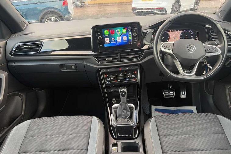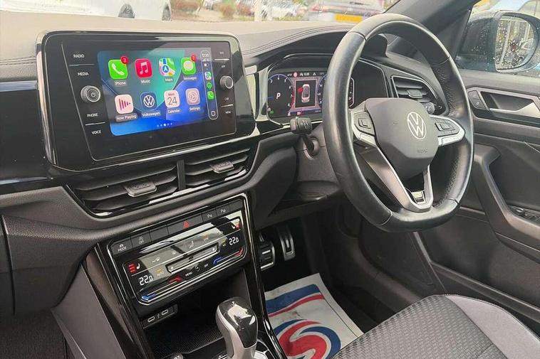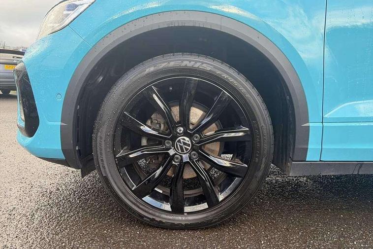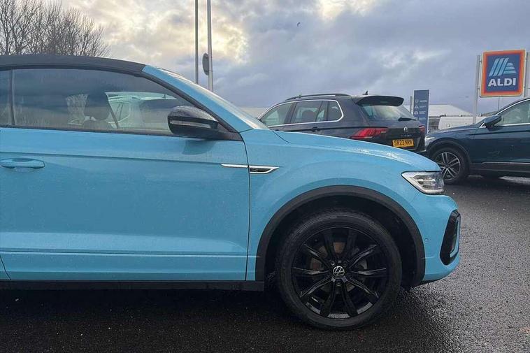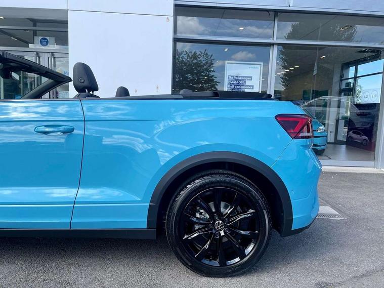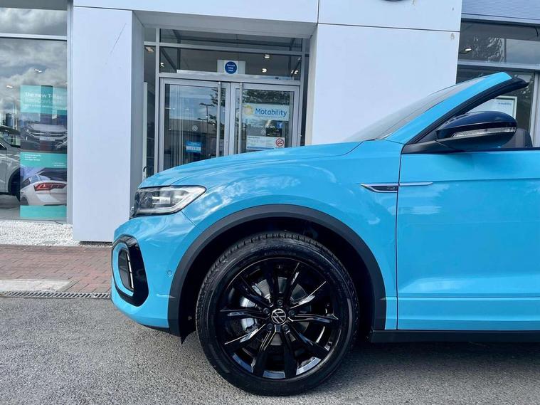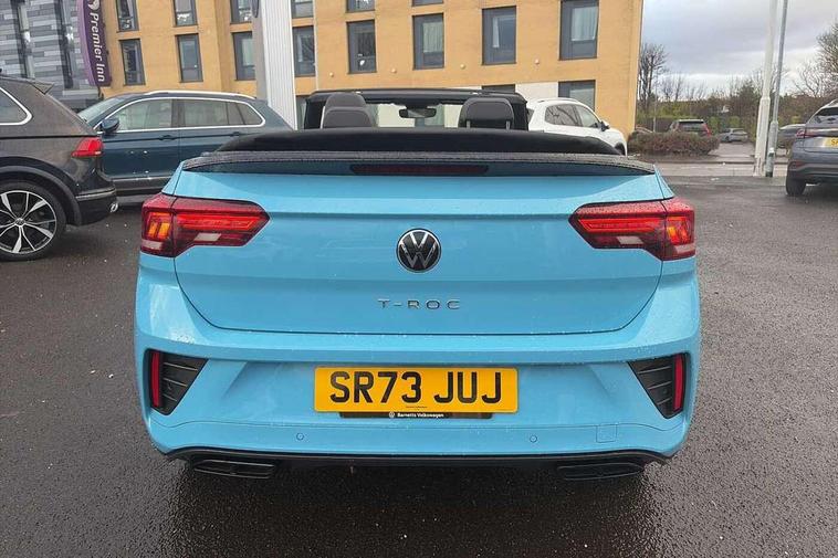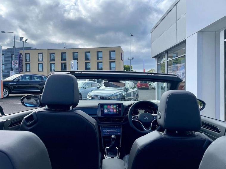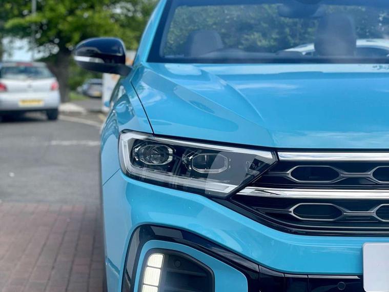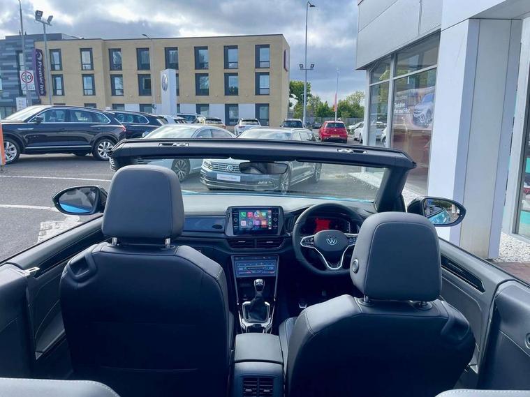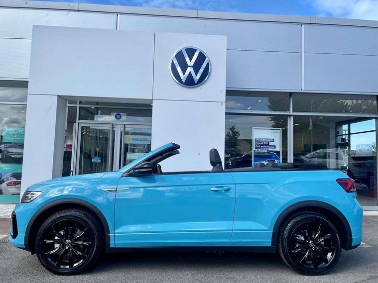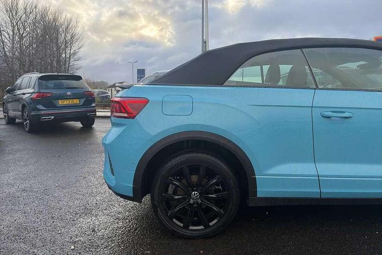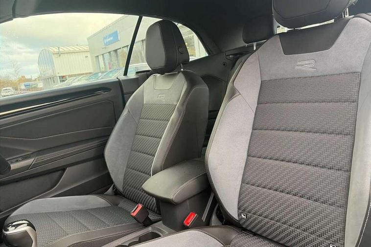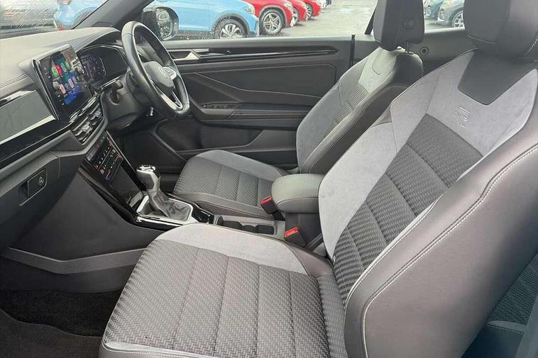 Adaptive cruise control and speed limiter, Advanced driver attention and drowsiness monitor, Bluetooth mobile phone interface, Brake pad wear indicator, Car information display, Digital Cockpit Pro with 10.25" Display, Driver tips and journey analysis, Emergency call service, Modified key software - reduce switch off time for key status change to Long no motion, Multifunction computer with visual gear change recommendation for fuel consumption, Multifunction front facing camera, Online services, Park assist including front and rear parking sensors, Speedo and rev counter, electronic odometer, trip, service interval display and exterior temperature gauge, Start/stop system with brake energy recovery, Tailgate/trunk lid release from outside, Warning sound and light for front seatbelts unfastened, Diversity antenna for FM reception, Music playback - MP3, WMA and AAC files, SMS functionality - read, compose and send SMS messages using touch-screen display, Title and cover art display, USB-C Interface and USB charging socket, We Connect and We Connect Plus functionality, Ambient lighting with logo projection, Auto dimming interior rear view mirror, Automatic hazard lights activation under emergency braking, Automatic headlight control with LED separate daytime running lights with coming/leaving home function, Black roof, Body colour door handles, Body colour rear spoiler, Chrome effect left and right trapezoid exhaust tailpipe fascia surround, Chrome trim on upper and lower radiator grille, Dark red rear combination lamps in LED technology, Dusk sensor, Exterior mirrors aspherical on driver side, convex on front passenger side, Heat insulating glass windscreen, High level 3rd brake light, LED rear number plate lights, Power operated canvas convertible top, Power windows with comfort operation and circuit breaker, R-Line design body coloured bumpers, Rain sensor, Rear boot, Rear exhaust tailpipe, Rear fog light on one side and reversing lights on both sides, Remote electrically foldable door mirrors, puddle lights and reverse activated passenger door mirror, Volkswagen roundel, Windscreen wiper with intermittent wipe light, Without exterior ambient lighting, 12V socket in centre console storage area, 2 LED front reading lights, 2 seat bench in 2nd row, 50:50 Split folding rear seat backrests with fixed rear seat bench, Air care climatronic air conditoning system with active combination filter and 2-zone temperature control, Black door lower parts with chrome trim, Chrome plated surround to light, mirror and window switch, Door and side trim panel with leatherette insert, Easy entry backrest release, Front and rear carpet mats with black stitching, Front centre armrest, Front cupholders x 2, Front door pockets, Front seat back storage pockets, Front sports comfort seats with manual height adjustment, Heated leather wrapped multi function sports steering wheel with tiptronic, Height/reach adjust steering wheel, Inserts of front seats and outer rear seats in ArtVelours titan black, Instrument lighting, white adjustable panel illumination, Interior light delay, Interior light in footwell, Interior lighting with switch off delay and contact switches on all doors, Interior white ambient lighting and surround lighting, Isofix child seat preparation, Lockable glove compartment with light, Luggage compartment lighting, Power adjustable lumbar support in front, Rear head restraints, Single front passenger seat, Stainless steel pedals, Sun visors with illuminated vanity mirrors, Unique R Line door sill protectors, Driver assistance pack without proactive passenger protection - T-Roc Cabriolet DSG, Sports pack - T-Roc cabriolet, 2 x 3-point seatbelts/outer rear seats with ECE label, Driver and front passenger airbag with front passenger airbag deactivation, Driver and front passenger safety-optimised head restraints, Drivers seatbelt reminder, Electronic parking brake, Electronic Stability Control (ESC) including ABS, ASR and EDL, Front and rear disc brakes, Front assist with autonomous emergency braking, Pedestrian monitoring, Predictive pedestrian protection, Rigid safety cell with front and rear crumple zones, Side airbag/thorax airbag system, for front passengers, Three point height adjust front seatbelts + pretensioners, Two tone horn, Tyre pressure loss indicator, Volkswagen roadside assistance, Anti-theft alarm system with interior protection and central locking system with SAFELOCK, radio remote control and 2 remote control folding keys, Electronic engine immobiliser, Trims for alloy wheels,