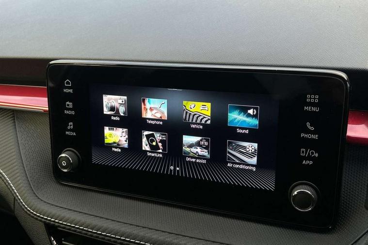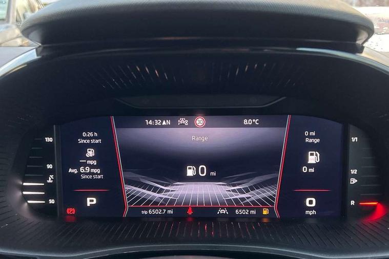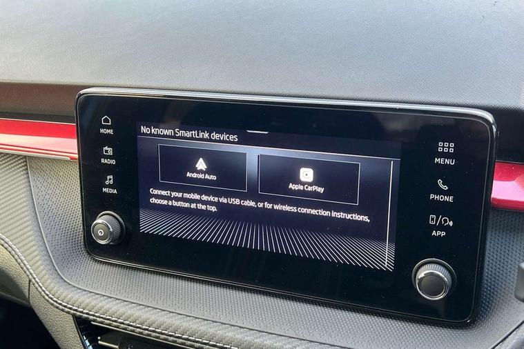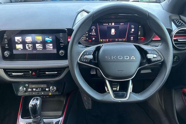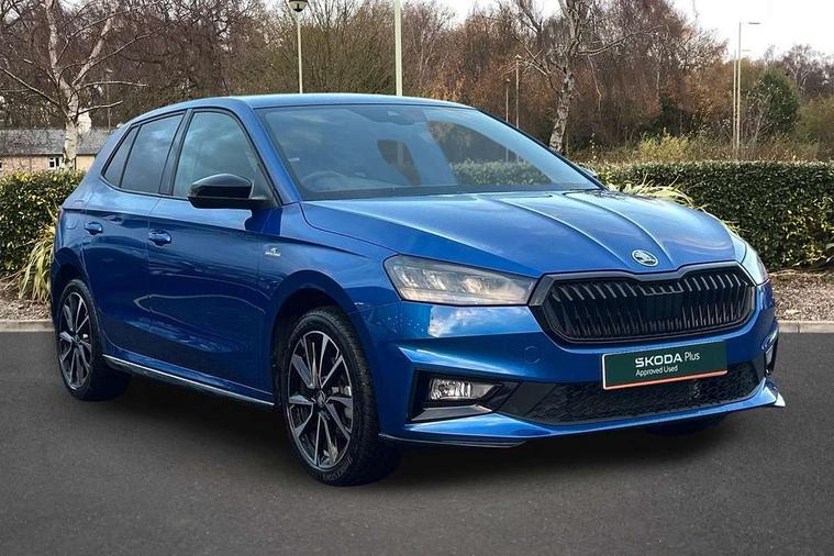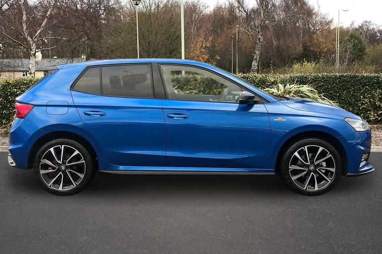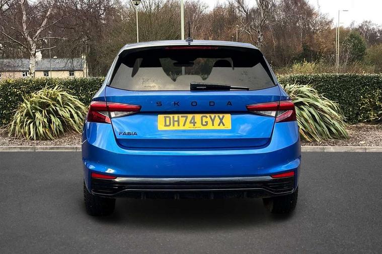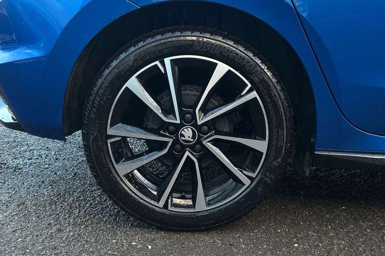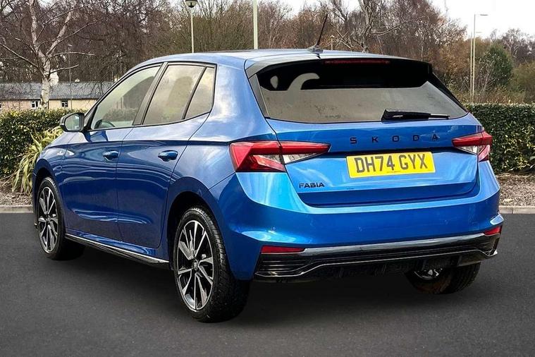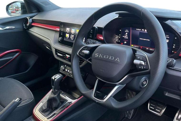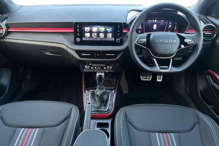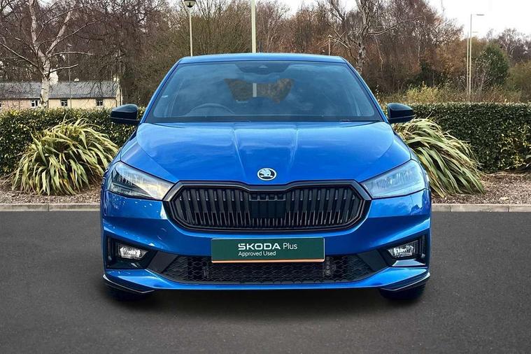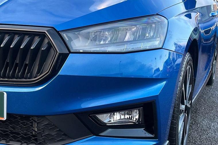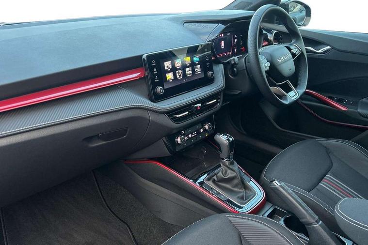 Advanced driver attention and drowsiness monitor, Bluetooth connection, Electromechanical power steering, Exterior temperature gauge, Service interval indicator, Traffic sign recognition, Virtual cockpit with 10.25" colour display, Wireless SmartLink for Apple CarPlay and Android Auto, 6 Speakers (4 in front and 2 in rear), Auxiliary socket for external MP3 player, DAB digital radio reception, Auto dimming rear view mirror, Black radiator grille, Body coloured bumpers, Door mirror integrated indicators, Front and rear electric windows, Front window wiper intermittent control, Headlight range control - Automatic, Ice scraper in fuel cap, LED daytime running lights with coming and leaving home feature, LED rear lights, Monte Carlo badging, Privacy glass, Rear LED fog light, Rear side wing doors, Rear window wiper with washing nozzles, Roof mounted spoiler, SKODA tailgate lettering in black, Sports bumpers, Third brake light, 2 reading lights in front and 2 reading lights in rear, 3 rear headrests, Aluminium pedals, Backrest split and folding, Black headlining, Central console with removable cup holder and storage box, Chrome handbrake release button, Door sills with fabia badging, Dual zone air conditioning with climatronic electronic control, Fabric/artificial leather upholstery, Front centre armrest, Front sports seats, Gearshift knob/handle in leather, Hand brake lever handle in leather, Height adjustable front headrests, Height adjustable front seats, Height adjustable steering wheel, ISOFIX and TopTether anchorage points to the outer rear seats, ISOFIX and TopTether on the front passenger seat, Luggage compartment lighting, Manually adjustable lumbar support in front seats, Metallic painted red central console cover, Metallic red interior door handles, Pollen filter, Rear seat bench unsplit, Single front passenger seat, Sun visors with mirror and airbag label on passenger side, Textile floor mats, Ticket holder, Umbrella in drivers door, 3-point height adjustable front seats belts with pretensioner and force limiter, Automatic warning lights in case of crash, Driver and passengers airbag with switch off function, e-Call+, ESC including ABS, MSR, ASR, EDS, HBA and XDS, Front and rear seat belt warning, FRONT ASSIST (AEB City and AEB Inter Urban), Front side airbags, Head airbags, Hill hold control, One tone horn, Pedestrian protection, Three rear 3-points safety seat belts with pretensioner and force limiter including stop function for outer rear seat belts, Tyre pressure monitoring system, Anti-theft alarm system including immobiliser, interior monitoring, backup horn, and towing protection, Central locking with radio remote control, interior controls, SAFE function and 2 foldable keys, Carbon effect door and side trim panels, Carbon effect lower decorative trim with white stitching, Monte carlo air vents, Red metallic upper decorative trim, Anti-theft wheel bolts protection, Super-low rolling resistance tyres,