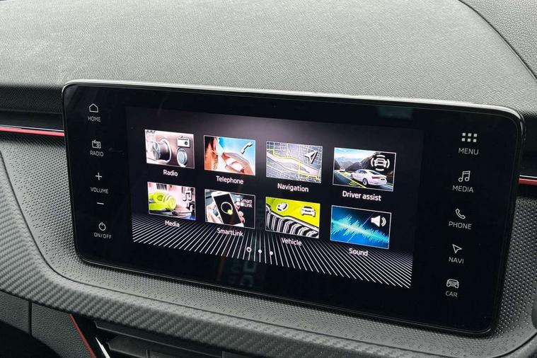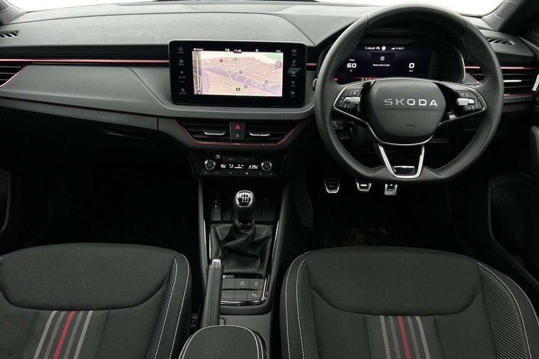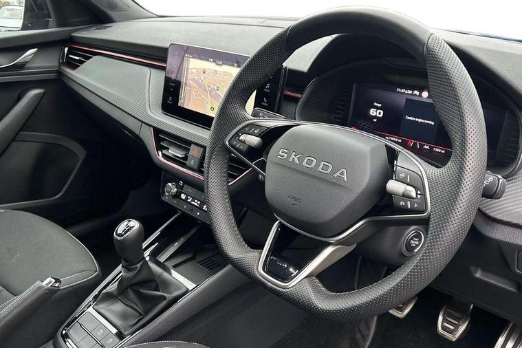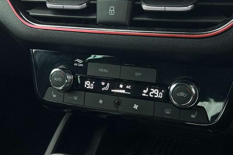 Advanced driver attention and drowsiness monitor, Bluetooth system, E-call, Front assist system, PAS, Rear parking sensors, Rear view camera, Service indicator, Speed limiter, Traffic sign recognition, Virtual cockpit with 10.25" display, Voice control system, Wireless smartlink, 4 USB C ports, 8 Speakers, 9.2" Skoda navigation display, DAB Digital radio, Auto dimming rear view mirror, Automatic headlight control with coming home and leaving home feature, Black door mirrors, Black radiator grille, Black rear diffuser, Black roof spoiler, Body colour bumpers, Body colour door handles, Boot lettering in black, Extended tailgate glass, Fixed panoramic sunroof with black roof rails, Front and rear electric windows, Heated rear window, LED daytime running lights, LED high beam, LED low beam, LED third brake light, Light sensors, Monte carlo plaque, Privacy glass, Rear side wing doors, Rear wiper, Ticket holder inside windscreen, 12V socket in luggage compartment, 3 seat bench in 2nd row, Aluminium pedals, Ambient lighting in white/red, Art leather carbon decor inserts, Art leather carbon door inserts, Black roof lining, Cargo elements, Chrome inner door handles, Driver and passenger sun visors with vanity mirror, Dual zone climate control, Front and rear roof lights, Front centre armrest, Front head restraints, Glove compartment with illumination, Height adjustable driver seat, Height adjustable front passenger seat, Ice scraper, Inner circulation control with pollen filter, ISOFIX on front passenger seat, Isofix preparation for back seats, Leather gearknob and handbrake lever, Manual lumbar support for front seats, Monte Carlo cloth upholstery, Net package and top tether hooks in boot space, Net under rear shelf, Pocket on the back of both front seats include mobile phone pockets, Rake/reach adjustable steering wheel, Reading lights, Rear centre armrests, Red hotstamping, Single front passenger seat, Sports seats, Textile floor mats, Third rear headrest, Top tether for front passenger seat, Umbrella in driver's door, Light and view plus package - Kamiq, 3x3 point rear seatbelts, Airbags - driver and front passenger, Disc brakes, ESP, Extended and predictive pedestrian/cyclist protection, Front passenger airbag deactivation switch, Front side airbags with curtain airbags, Hill hold control, Manual leather parking brake, Manual rear child locks, One tone horn, Seatbelt reminder for driver an co-driver, Traction control, Tyre pressure monitor, Anti-theft alarm system with interior monitoring, backup horn, towing protection and remote central locking with SAFE system, Anti-theft wheel bolts, Electronic engine immobilizer, 18" Ursa black diamond cut alloy wheels,