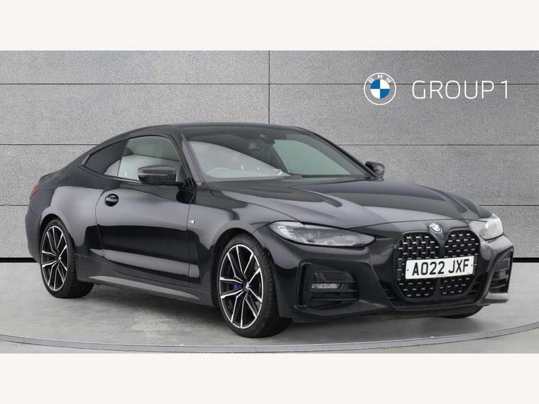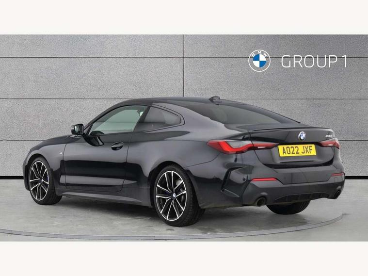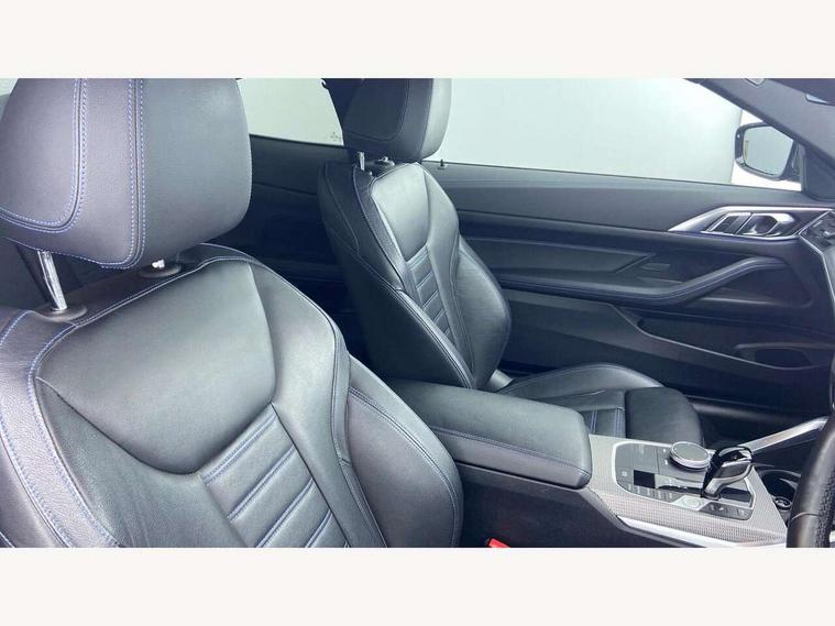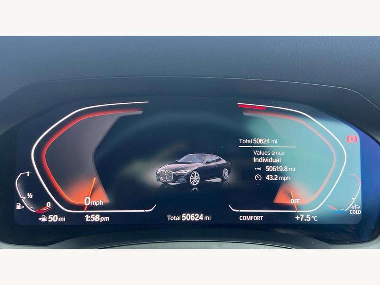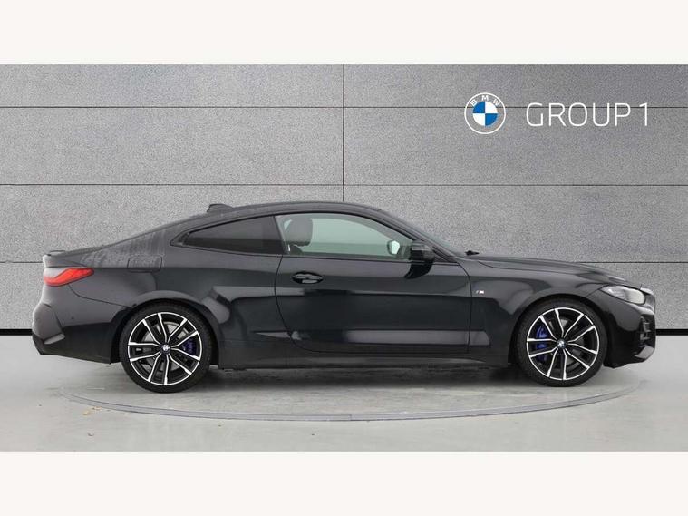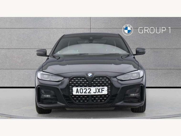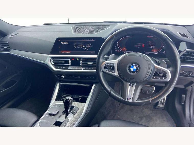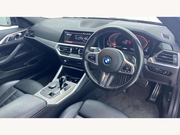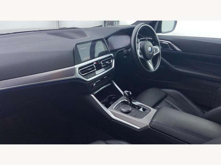 Active guard plus, Attentiveness assist, Auto start-stop, BMW ConnectedDrive online services, BMW iDrive controller on centre console, BMW Live Cockpit Professional Nav with 12.3" instrument display + 10.25" display, Intelligent Voice Assist, BMW OS 7, HDD, 2USB, 4G LTE connect, BMW service history, BMW Teleservices, Brake pad wear indicator in front and rear, Check Control warning system for monitoring of lights and door/luggage compartment open warning, Condition based service, Cruise control with brake assist, Electric power steering with Servotronic steering optimised at all speed ranges, Gearshift time display in manual mode, Instrument cluster with speedometer with mph readout, tachometer, fuel gauge and oil temperature gauge, Integrated owners handbook, Oil sensor for level and grade, warning by check control system, On board computer - average speed, fuel consumption, outside temp display with acoustic warning, clock/date, service interval, odometer/trip meter, Optimum shift indicator, Touch control functionality for BMW Live Cockpit Professional Nav, Variable sport steering, 8 speed automatic steptronic transmission with gearshift paddles, Balanced 50/50 weight distribution, Double VANOS, Driving experience modes - Comfort, ECO PRO, Sport and Sport+ mode, High precision injection, Low centre of gravity, M sport suspension, Petrol Particulate Filter, Stroke dependent dampers, VALVETRONIC engine management, DAB tuner, Electronic service booklet, 3rd brake light, Acoustic glazing, Automatic headlight beam throw control with load dependent regulating reaction, dynamic compensation of braking dive and acceleration squat, Automatic windscreen wipers and automatic headlight, Automatically dimming electrochromatic rear view mirror, BMW emblem on engine compartment lid and tailgate, BMW kidney grille with mesh grille front side of the nuggets in matt aluminium and frame in chrome high gloss, Body colour fuel filler flap, Body colour M sport rear spoiler, Body colour roof fin, Brushed aluminium inserts in the front door sill finishers with BMW designation, Dynamic brake lights, Electric windows - front and rear, with open/close fingertip control, anti trap facility and comfort closing function all round, Exhaust tailpipe - split left and right, Exterior mirrors - electrically folding with anti-dazzle, Fading support, Front and rear bumper system, Front apron plastic in body colour, Green tinted heat protection glazing, High gloss shadow line exterior trim, Illuminated bow type door handles in body colour drivers side with door lock, Interior rear view electrochromatic mirror with automatic anti dazzle function, LED daytime running lights, LED front fog lights, Licence plate panel integrated into front bumper and tailgate, Lightweight engineering, M designation on front side panels, left and right, Model designation on right side of tailgate, One piece front bumper cover including towing eye cover in body colour, Preparation for high beam assistant, Rear boot, Side frame decorative moulding black matt, Two part LED tailights in L-shape with components in smoked glass, brake light, LED turn indicator and rear fog light, Visible VIN plate, Welcome lights in interior and door handle area, Widened track and increased camber values for max transverse dynamics, agility and steering precision, Window recess cover black high gloss, Windscreen wipers with integrated heated washing jets, 12V power socket in front centre console, 2 front cupholder in centre console with clamping elements and matt black inlay, 2 Rear seat headrests, 2 seat bench in second row, 3 spoke M sport leather multifunction steering wheel, 3 zone automatic air conditioning, 4 pieces lashing eyelets in luggage compartment, 40:20:40 split folding rear seat and rear centre armrest with two cupholders, Ambient lighting with welcome carpet light, Anthracite headlining, Armrest integrated in front and rear door trim + front centre console armrest, Four grab handles integrated in roof lining, Front and rear door exit lighting (left / right), Front and rear door pockets, Front and rear footwell lights, Front and rear reading lights, Front headrests, Front passenger seat, Front seat backrest width adjustment, Front sport seats, Heated driver and front passenger seats, Height adjustable mechanically and infinitely variable steering column, Illuminated armrest storage compartment, Illuminated glove compartment with separate small compartment, Luggage compartment light, Make-up mirror lights, Storage compartment in rear centre console, Sunvisors with vanity mirrors and ticket pocket, Toolkit located in luggage compartment, USB type - C cable charging function in the rear centre console, Velour front floor mats, Vernasca leather upholstery, Connected professional package - 4 Series, M sport exterior styling pack - 4 Series, Park assist pack - 4 Series, 2 x 3-point rear seatbelts, Battery safety cut-off, BMW emergency call, Brake energy regeneration, Braking pre-tensioning, Child seat ISOFIX attachment for the two outer rear seats, Coasting in idle in ECO PRO mode, Cornering brake control (CBC), Crash sensor activating of airbags, Unlocking doors, hazard warning lights, interior light, safety battery terminal, Driver and front passenger side airbags, integrated in the door side seat backrest bolsters for all seat variants, Driver/Front Passenger airbags, Dry braking, Dynamic brake control, Dynamic stability control + (DSC+) - Anti-lock Braking System (ABS) with brake assist and cornering brake control + Automatic Stability Control (ASC), Dynamic Traction Control - DTC, Electric parking brake including automatic hold function and automatic release of the parking brake when driving off, Electronic differential lock control (EDLC), Front and rear ventilated brake disc, Front passenger manual airbag deactivation, Head airbags for all 4 outer seats, Hill start assistant, Seat belt security check for driver and front passenger, Seat belt with belt