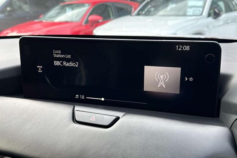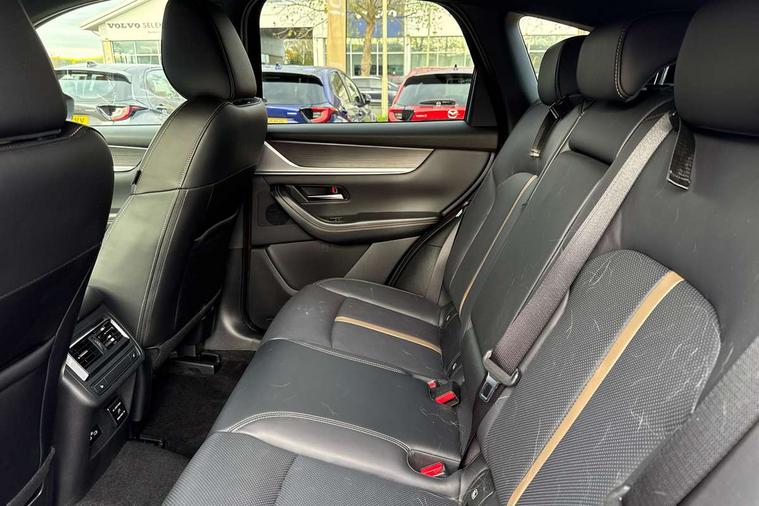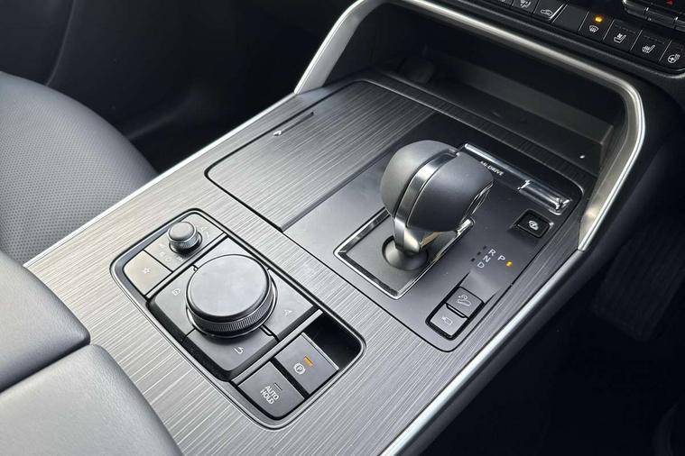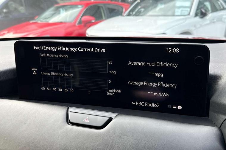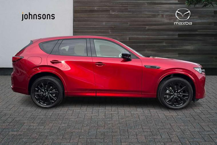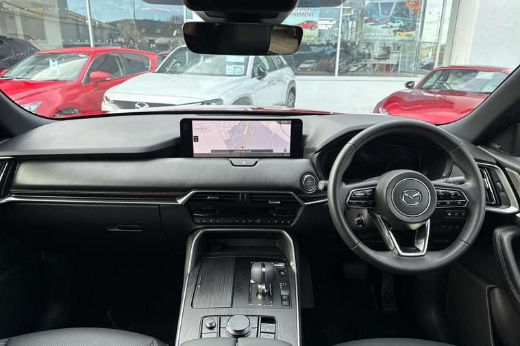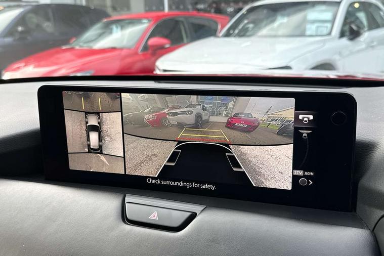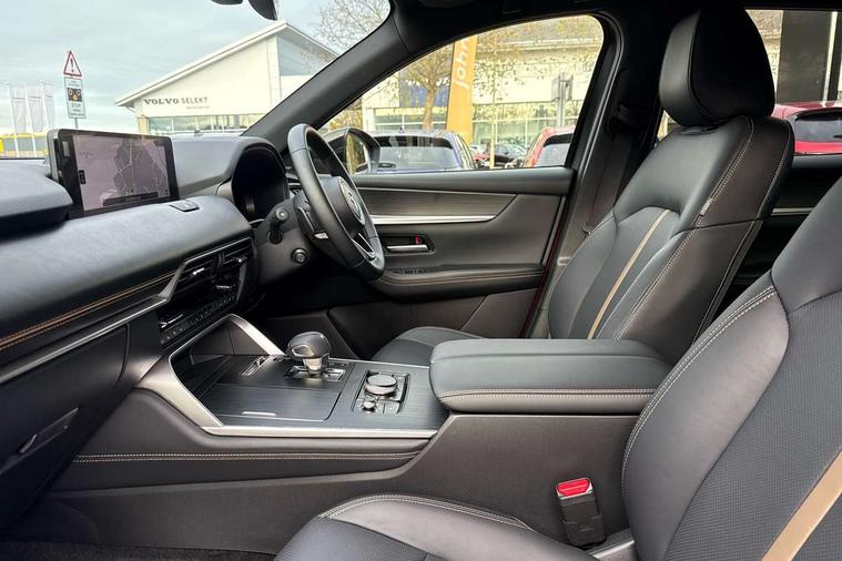 Emergency lane keeping with blind spot assist, Low washer fluid warning light, 12.3" Colour entertainment centre display with mazda connect infotainment, 12.3" TFT Colour display, Adjustable speed limiter, Blind spot assist, Blind spot monitoring with rear cross traffic alert, Cruise control, Distance alert system, Driver attention alert system, Driver Monitoring with personal identification, E-call with GPS, Emergency stop signalling system, Exit warning function, Front and rear parking sensors, Ingress / Egress support and automatic driver position guide, Integrated bluetooth, Intelligent speed assist, Kinematic posture control, Lane keep assist system (LAS) with Lane departure warning system (LDWS), Mazda Driver Personalisation System, Mazda hybrid navigation system with european mapping, Multimedia Commander, PAS, Power lift gate with handsfree function, Power start/stop button, Reversing camera with static guide lines, Speed alert, Traffic sign recognition enhanced with mandated excessive speed warning, Trip computer, Windscreen projected colour active driving display, Wireless apple car play/android Auto, Type 2 Mode 2 cable for AC charging via UK 3-pin plug, 7.2 kw On board Charger, Mi-Drive (Normal, Sport, Off-road, Towing and EV mode), Paddle shift, Type 2 Mode 3 cable for AC charging via home or public charge points, AM/FM and DAB radio, Bose surround sound system with 12 Speaker, Bose center point, Bass match and audio pilot technology, Steering wheel mounted audio/bluetooth controls, USB-C inputs (x2 front and x2 rear), Auto dimming driver's door mirror, Automatic headlight levelling, B-pillar and C-pillar garnishes in gloss black finish, Body colour roof spoiler, Body coloured bumpers, Body coloured lower bumper, wheel arch and side mouldings, Coming/leaving home lighting function, Dark plated headlight lense, Dark plating finish signature wing in front grille, Dark plating front side garnish, Differentiated front bumper design to accentuate the intake, Dusk sensing headlights, Electric front/rear windows with one touch auto up/down, Electrically adjustable, heated auto power folding door mirrors with memory, Frameless auto dimming interior rear view mirror, Front kodo turn signal, Front wiper de-icer, Gloss black door mirrors, Headlight washers, High beam control, Honeycomb radiator grille in piano black, LED 3rd brake light, LED headlamps, LED rear signature combination lamps, Rain sensing front wipers with adjustable sensitivity and speed, Rear side wing doors, Rear wiper, Roof pillars and roof lining finished in lighter colour to soften the overall look, Signature LED daytime running lights, Silver decoration panel, 12v power outlet - front, 12V socket in boot, 3 height adjustable rear headrests, 3 seat bench in 2nd row, 40/20/40 split folding rear seats with quick levers in the boot, Ambient lighting, Cargo net, Chrome interior trim accents with steering wheel centre bezel, surround of engine start / stop button and glove box handle, Door panel trim vinyl leather with armrest, Driver and front passenger two rear grab handles with rear coat hooks, Driver and front passenger visors with covered vanity mirror and driver ticket holder, Driver seat electric tilt, slide, recline, height and lumbar adjustment, Driver, front passenger and two rear door pockets, Driver/passenger front seatback pockets, Dual zone climate control air conditioning with rear air vents, Electric telescopic and tilt adjustment steering wheel, Featuring black vinyl leather dashboard trim with titanium coloured accents, Folding rear centre armrest with two cup holders, Front centre storage with two cupholders, Front down lamp with front and rear foot lamps, Front headrests, Front passengers seat electric slide, recline, height and lumbar adjustment, Front seat ventilation with 3-stage setting, Glovebox illumination, Heated front seats with 3 stage setting, Heated leather wrapped steering wheel, Heated outer rear seats with 3-stage setting, ISOFIX child seat anchorage points attached on outer rear seats, Karakuri tonneau cover, Leather wrapped gear shift knob, LED illumination luggage compartment, Nappa leather upholstery, Practical and spacious front centre armrest storage, Rear seat recline function for rear passenger comfort, Remote fold down rear seats, Roof lining (ceiling and pillars) - Black, Roof mounted sunglasses holder, Single front passenger seat, 3 point ELR front seat belts x2 with pretensioners, 3 point ELR rear seat belts, Active bonnet, Anti-lock braking system (ABS), Drivers knee airbag, DSC - Dynamic Stability Control, Electronic parking brake with auto disengage function and auto hold function, Front and rear curtain airbags, Front dual stage driver and single stage front passenger airbags, Front passenger airbag cut-off switch, Front side airbags, Front smart city brake support, Hill decent control, Hill launch assist, Manual rear child locks, Seatbelt reminder for driver/front passenger and rear seats, Traction control, Tyre pressure monitoring system (TPMS), Remote central locking with deadlocking and automatic door lock when driving, Smart keyless entry, Thatcham accredited alarm and immobiliser, Mesh metal film centre console panel, 20" Black metallic alloy wheels, Emergency tyre repair kit,