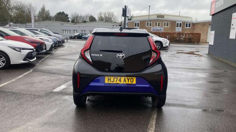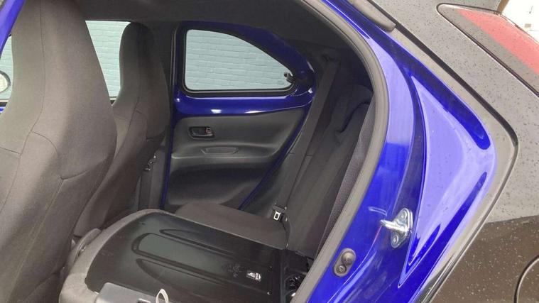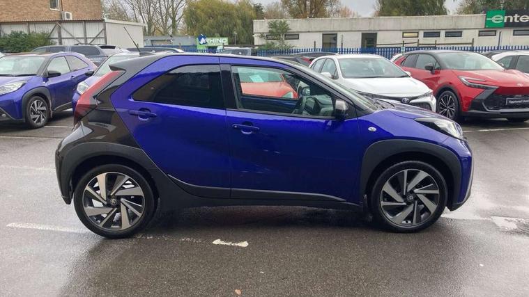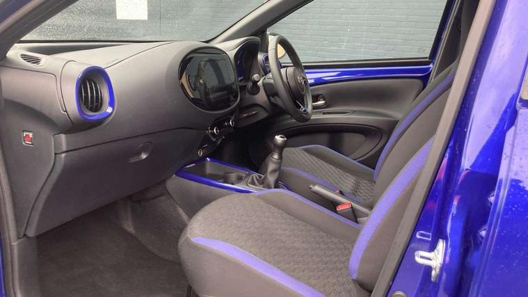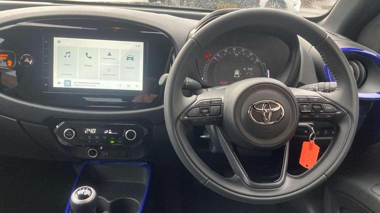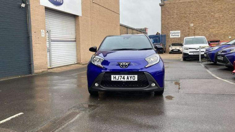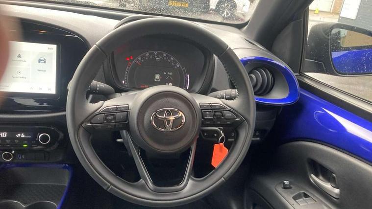 4.2" TFT colour screen, Adjustable speed limiter, Analogue speedometer, Bluetooth connectivity, Digital tachograph, Driver attention alert system, eCall emergency call system, Electric power steering, Intersection turn assist, Key reminder warning, Noise reduction kit, Pre collision system with emergency steering assist, Reversing camera with static guide lines, Smart phone integration with Apple car play/Android Auto, Speed limit display, Start and stop, Vehicle Stability Control (VSC), 4 speakers, 9" HD multimedia display touch screen with Toyota smart connect, DAB digital audio broadcast, USB connector, Auto headlights, Auto wipers, Automatic headlights cut-off, Bicycle towing hook, Black contrast roof, Black side protection mouldings, Black wheel arch mouldings, Body colour door handles, Body coloured front bumper, Boot door scuff plate, Eclipse black rear bumper, Electric heated door mirrors, Follow me home headlights, Front fog lights, Front power windows, Gloss black door mirrors, Gloss black upper front grille, Headlight cut-off reminder, LED daytime running lights, LED front light guide, LED High mounted stop lamp, Manual day/night rear view mirror, Manual headlight levelling, Pagoda roof, Power adjustable door mirrors, Power back door, Privacy glass, Projector halogen headlights, Rain sensor, Rear combination lights LED bulb type, Rear side wing doors, Rear windscreen defogger, Rear windscreen wiper, Short antenna, Variable intermittent windscreen wipers, 12v power outlet - front, 2 seat bench in 2nd row, 3 spoke leather steering wheel, 50/50 split folding rear seat, Adhesive roof headlining, Adjustable speed limiter switch on steering wheel, Audio and telephone switches on steering wheel, Auto air conditioning, Black insert on steering wheel, Black roof lining, Boot light, Centre room light, Chrome interior door handles, Chrome surround on air conditioning buttons, Clean air filter, Console box storage in body color, Fabric upholstery, Floor mats, Front and rear cup holders, Front head rest deco art, Front head restraints, Height adjustable driver seat, Intelligent adaptive cruise control switch on steering wheel, ISOFIX child restraint system on rear seats, Lane departure alert switch on steering wheel, Leather gearshift knob, Manual tilt steering wheel, Manually reclining and sliding driver seat, Manually reclining and sliding front passenger seat, Multimedia switches on steering wheel, Pollen filter, Rear door pockets, Rear head restraints, Satin silver insert on gear shift knob, Single compartment glovebox with lights, Single front passenger seat, Soft tonneau cover, Sun visors with mirror on driver and passenger side, Voice recognition switch on steering wheel, Toyota safety sense pack - Aygo X, Anti lock braking system + Electronic brake force distribution, Child safety door lock, Emergency brake light signal (EBS), Hill start assist control (HAC), Passenger airbag on/off switch, Seat belt reminder for front and rear seats, Supplement restraints system (SRS) - 6 airbags, Traction control, Tyre pressure warning system, Immobiliser, Remote power door locks, Black wheel centre caps, Tyre repair kit,