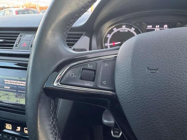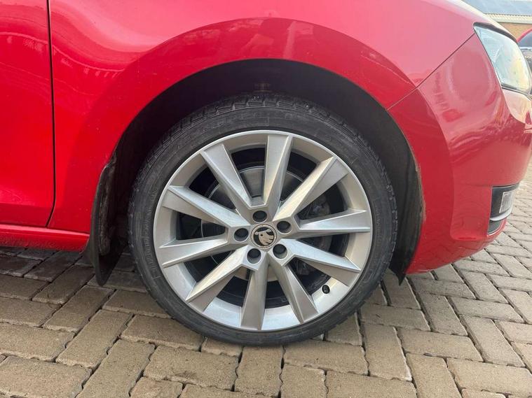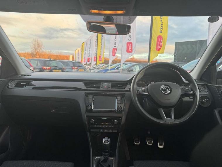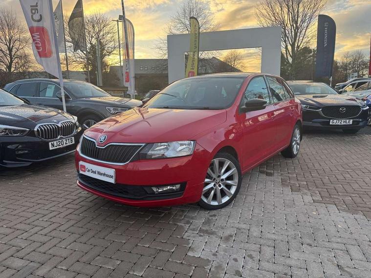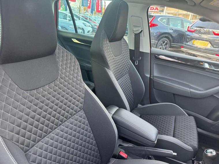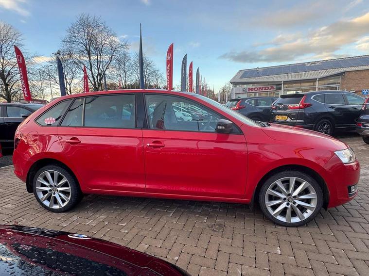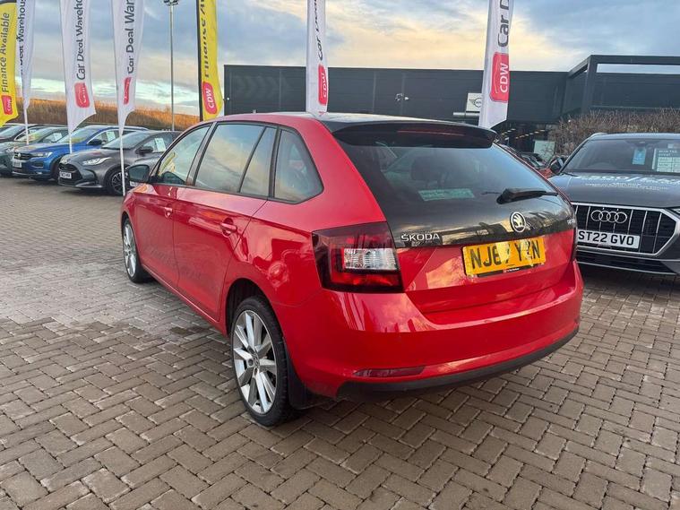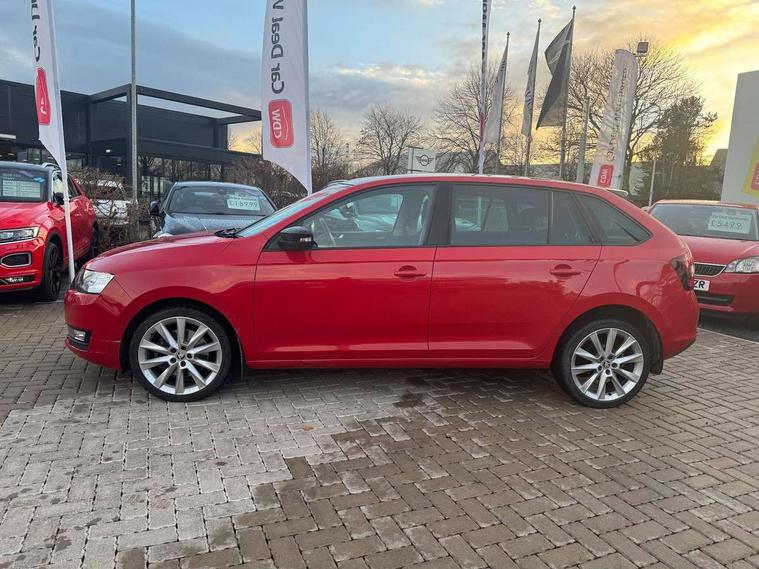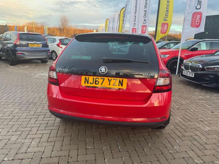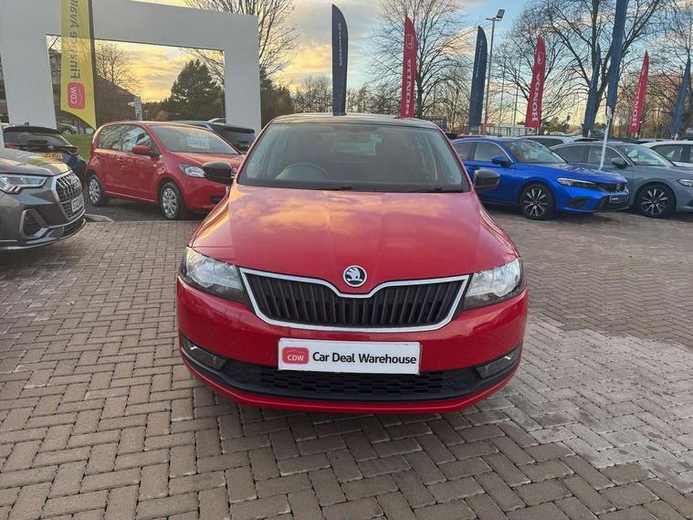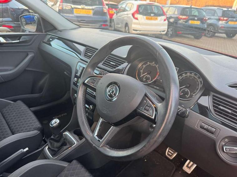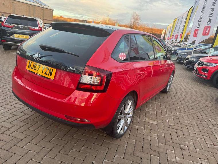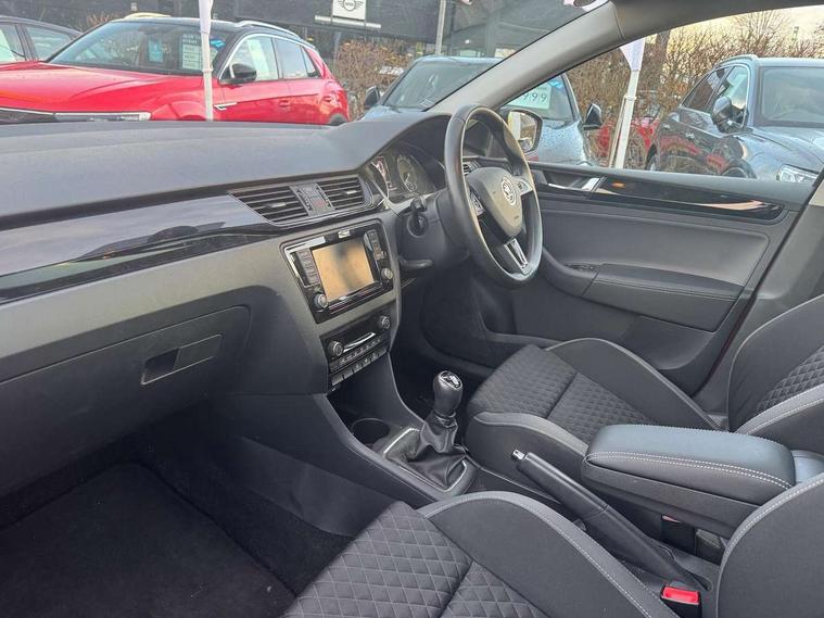 Amundsen sat nav system + DAB, Bluetooth system, Outside temperature gauge, PAS, Service indicator, Trip computer, Voice control system, 6 speakers, Aux input, Multi device interface, SD card slot, Aero wiper + intermittent function, Body colour bumpers, Body colour door handles, Cornering front fog lights, Daytime running lights, Electric front windows, Electrically adjustable and heated door mirrors, Fixed panoramic glass roof, Heated rear window, Height adjustable headlamps, Privacy glass, Radiator grille with chrome surround, Rear electric windows, Rear spoiler, Rear wash/wipe, Tinted glass, 12V Accessory socket in centre console, 3 spoke multifunction leather steering wheel + audio/phone controls, 60/40 split fold rear seat back, Centre console with storage/cupholders, Climate control air conditioning, Cloth upholstery, Driver seat height adjust, Driver's sun visor with vanity mirror, Front armrest with storage box, Front centre armrest, Front cupholders, Front seatback pockets, Glovebox, Height adjustable front headrests, Height adjustable rear head restraints, Height/reach adjust steering wheel, Interior light, Isofix child seat preparation, Leather gaiter, Leather handbrake lever, Luggage compartment lighting, Passenger sunvisor with vanity mirror, Pollen filter, Sports pedals, Sports seats, Storage compartment in rear doors, Sunglasses storage, Ticket holder, Umbrella under front passenger seat, Style pack - Rapid SE Sport, 3x3 point rear seatbelts, ABS+ASR+MSR, Curtain airbags, Driver and passenger airbags, Driver seatbelt warning indicator, ESP, Fuel cut off safety device, Hydraulic Brake Assist (HBA), Passenger airbag deactivate switch, Predictive pedestrian protection, Side airbags, Traction control, Two tone horn, Tyre pressure monitor, Alarm/immobiliser, Remote control central locking, Chrome interior trim, 17" Savio black alloy wheels,