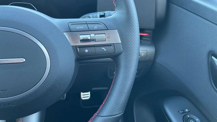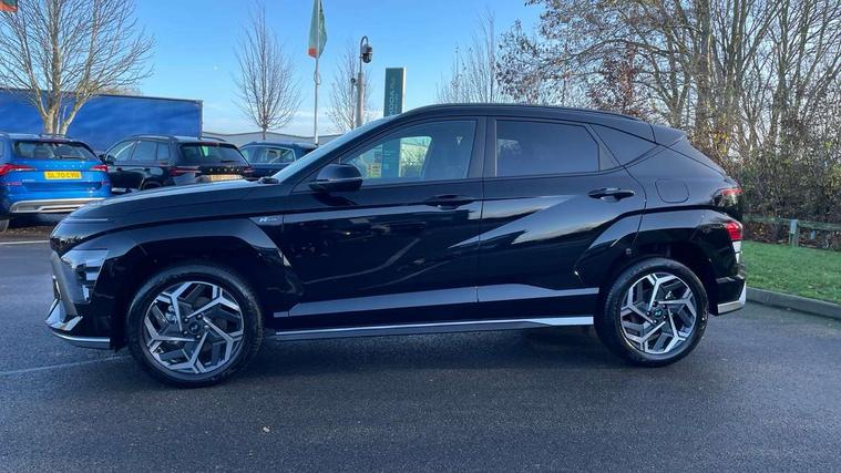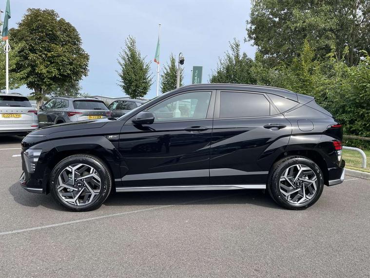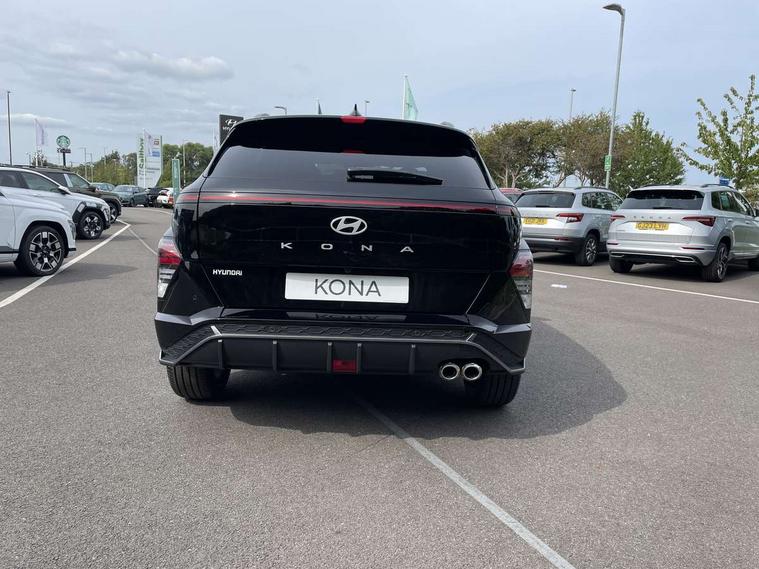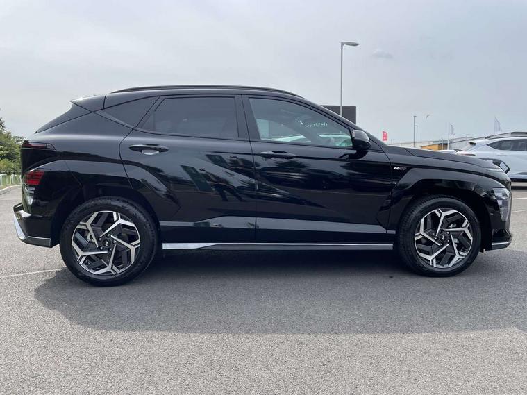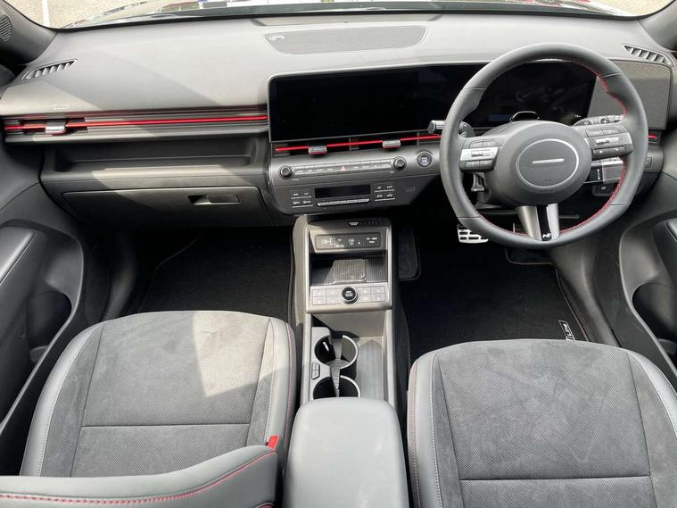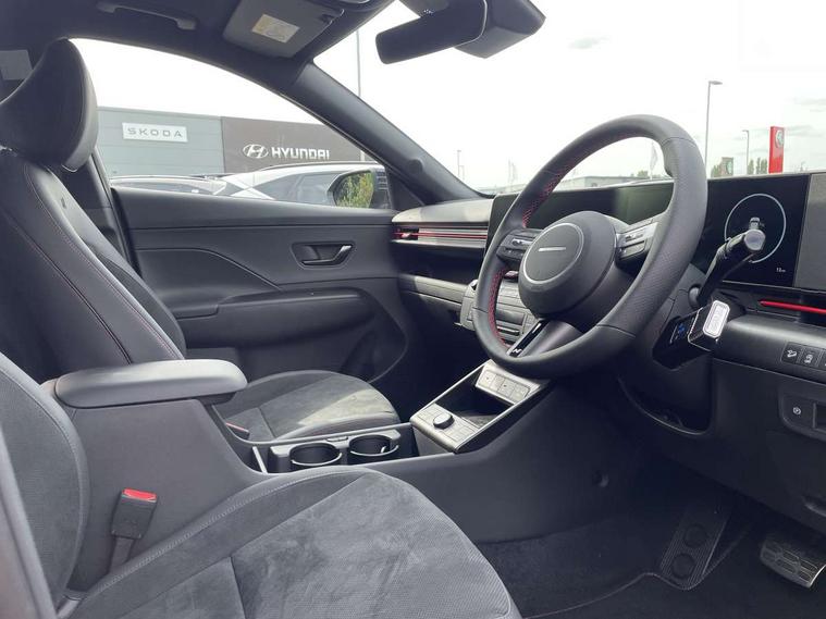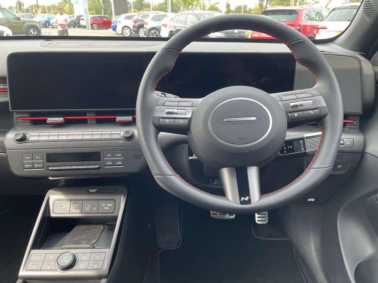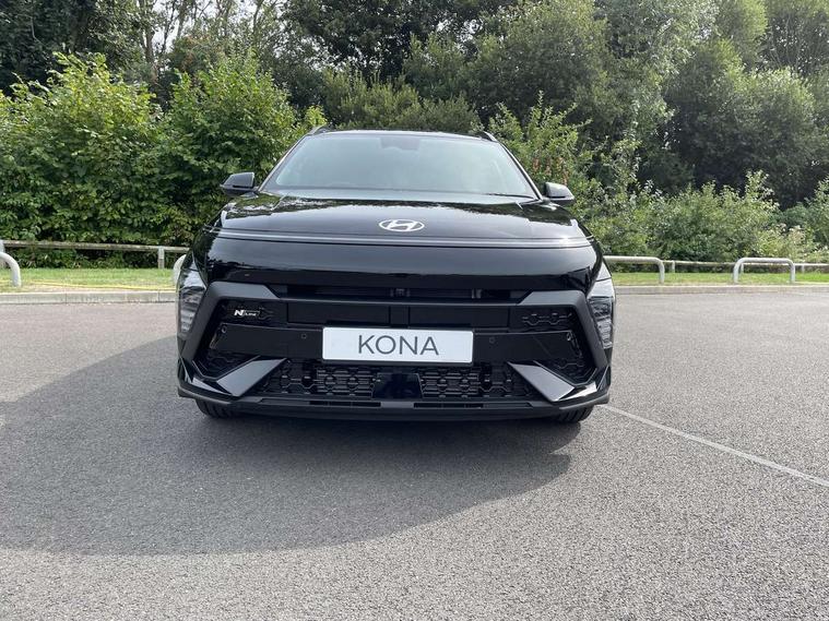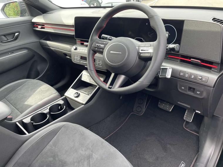 12.3" touchscreen centre console display satellite navigation with bluelink, live services and mapcare, Bluetooth connectivity with voice recognition, Cruise control, Driver status monitor (DSM), Driver supervision instrument cluster with 12.3" LCD display, eCall emergency call system, Feature on demand - Enabled, Forward collision avoidance assist (FCA 1.5) - Car, pededstrian, cycle and junction turning, Front parking sensor, Height adjustable power tailgate, Intelligent speed limit assist, Lane follow assist, Lane keep assist, Leading vehicle departure alert (LVDA), Parking system with rear camera and guidance system, PAS, Rear parking sensor, Roadside assistance, Wireless phone charging pad, Wireless Smartphone Integration includes Apple CarPlay and Android auto, 2 front USB C and 2 rear USB C charging points, DAB Digital radio, Speakers - Front, rear and tweeters, Steering wheel audio, phone and cruise controls, Auto dimming rear view mirror, Automatic headlights with dusk sensor, Automatic windscreen wipers with rain sensor, Body colour exterior door handles, Body coloured wheel arch inserts, Door mirror LED indicator lights, Electric front windows with anti-trap mechanism and one touch control, Electric rear windows, Electrically adjustable and heated door mirrors, Full LED MFR headlights, Gloss black door mirrors, LED daytime running lights, LED upper and lower rear lights, Power folding door mirrors, Privacy glass - Rear windows and tailgate, Rear roof spoiler with integrated LED brake light, Rear side wing doors, Rear wiper, Roof rails, Solar glass with front door glass and windscreen, Tinted glass in front and rear doors, Windscreen auto defog function, 12V power outlet in front console, 2 zone climate control, 3 seat bench in 2nd row, 40/20/40 split folding rear seat, Adjustable head restraints, Aluminium pedals, Ambient lighting, Driver and passenger front seat pockets, Driver's seat lumbar support, Driver/passenger manual seat height adjustment, Driver/passenger sunvisors and illuminated vanity mirrors, Floor mats, Heated front seats, Heated rear seats, Heated steering wheel, Height/reach adjustable steering column, Leather wrapped steering wheel and gear knob, LED centre interior light, LED front interior light, Luggage compartment LED lighting, Luggage shelf, Metal paint effect interior door handles, N Line cloth upholstery, Rear centre armrest with cupholders, Single front passenger seat, Vertical adjustment rear head restraints, N Line exterior design pack - Kona, Trailer wiring package - Kona, Airbag - front, front side, curtain and centre front airbag, Anti-lock brake system (ABS), Childproof rear door locks, Downhill brake control, Electric parking brake, Electronic stability control, Fixed 3 point for second row centre passenger seatbelt, Hill start assist control (HAC), Rear seat alert, Tyre pressure monitoring system, Alarm/immobiliser, Rear occupant alert, Remote central locking, Smart key with keyless entry and start/stop button, Five year annual vehicle health checks, Temporary mobility kit (TMK),