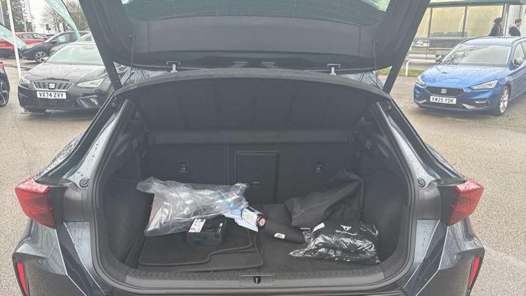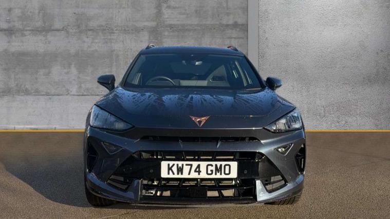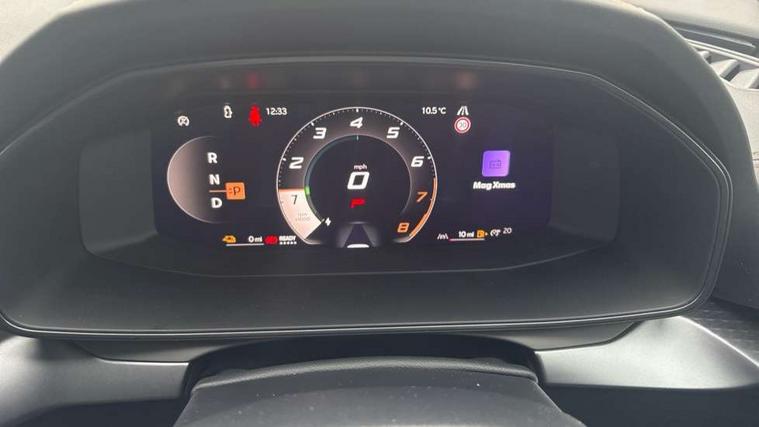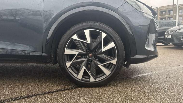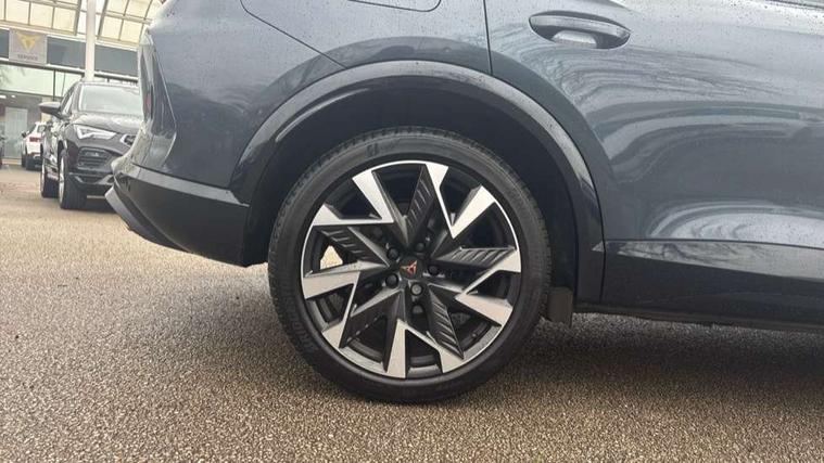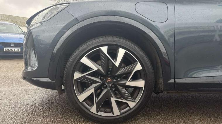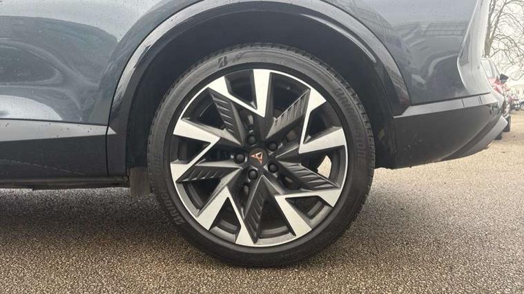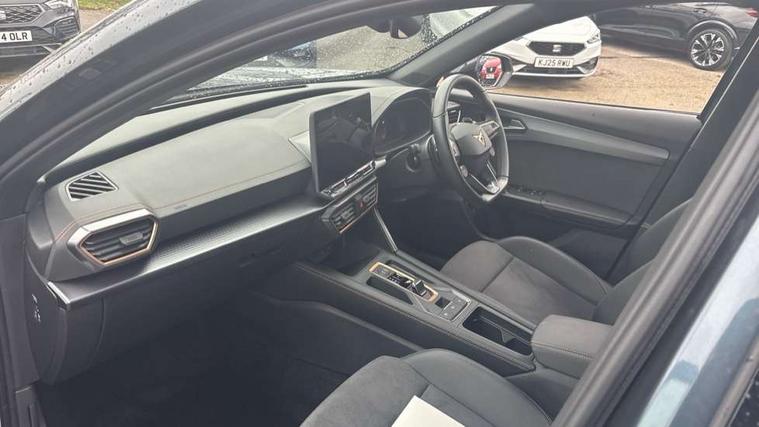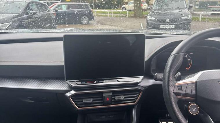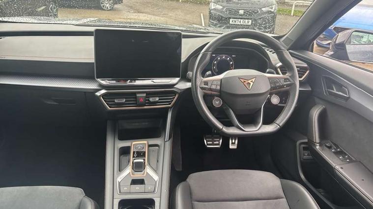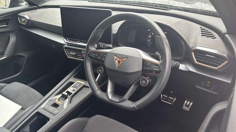 10.25" digital cockpit and configurable dashboard, Adaptive cruise control with follow-to-stop and speed limiter, Advanced driver alert system, Dynamic chassis control with driving profile selection (Comfort, Sport, CUPRA, Individual), Dynamic road sign display, Emergency steering support with turn assist, Forward collision warning with automatic braking, Front and rear parking sensors, Full link phone integration, Lane assist, Rear view camera, RPM, trip computer, outside temp gauge, instrument light brightness, low fuel warning light, lights on reminder, gearshift indicator, Service interval indicator, Speed sensitive power steering, Start/stop system with regenerative braking, Virtual pedal and electric tailgate, Voice control system, Wired Android Auto, Wireless apple carplay, Wireless phone charger, 10 amp mode 2 charging cable, 32 amp mode 3 charging cable, Adaptive chassis control with continuous operation, CUPRA sport suspension, Electronic locking differential and dynamic traction support, 2 front and 2 rear USB type C sockets, Media system with navigation, 12.9" touchscreen display, voice control, DAB, steering wheel mounted controls, Auto dimming rear view mirror, Body colour door handles, Body coloured bumpers, Dark grey wing mirror, Daytime running light with automatic headlight control and coming home feature, Door panel ambient lighting, Dynamic headlight range control, Electric front/rear windows, Electrically adjustable heated and folding door mirrors with memory function, Gloss black roof rails and window surrounds, High beam assist, LED 3rd brake light, LED front fog lamps with cornering function, LED Taillights with dynamic indicator, Matrix LED headlights with multifunction camera, Rain sensing wipers, Rear diffuser with copper simulated exhaust pipes, Rear fog lights, Rear side wing doors, Rear wash/wipe, Tinted rear windows, Welcome lights (within exterior mirror housing), 12V socket, 2 front and 2 rear reading lights, 3 seat bench in 2nd row, 60/40 split rear bench seat with armrest and mechanical seat release, Black headlining, Black interior roof lining, Cupra sports pedals, Dust/pollen filter, Electrically adjustable front seats with lumbar support and memory function, Front and rear head restraints, Front centre armrest, Heated front seats, Heated supersports multifunction leather steering wheel with satellite buttons and gear shift paddles, Height/reach adjust steering wheel, Illuminated aluminium doorsteps, Illuminated interior front door sills, Illuminated sunvisor with mirror, Isofix, Leather dashboard, door insert and side trim panel, LED smart wraparound lighting, PVC/Dinamica microfiber upholstery + bucket seats, Satellite steering wheel, Single front passenger seat, Storage pockets on rear of front seats, Three zone climate control with control panel in rear, 3 point seatbelts on all rear seats, ABS, Brake control system - ESC and brake booster, Child proof door locks, Driver and front passenger airbags with front passenger airbag de-activation, Electronic parking brake, Front and rear disc brakes, Front side curtain airbags, Hill hold control, Public e-call, Seat belt reminder for front and rear seats, Tyre pressure monitoring system, Anti theft alarm system, KESSY Advanced - Keyless start, keyless entry with SAFELOCK, Locking wheel bolts, Copper and aluminium interior detailing, 19" Sandstorm machined sport black and silver alloy wheels, Breakdown and tool kit,