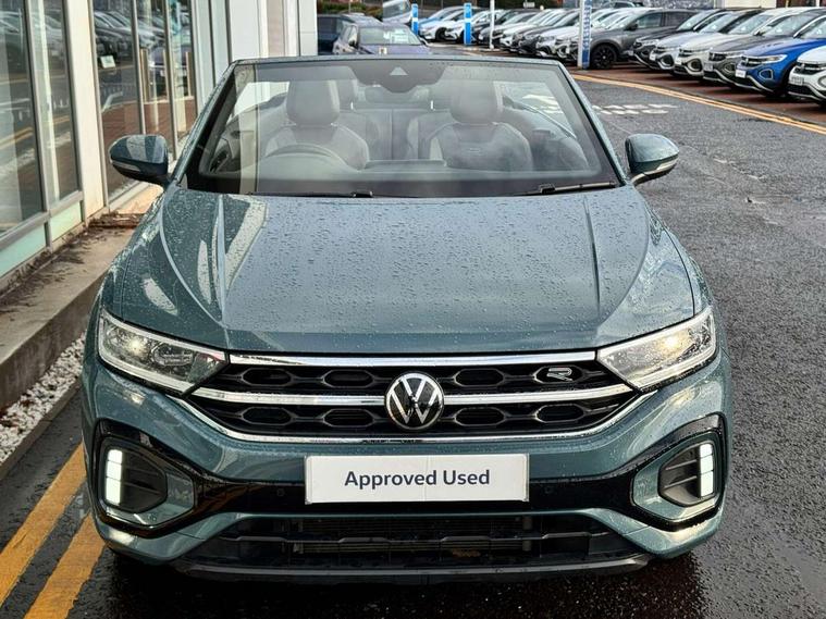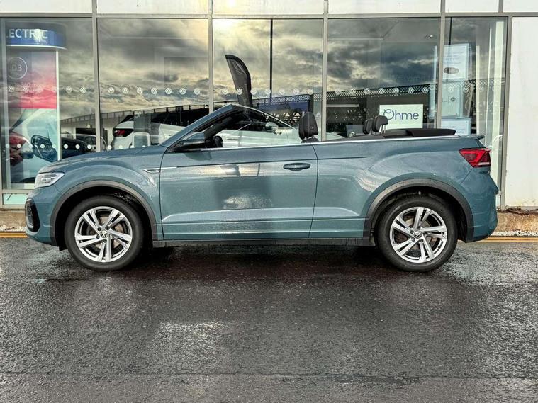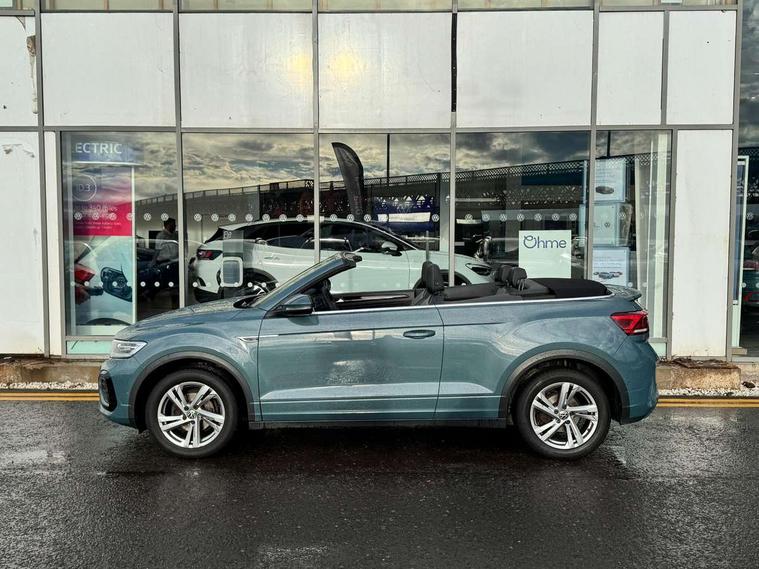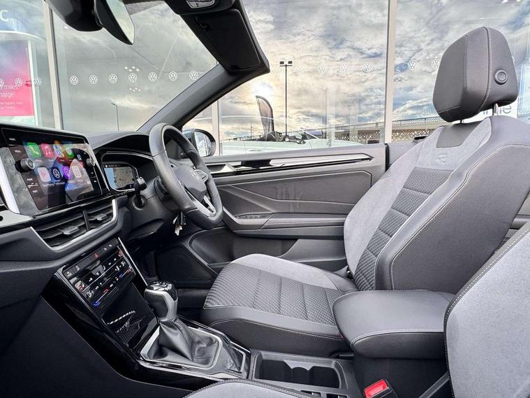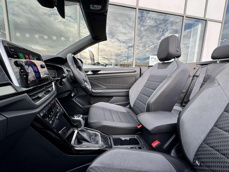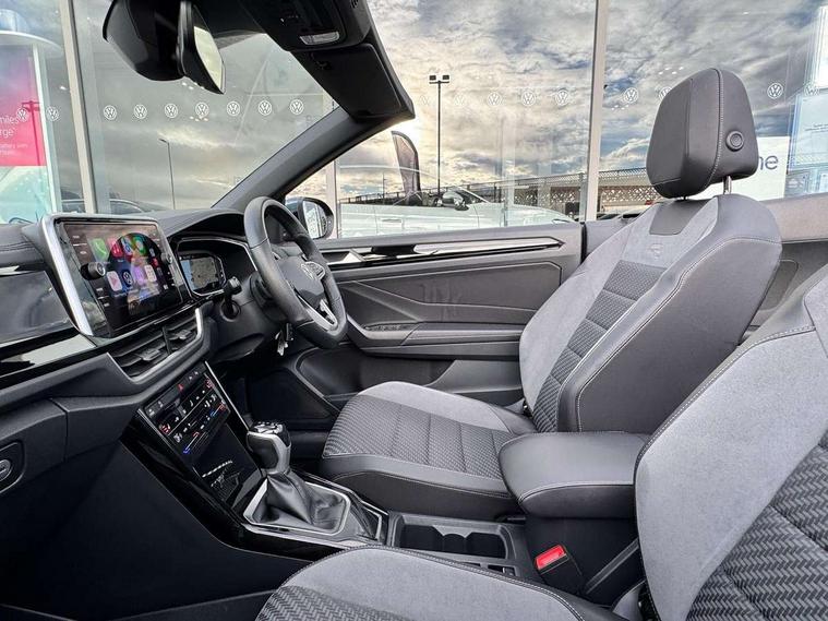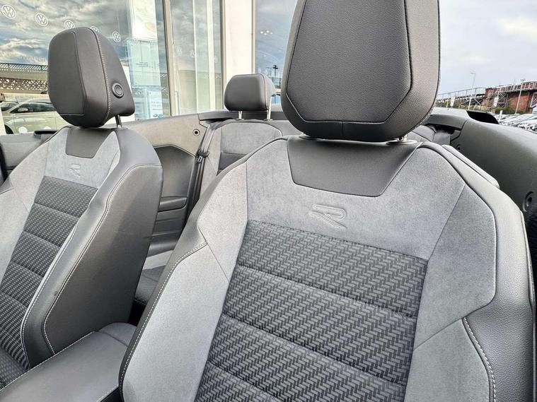 Adaptive cruise control and speed limiter, Bluetooth mobile phone interface, Brake pad wear indicator, Car information display, Digital Cockpit Pro with 10.25" Display, Driver alert system with fatigue detection, Driver tips and journey analysis, Emergency call service, Modified key software - reduce switch off time for key status change to Long no motion, Multifunction computer with visual gear change recommendation for fuel consumption, Multifunction front facing camera, Park assist including front and rear parking sensors, Speedo and rev counter, electronic odometer, trip, service interval display and exterior temperature gauge, Start/stop system with brake energy recovery, Tailgate/trunk lid release from outside, Warning sound and light for front seatbelts unfastened, Diversity antenna for FM reception, Music playback - MP3, WMA and AAC files, SMS functionality - read, compose and send SMS messages using touch-screen display, Title and cover art display, USB-C Interface and USB charging socket, We Connect and We Connect Plus functionality, Ambient lighting with logo projection, Auto dimming interior rear view mirror, Automatic hazard lights activation under emergency braking, Automatic headlight control with LED separate daytime running lights with coming/leaving home function, Black roof, Body colour door handles, Body colour rear spoiler, Chrome effect left and right trapezoid exhaust tailpipe fascia surround, Chrome trim on upper and lower radiator grille, Dark red rear combination lamps in LED technology, Dusk sensor, Exterior mirrors aspherical on driver side, convex on front passenger side, Heat insulating glass windscreen, High level 3rd brake light, LED performance matrix headlights - dynamic range control, dynamic cornering light and turn signal + light mode for rain/fog/snow, LED rear number plate lights, Power operated canvas convertible top, Power windows with comfort operation and circuit breaker, R-Line design body coloured bumpers, Rain sensor, Rear boot, Rear exhaust tailpipe, Rear fog light on one side and reversing lights on both sides, Remote electrically foldable door mirrors, puddle lights and reverse activated passenger door mirror, Volkswagen roundel, Windscreen wiper with intermittent wipe light, Without exterior ambient lighting, 12V socket in centre console storage area, 2 LED front reading lights, 2 seat bench in 2nd row, 50:50 Split folding rear seat backrests with fixed rear seat bench, Air care climatronic air conditoning system with active combination filter and 2-zone temperature control, Black door lower parts with chrome trim, Chrome plated surround to light, mirror and window switch, Door and side trim panel with leatherette insert, Easy entry backrest release, Front and rear carpet mats with black stitching, Front centre armrest, Front cupholders x 2, Front door pockets, Front seat back storage pockets, Front sports comfort seats with manual height adjustment, Heated leather wrapped multi function sports steering wheel with tiptronic, Height/reach adjust steering wheel, Inserts of front seats and outer rear seats in ArtVelours titan black, Instrument lighting, white adjustable panel illumination, Interior light delay, Interior light in footwell, Interior lighting with switch off delay and contact switches on all doors, Interior white ambient lighting and surround lighting, Isofix child seat preparation, Lockable glove compartment with light, Luggage compartment lighting, Power adjustable lumbar support in front, Rear head restraints, Single front passenger seat, Stainless steel pedals, Sun visors with illuminated vanity mirrors, Unique R Line door sill protectors, Driver assistance package - T-Roc cabriolet DSG, 2 x 3-point seatbelts/outer rear seats with ECE label, Driver and front passenger airbag with front passenger airbag deactivation, Driver and front passenger safety-optimised head restraints, Drivers seatbelt reminder, Electronic parking brake, Electronic Stability Control (ESC) including ABS, ASR and EDL, Front and rear disc brakes, Front assist with autonomous emergency braking, Pedestrian monitoring, Predictive pedestrian protection, Rigid safety cell with front and rear crumple zones, Side airbag/thorax airbag system, for front passengers, Single tone horn, Three point height adjust front seatbelts + pretensioners, Tyre pressure loss indicator, Volkswagen roadside assistance, Anti-theft alarm system with interior protection and central locking system with SAFELOCK, radio remote control and 2 remote control folding keys, Electronic engine immobiliser, Trims for alloy wheels,